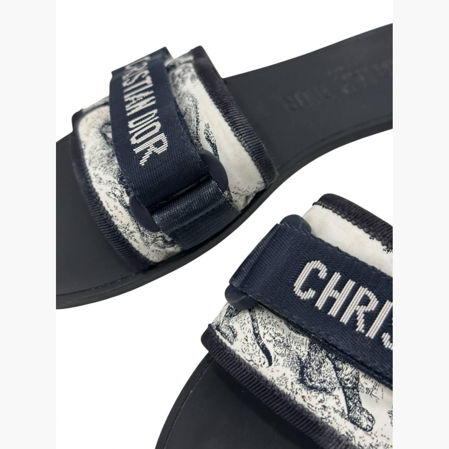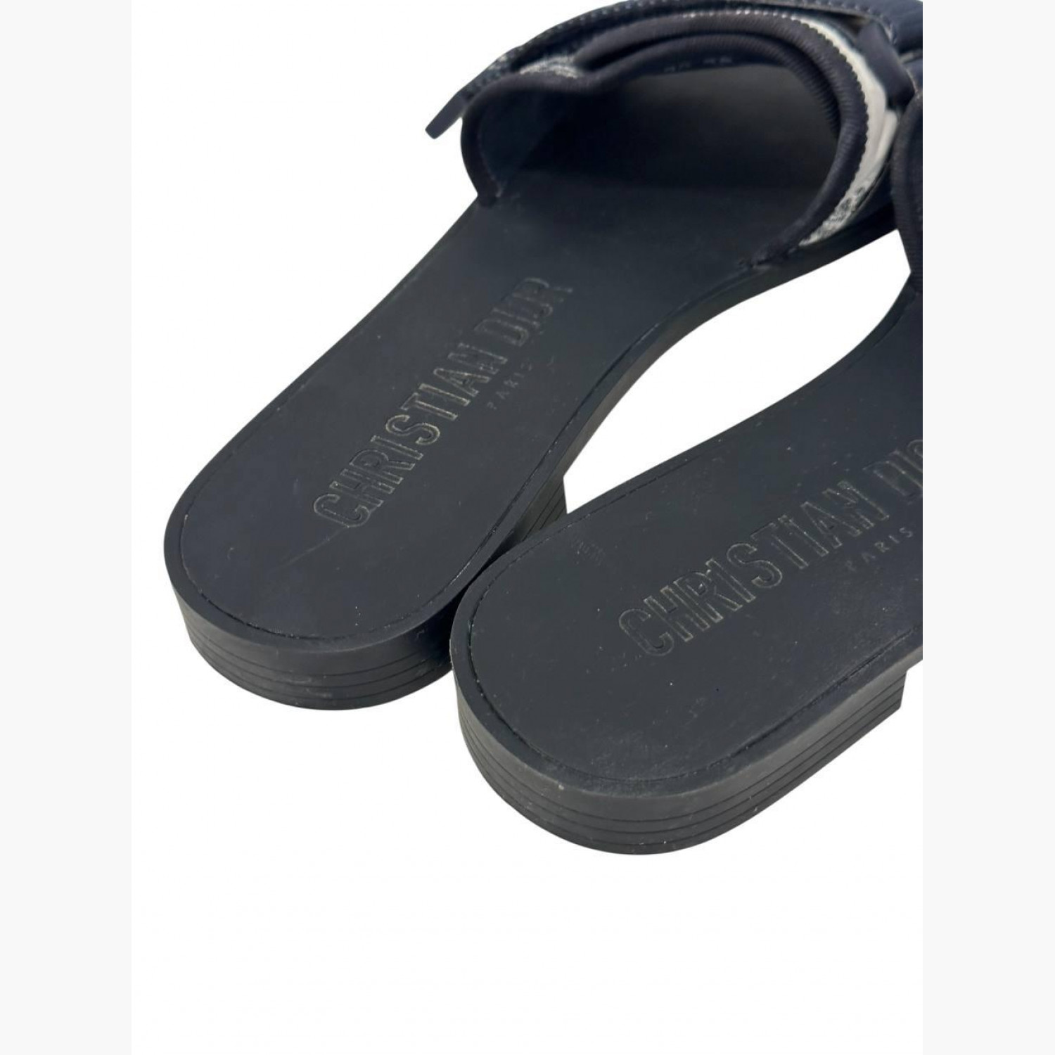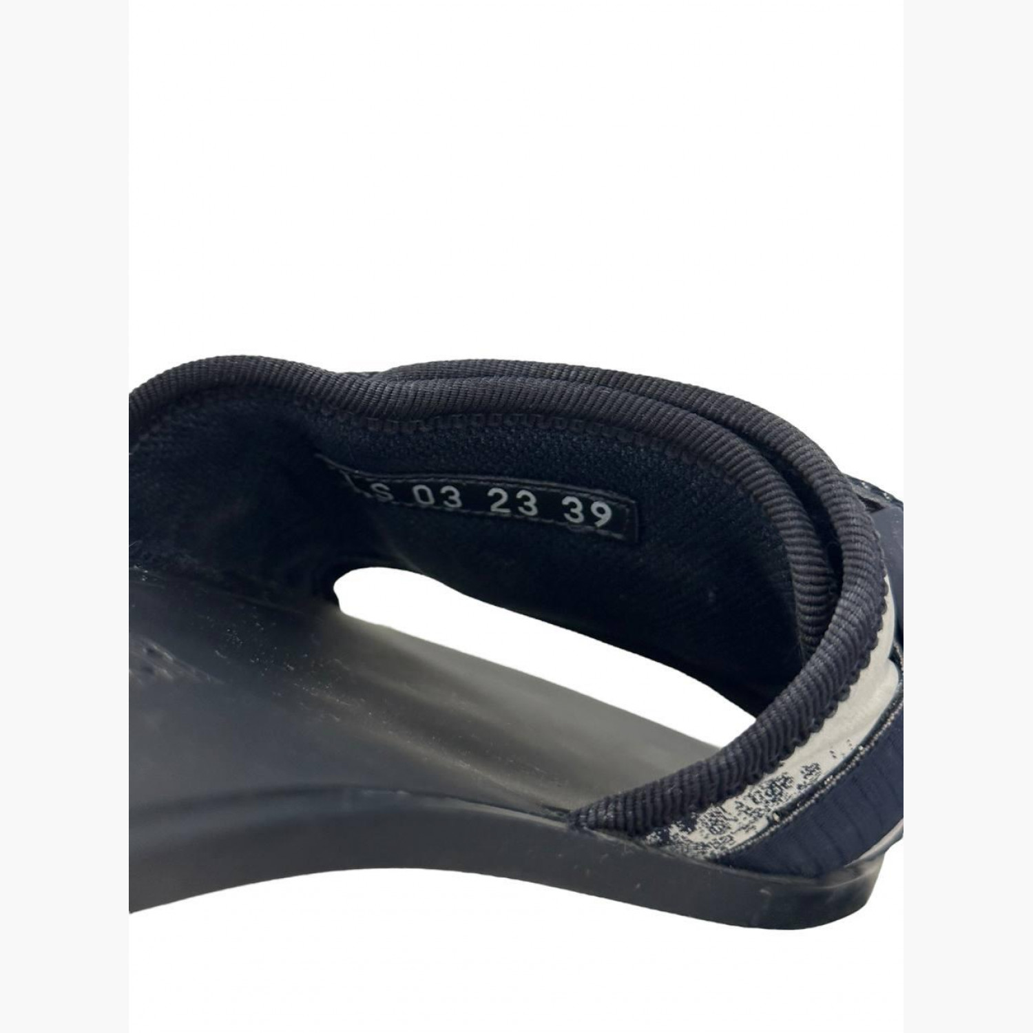 Blue textile slides with a rubber sole. In good condition, with wear marks.