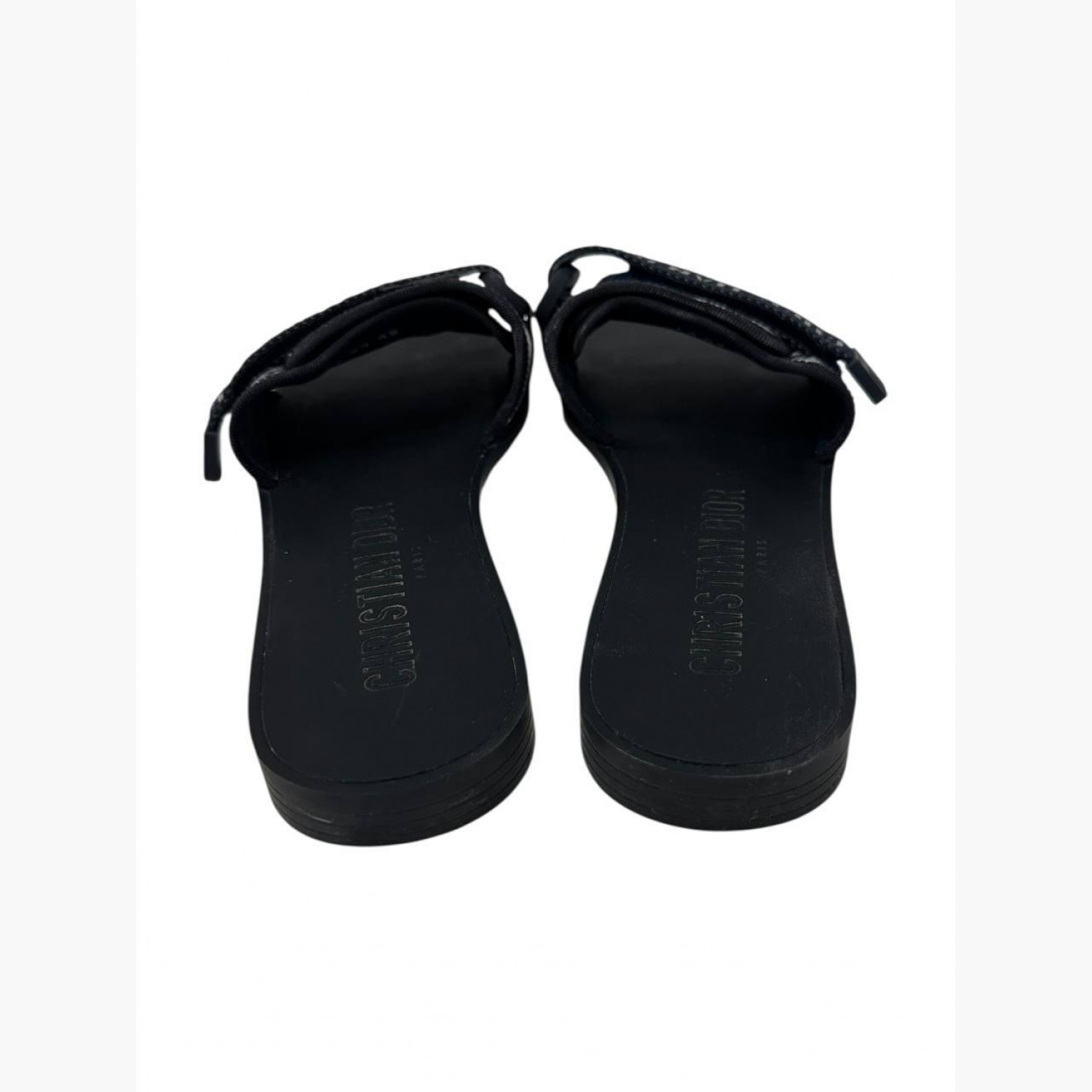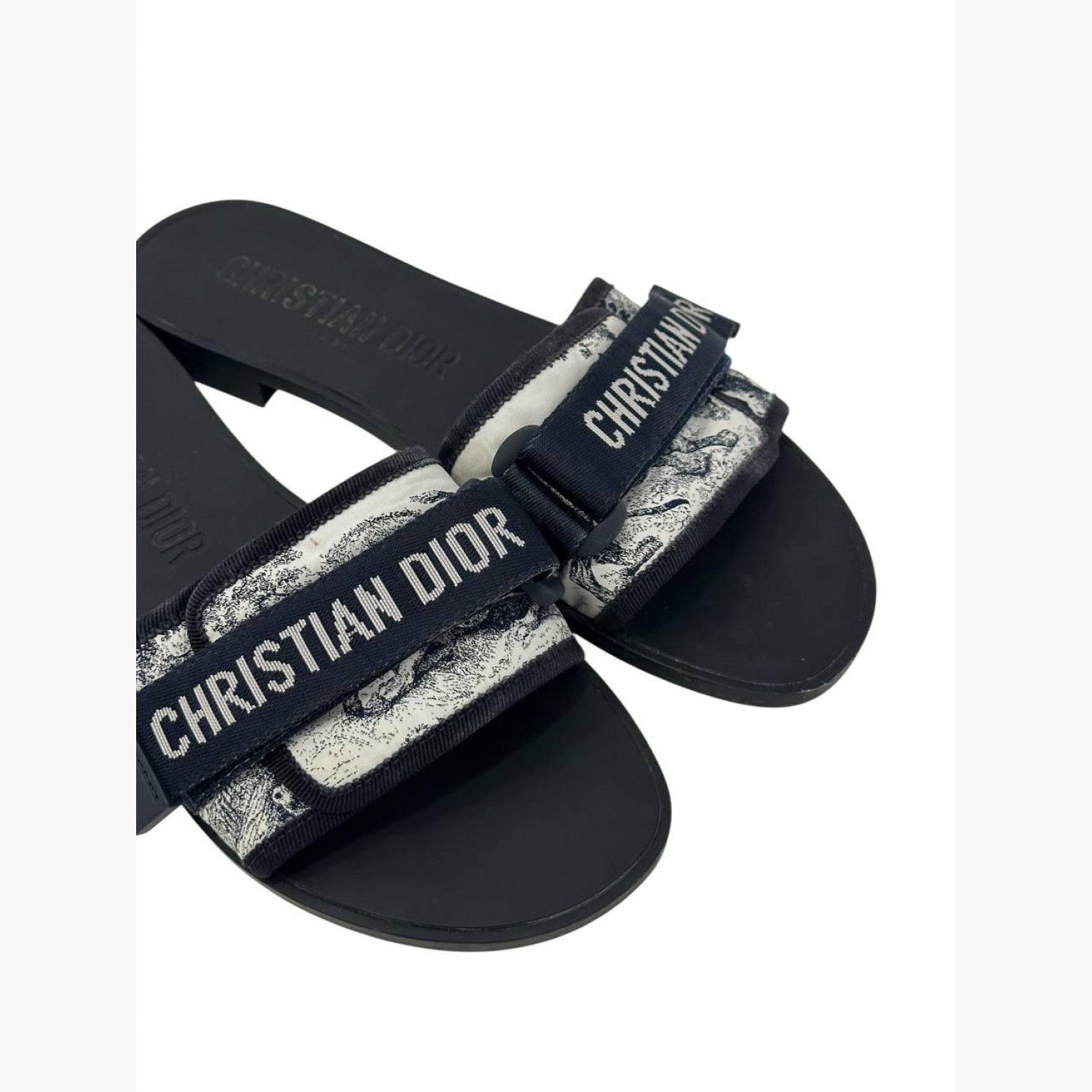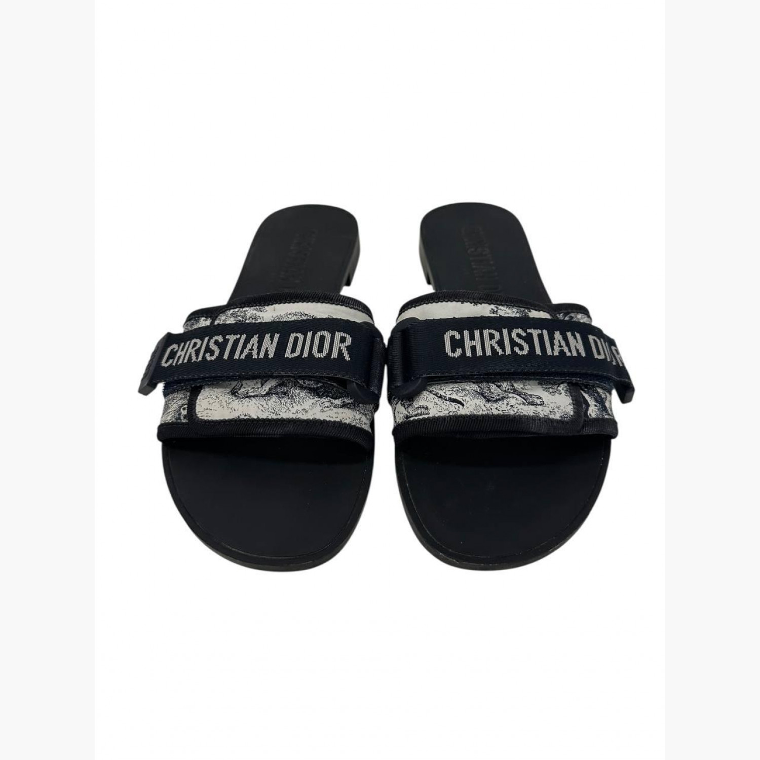 Blue textile slides with a rubber sole. In good condition, with wear marks.