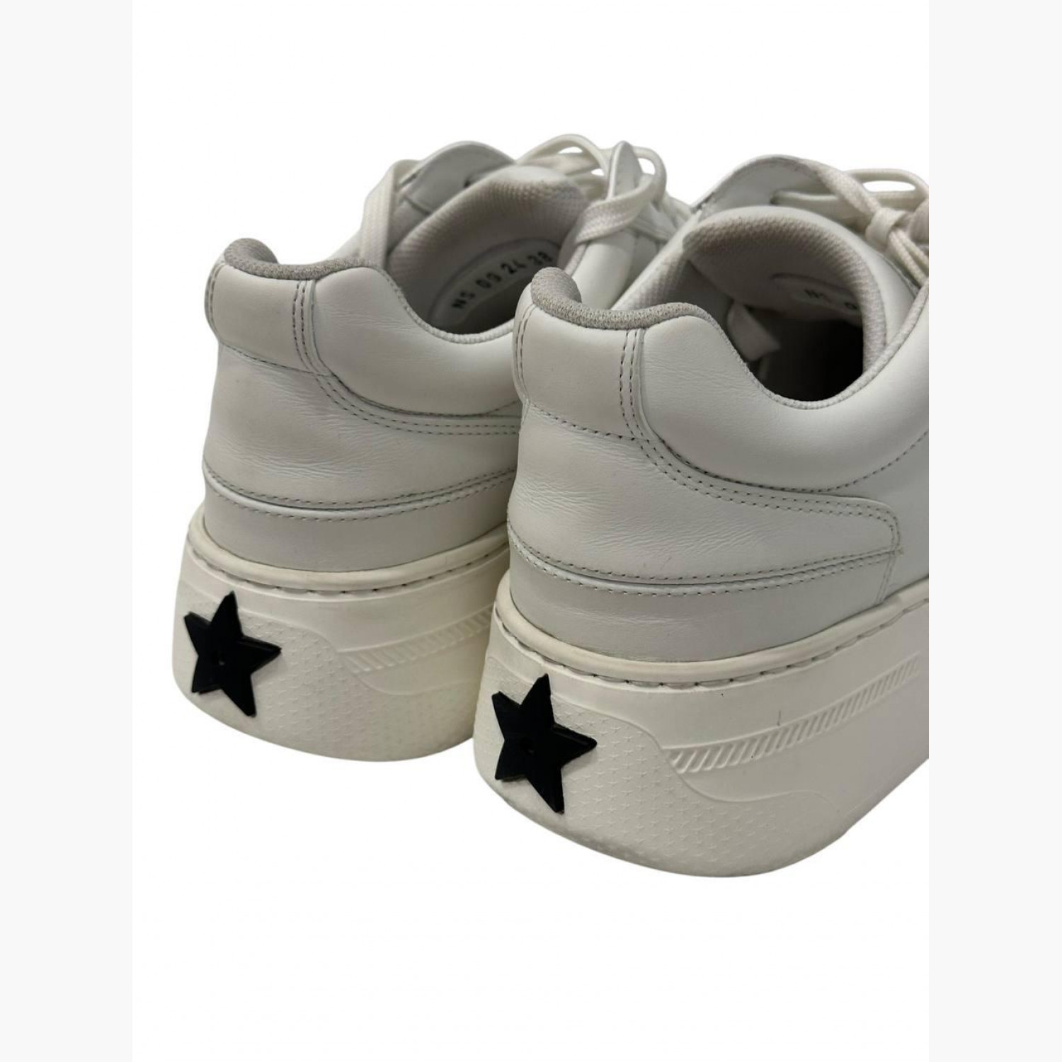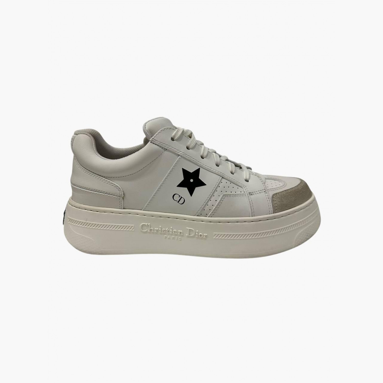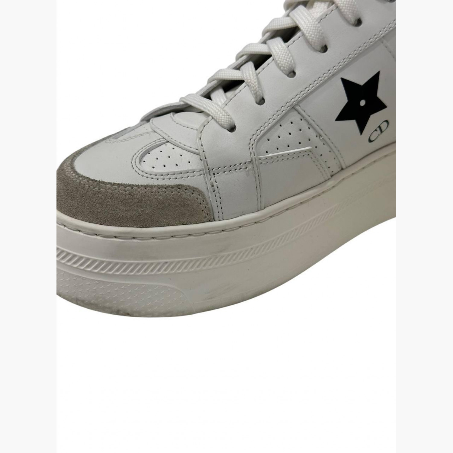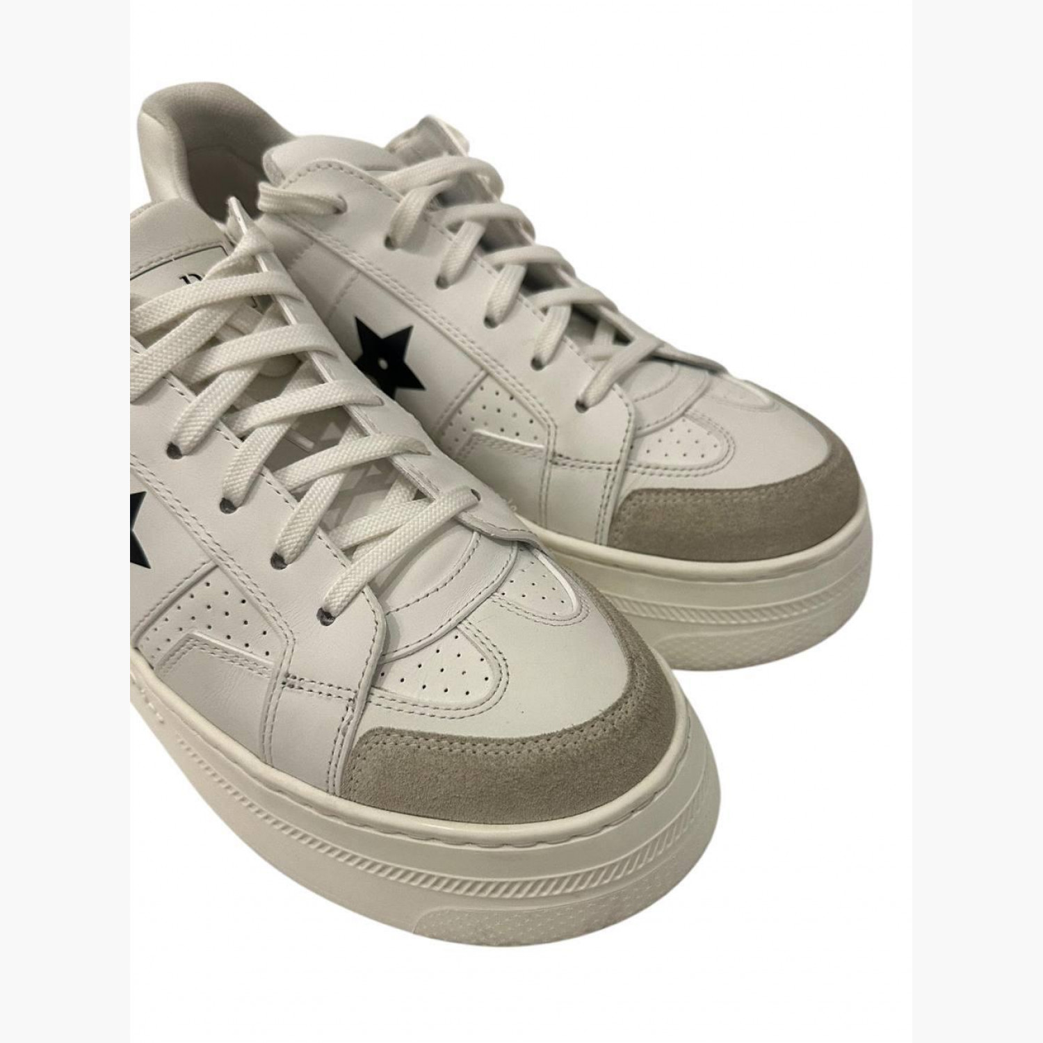 White leather sneakers with suede inserts. In good condition, with wear marks and minor scuffs.