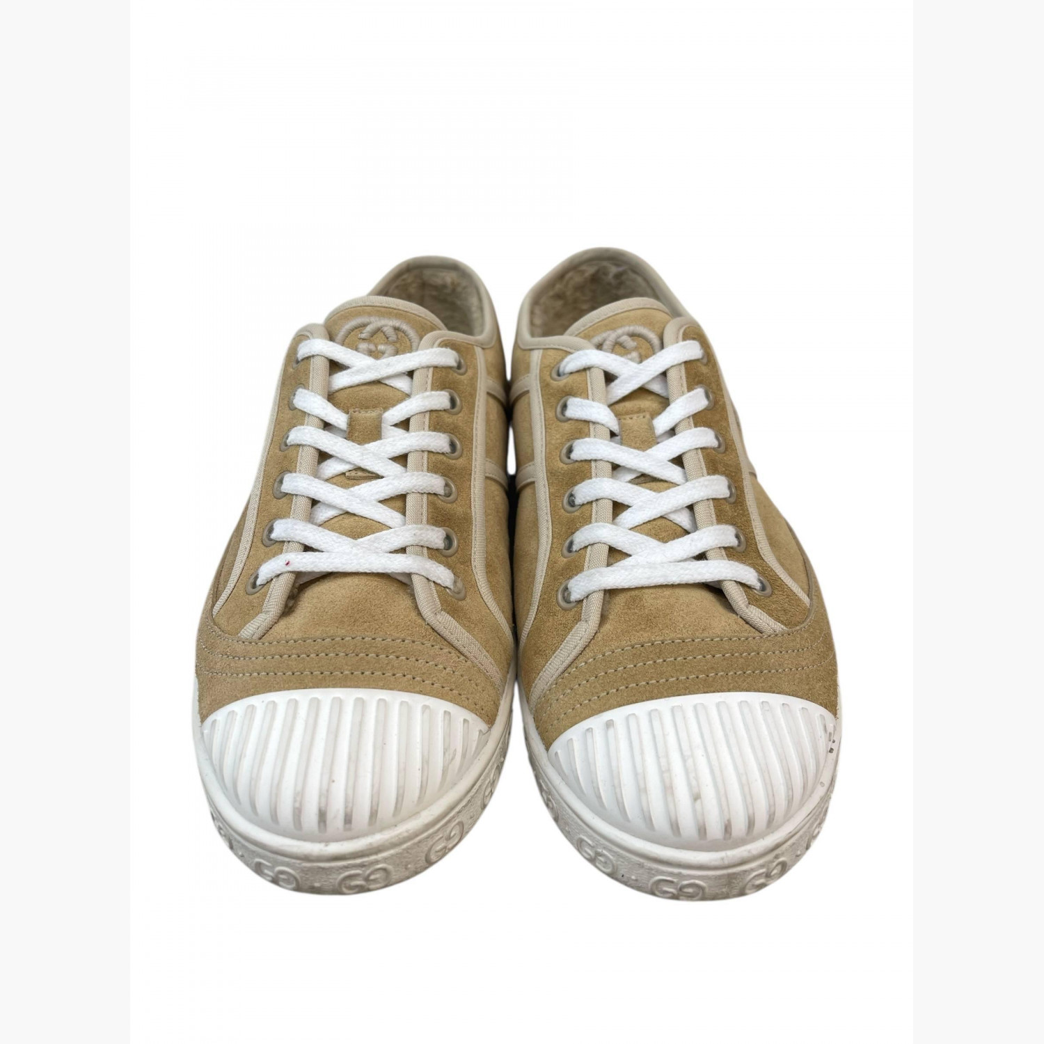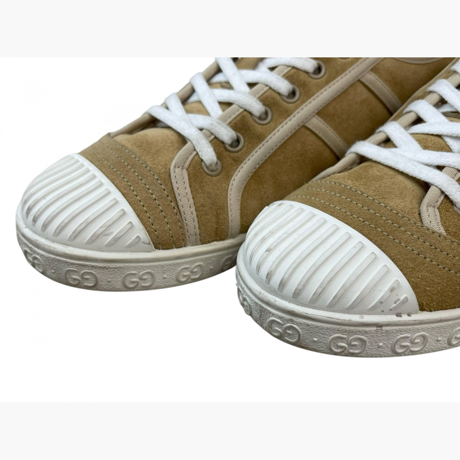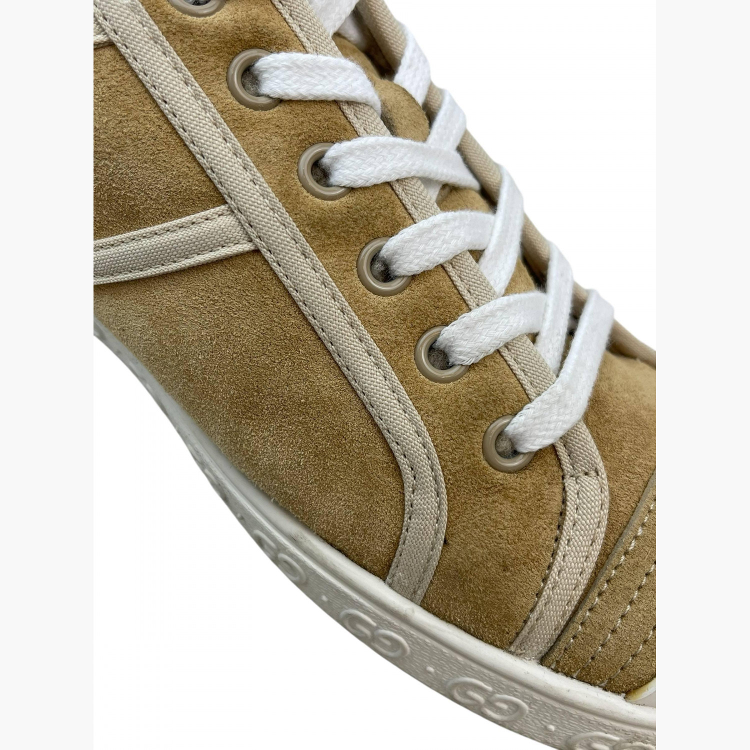 Mustard suede sneakers with a ribbed white toe cap.