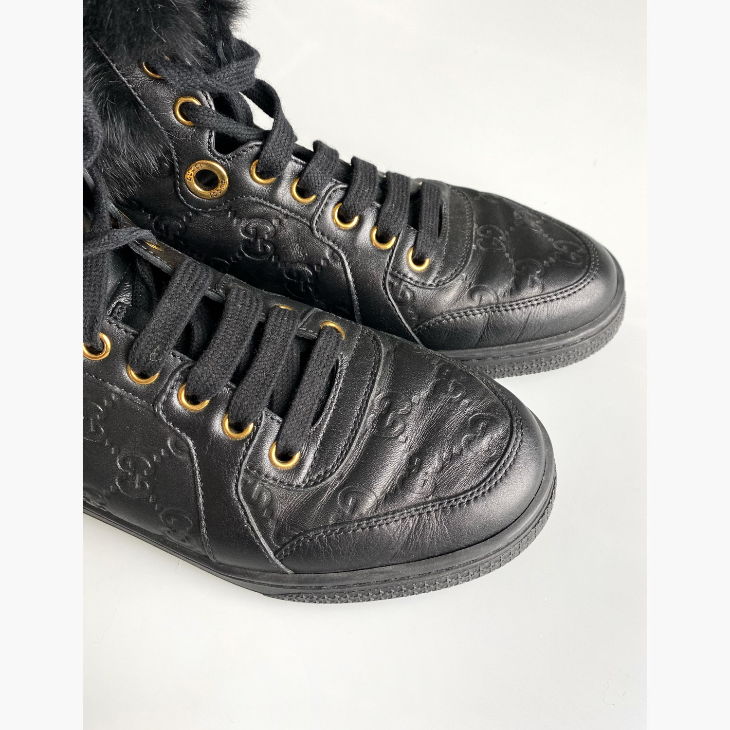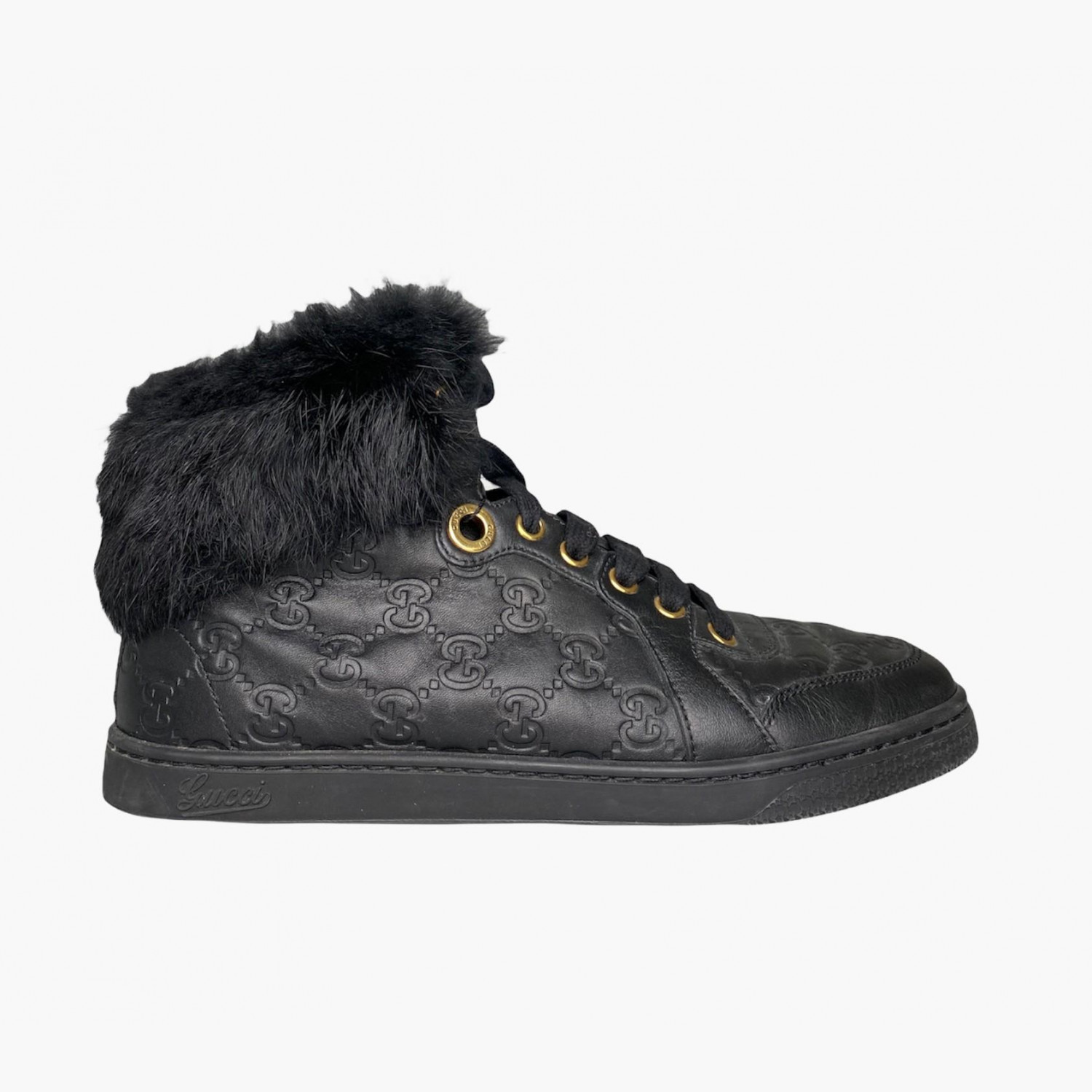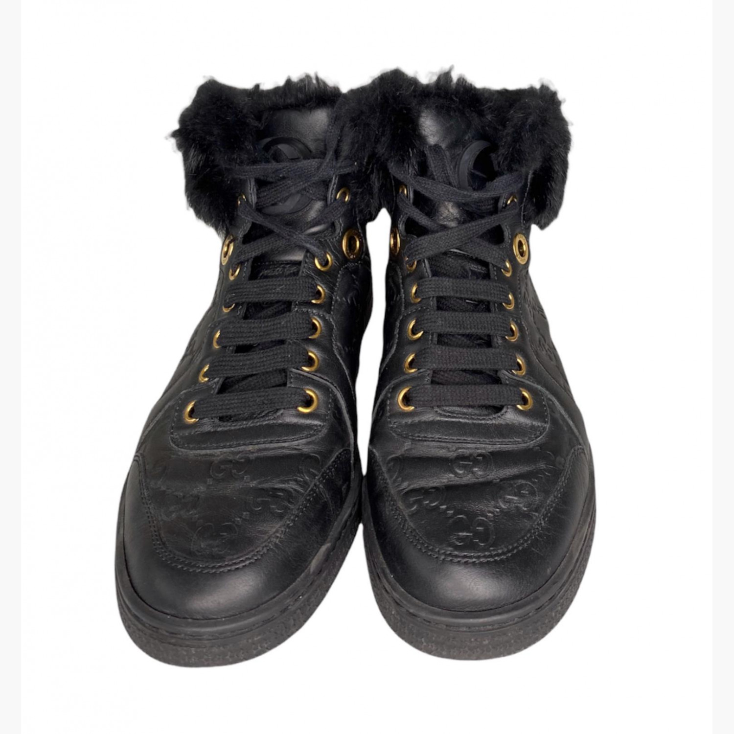 Winter leather sneakers in black color. The brand's signature print is stamped on the leather. Gold-colored hardware. Lined with fur. In very good condition, slight wear marks on the sole.