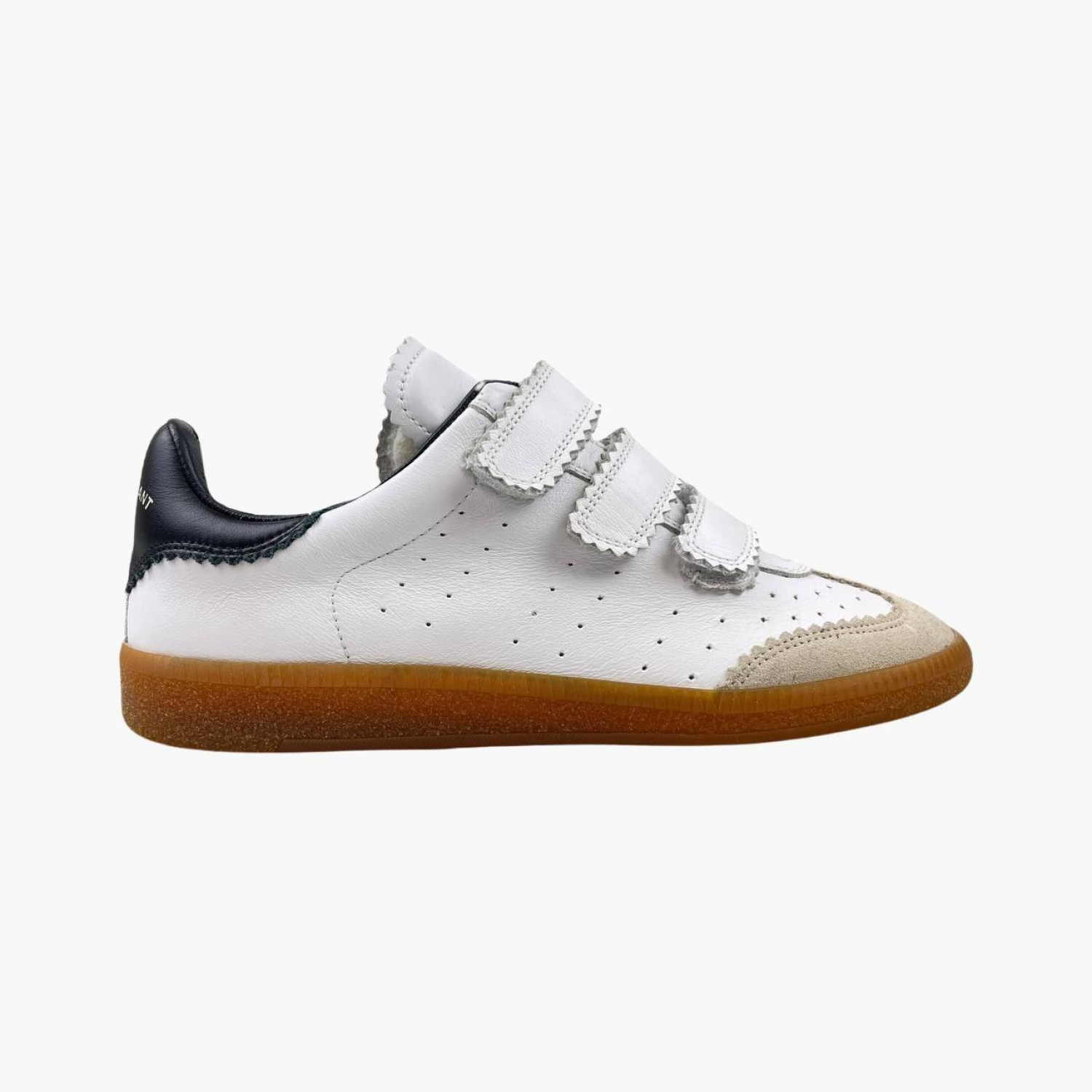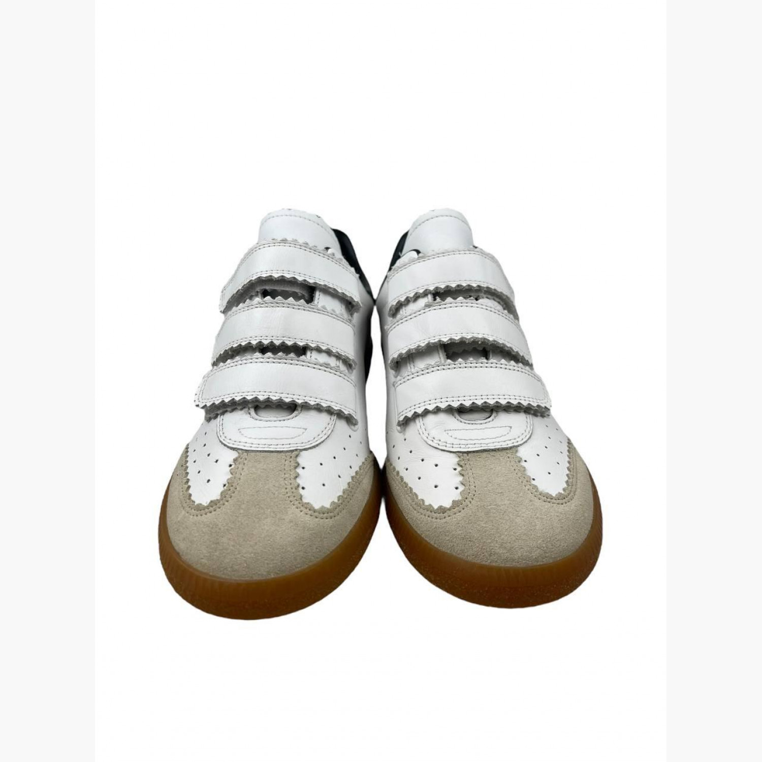 White leather sneakers with Velcro and a gray suede toe. Absolutely new.