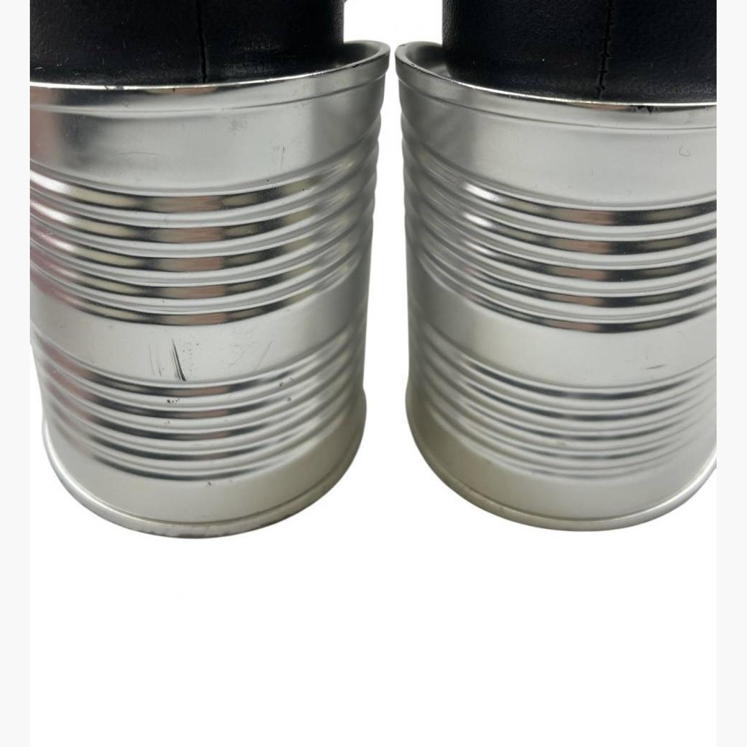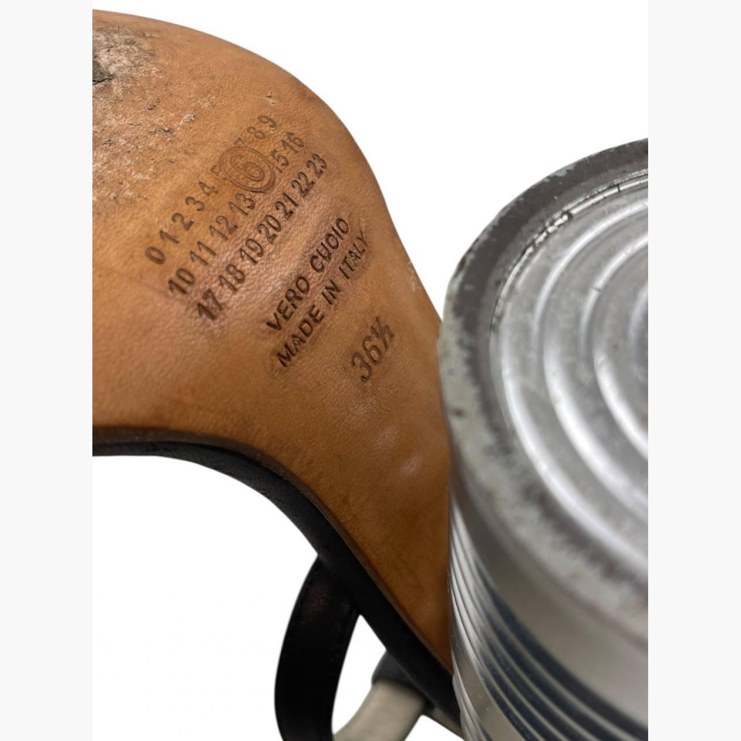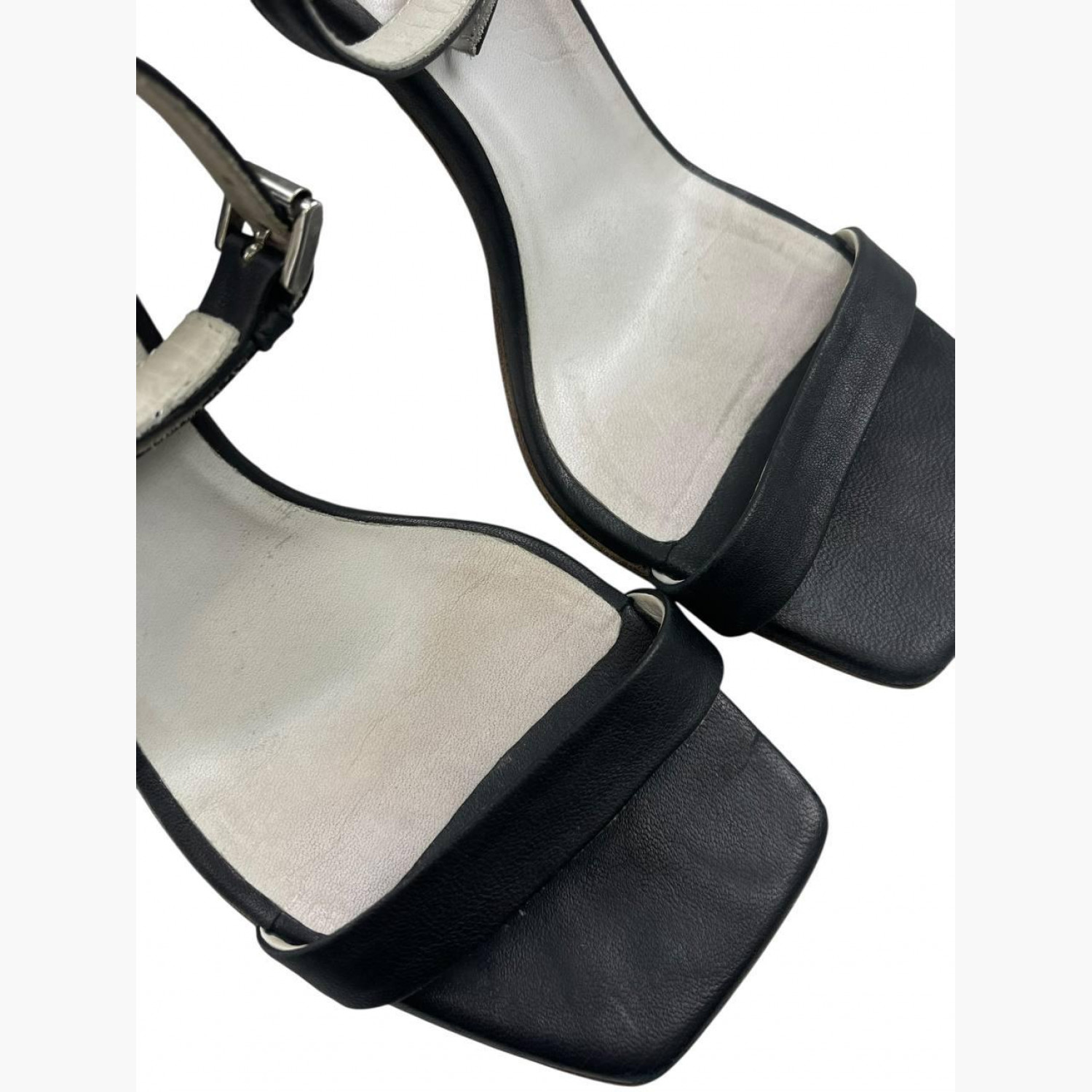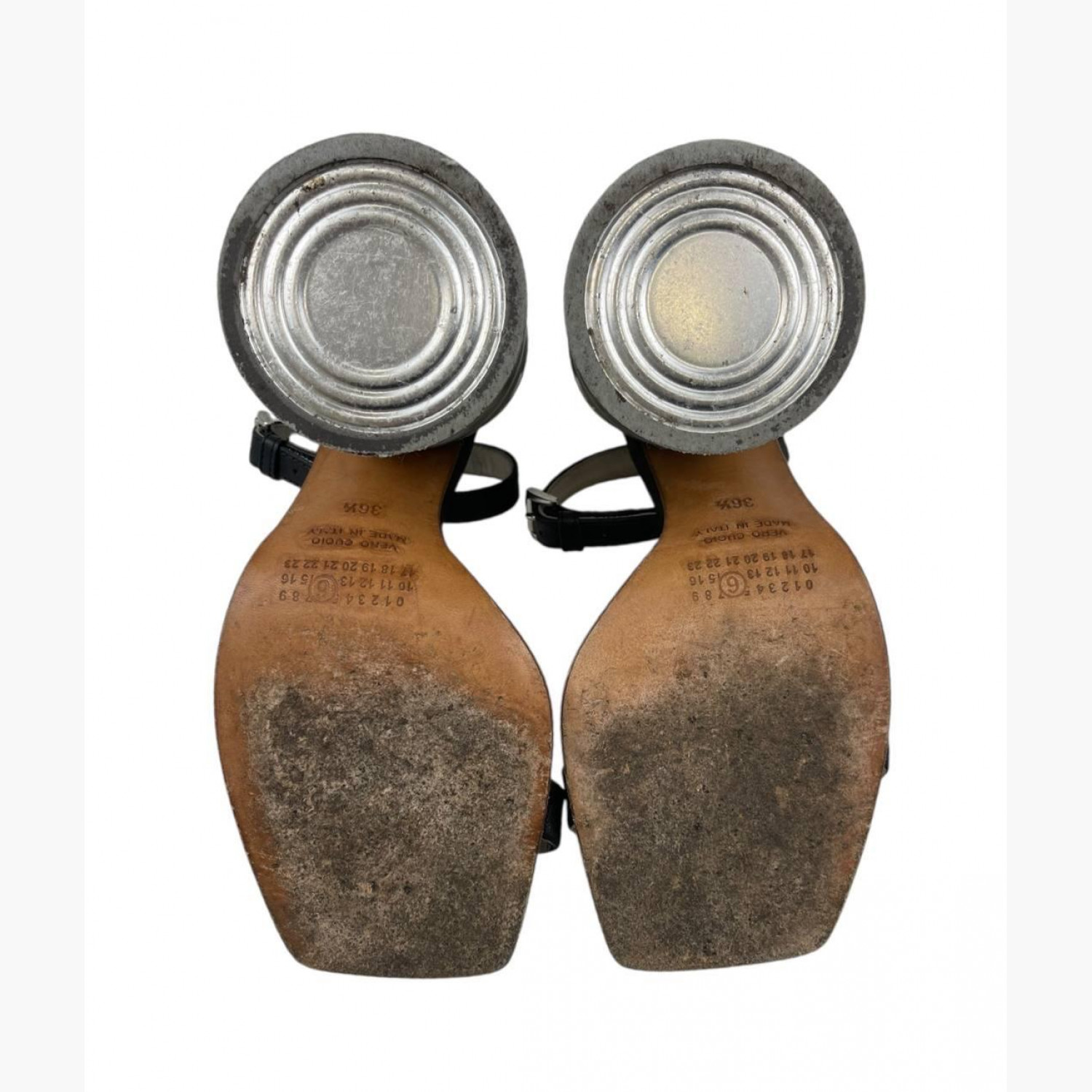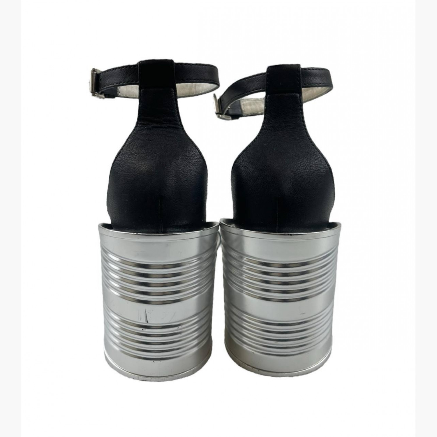 Black leather sandals with heels shaped like tin cans. In good condition, with wear marks.