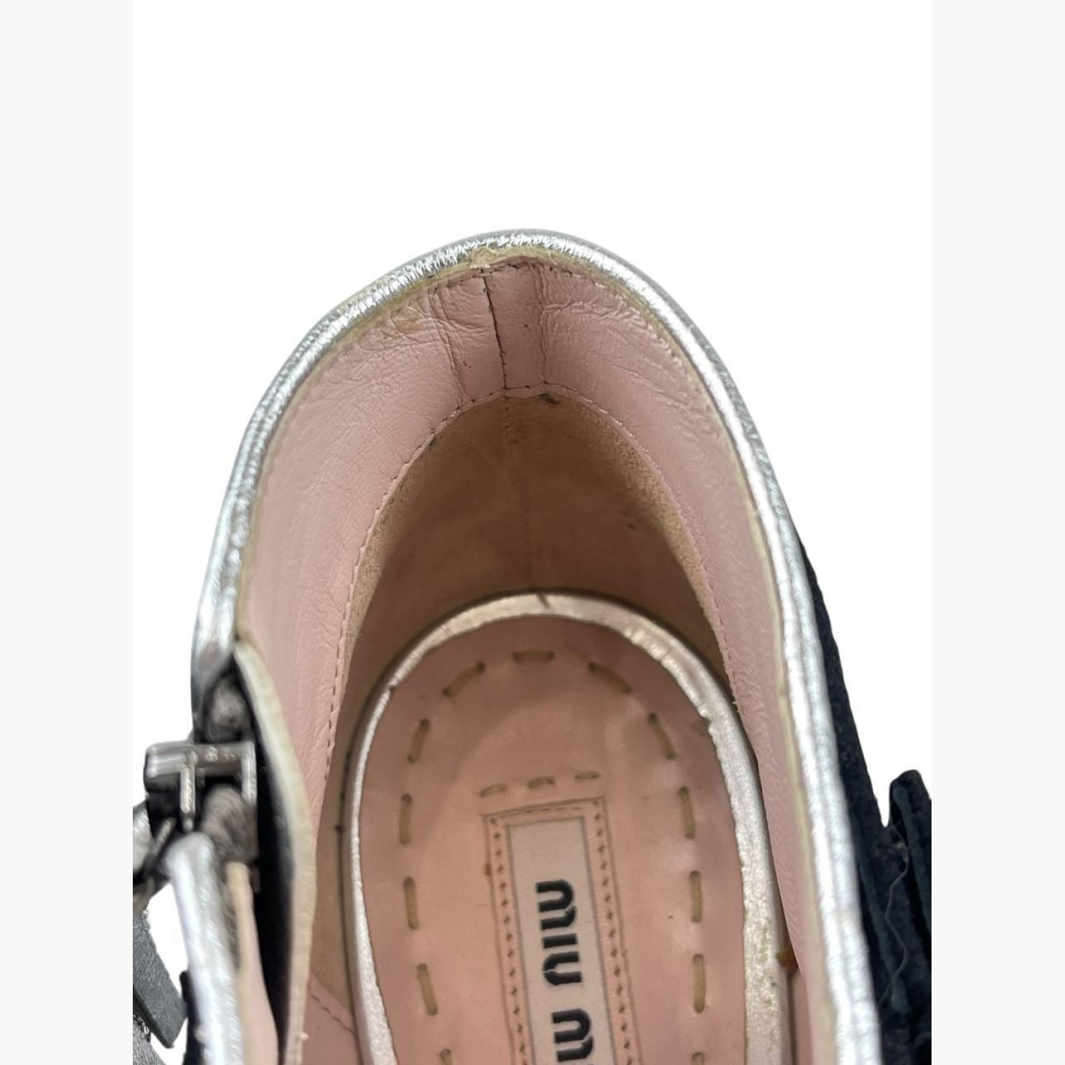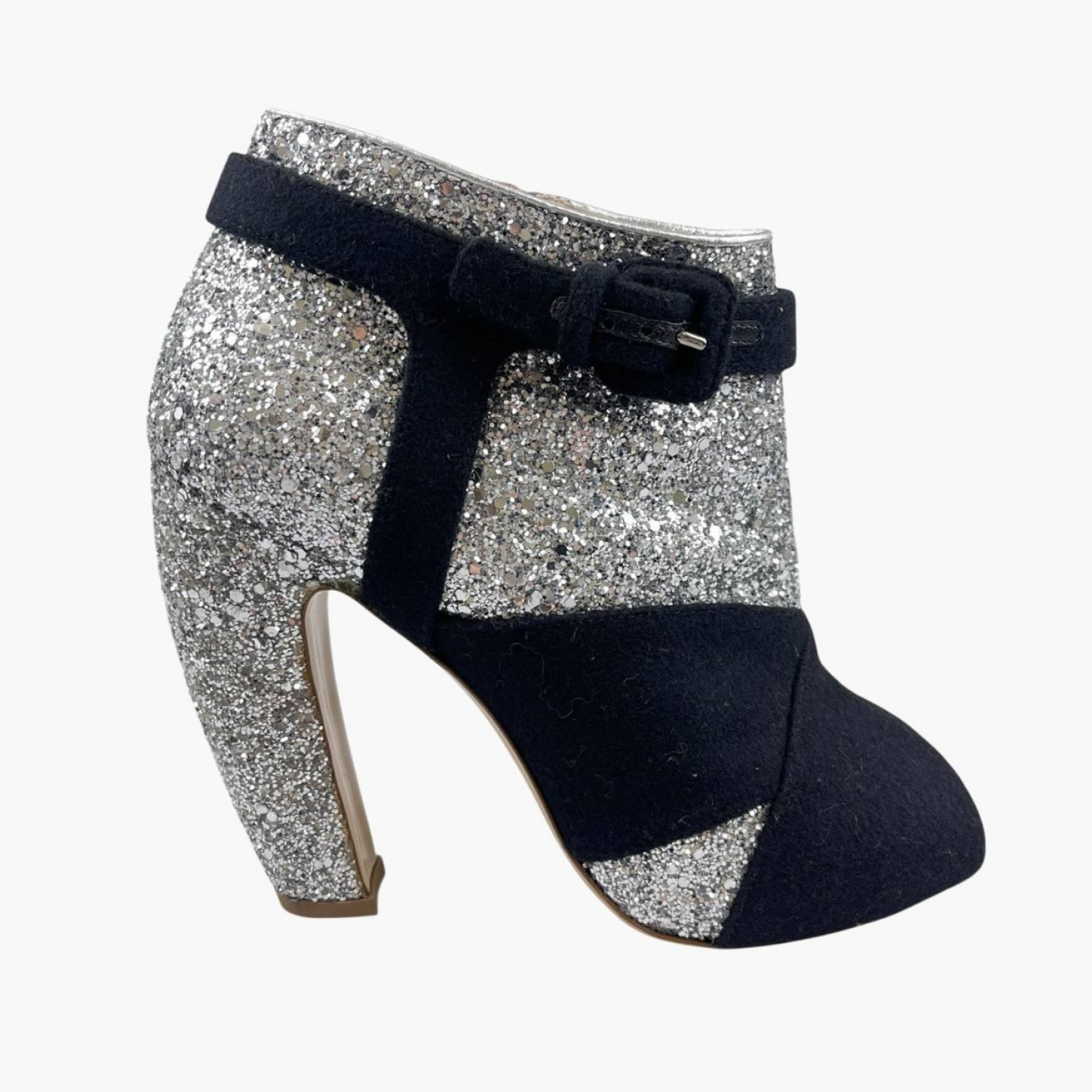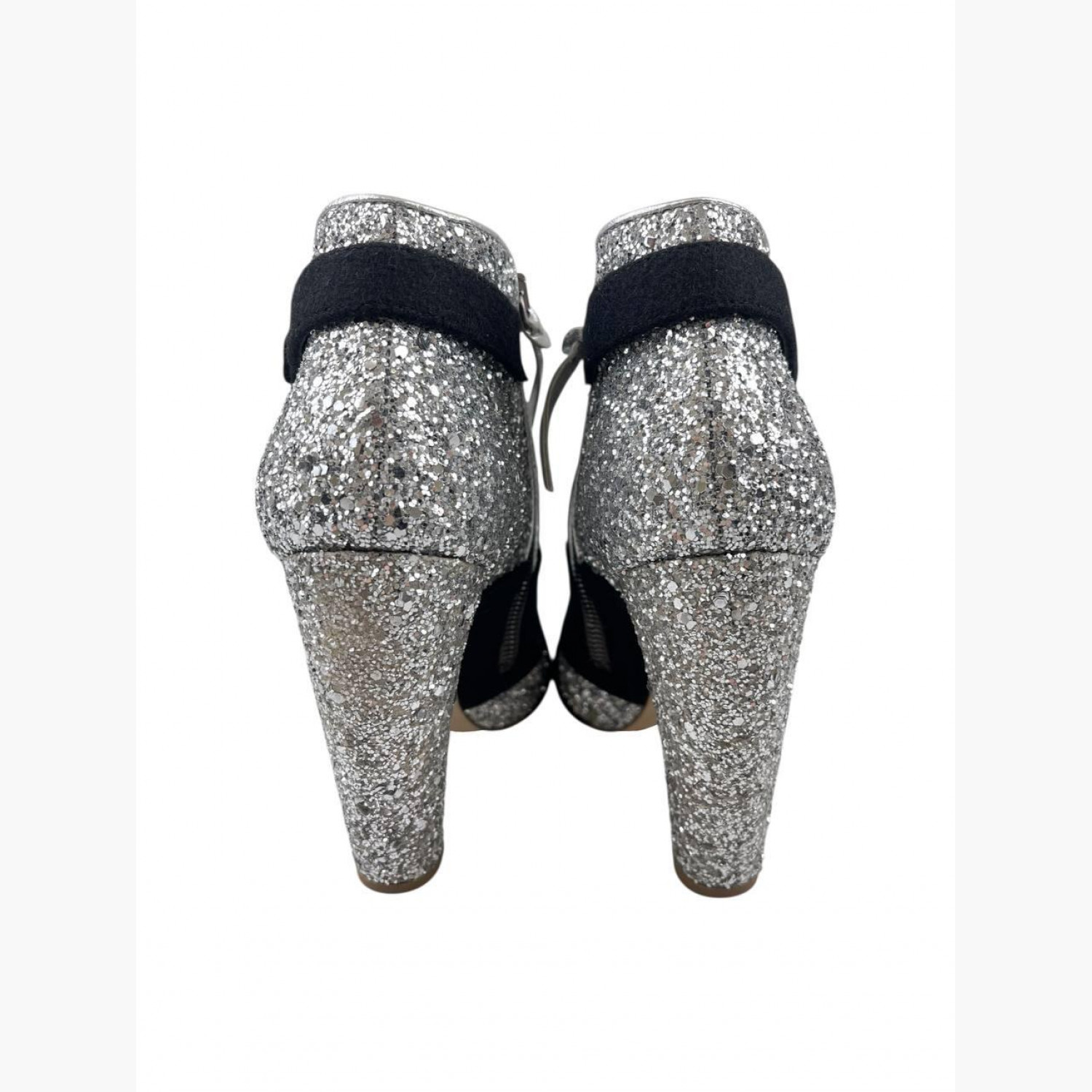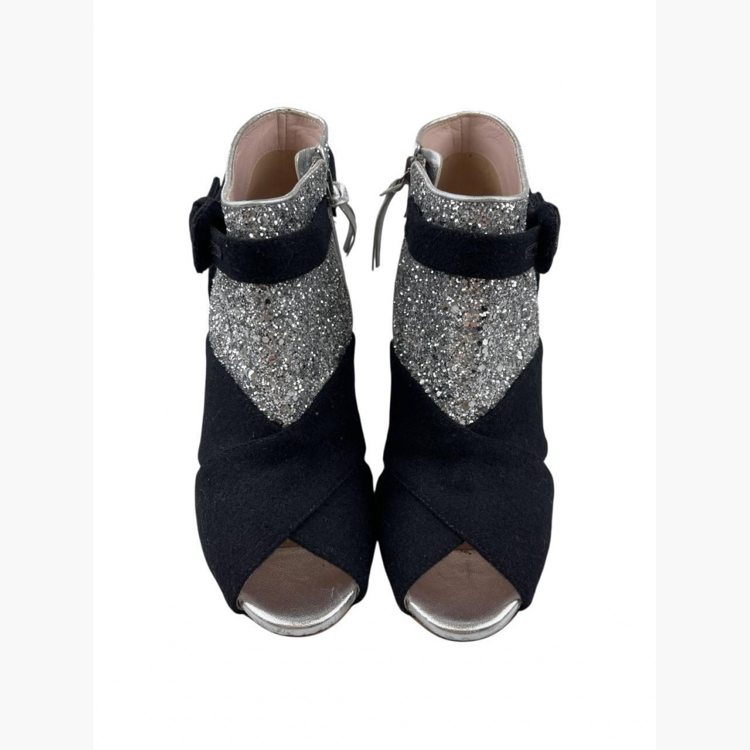Silver glitter ankle boots with black suede inserts and an open toe. In excellent condition, with no significant wear marks.