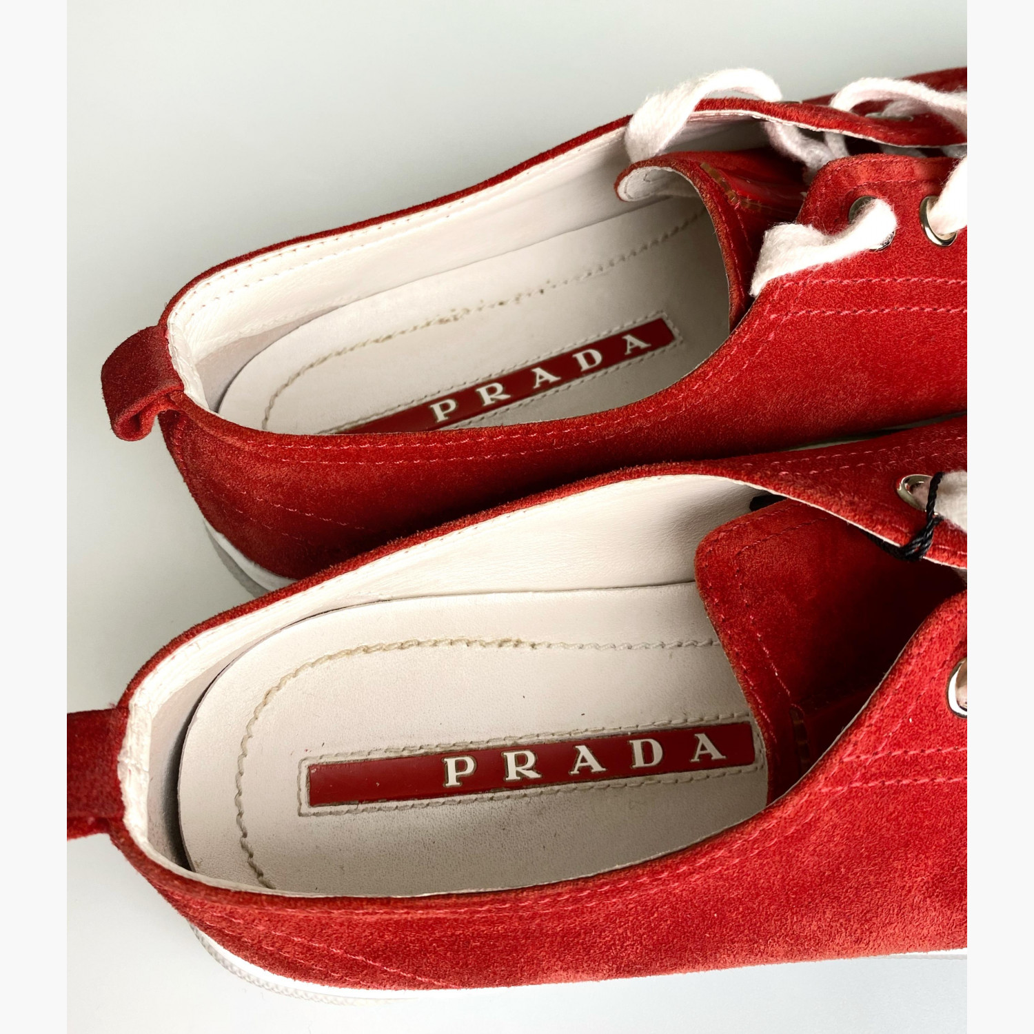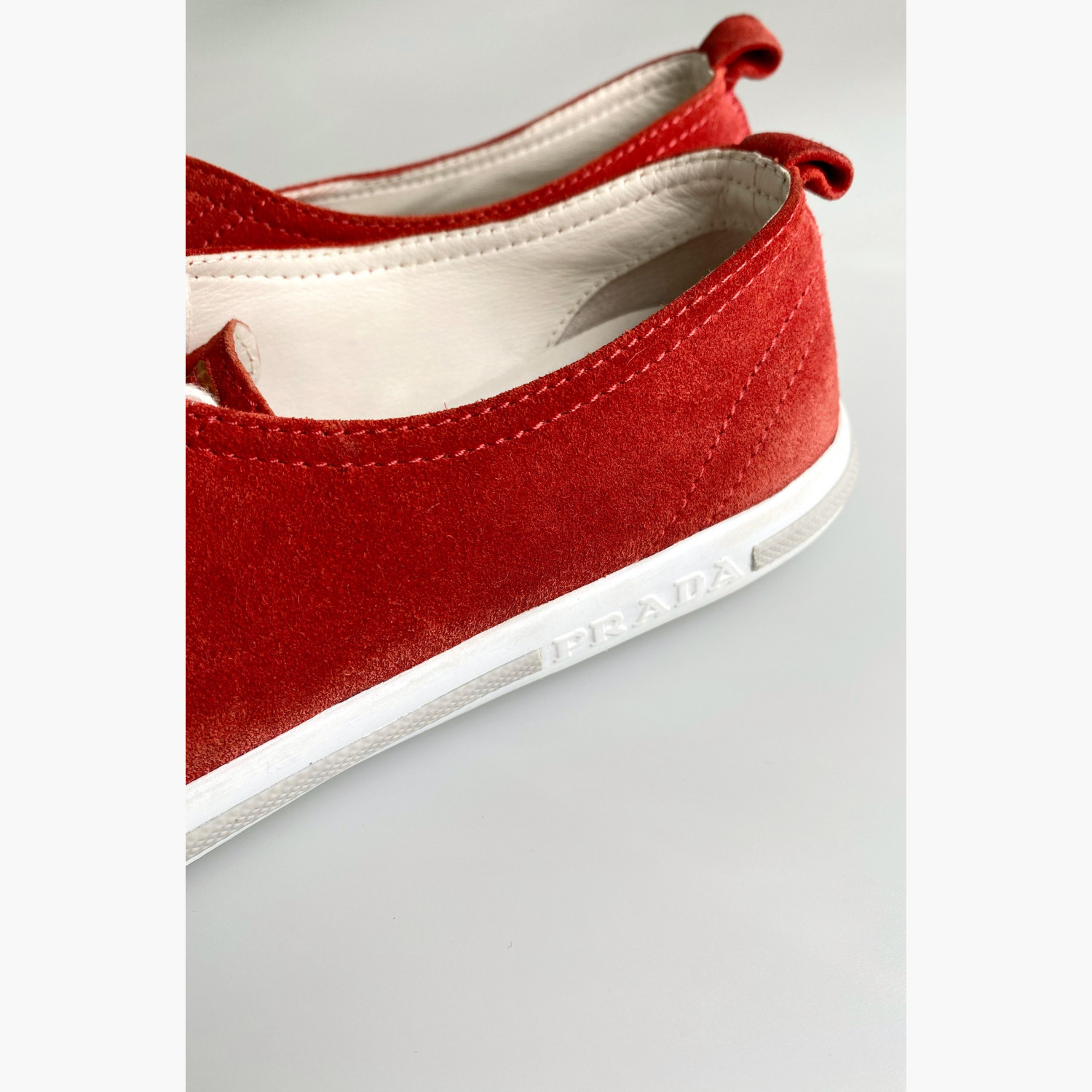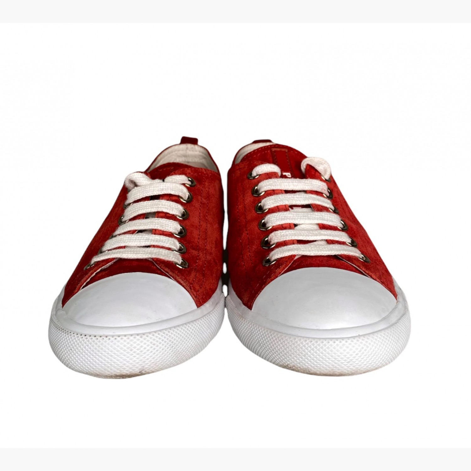 Red suede sneakers. Silver hardware, white laces. Good condition, there are some wear marks are visible on the sole and insole.