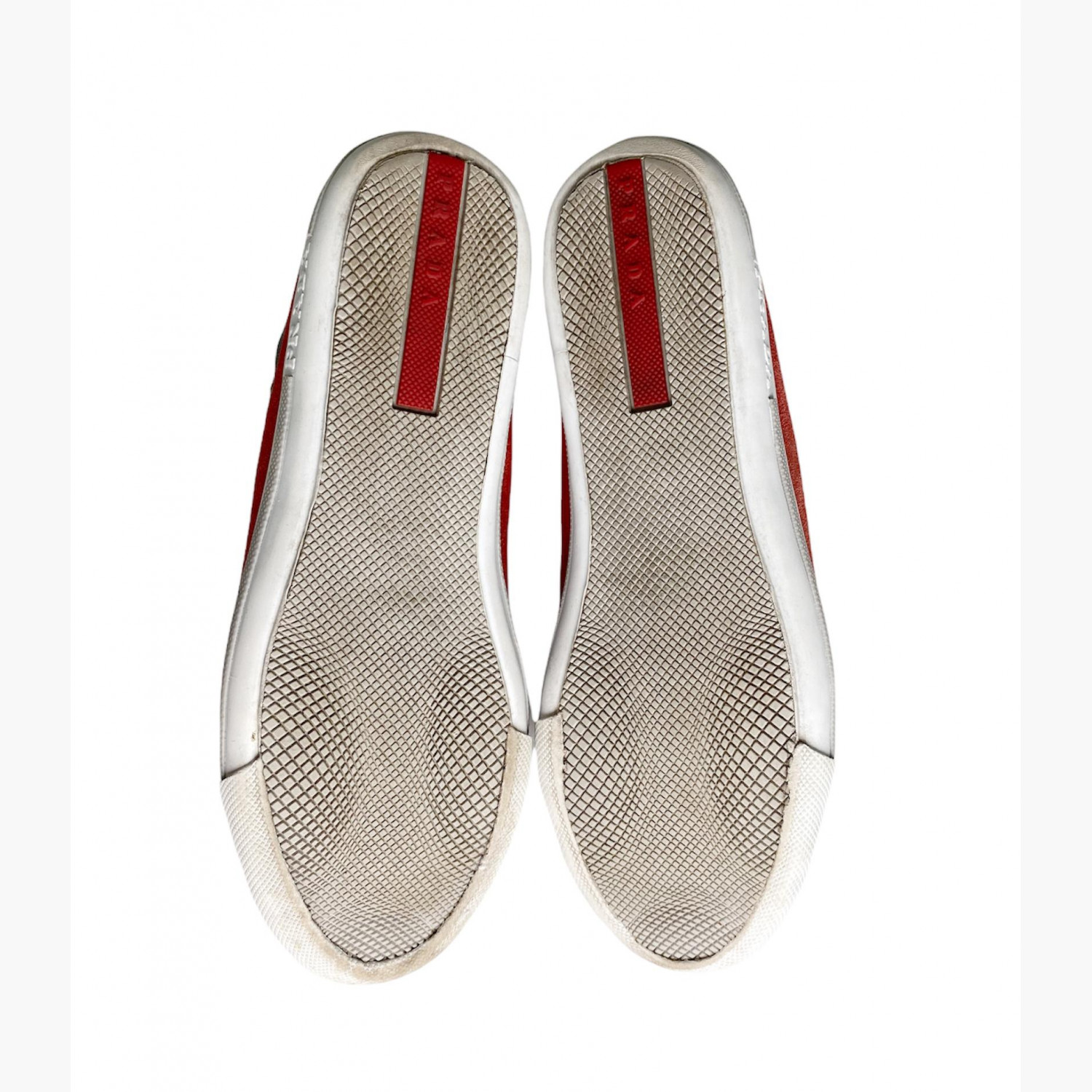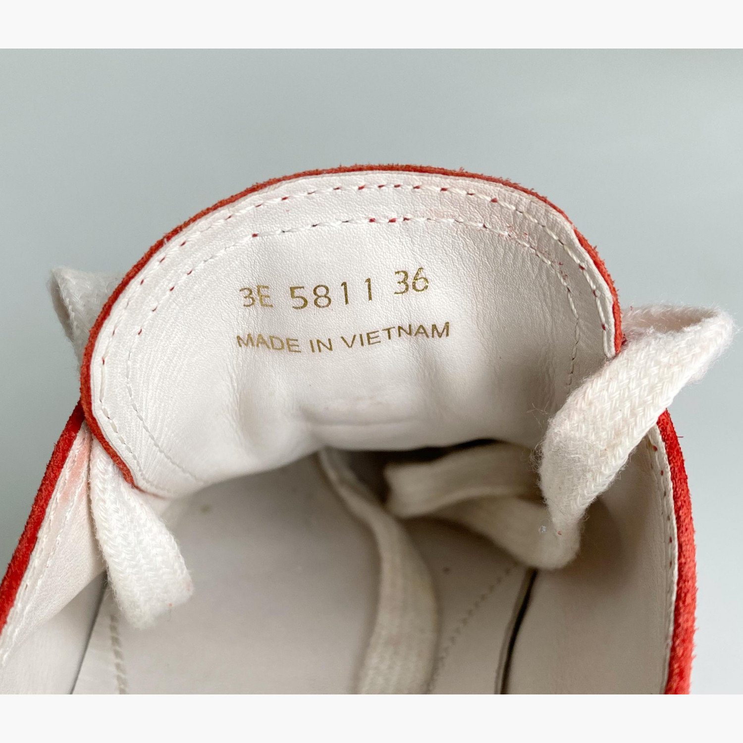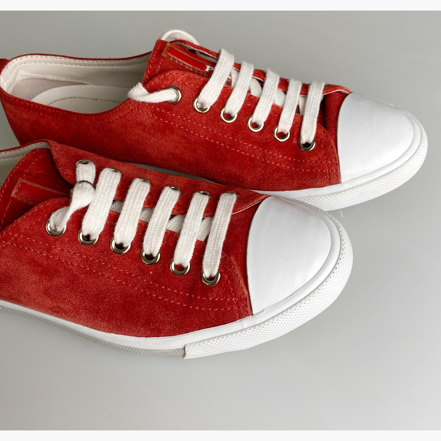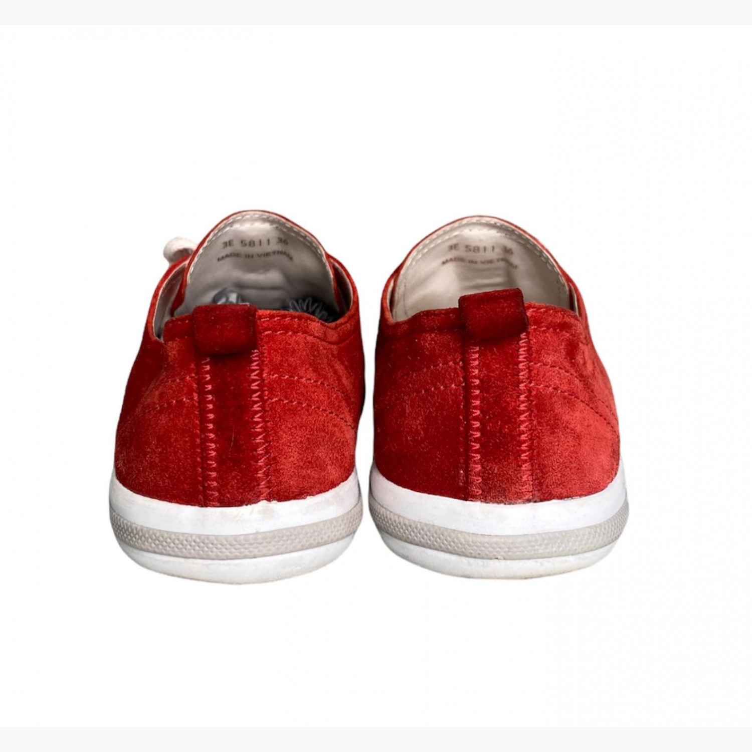 Red suede sneakers. Silver hardware, white laces. Good condition, there are some wear marks are visible on the sole and insole.