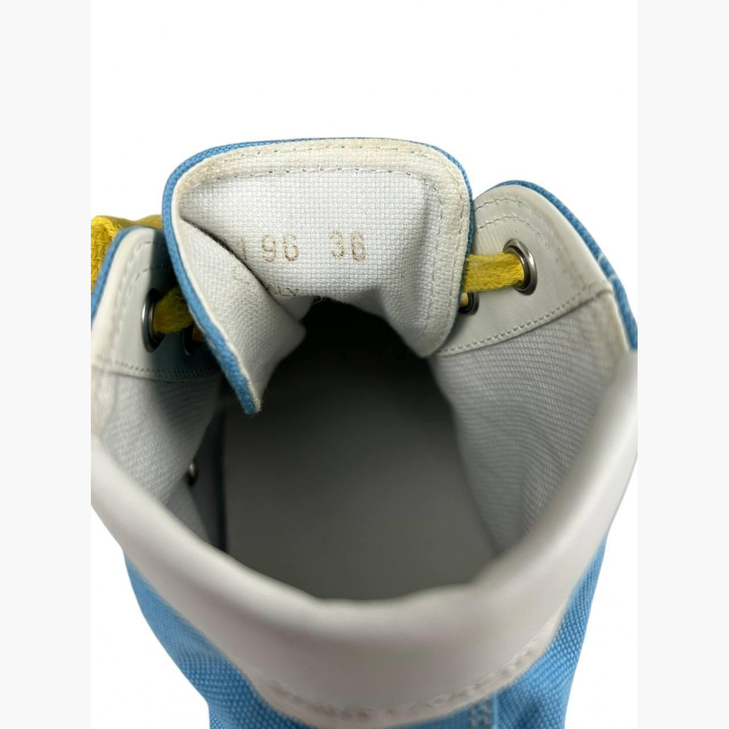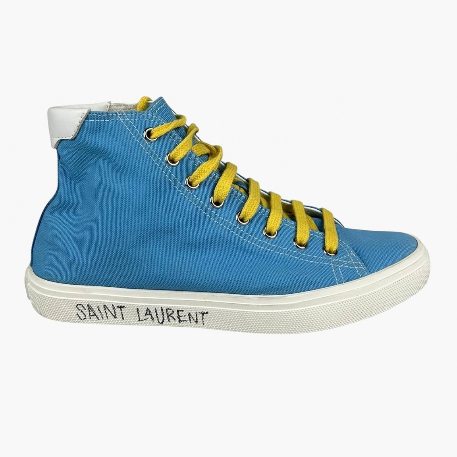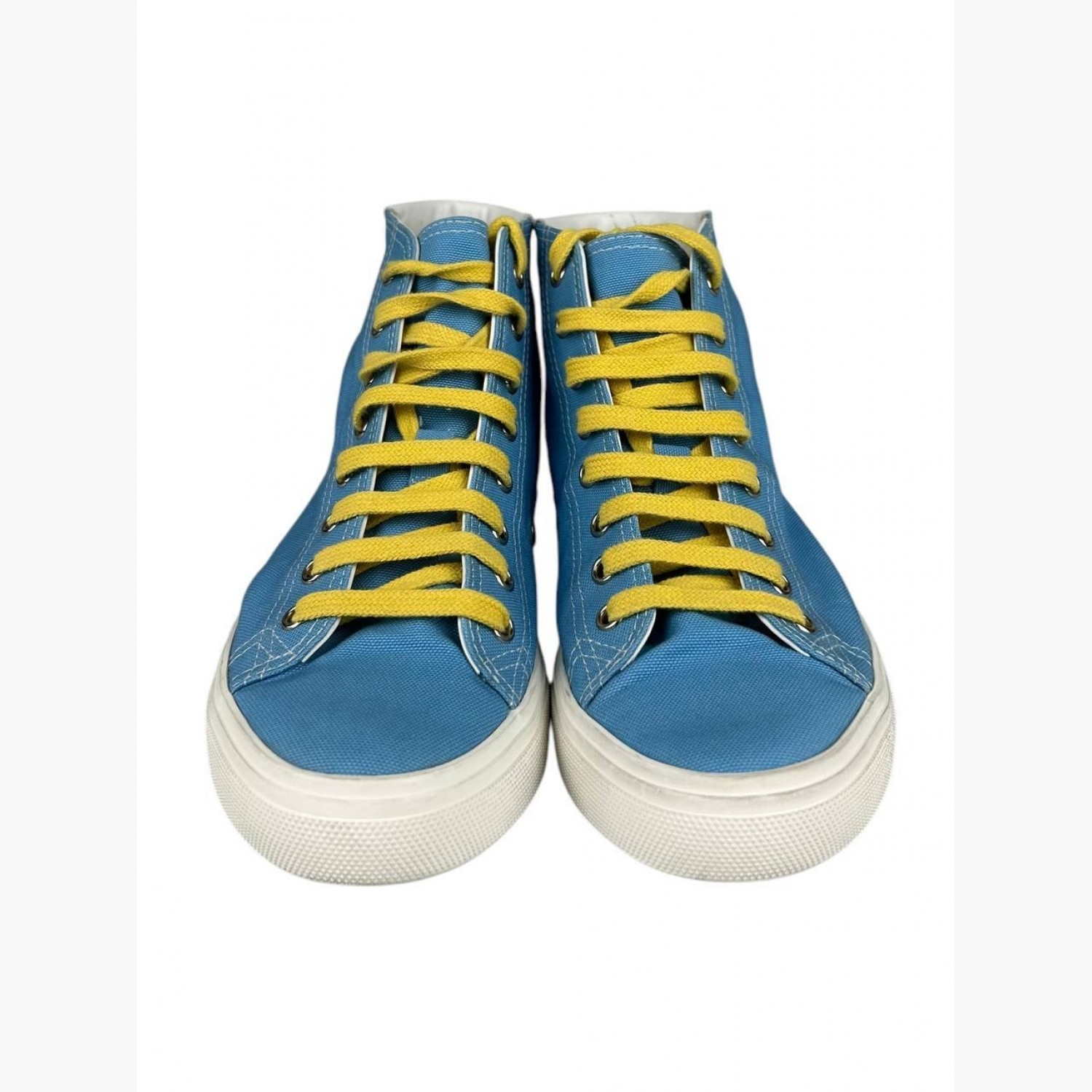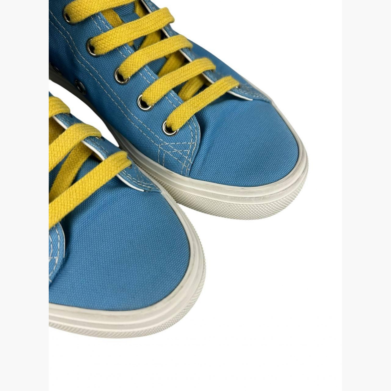 Blue textile sneakers in perfect condition, visible wear marks. Additional white laces are included.