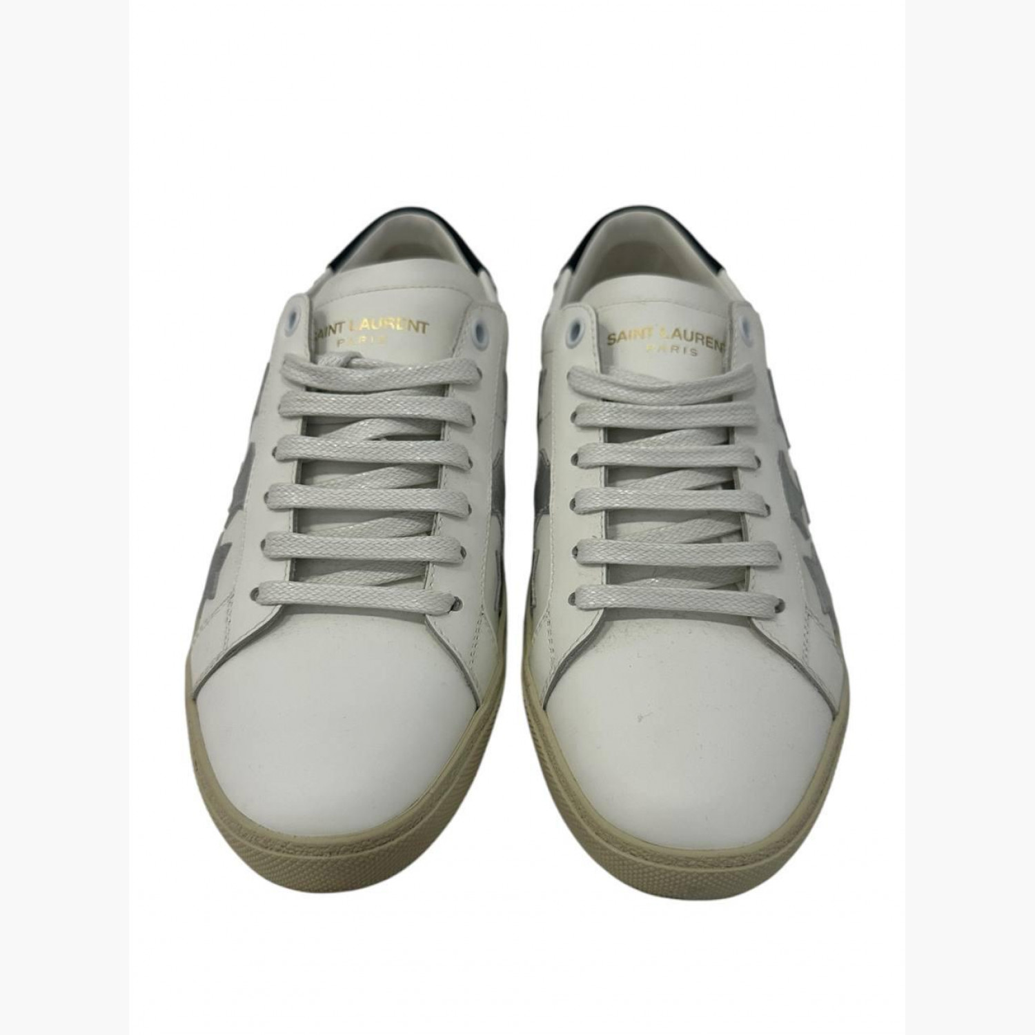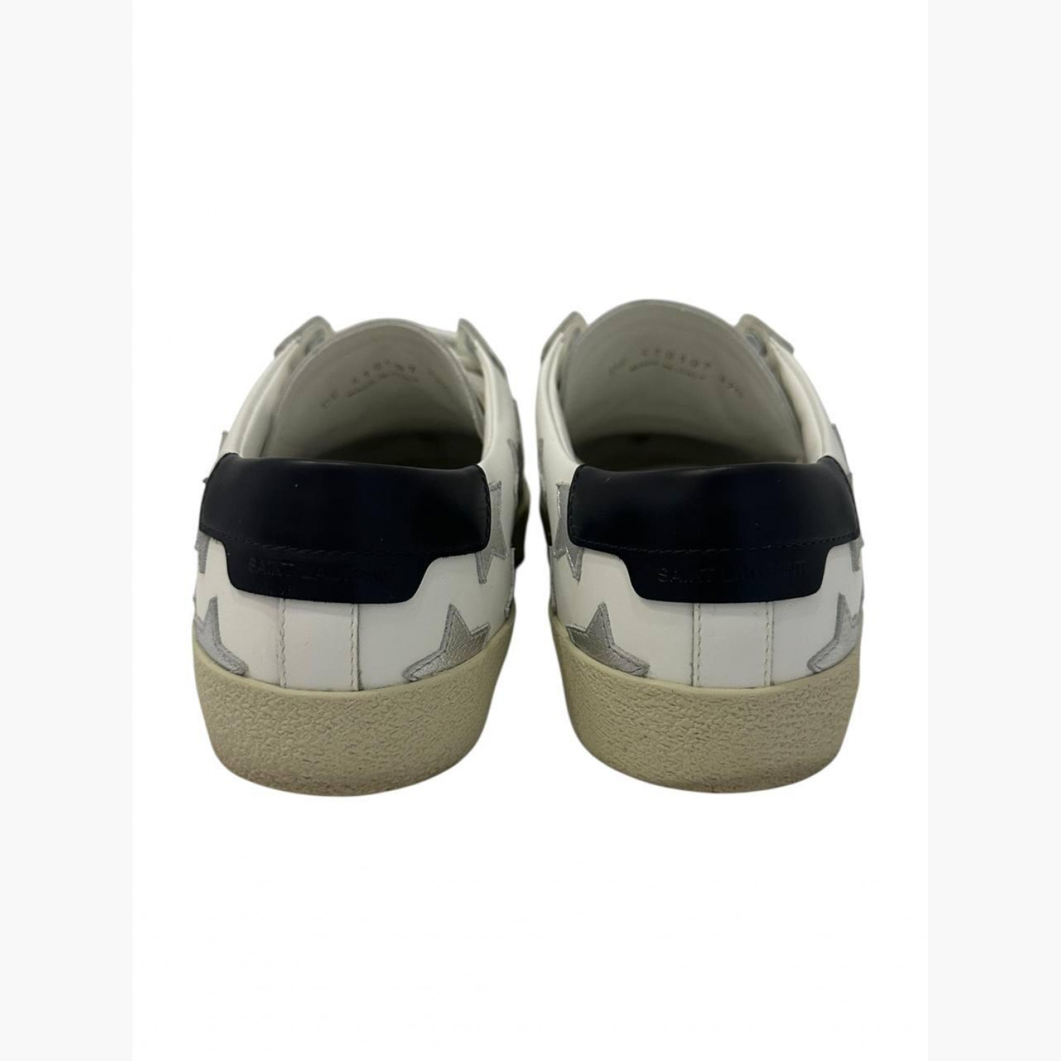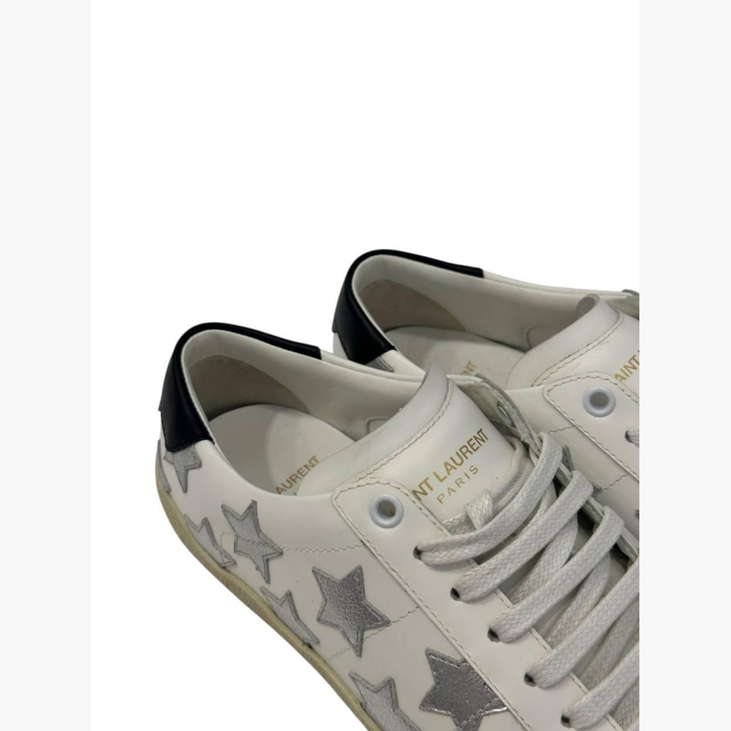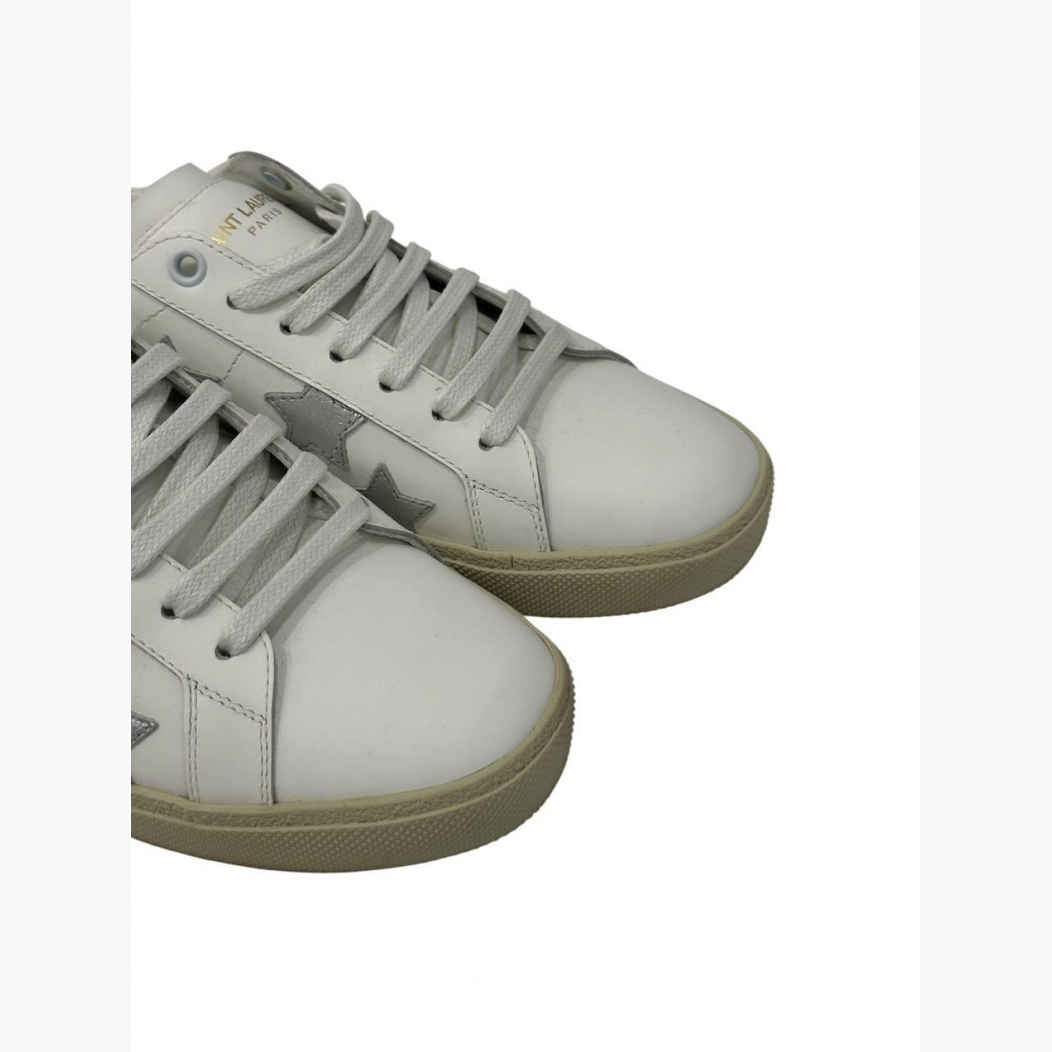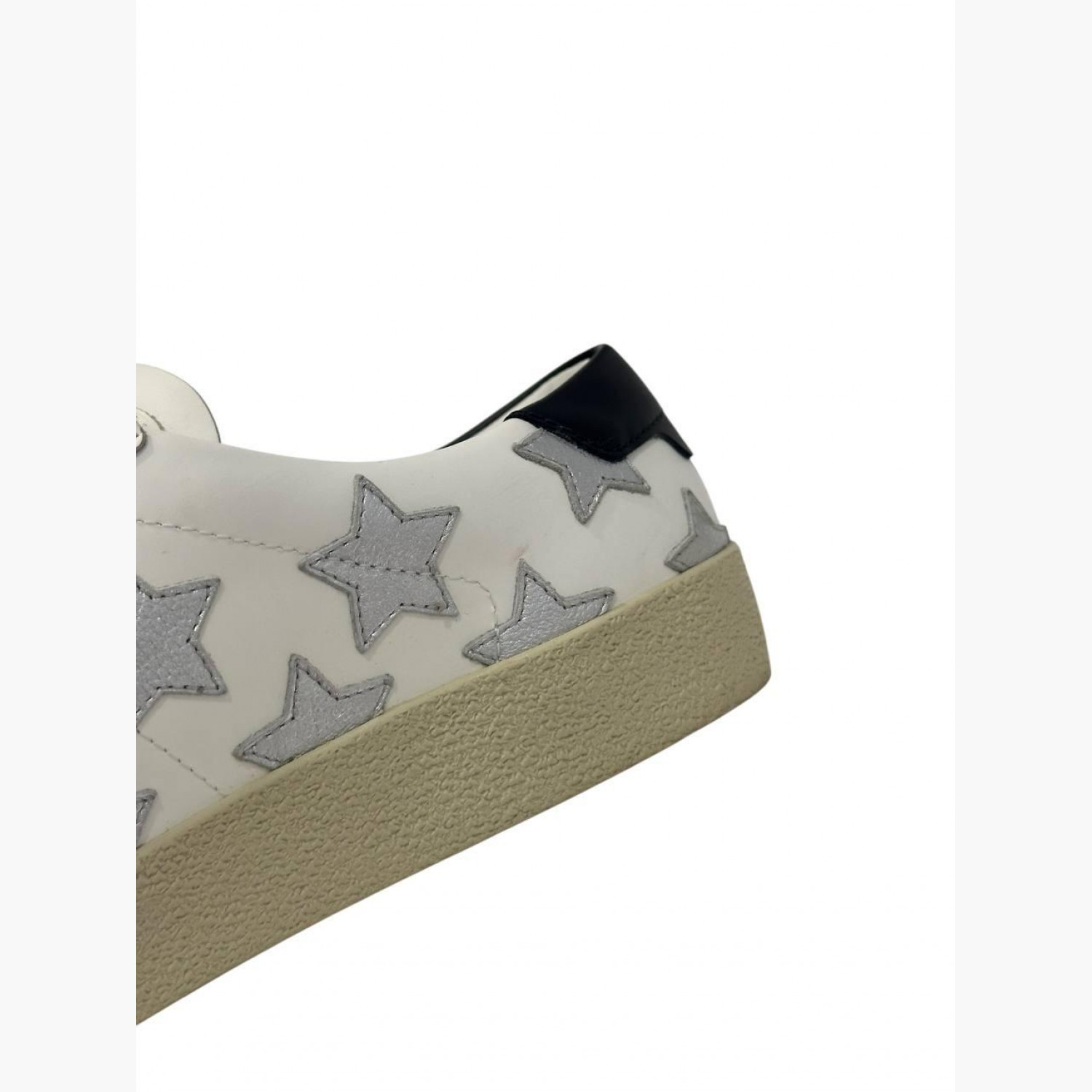 White leather sneakers with silver stars. In excellent condition with minor wear marks.