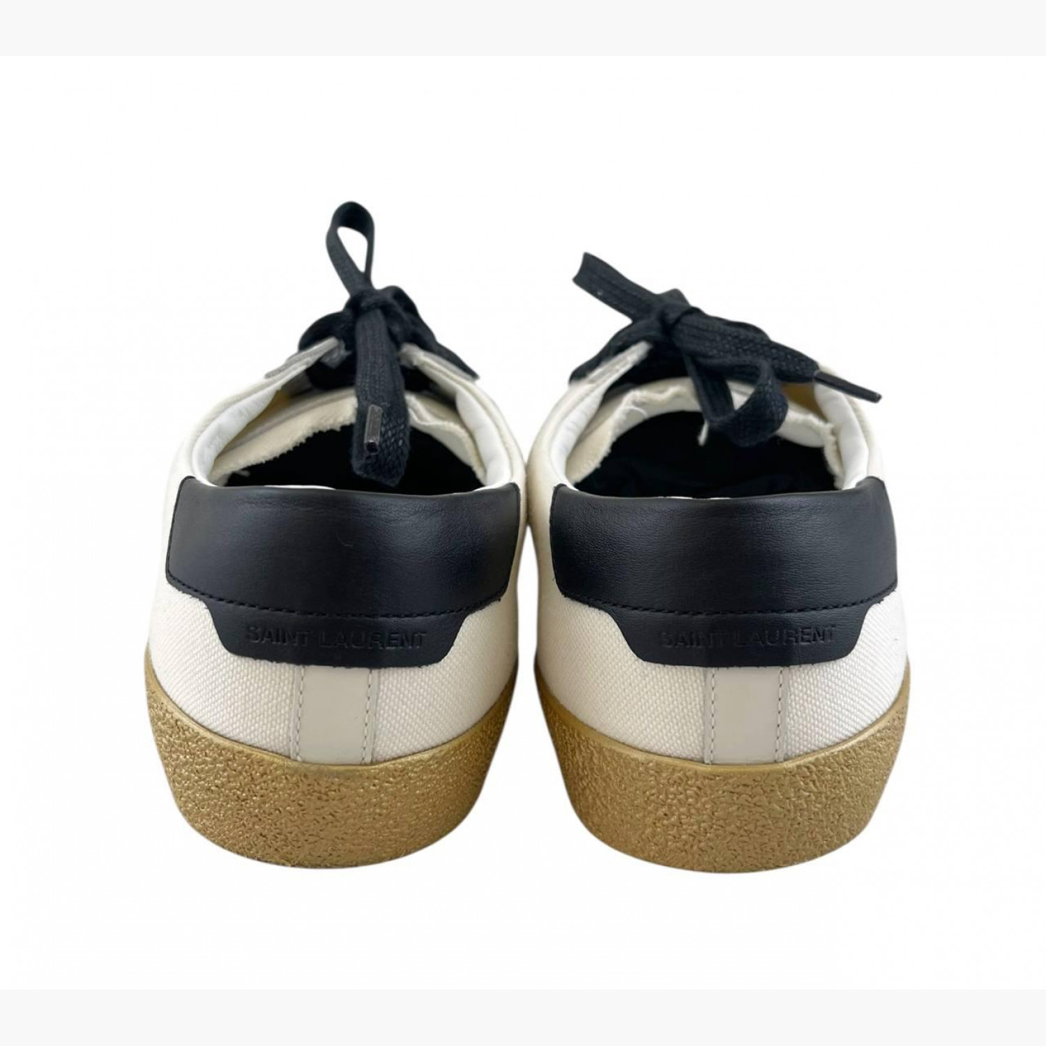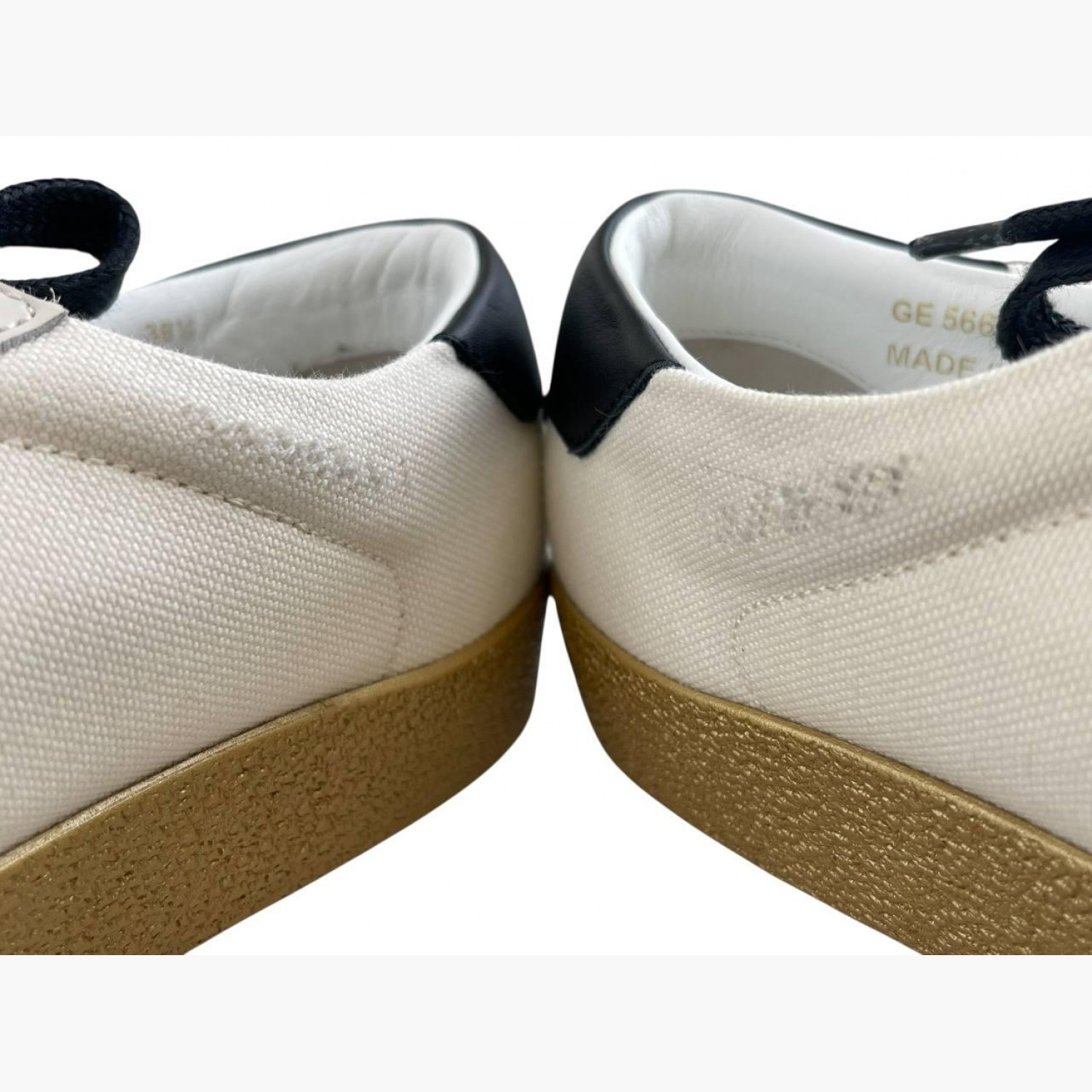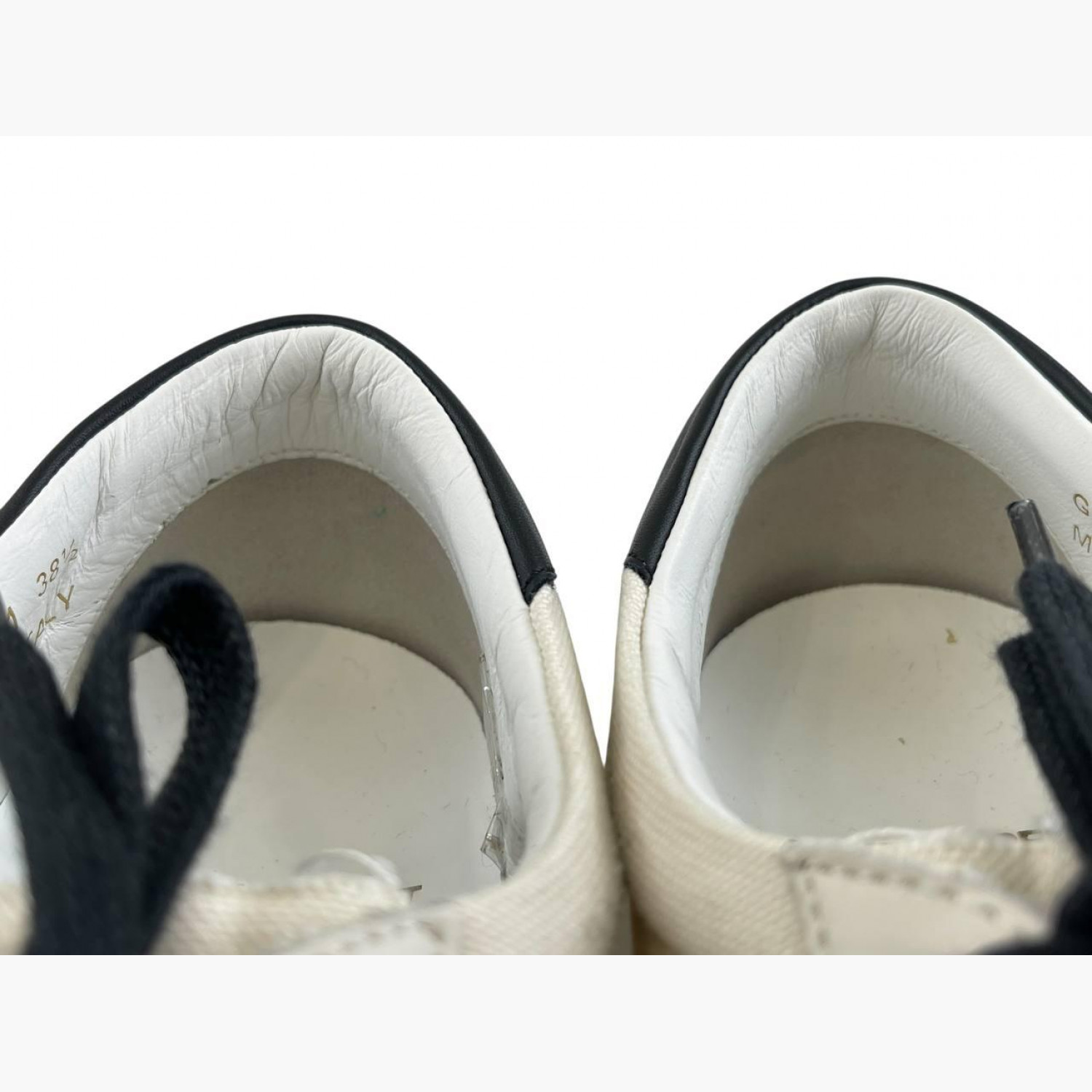 White textile sneakers with a black leather heel tab. In excellent condition, with minor wear marks.