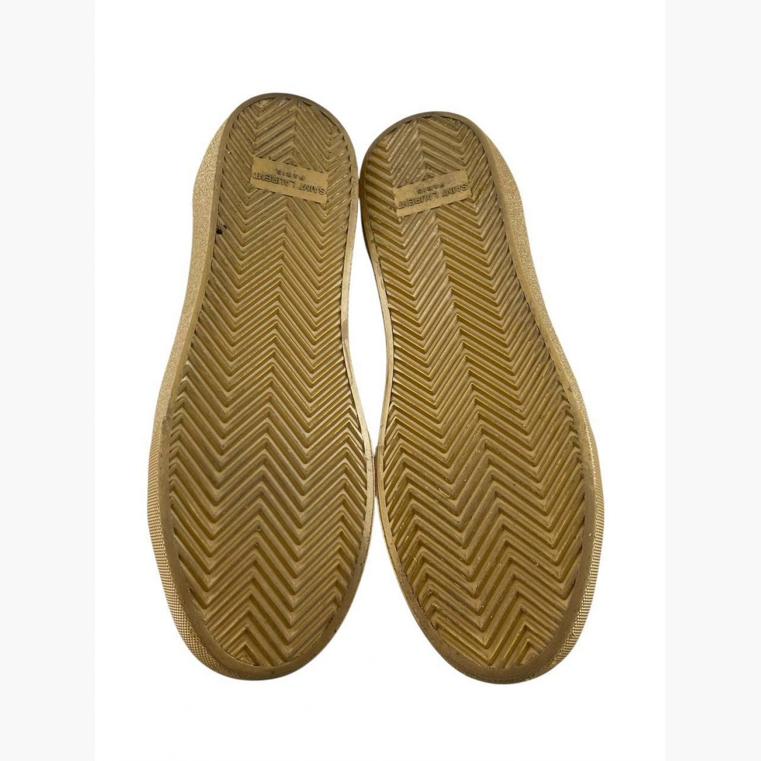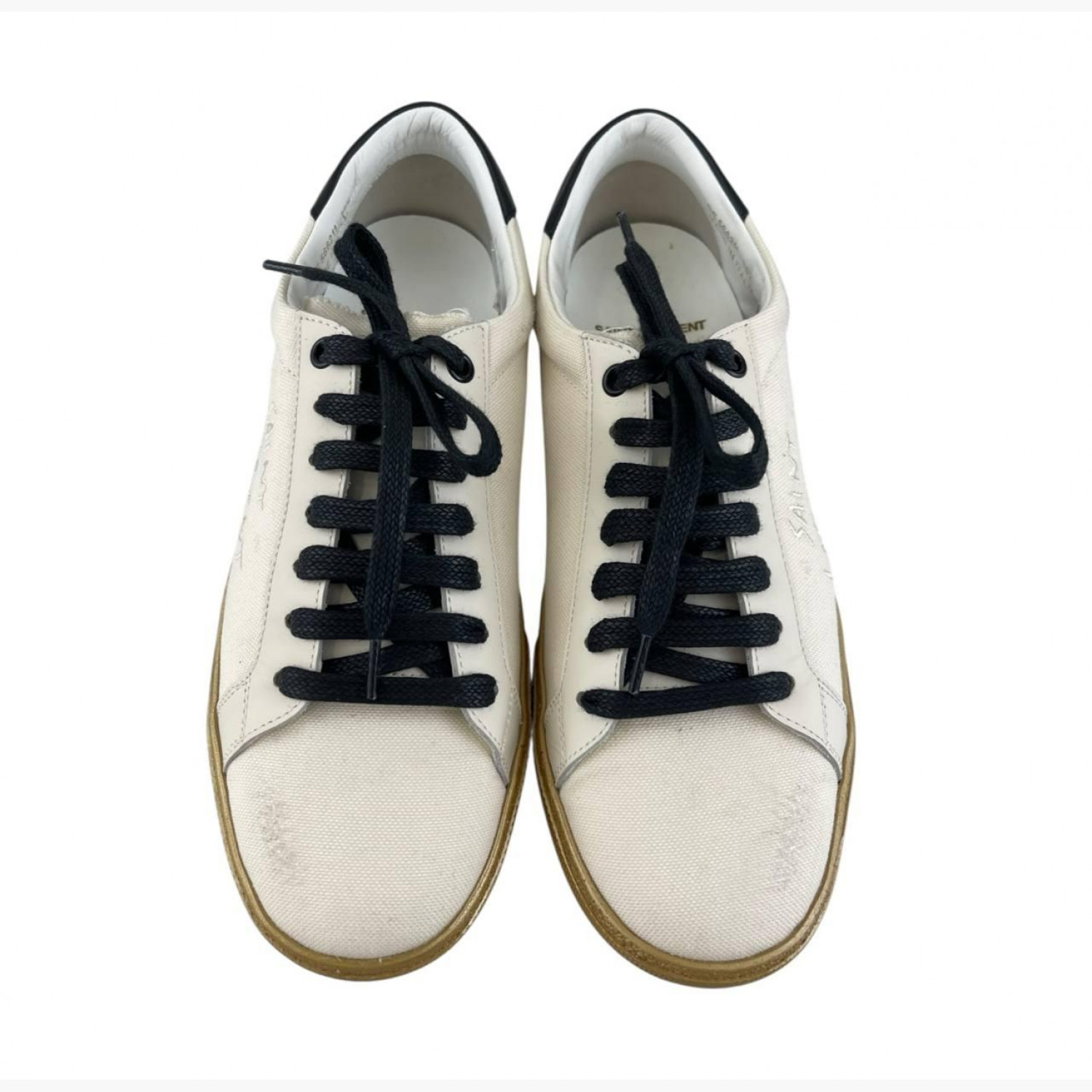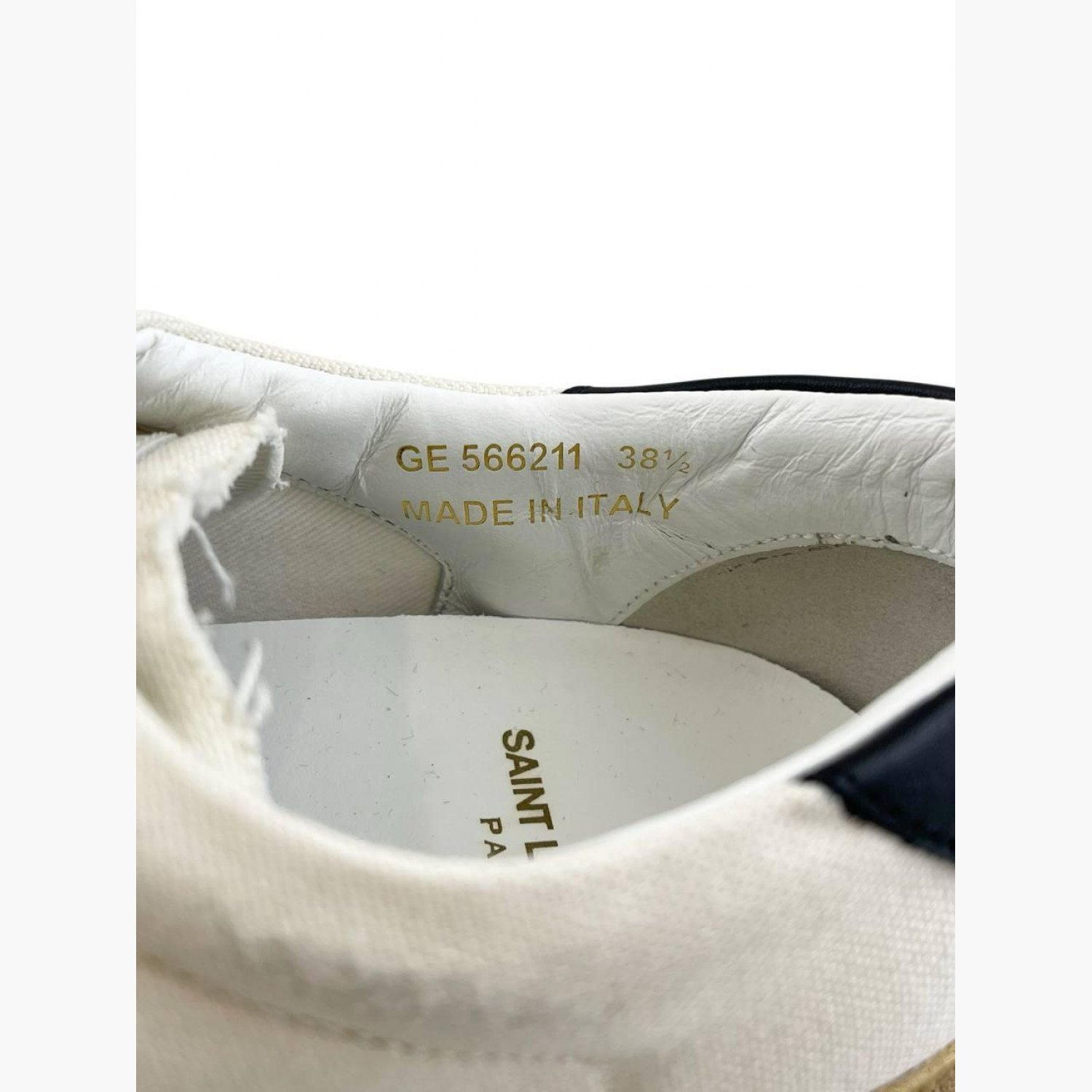 White textile sneakers with a black leather heel tab. In excellent condition, with minor wear marks.