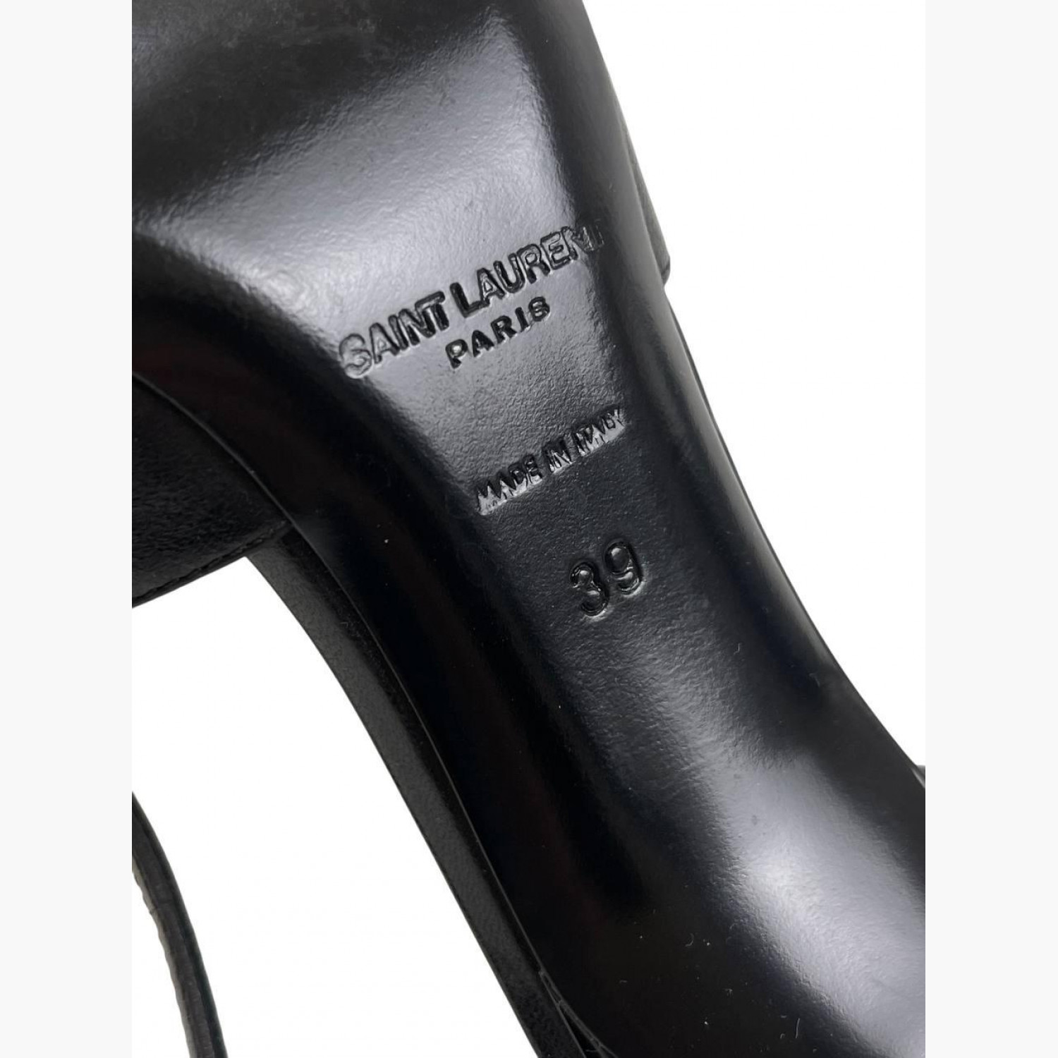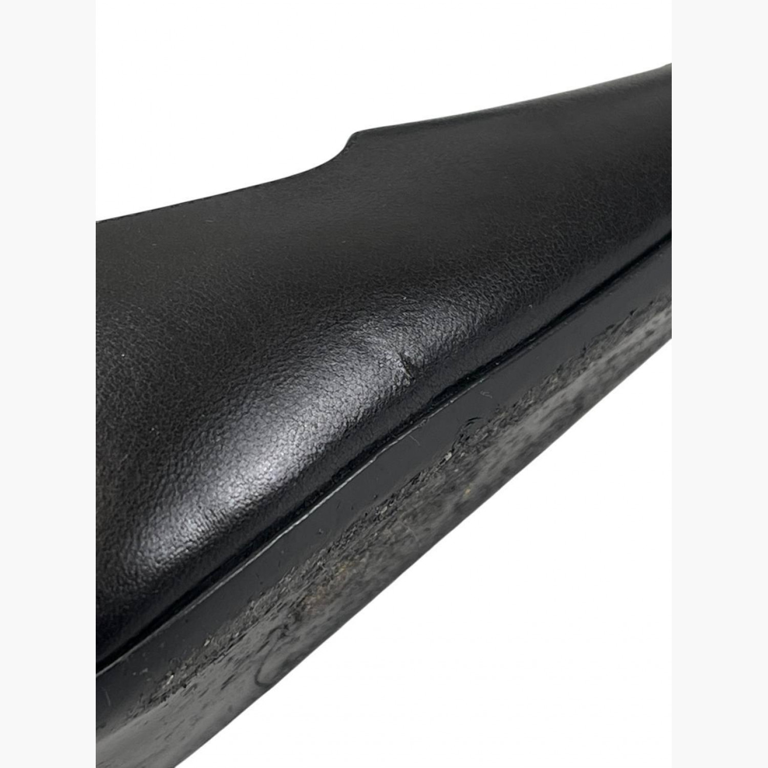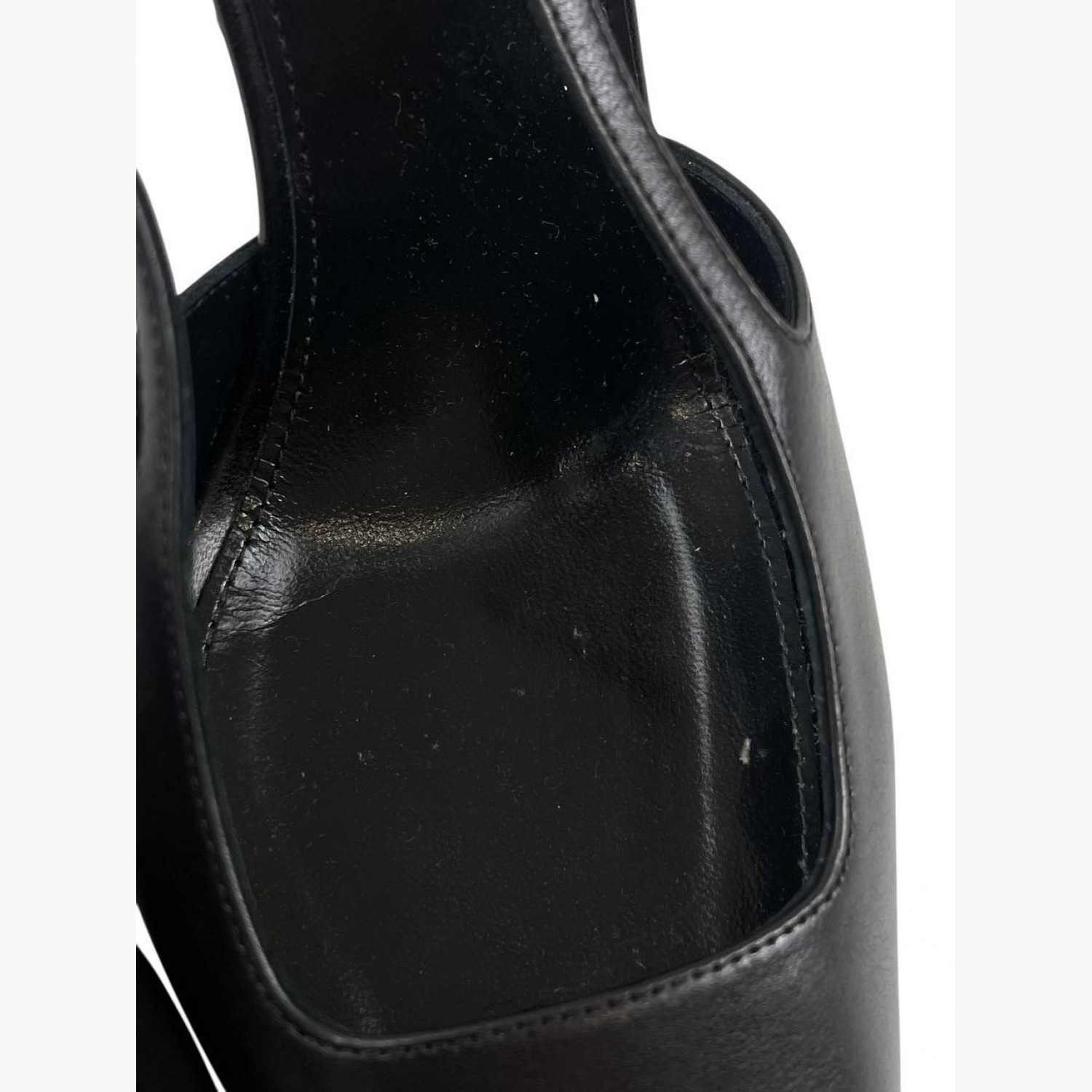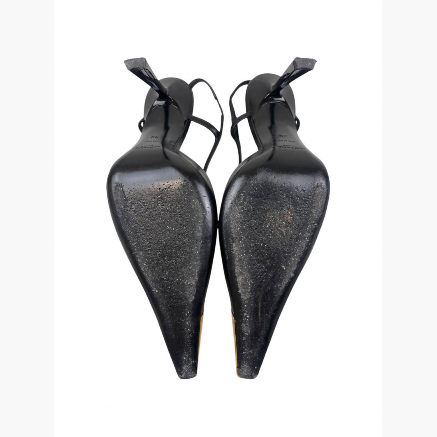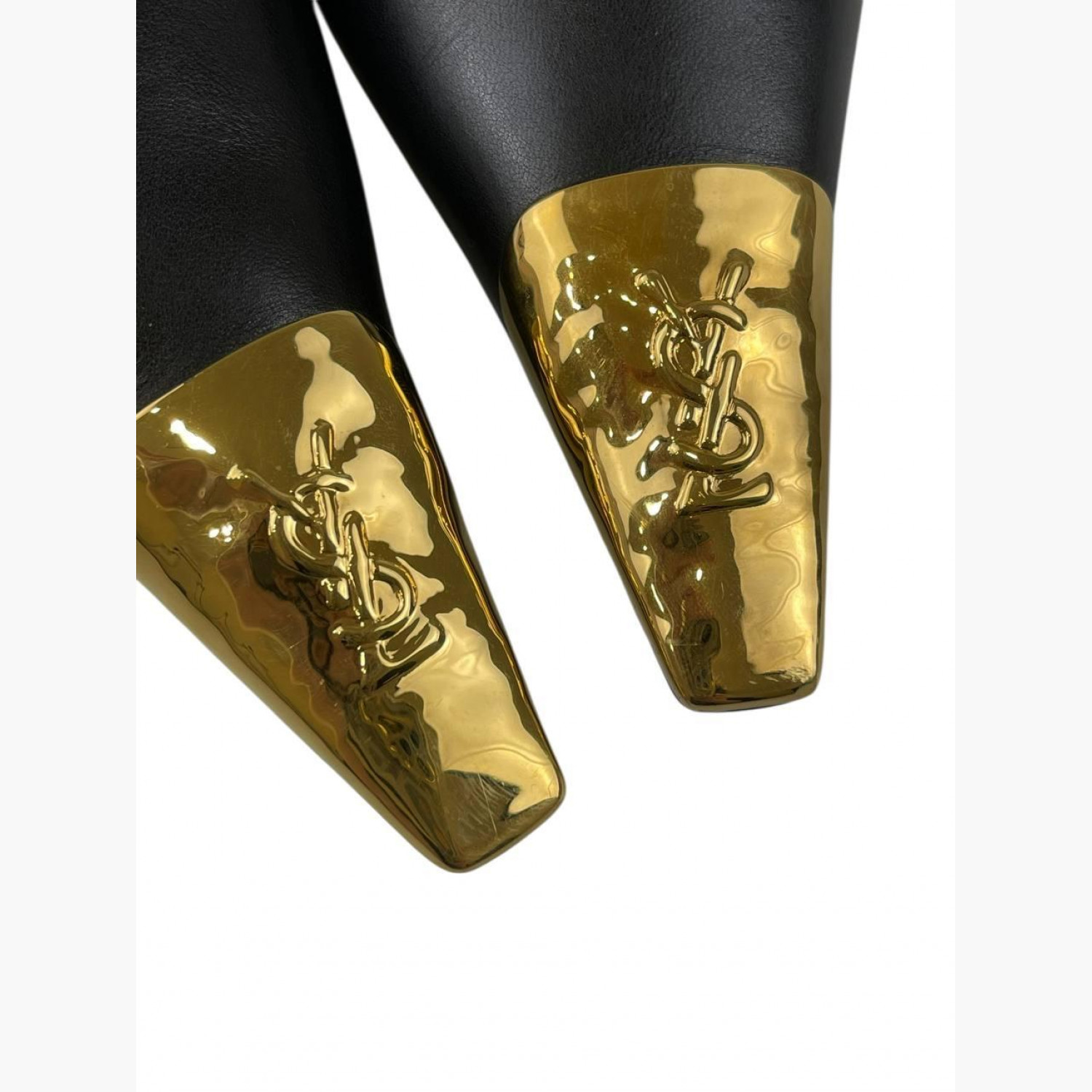 Black leather shoes with an elongated gold-colored metal toe and a logo. In excellent condition, with wear marks.