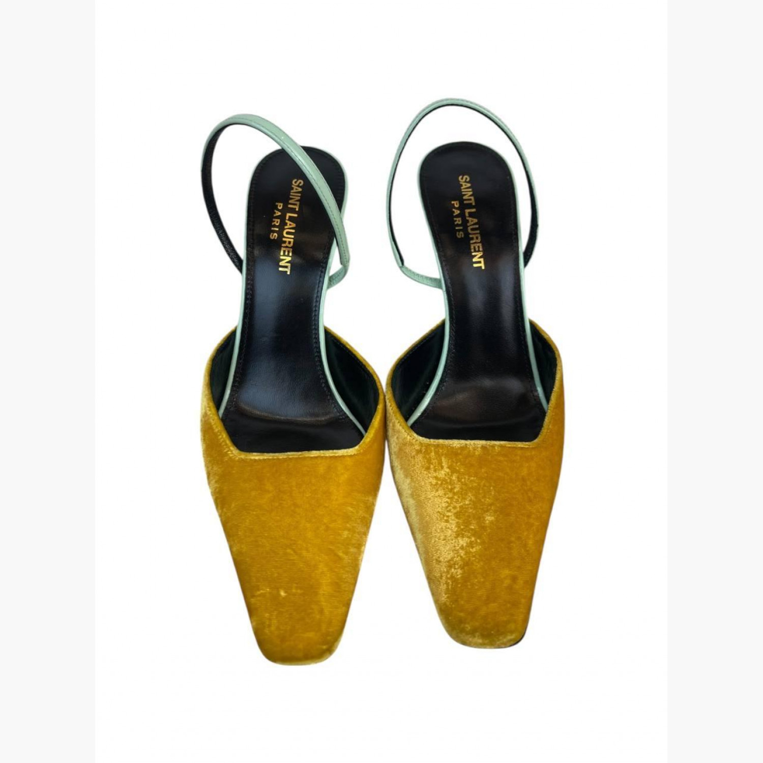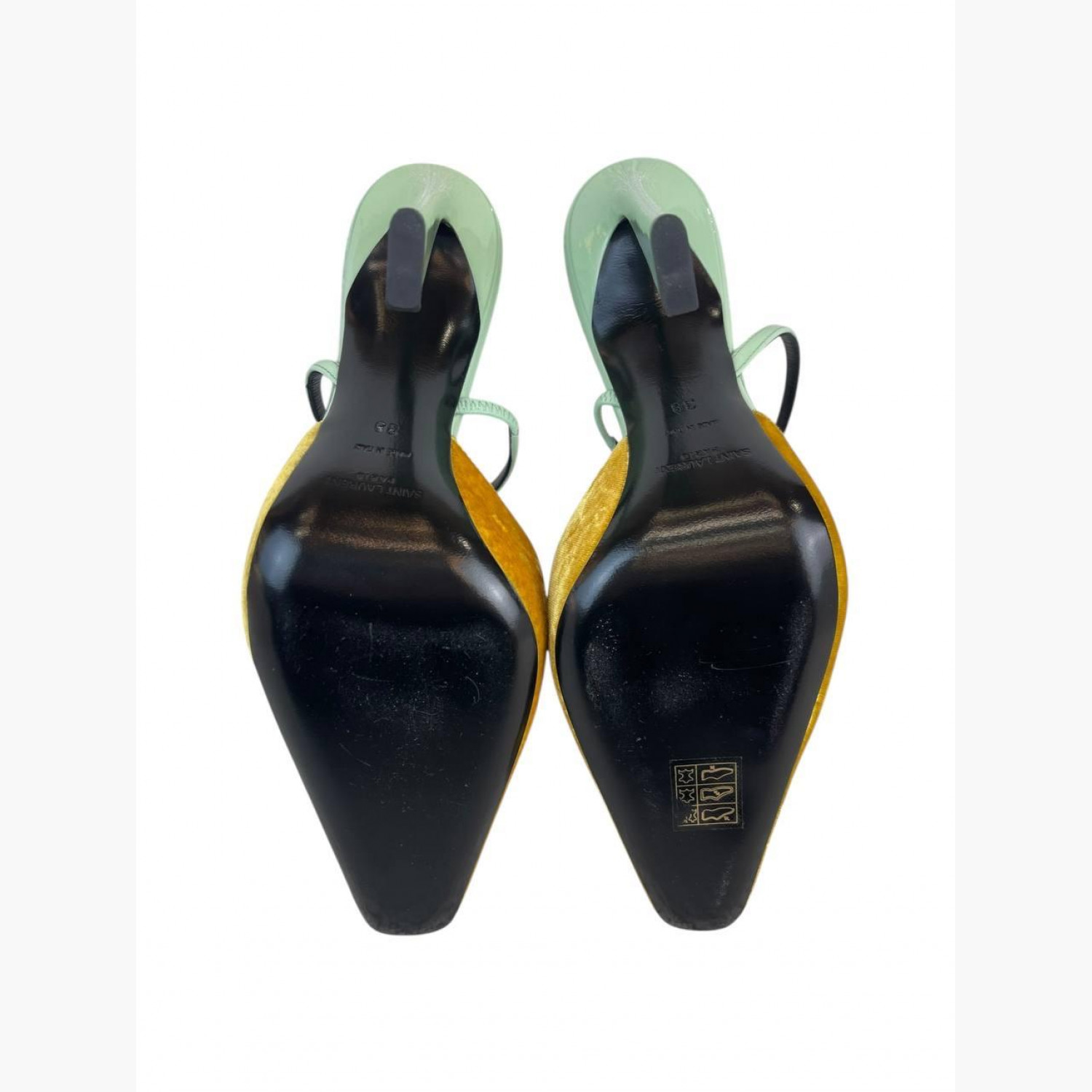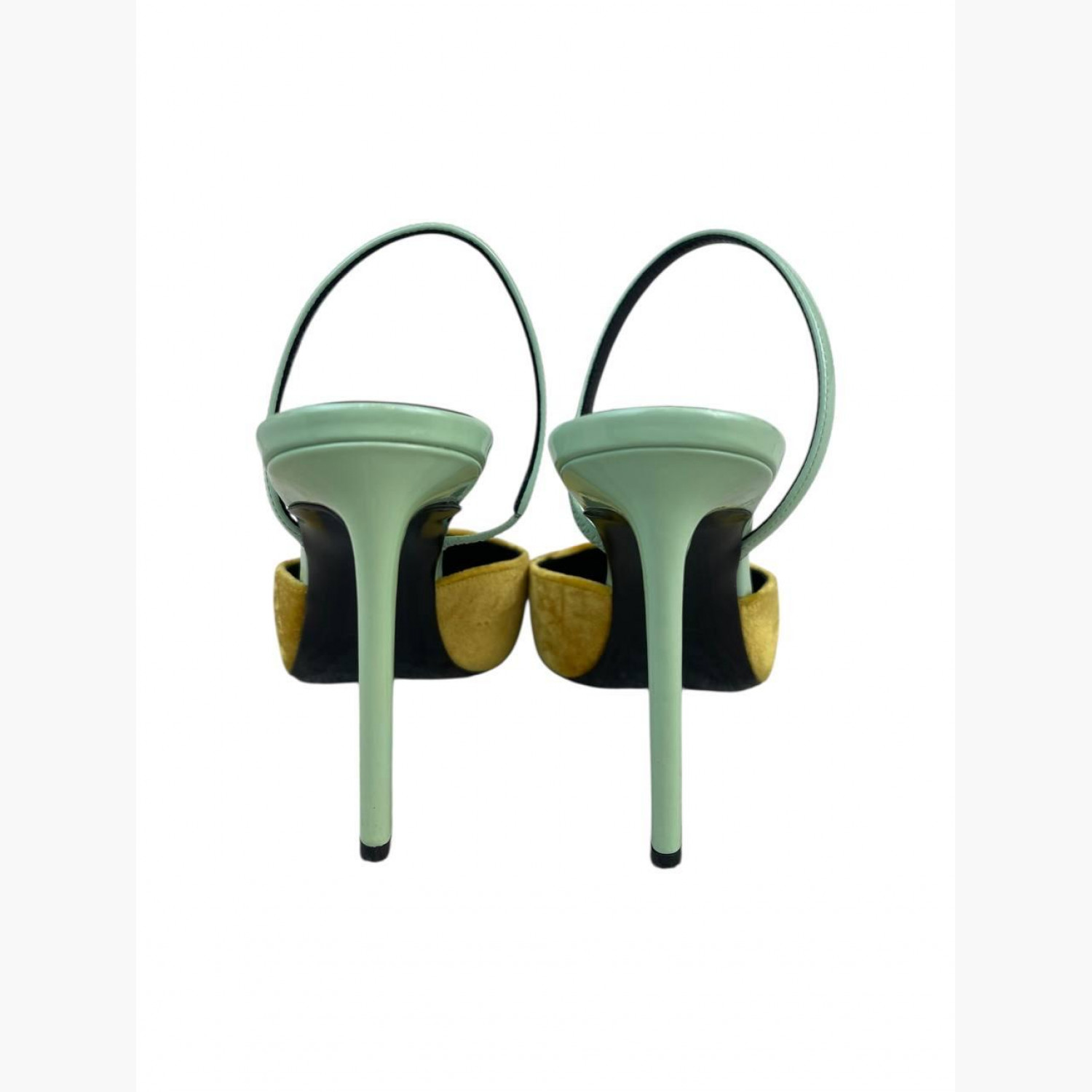 Yellow sandals with a lacquered mint-colored heel and a soft square-toe yellow velvet front. In excellent condition, with no significant wear marks.