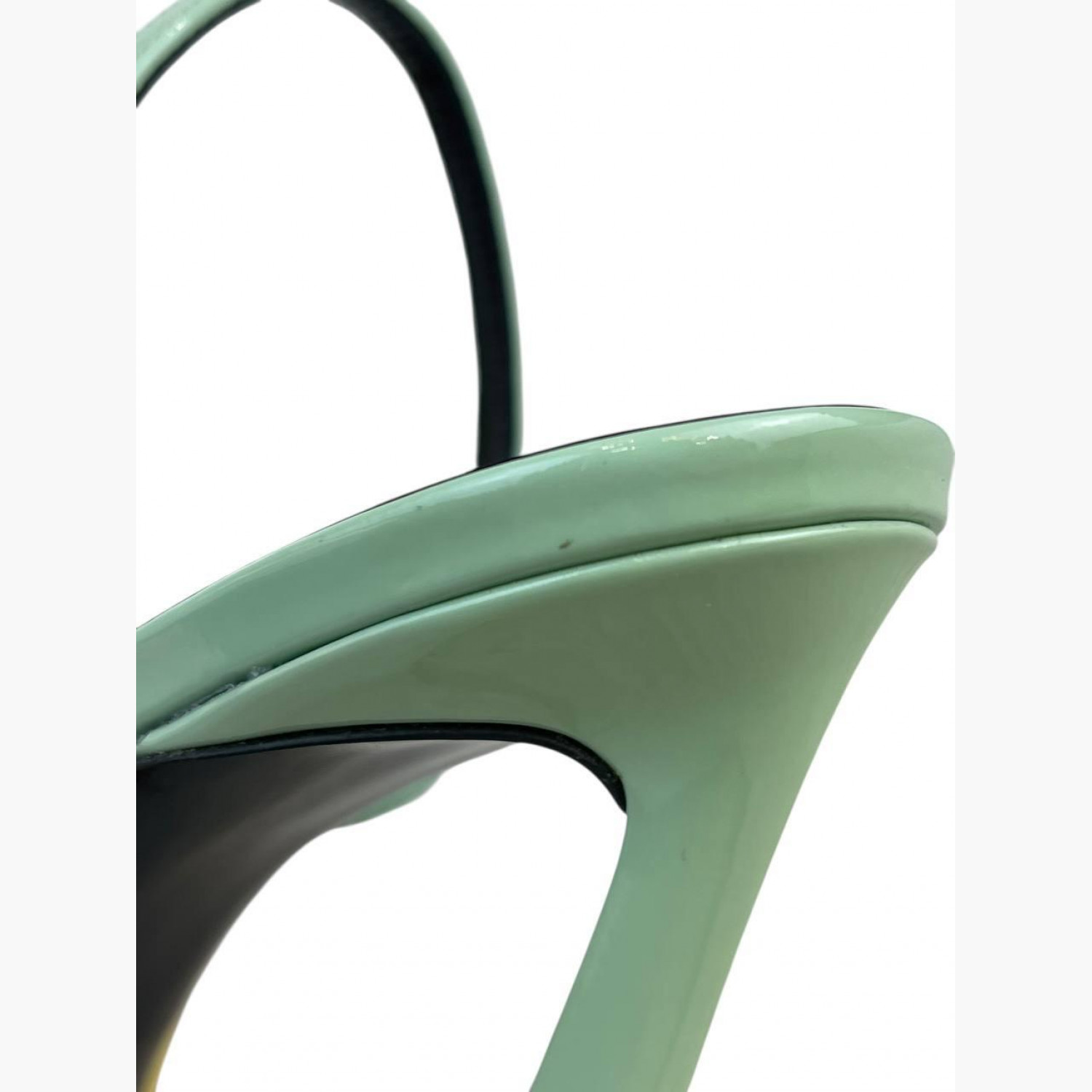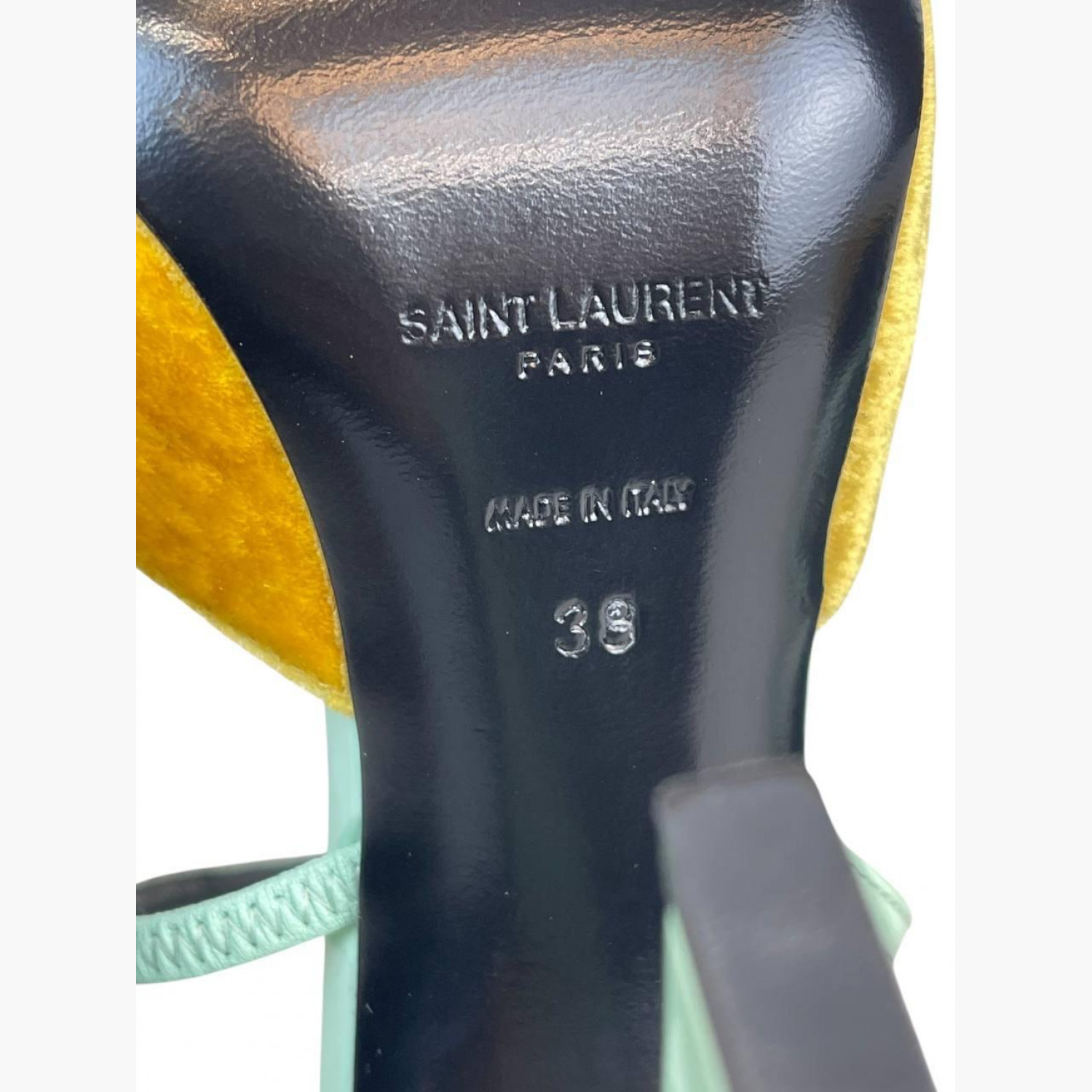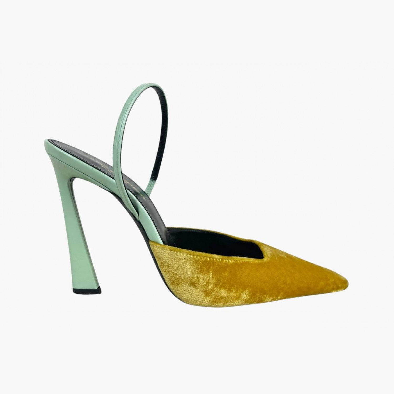 Yellow sandals with a lacquered mint-colored heel and a soft square-toe yellow velvet front. In excellent condition, with no significant wear marks.
