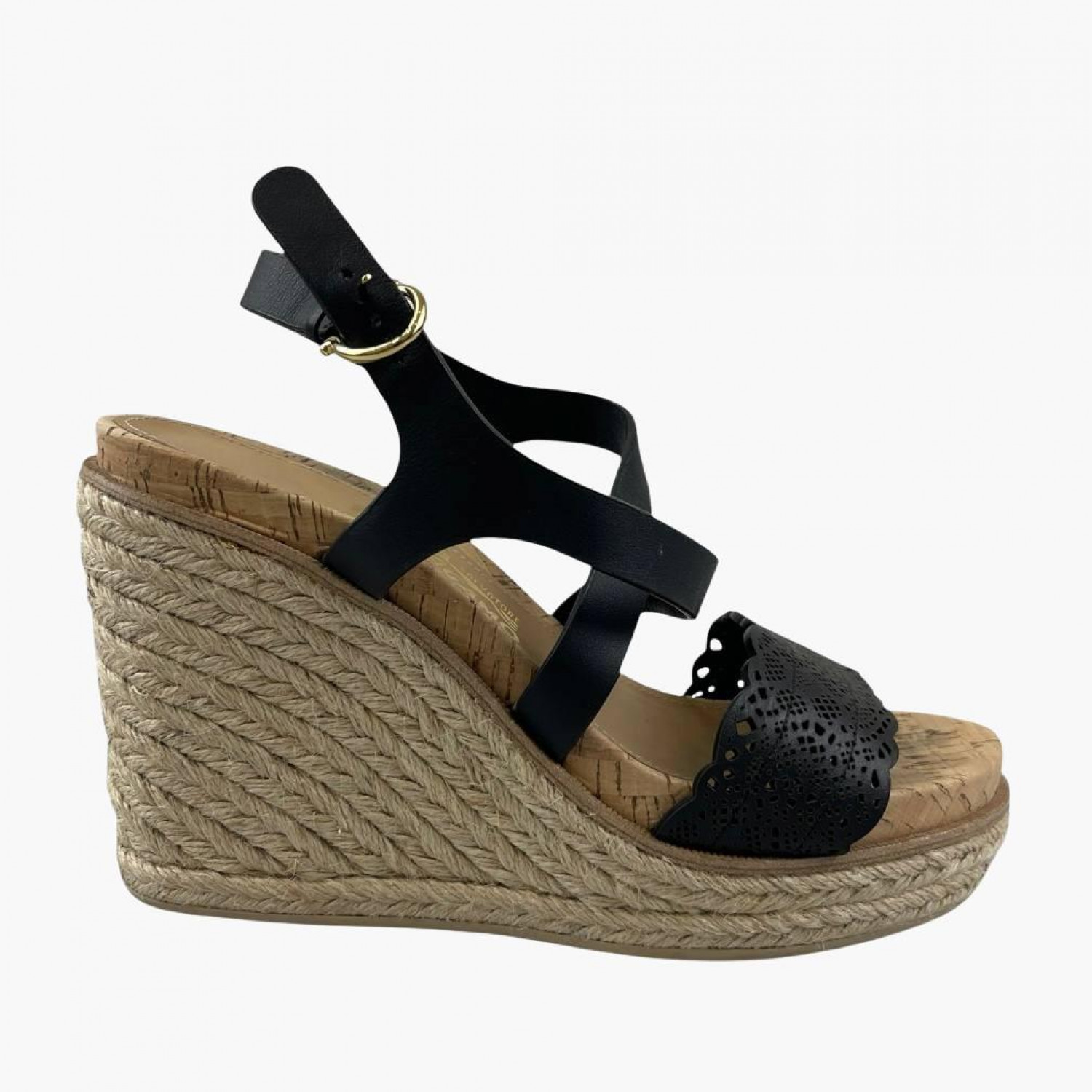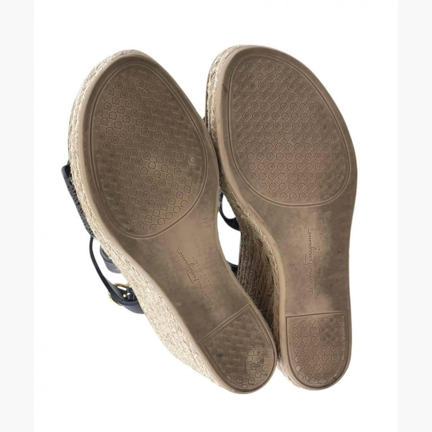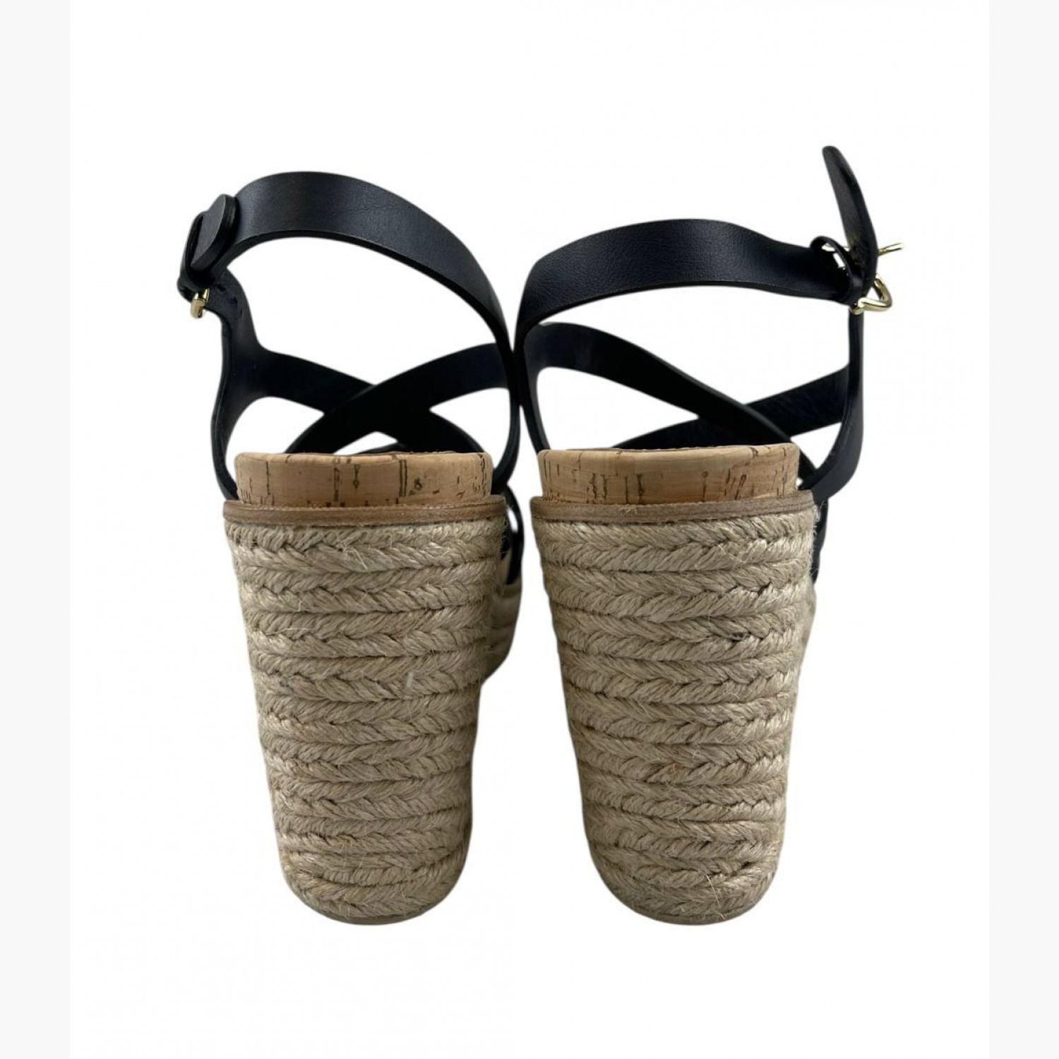 Black leather wedge sandals with braided detailing. In good condition with wear marks.