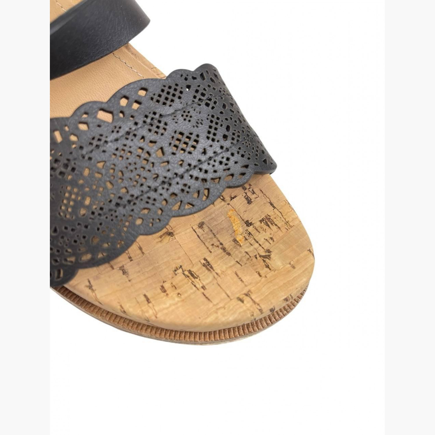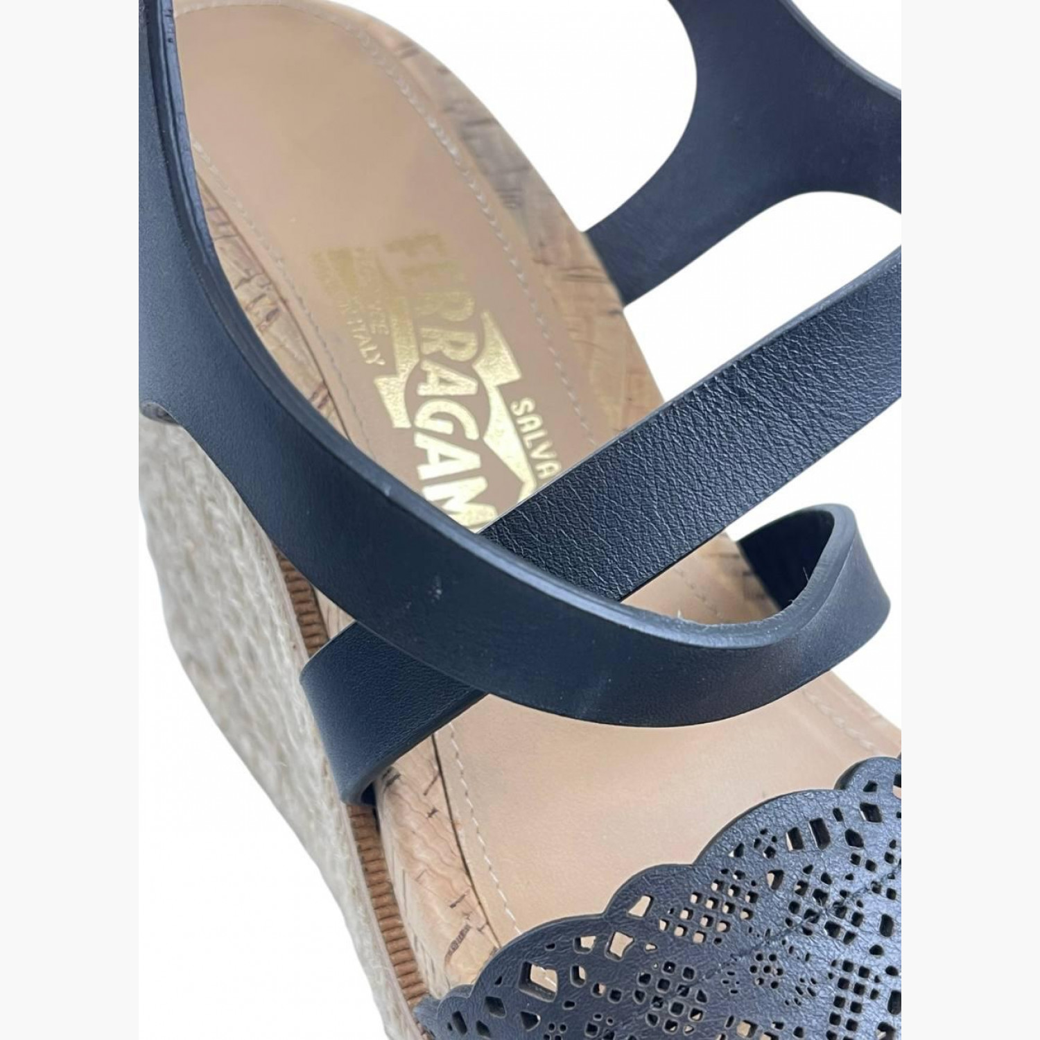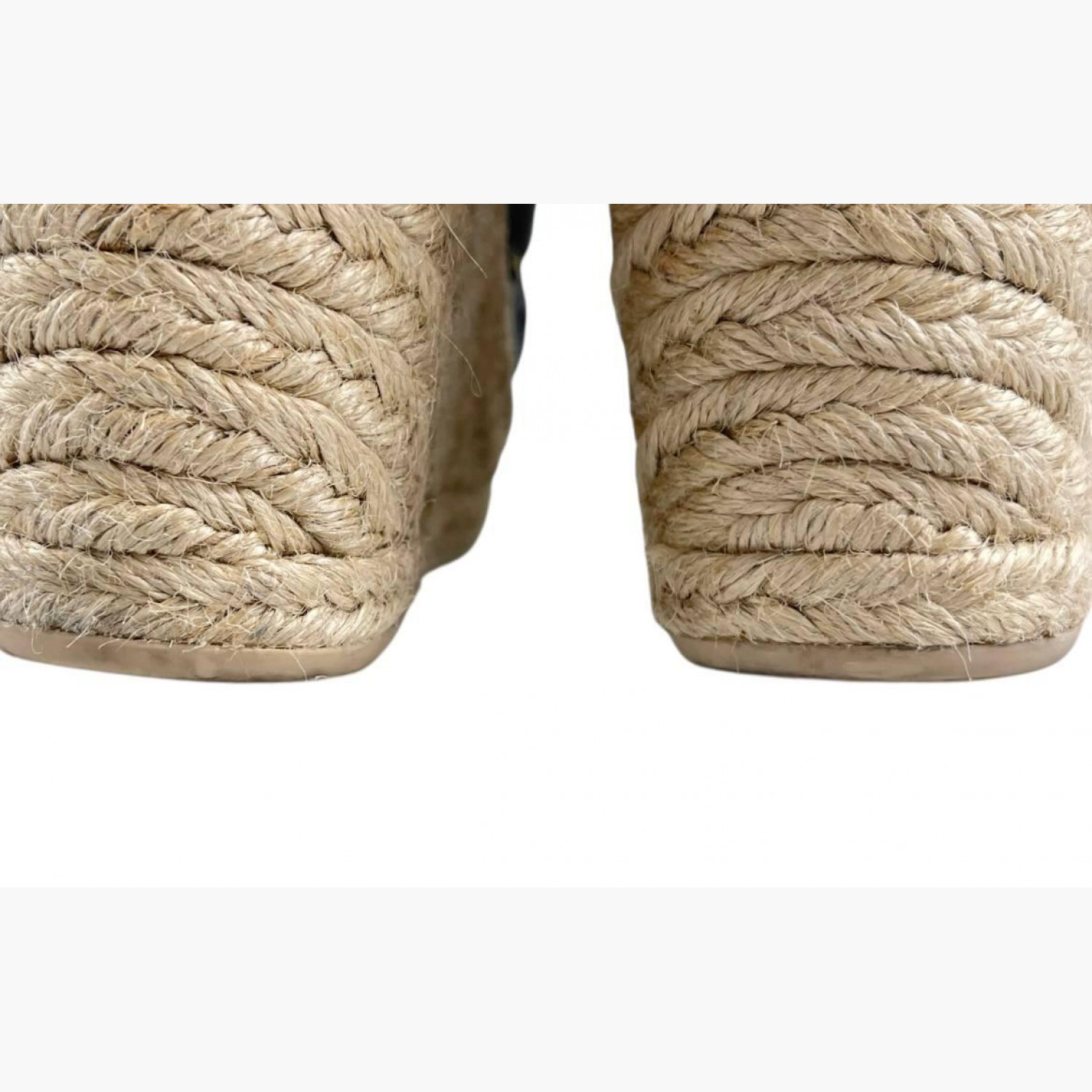 Black leather wedge sandals with braided detailing. In good condition with wear marks.