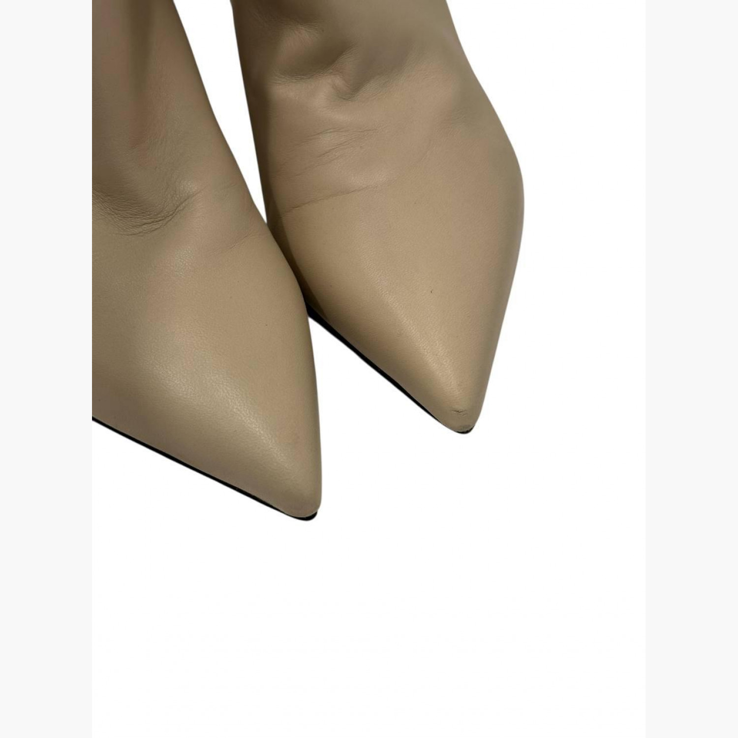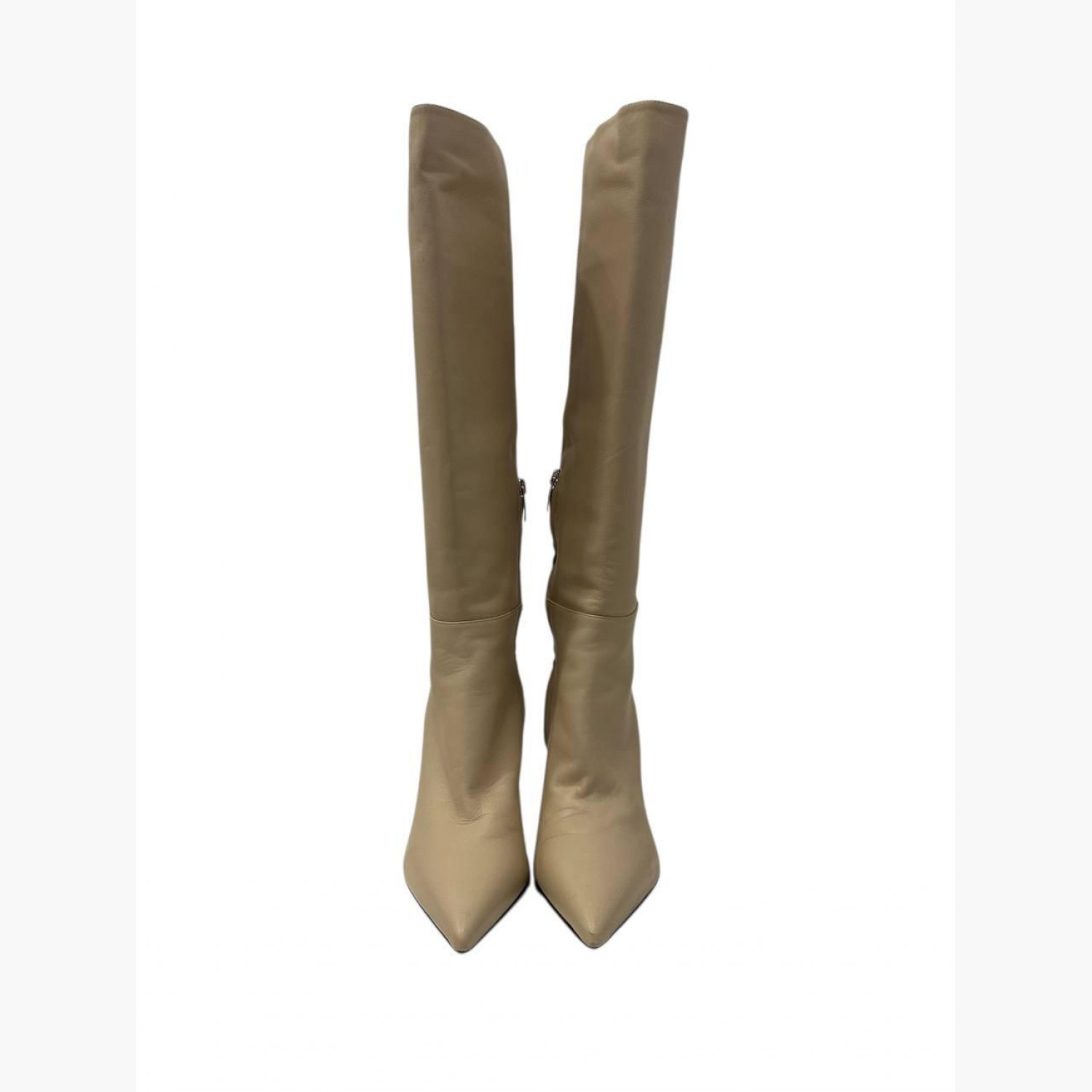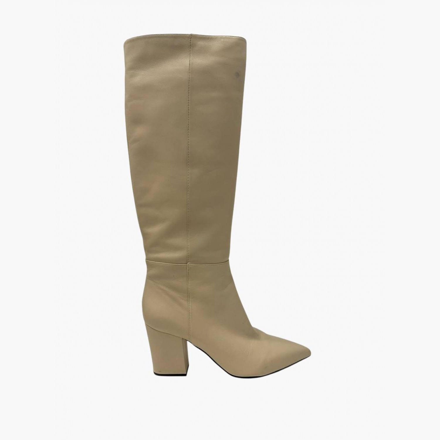 Beige leather heeled boots. In good condition with scuff marks.