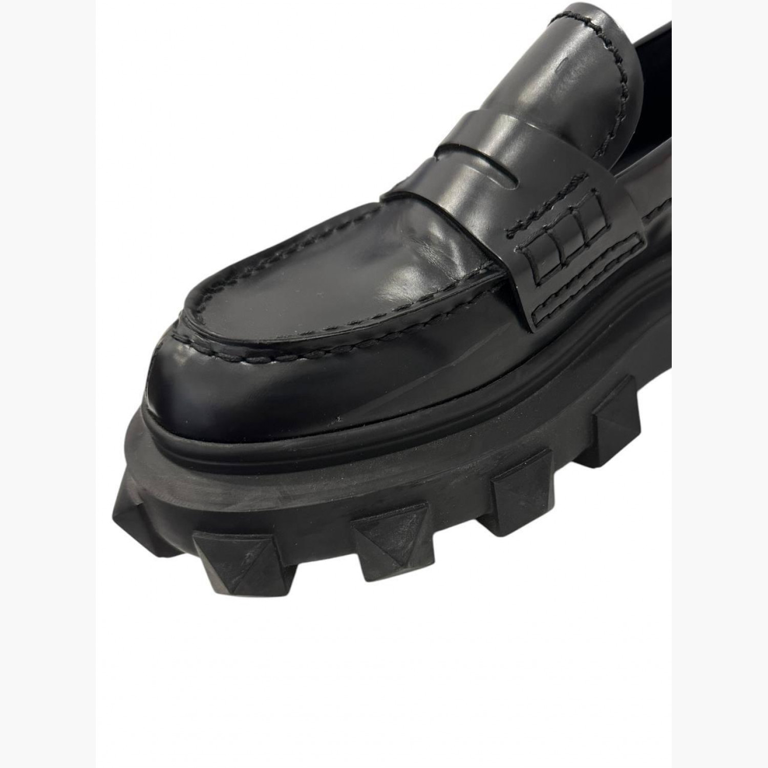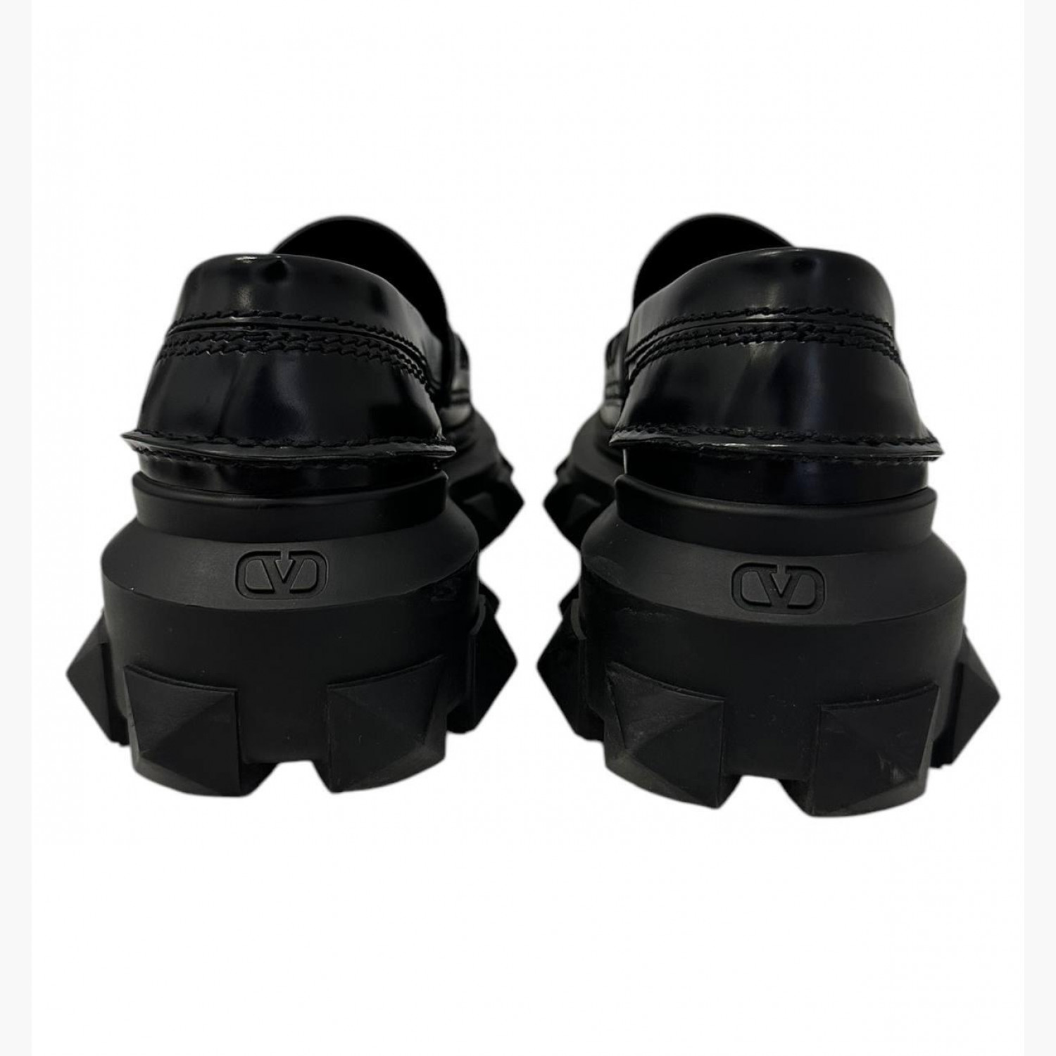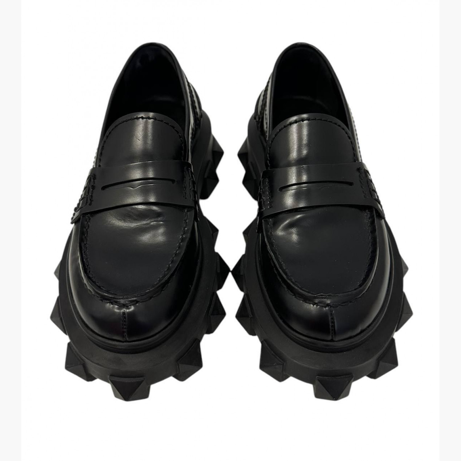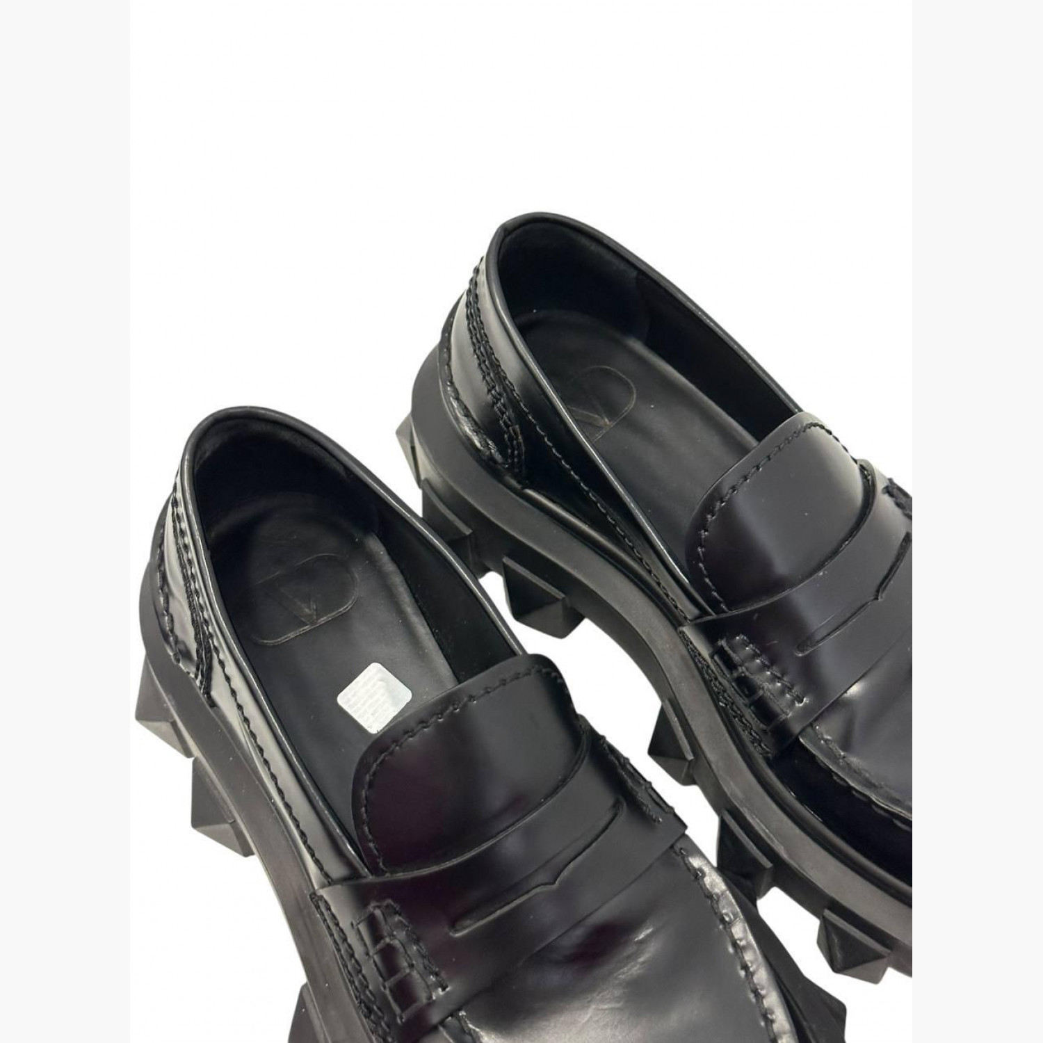 Black leather loafers on a solid sole. In good condition, with scuffs.