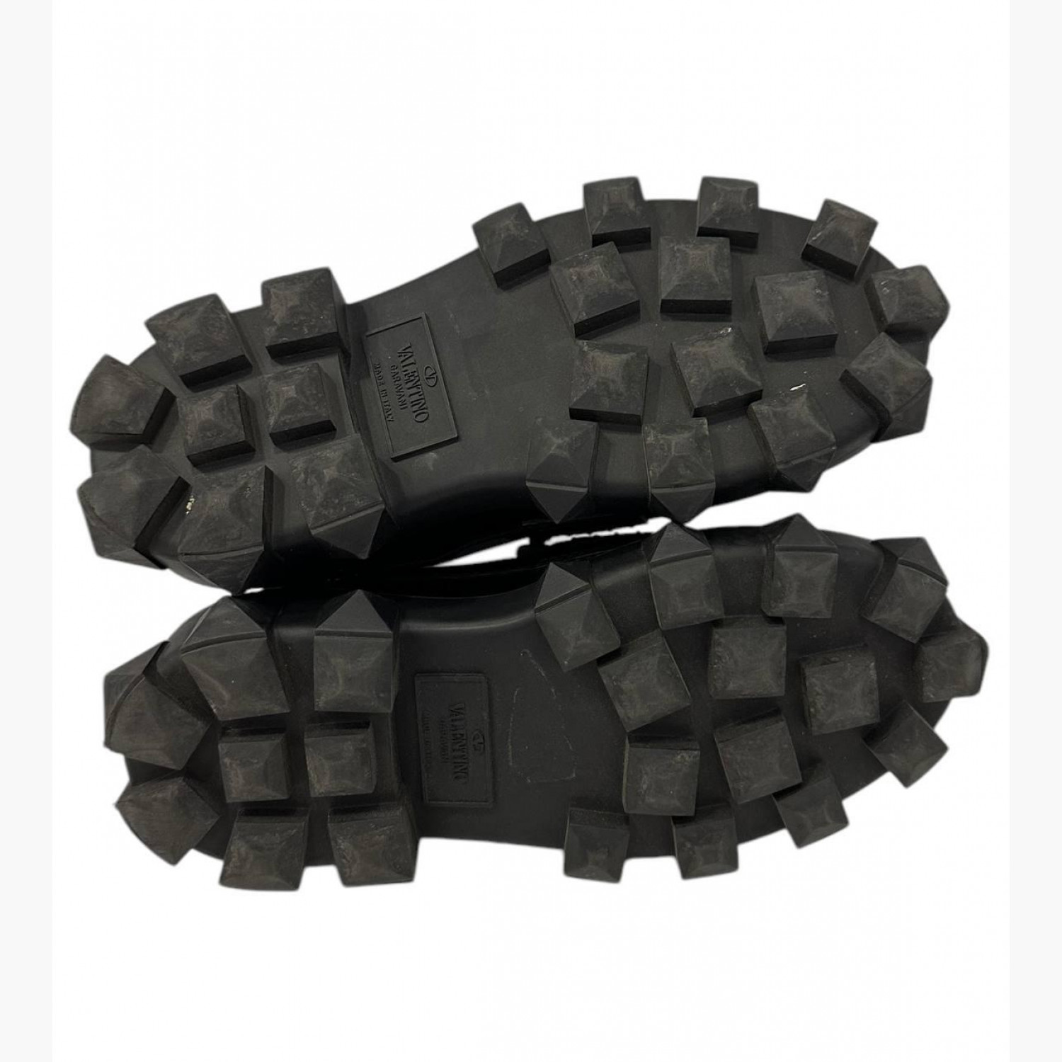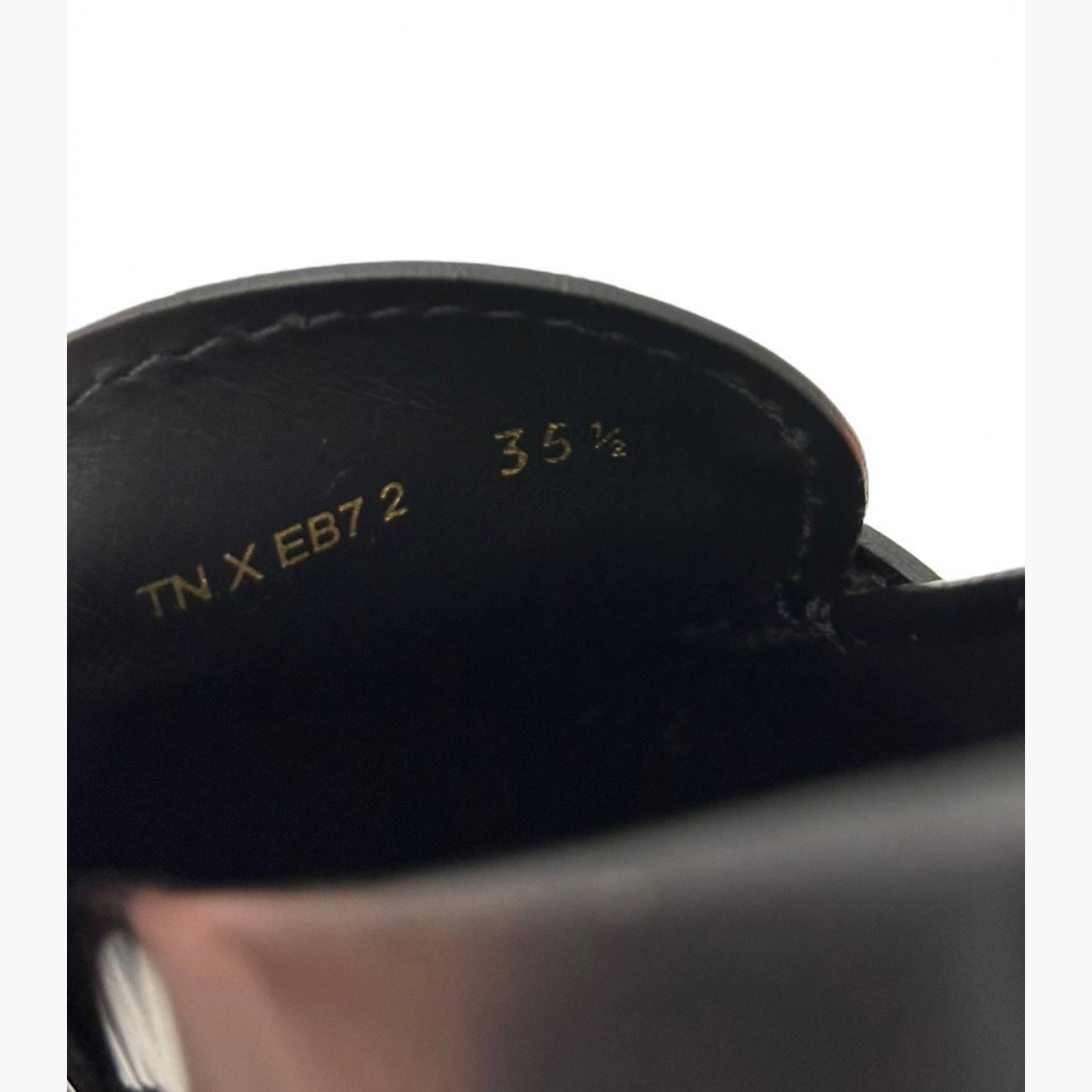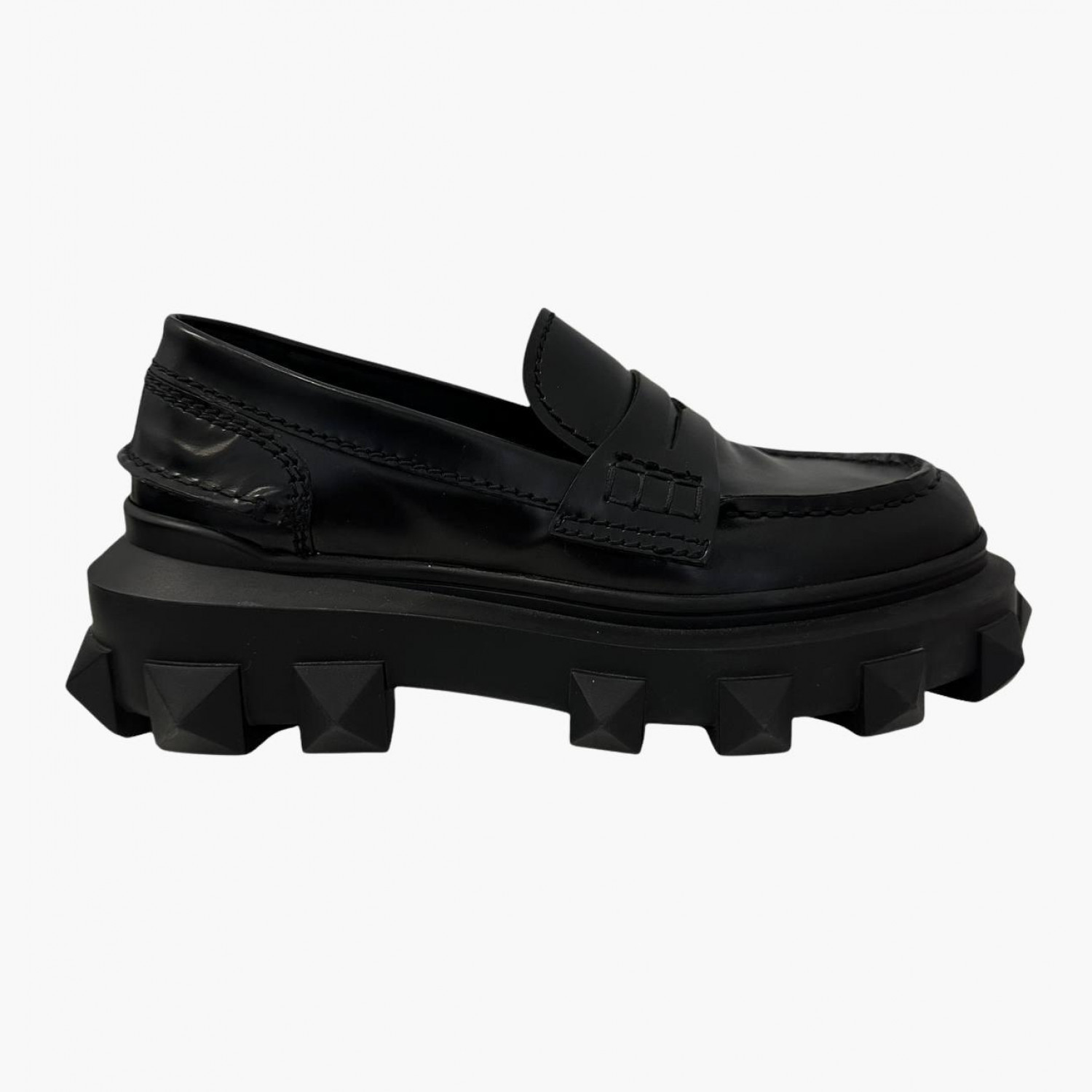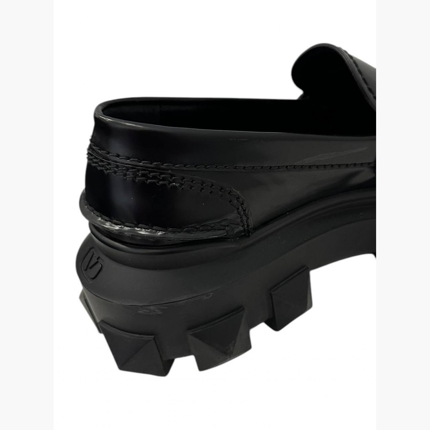 Black leather loafers on a solid sole. In good condition, with scuffs.