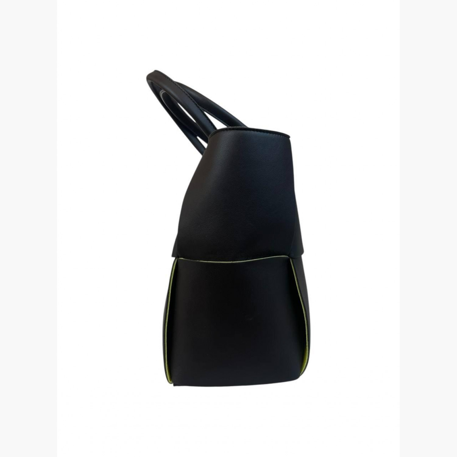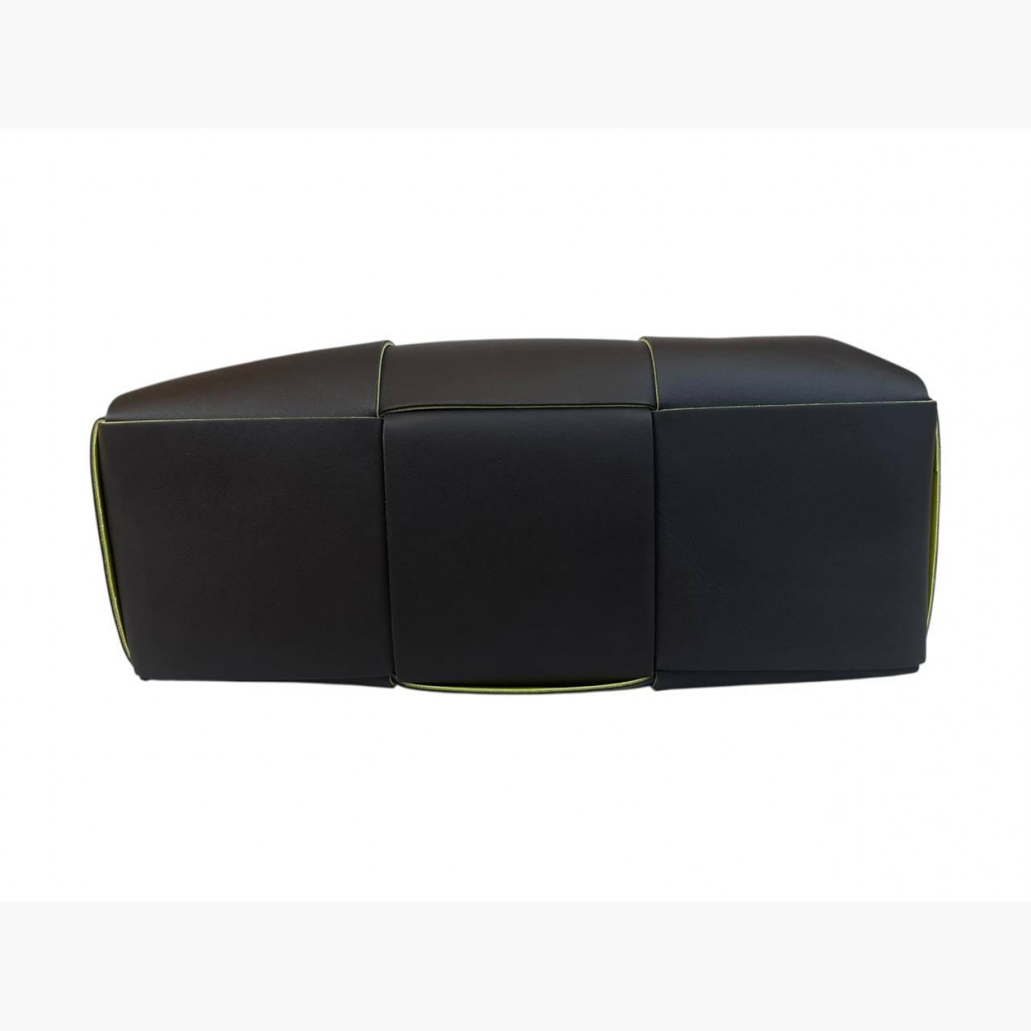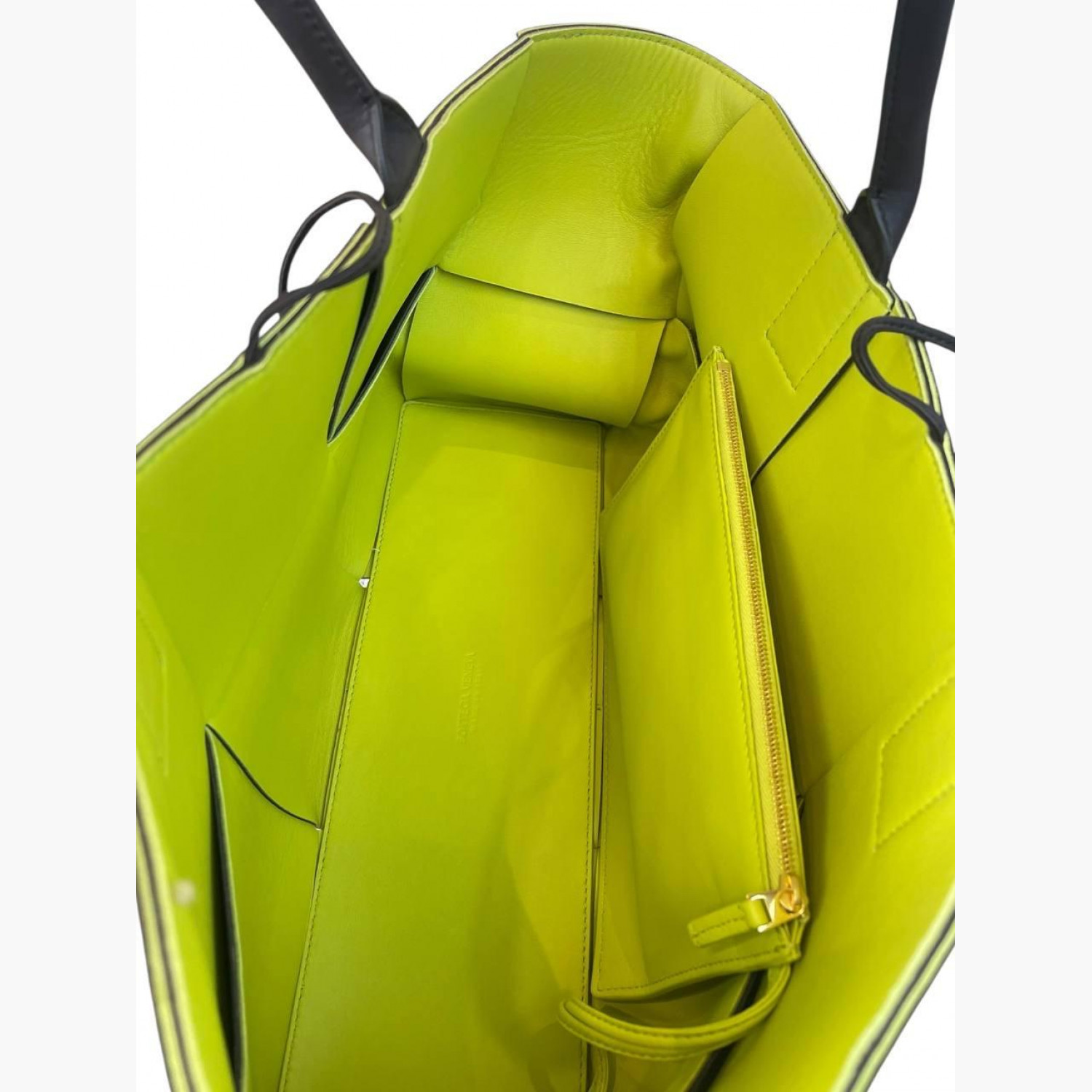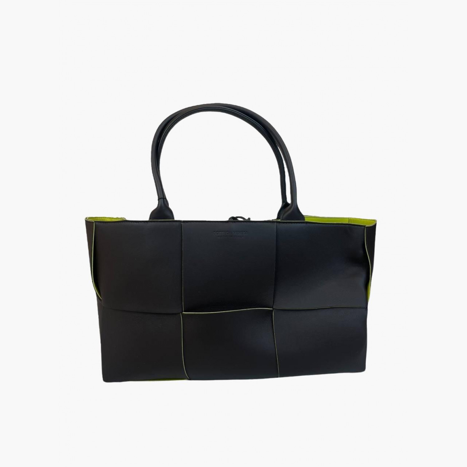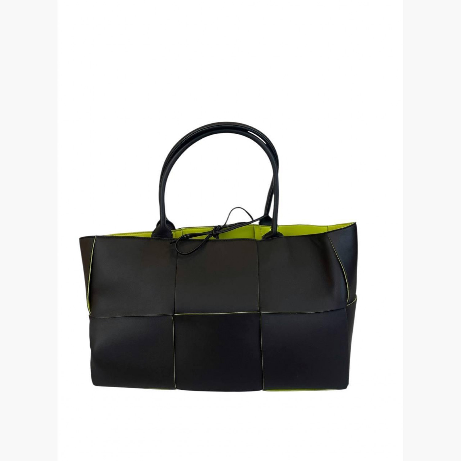 Woven black leather bag with a lime green base. Inside is a detachable zip pouch on a strap. In excellent condition, with no wear marks.
