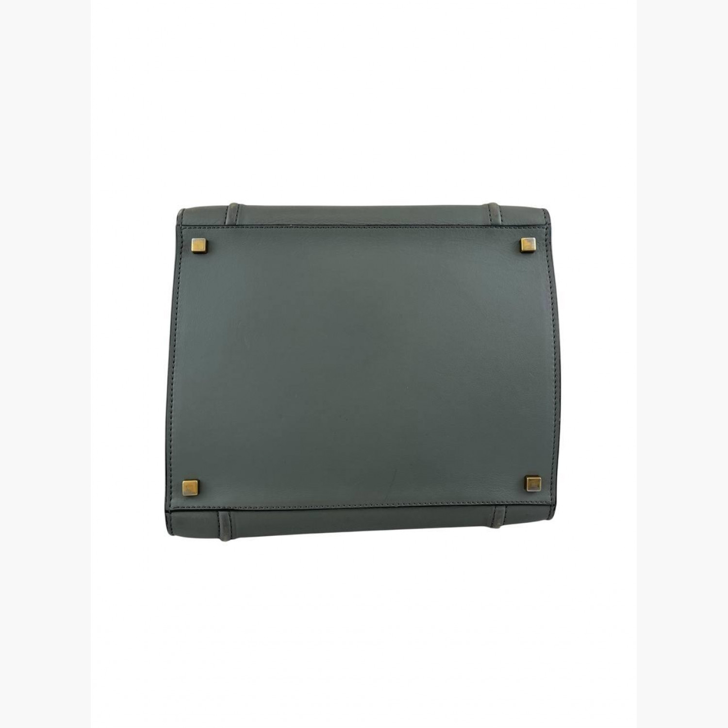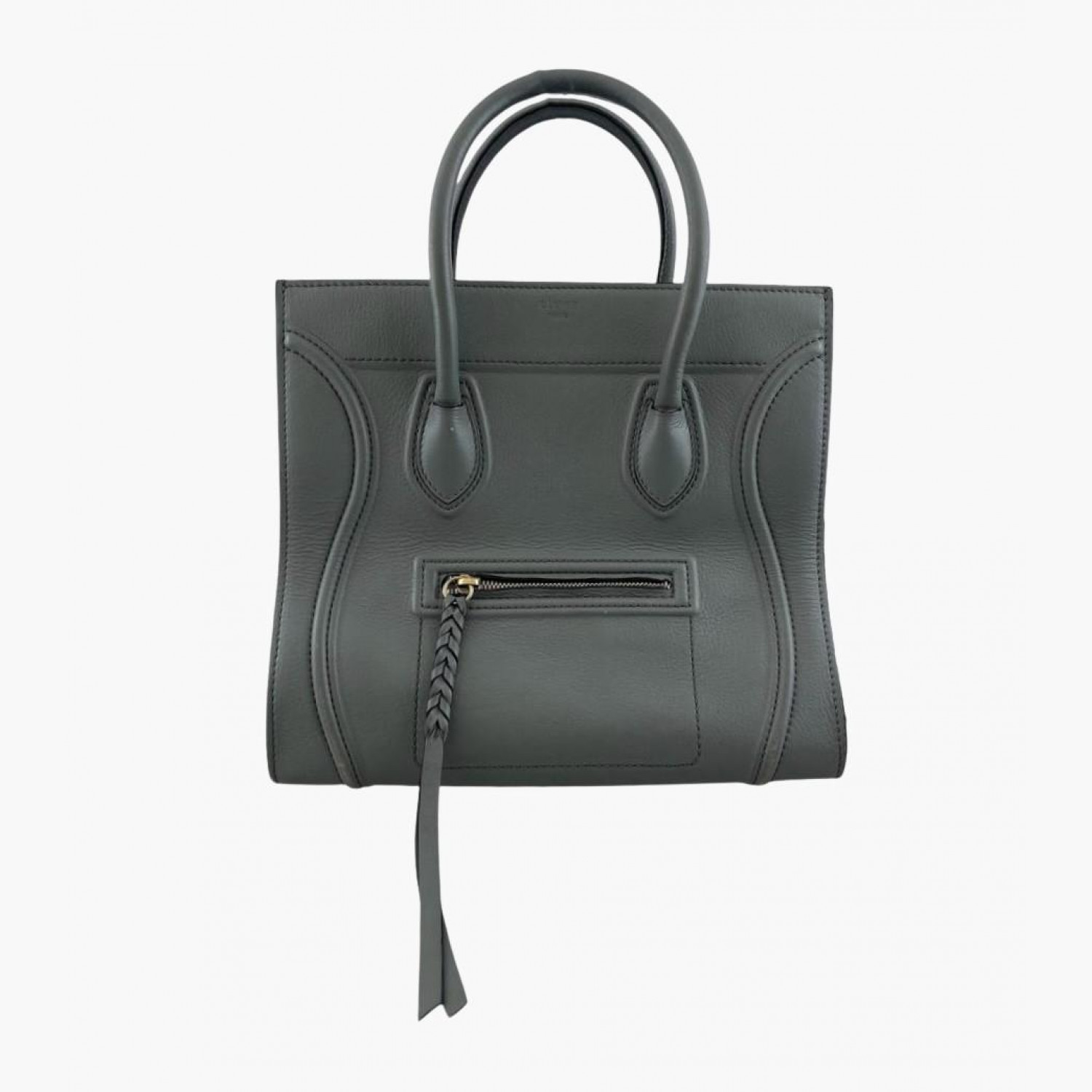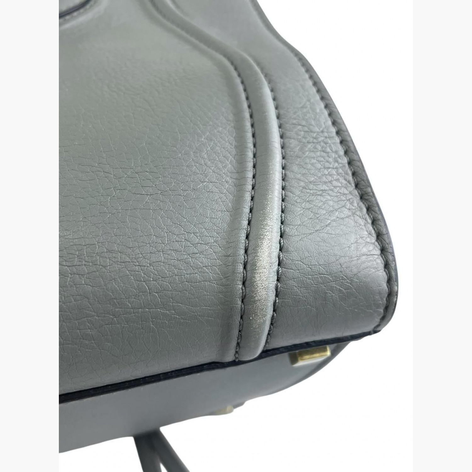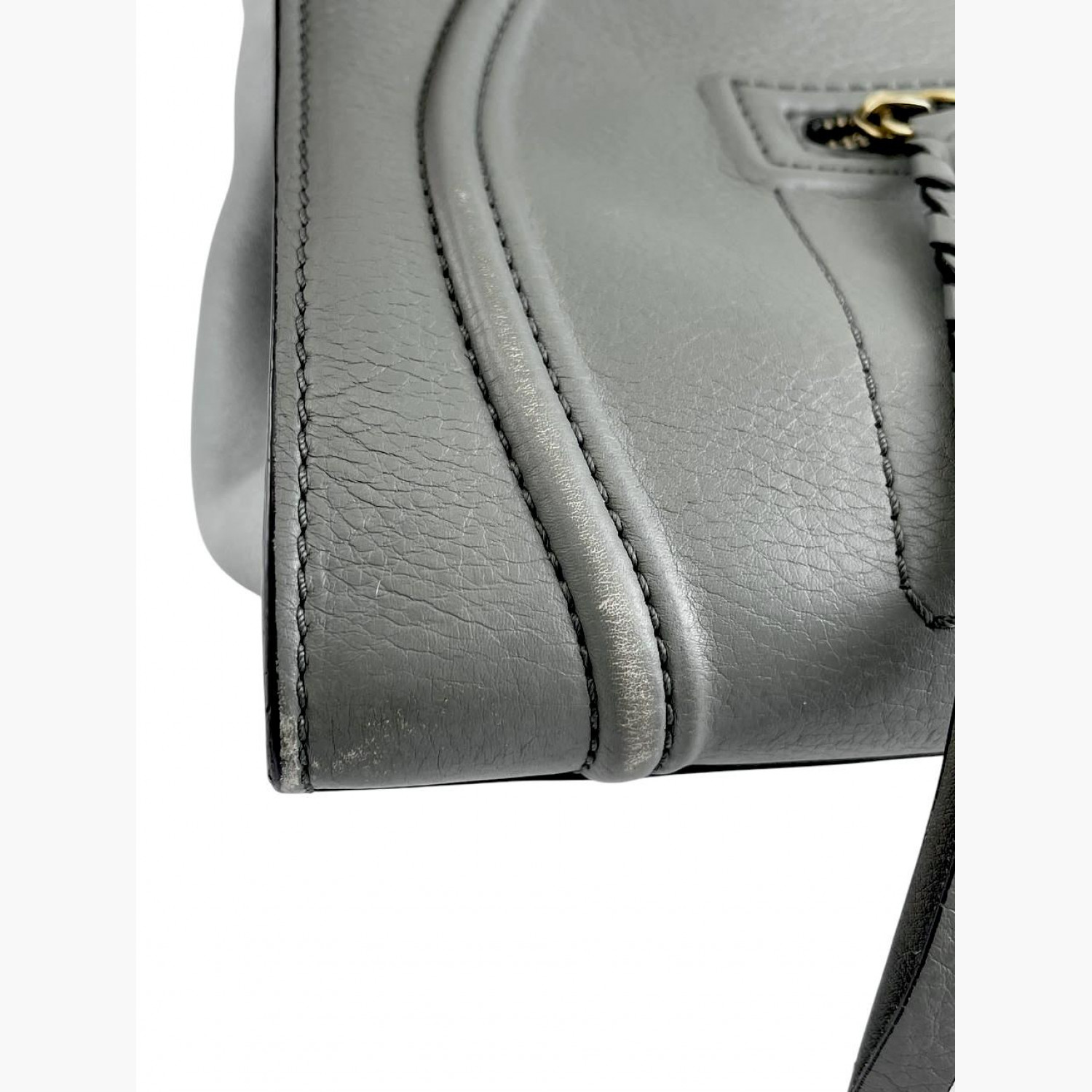Gray leather bag. One main compartment inside with a zip pocket, an external zip pocket on the front. In good condition with wear marks and scuffs.