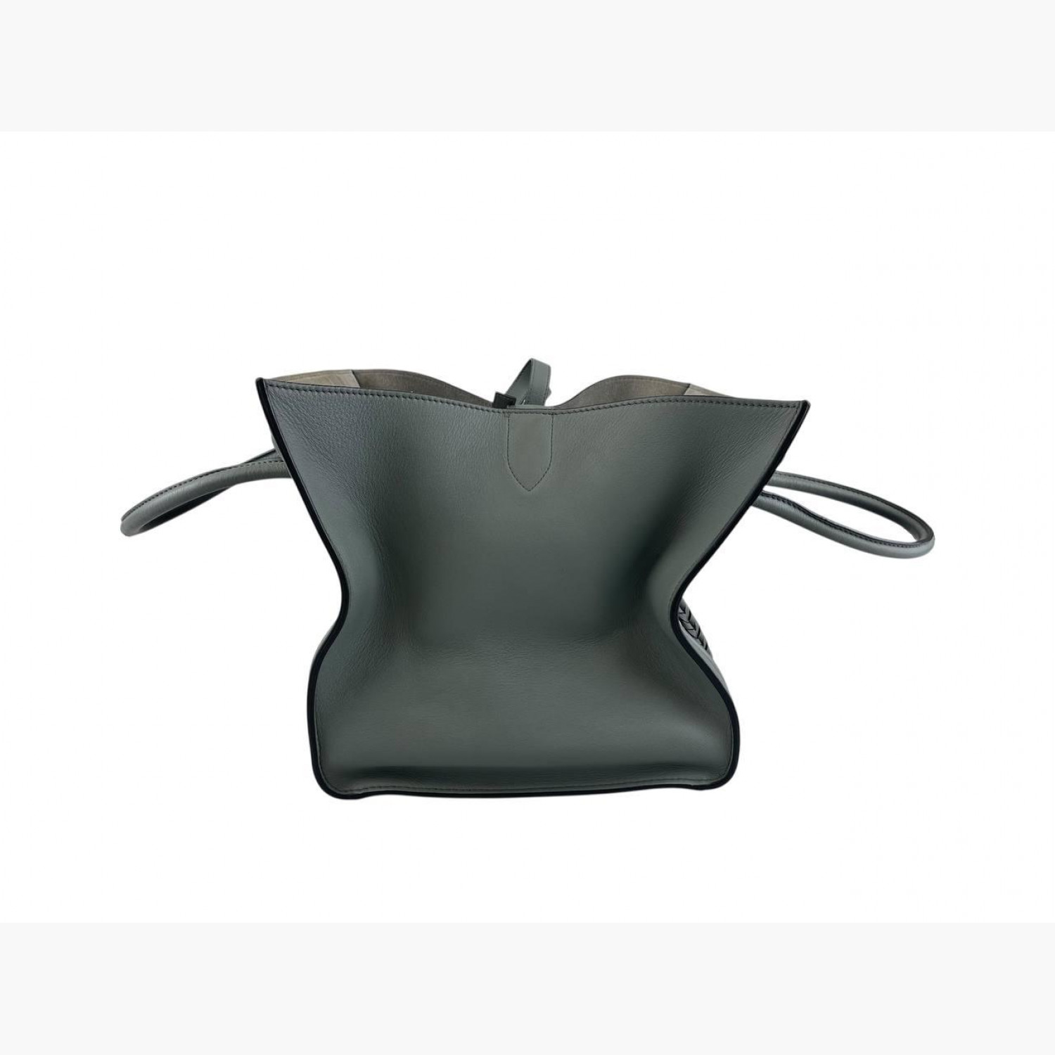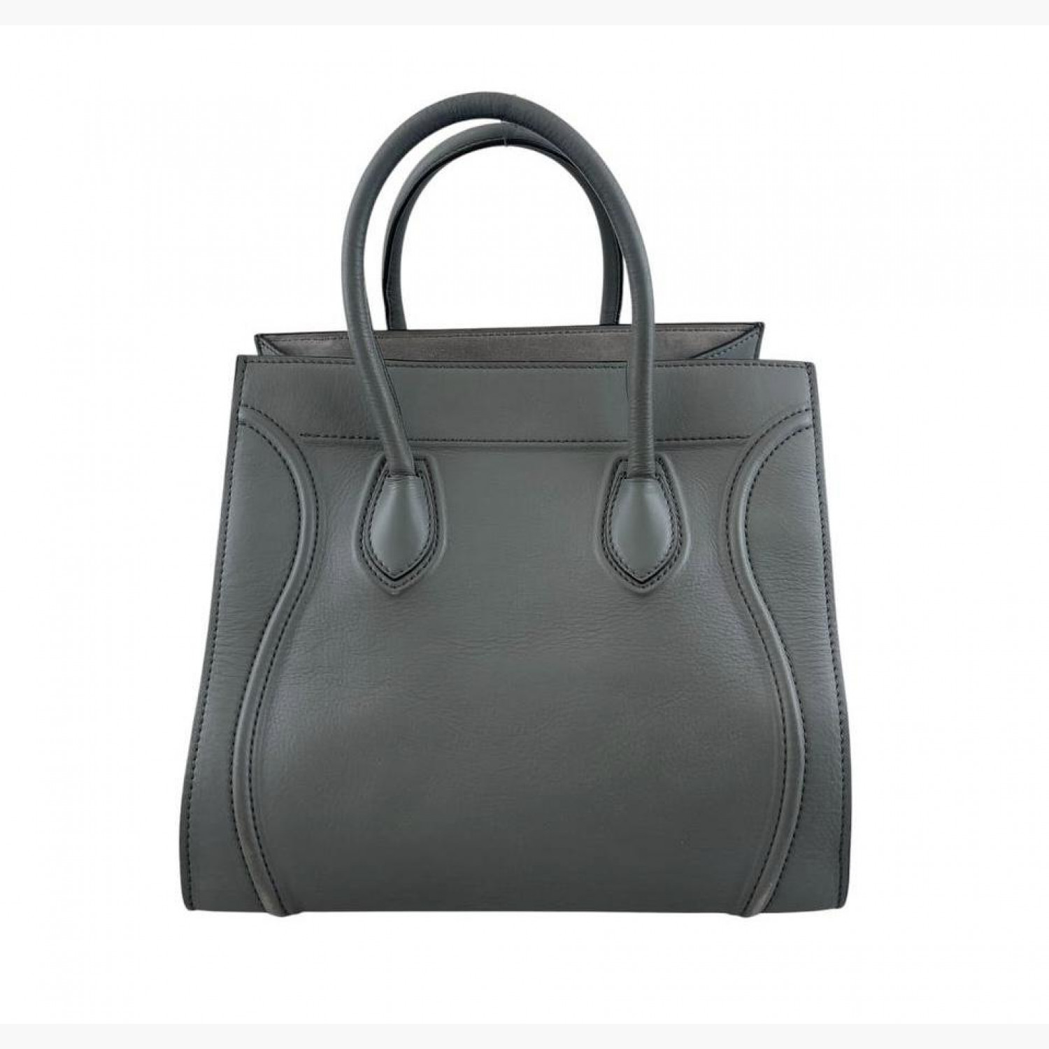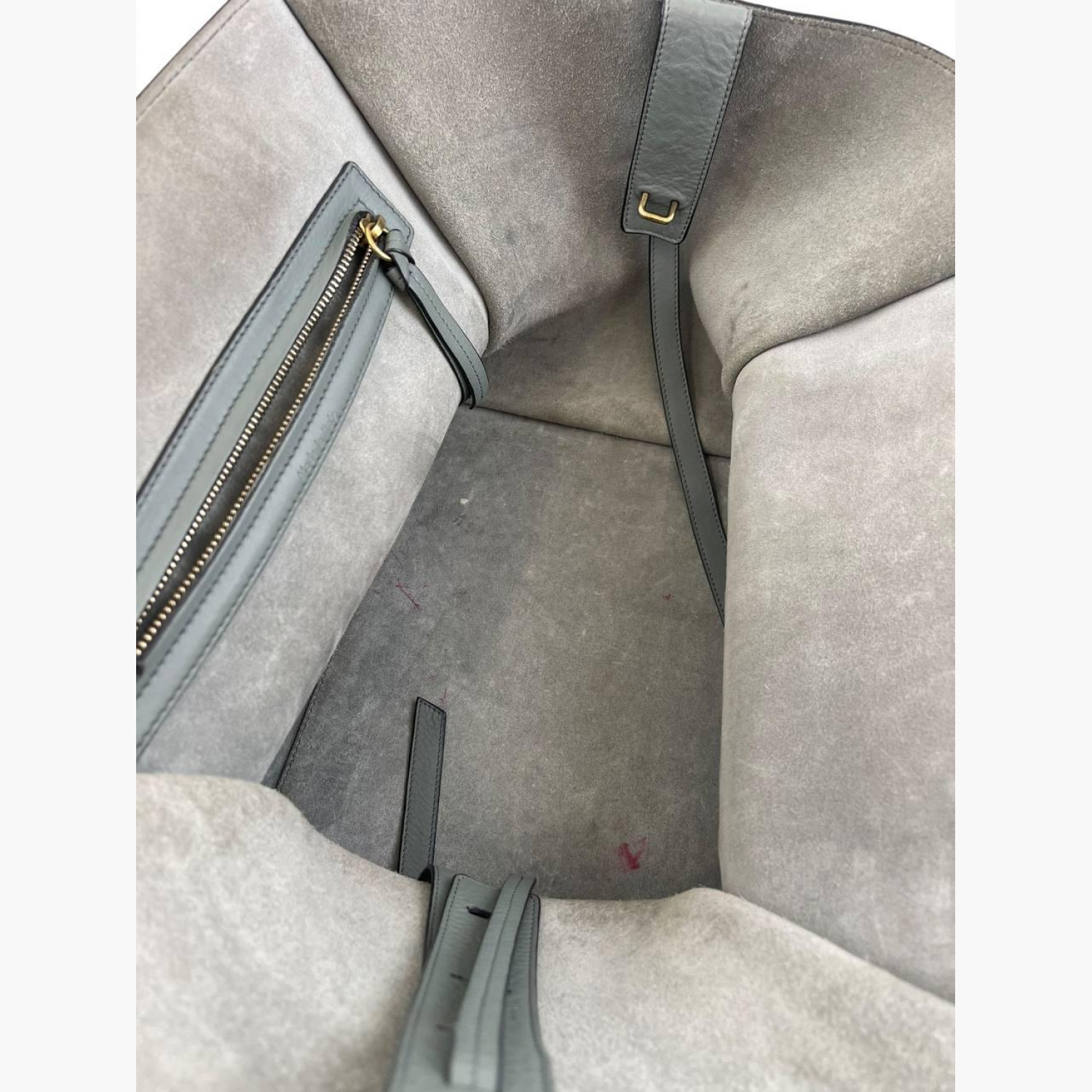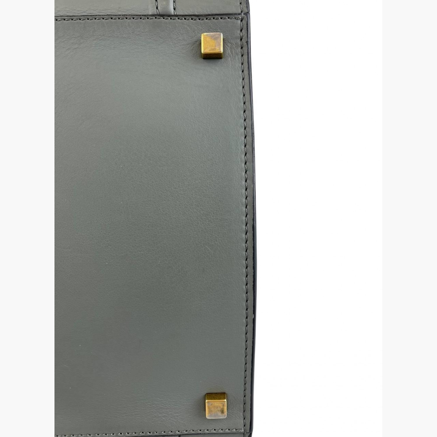 Gray leather bag. One main compartment inside with a zip pocket, an external zip pocket on the front. In good condition with wear marks and scuffs.