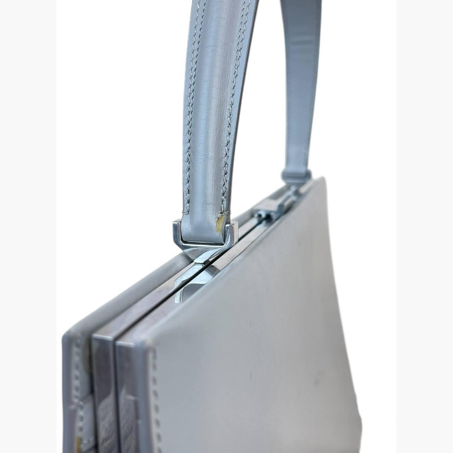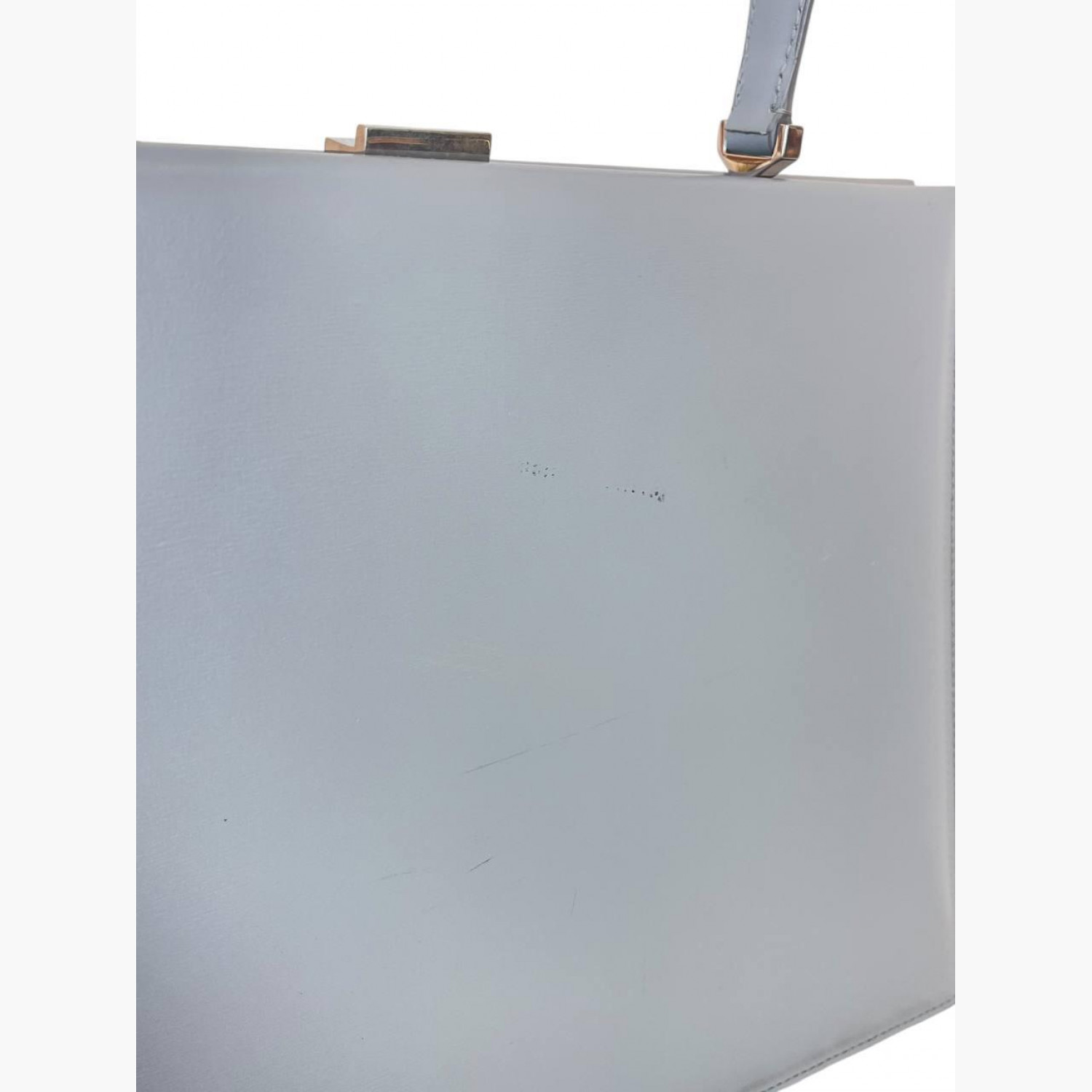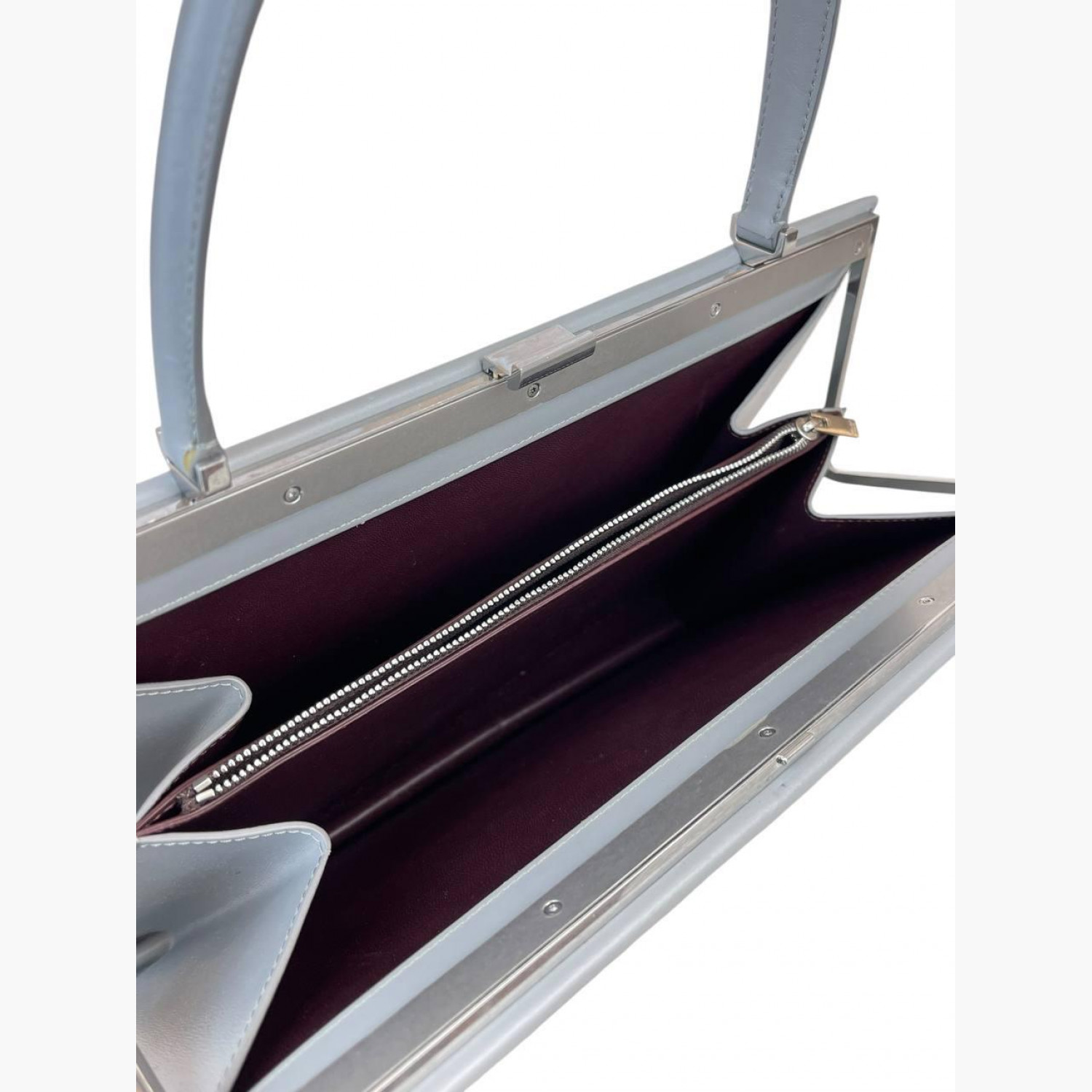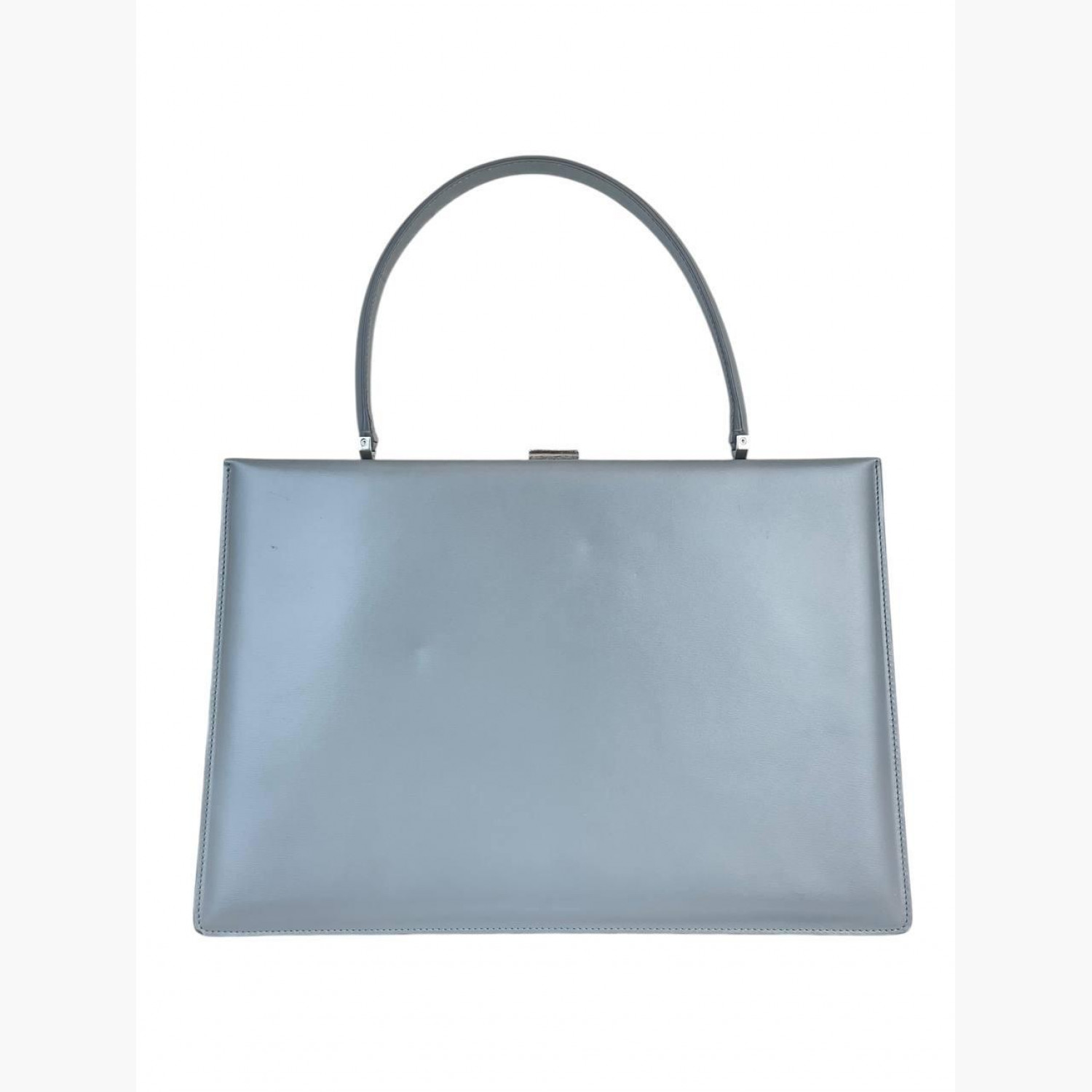 Light grey leather bag. Inside are two main compartments with a zip pocket between them. In good condition, with stains.