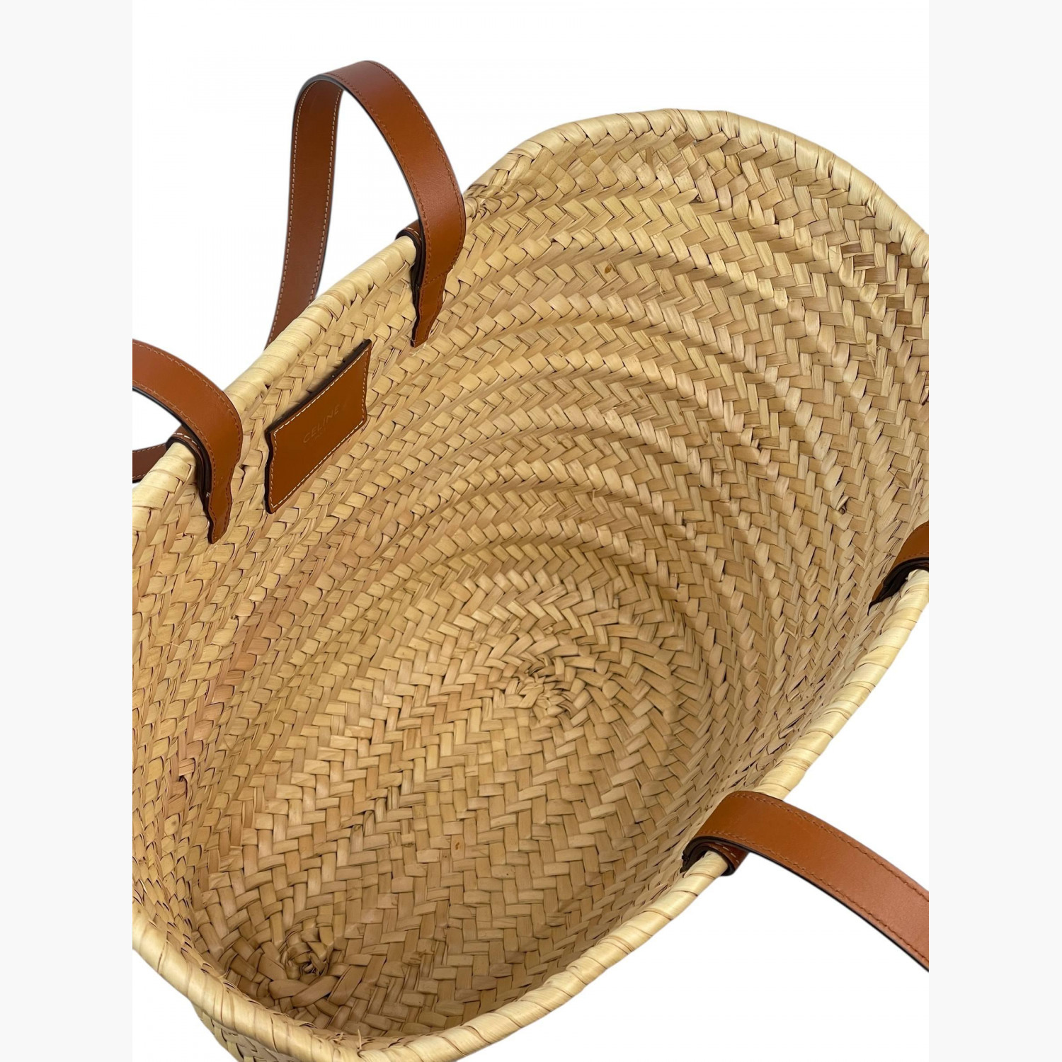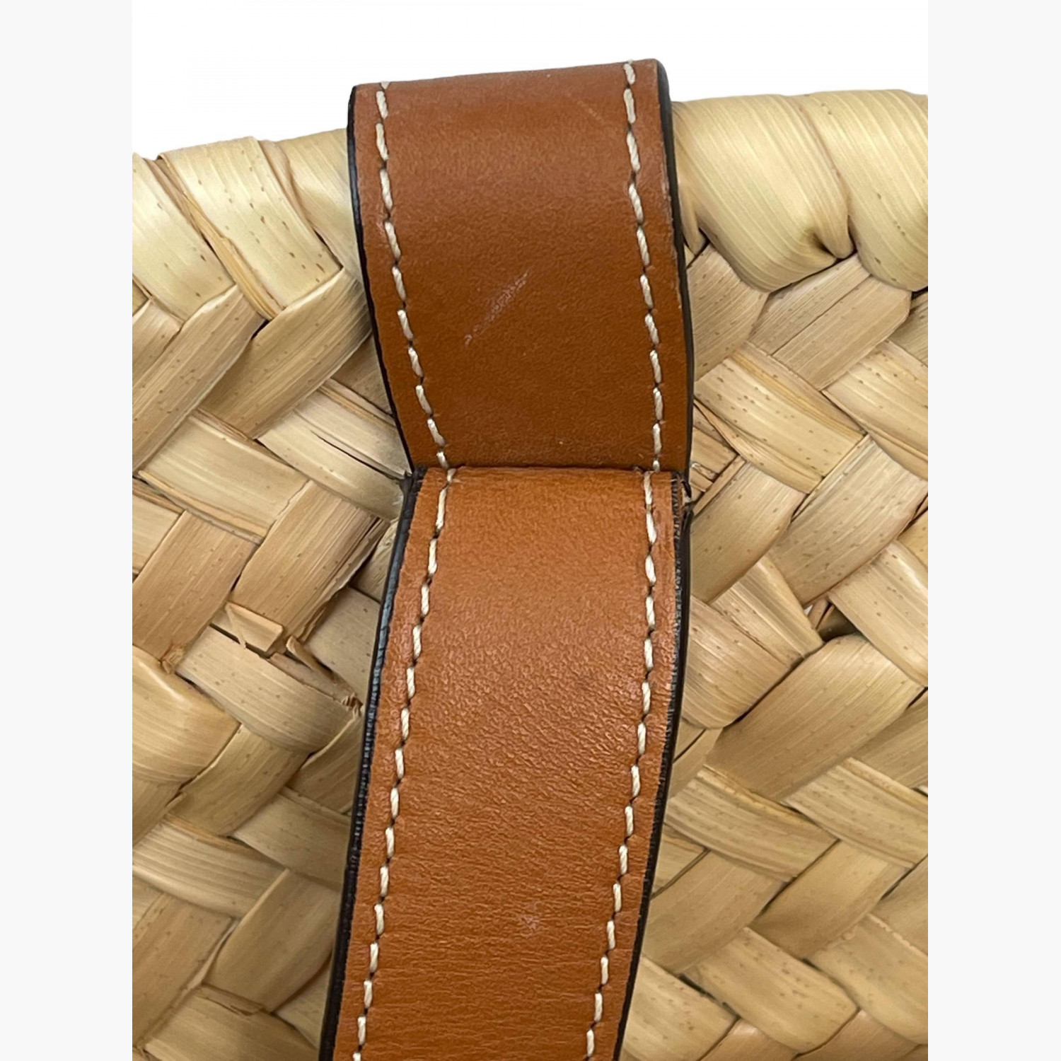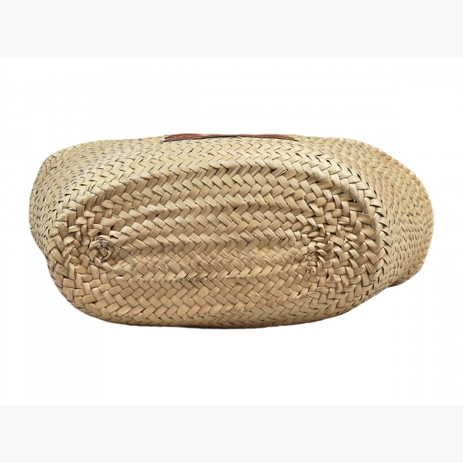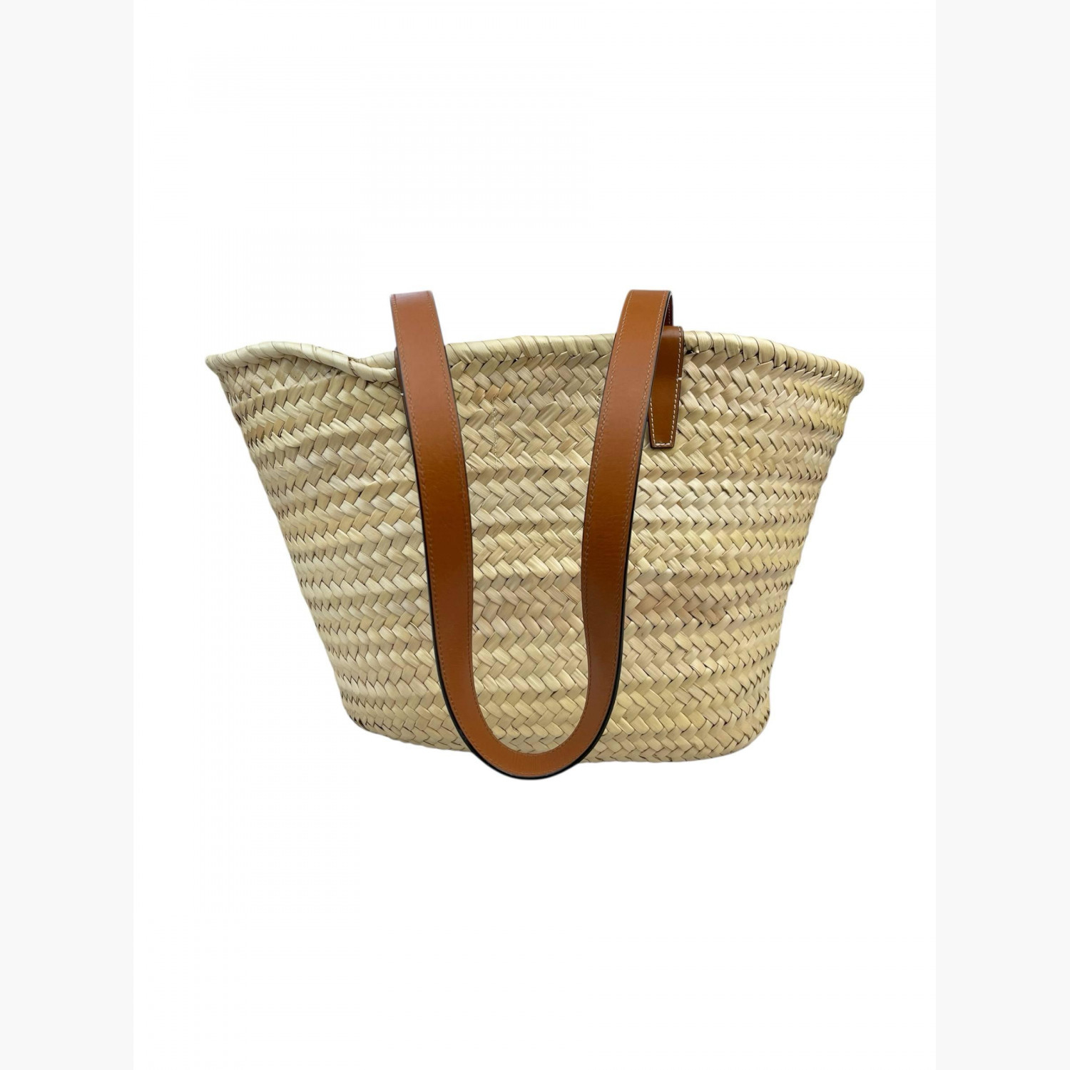 Woven bag made of palm leaves with brown leather handles. Inside — one main compartment without pockets. In good condition with wear marks.