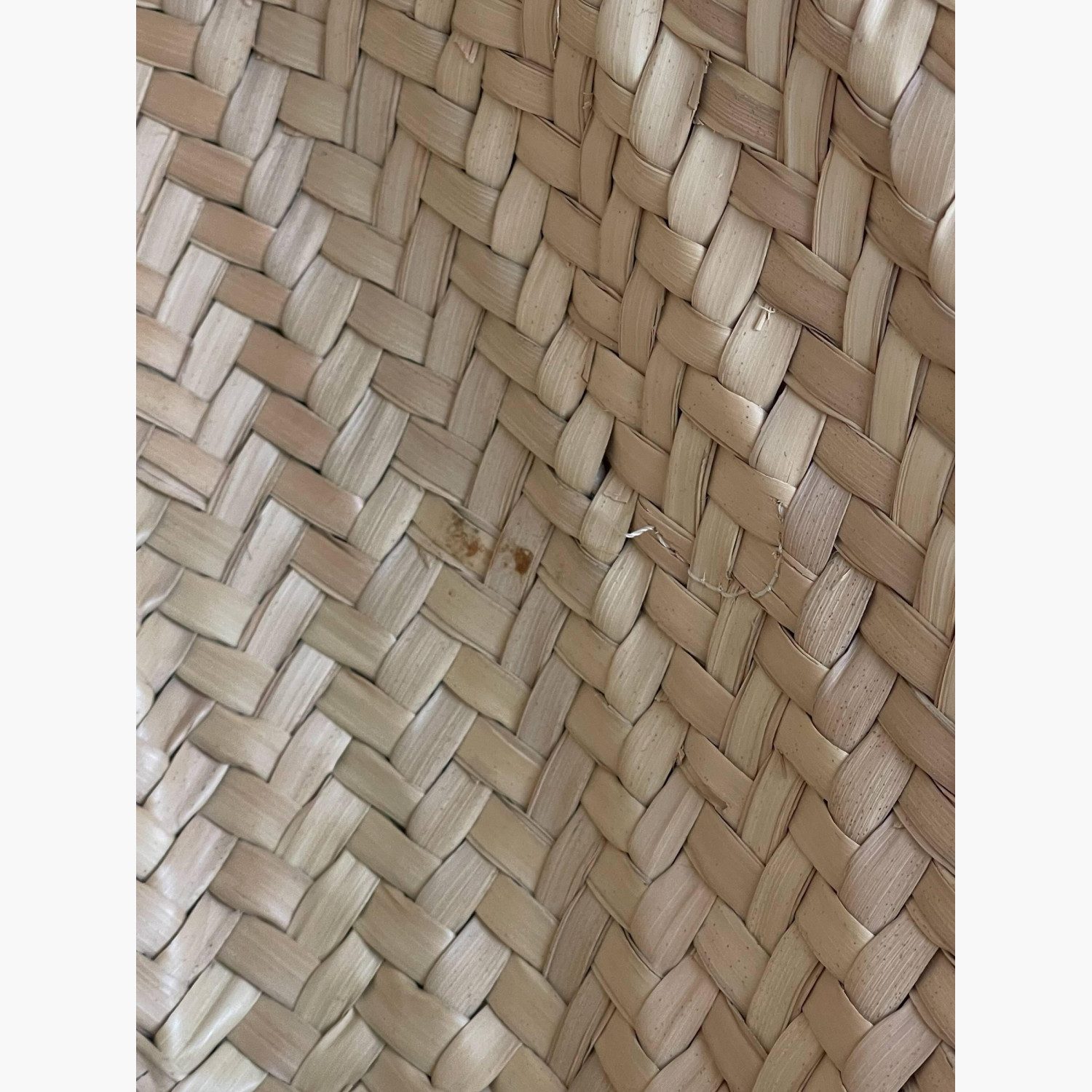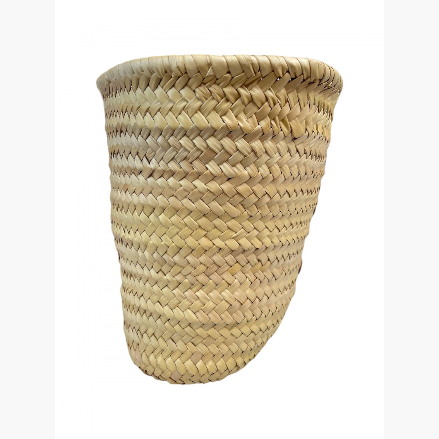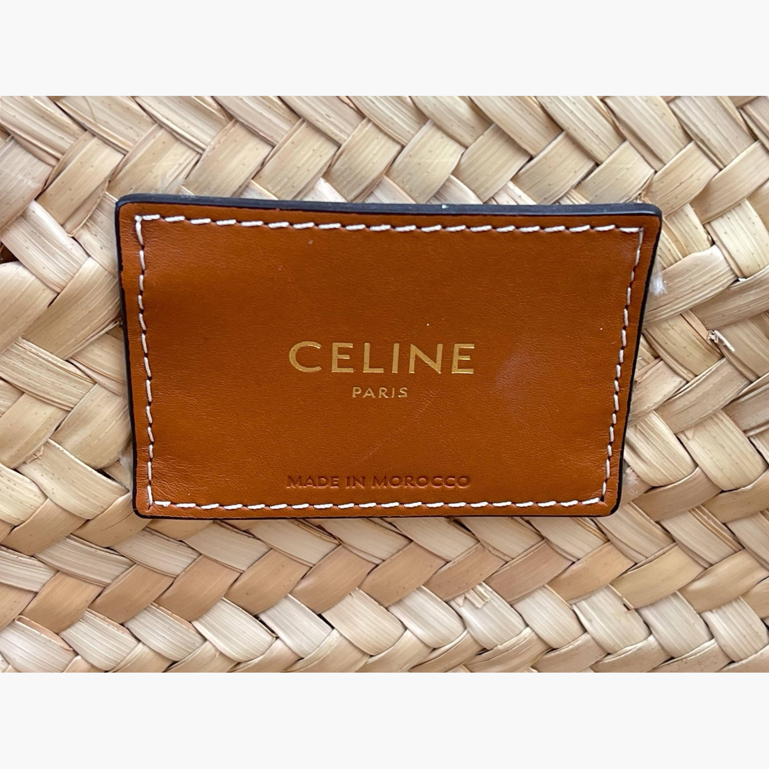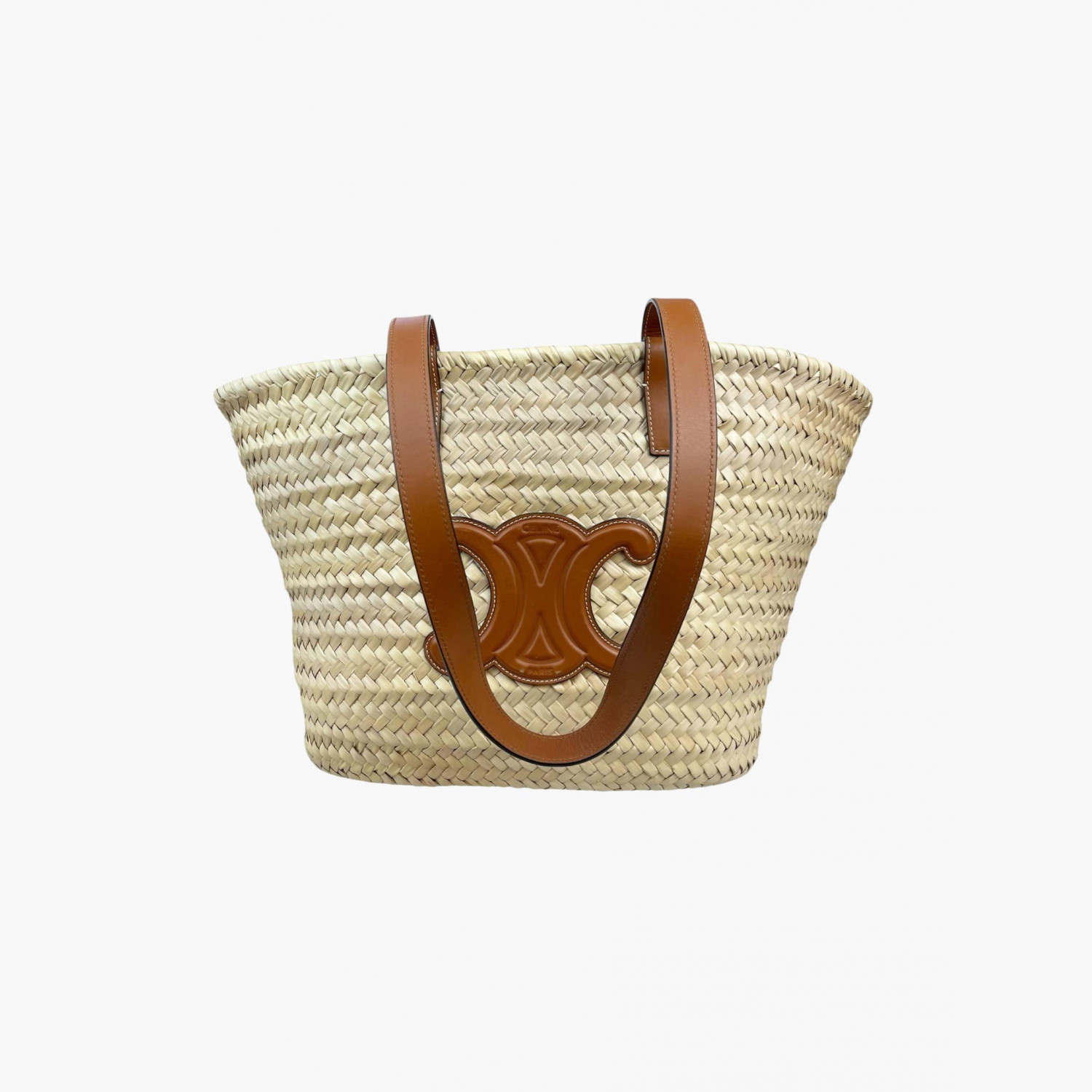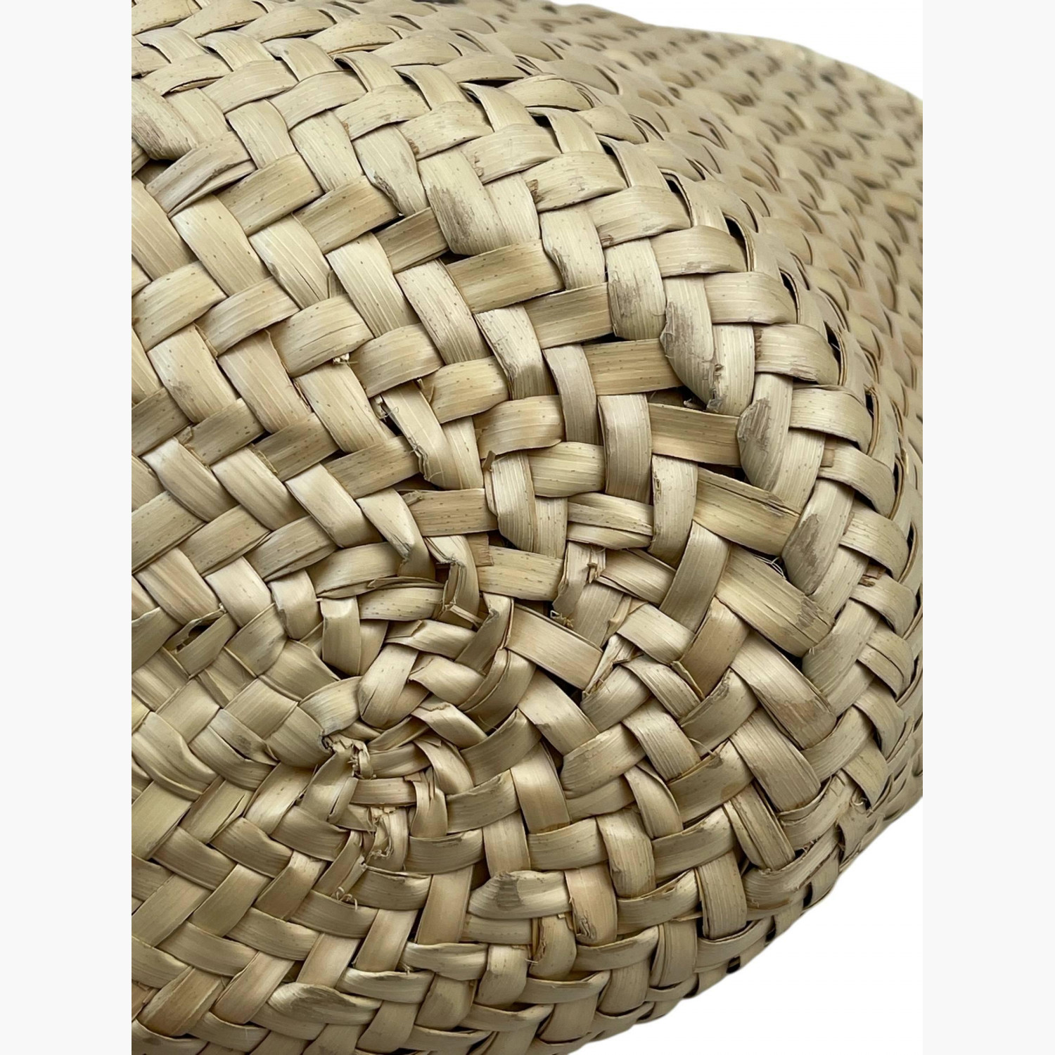 Woven bag made of palm leaves with brown leather handles. Inside — one main compartment without pockets. In good condition with wear marks.