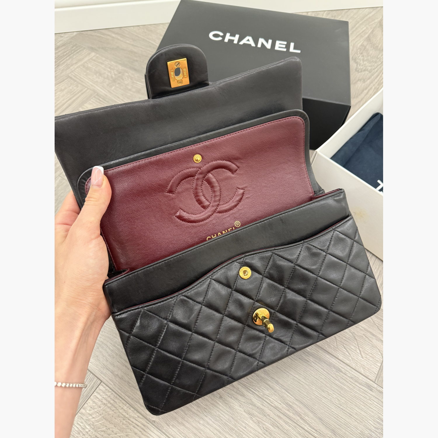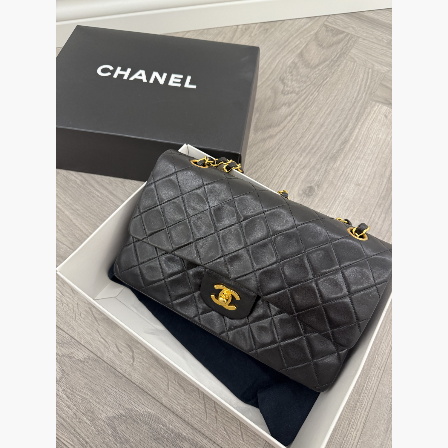 Vintage Chanel Medium Flap with 24k gold-plated hardware. Comes with box, dust bag, authenticity card, and sticker. In perfect condition.