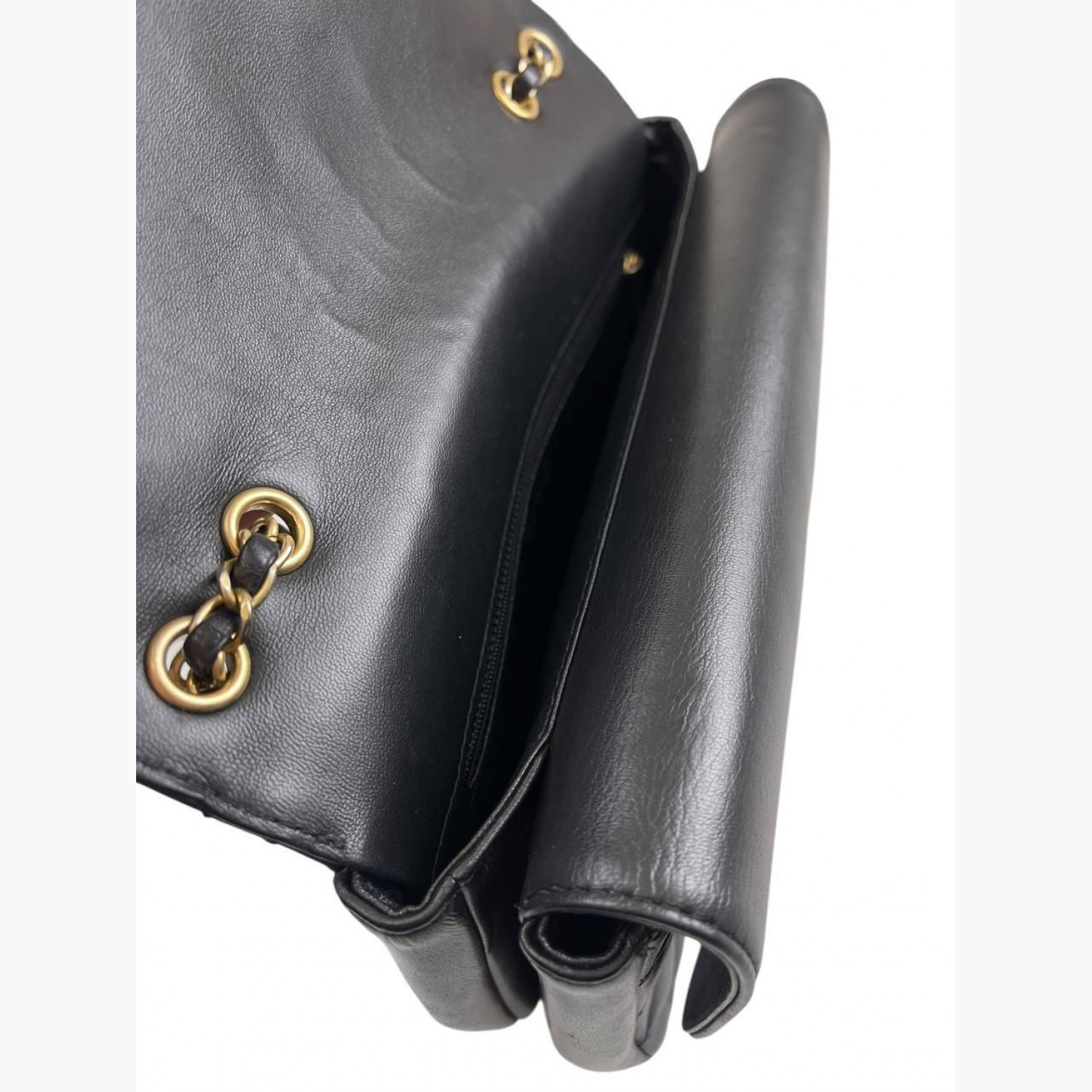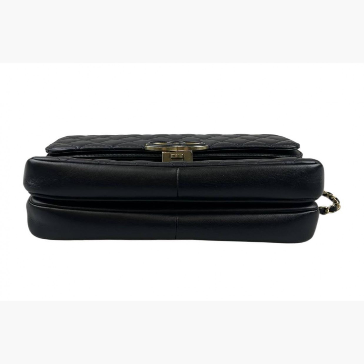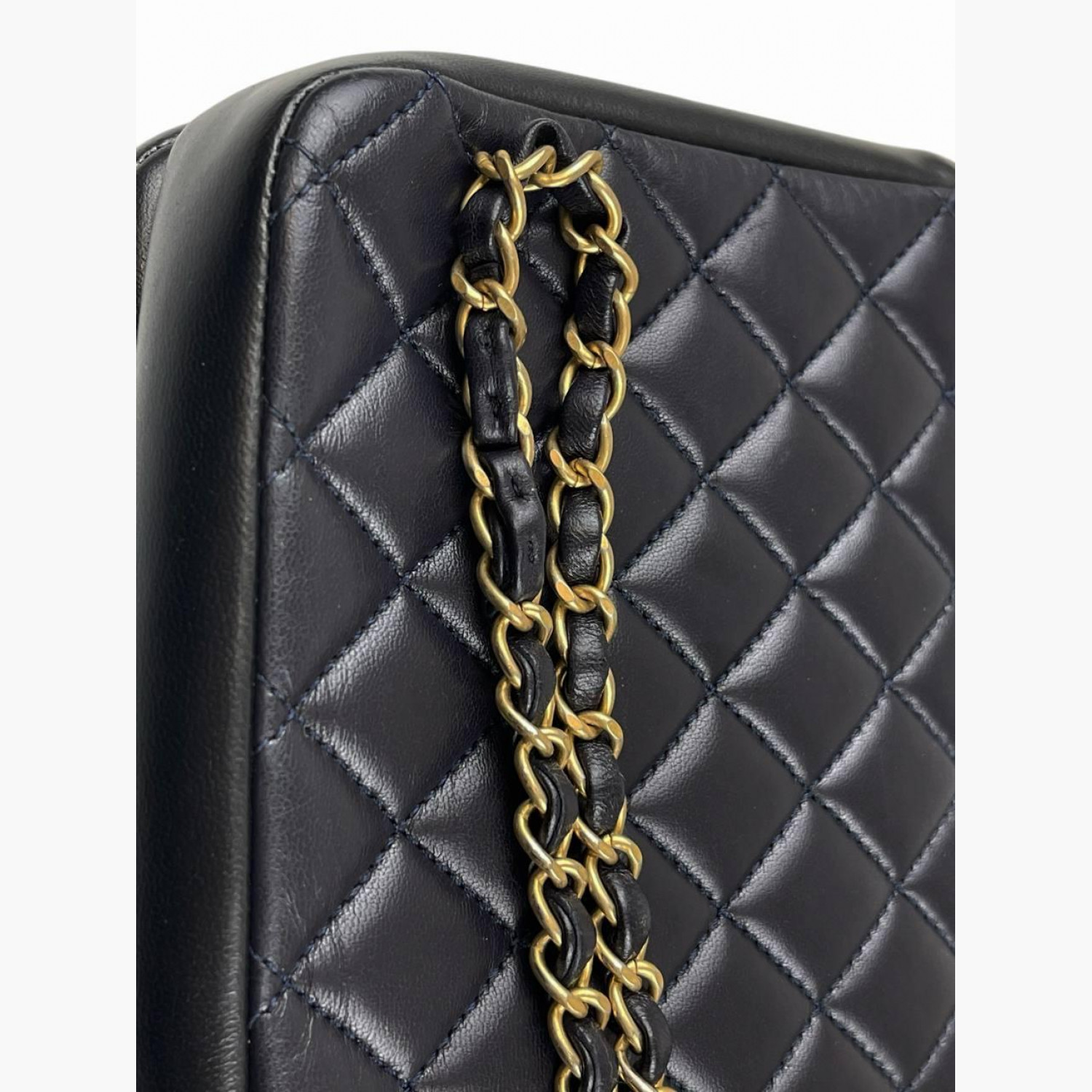 Dark blue quilted leather bag. Two main compartments inside: the first has an open pocket, and the second has a zip pocket. In excellent condition with minor wear marks on the hardware.