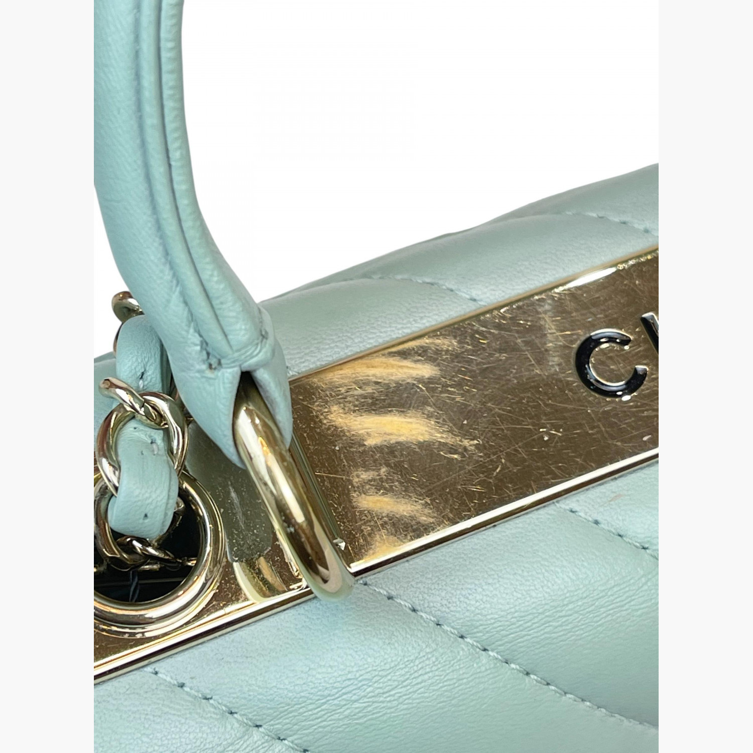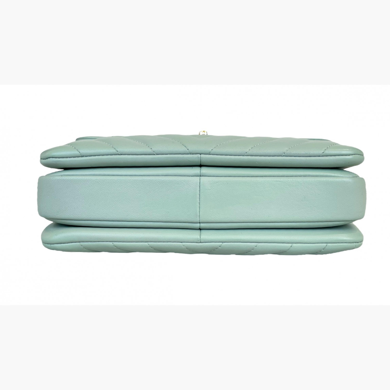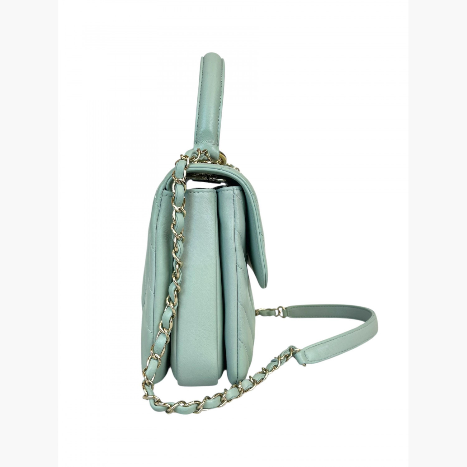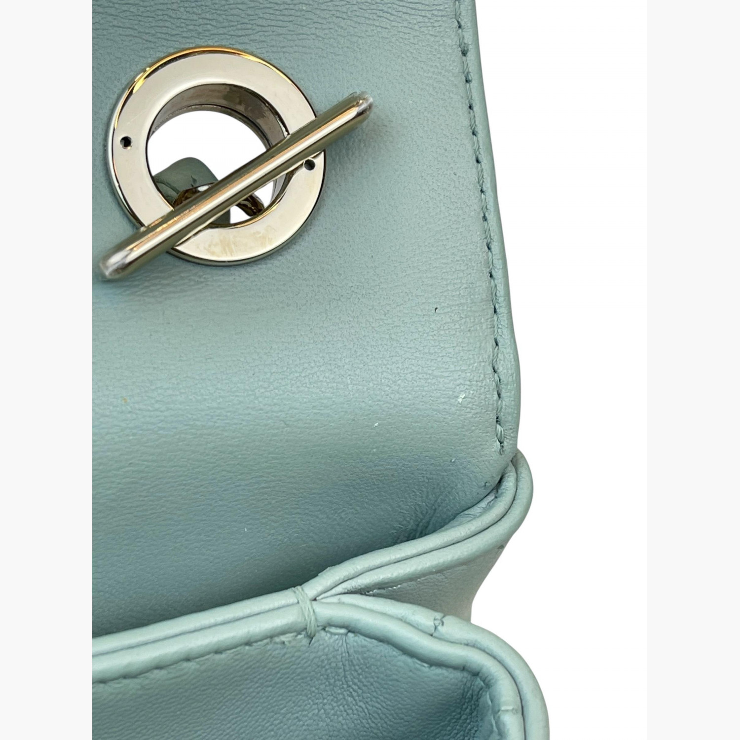 Turquoise quilted leather bag. Inside are three main compartments: the first has a double open pocket, the second has no pockets, and the third has a zip pocket. There are also open pockets on the front and back of the bag. In very good condition, with wear marks.