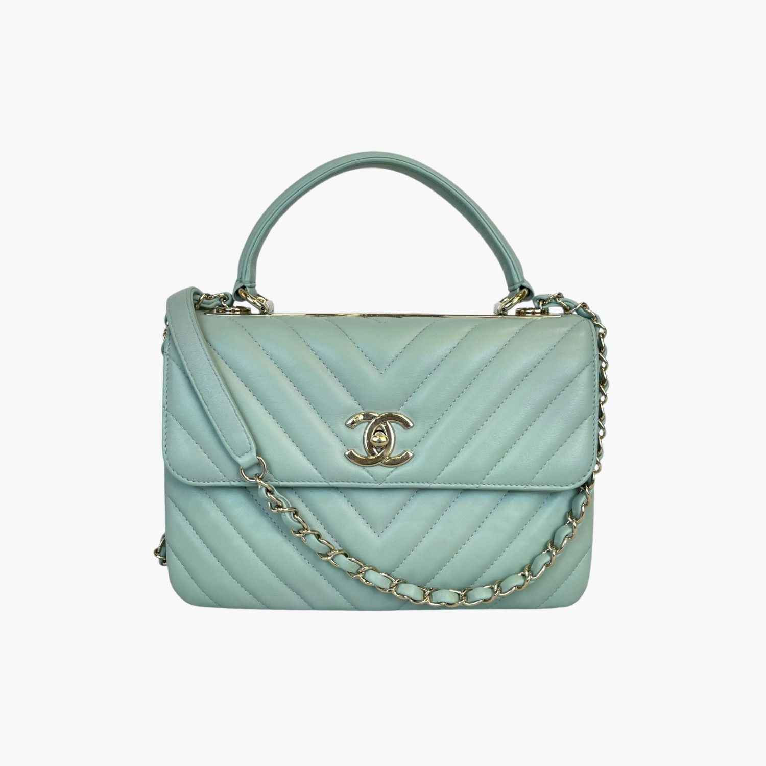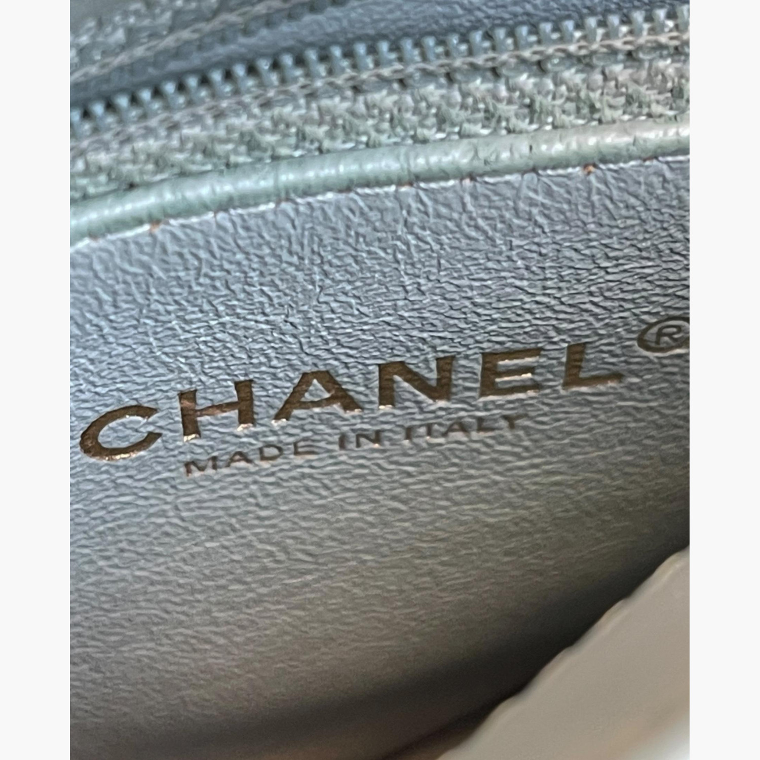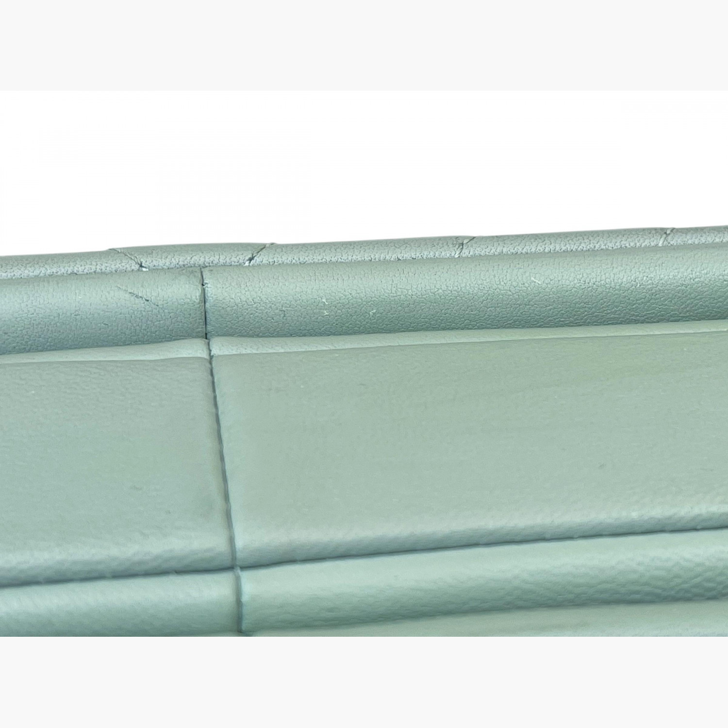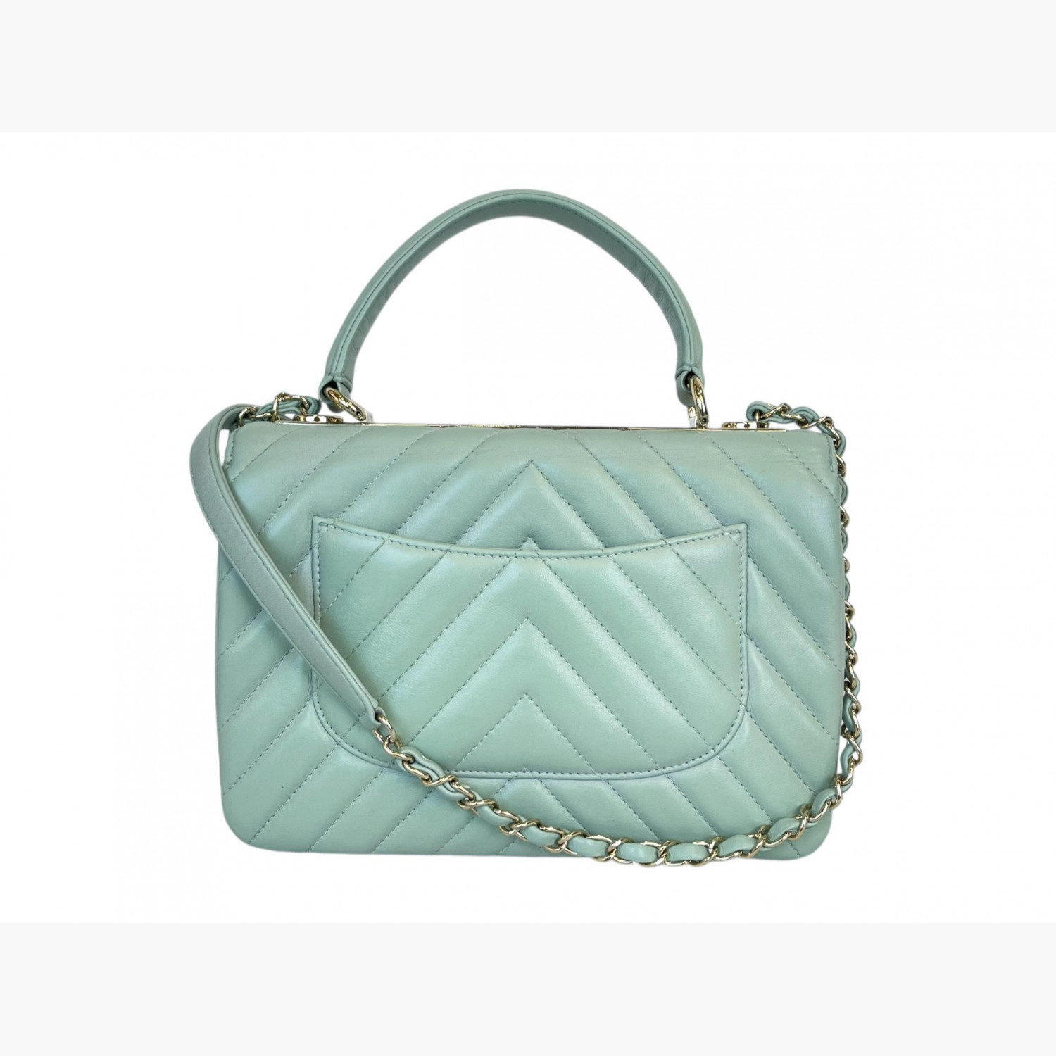 Turquoise quilted leather bag. Inside are three main compartments: the first has a double open pocket, the second has no pockets, and the third has a zip pocket. There are also open pockets on the front and back of the bag. In very good condition, with wear marks.