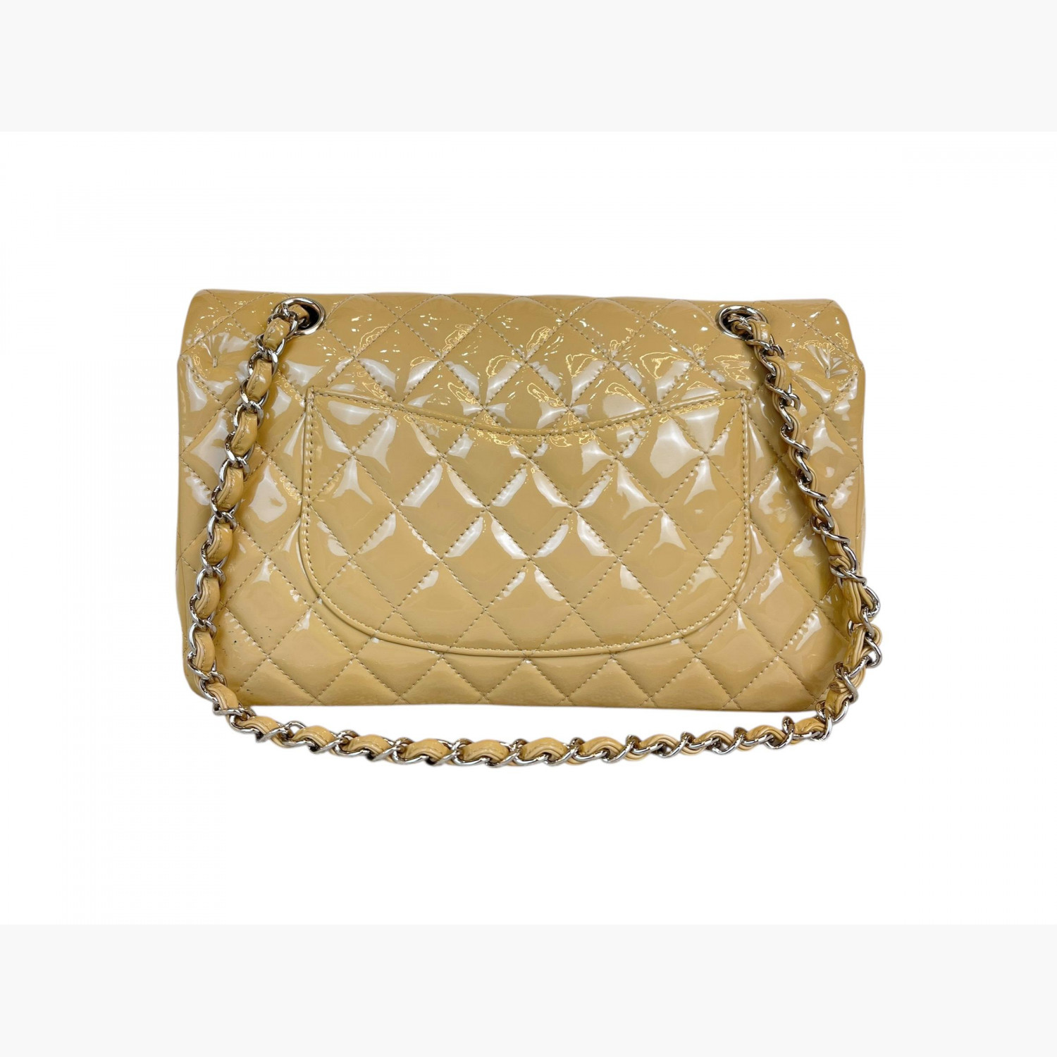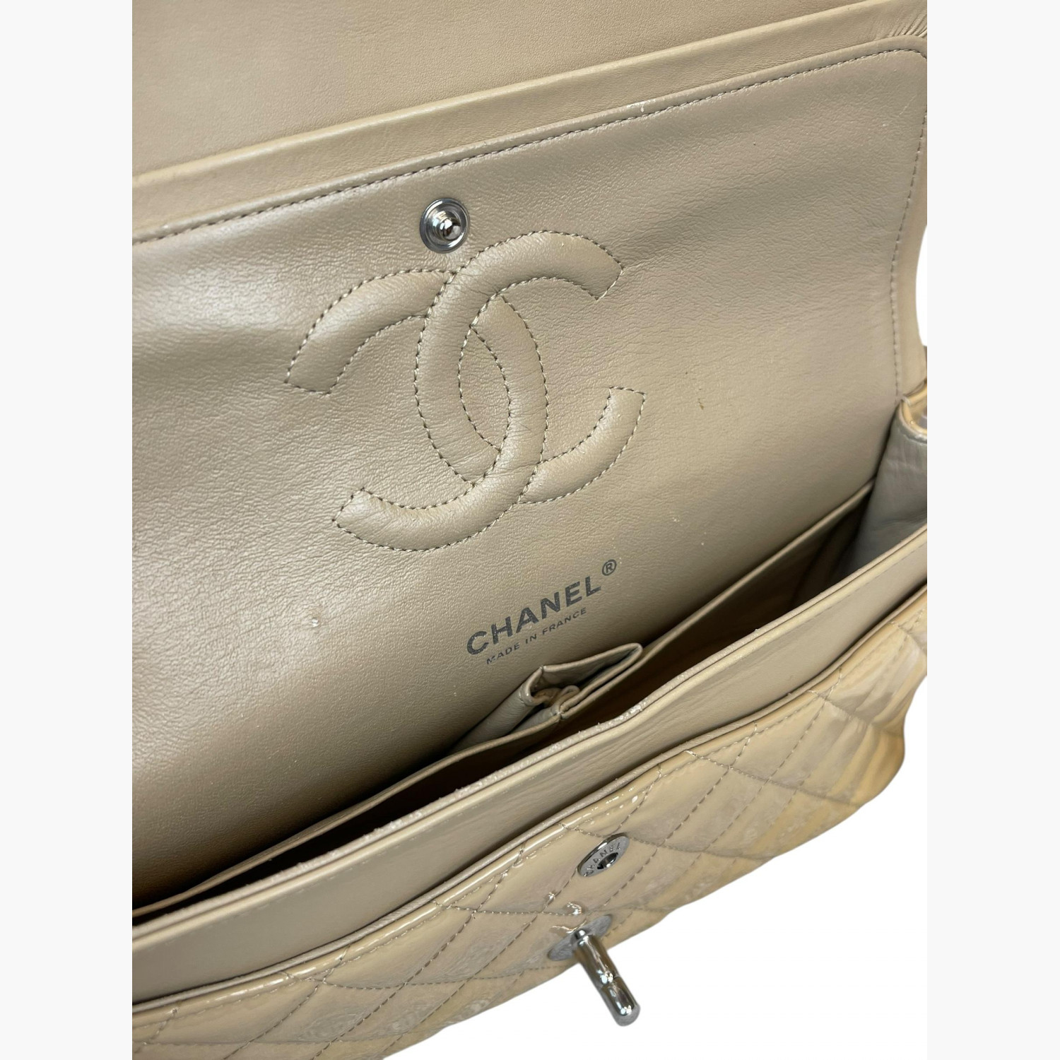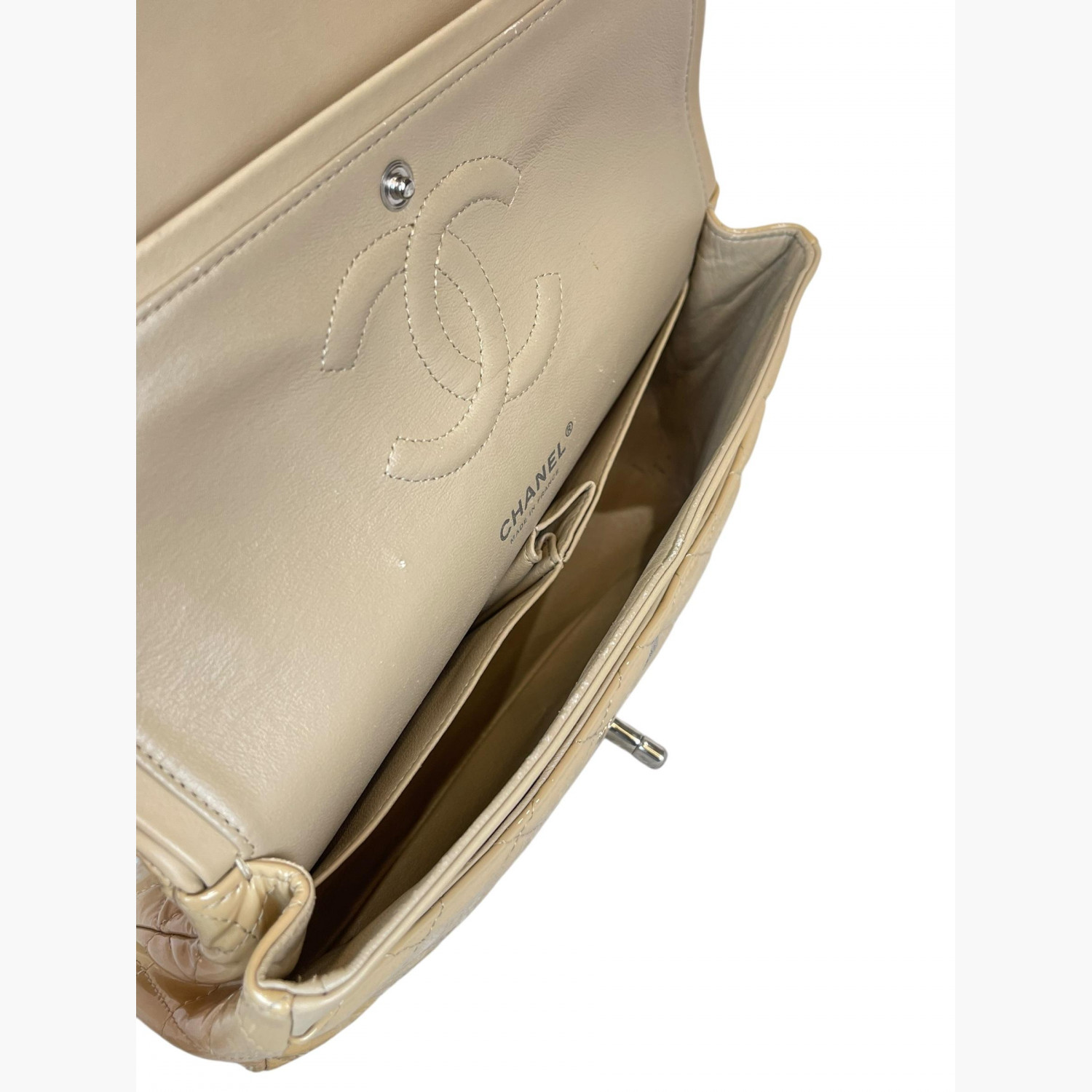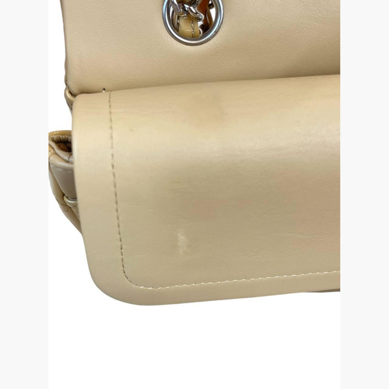 Beige quilted bag made of patent leather on a chain. Inside are two main compartments, with a pocket between the flap and the second compartment. The first compartment has a double open pocket. There is a zip pocket on the flap, as well as zip pockets on the front and back. The bag is in good condition, with wear marks.