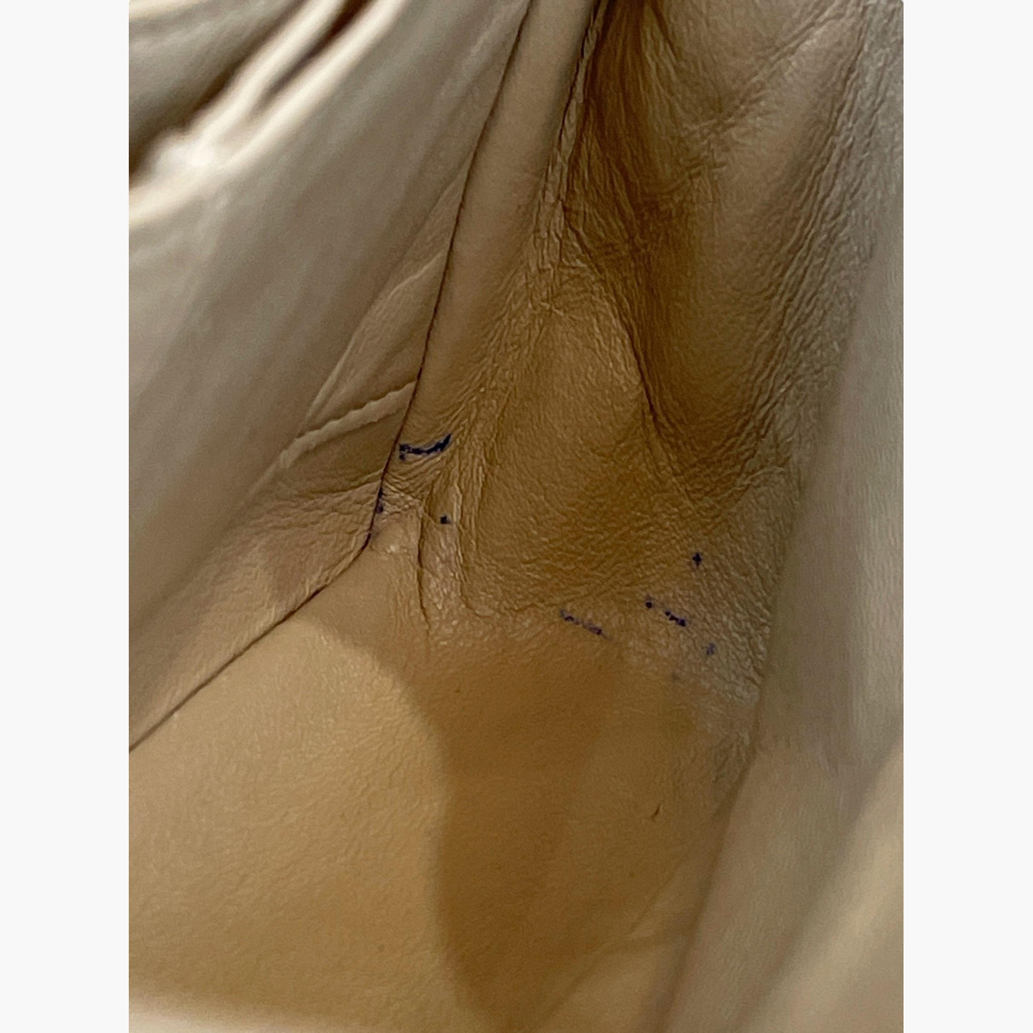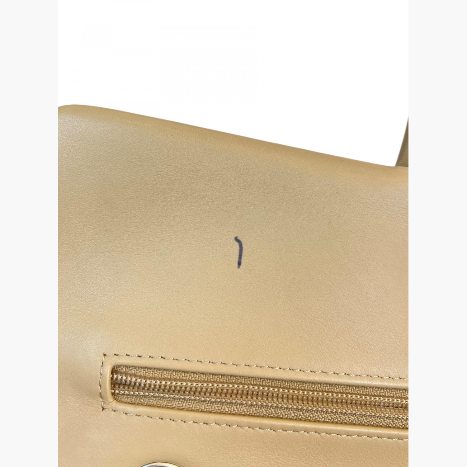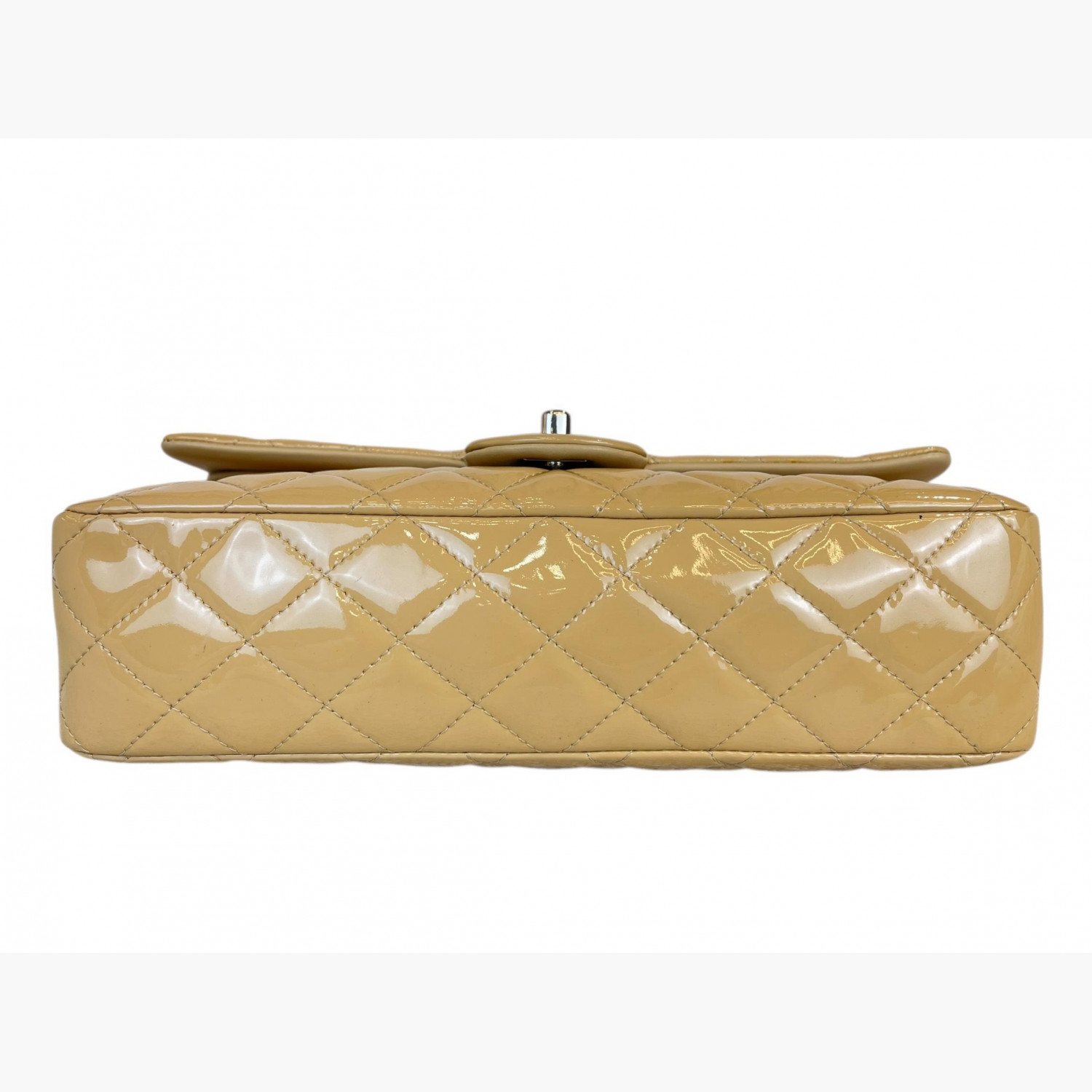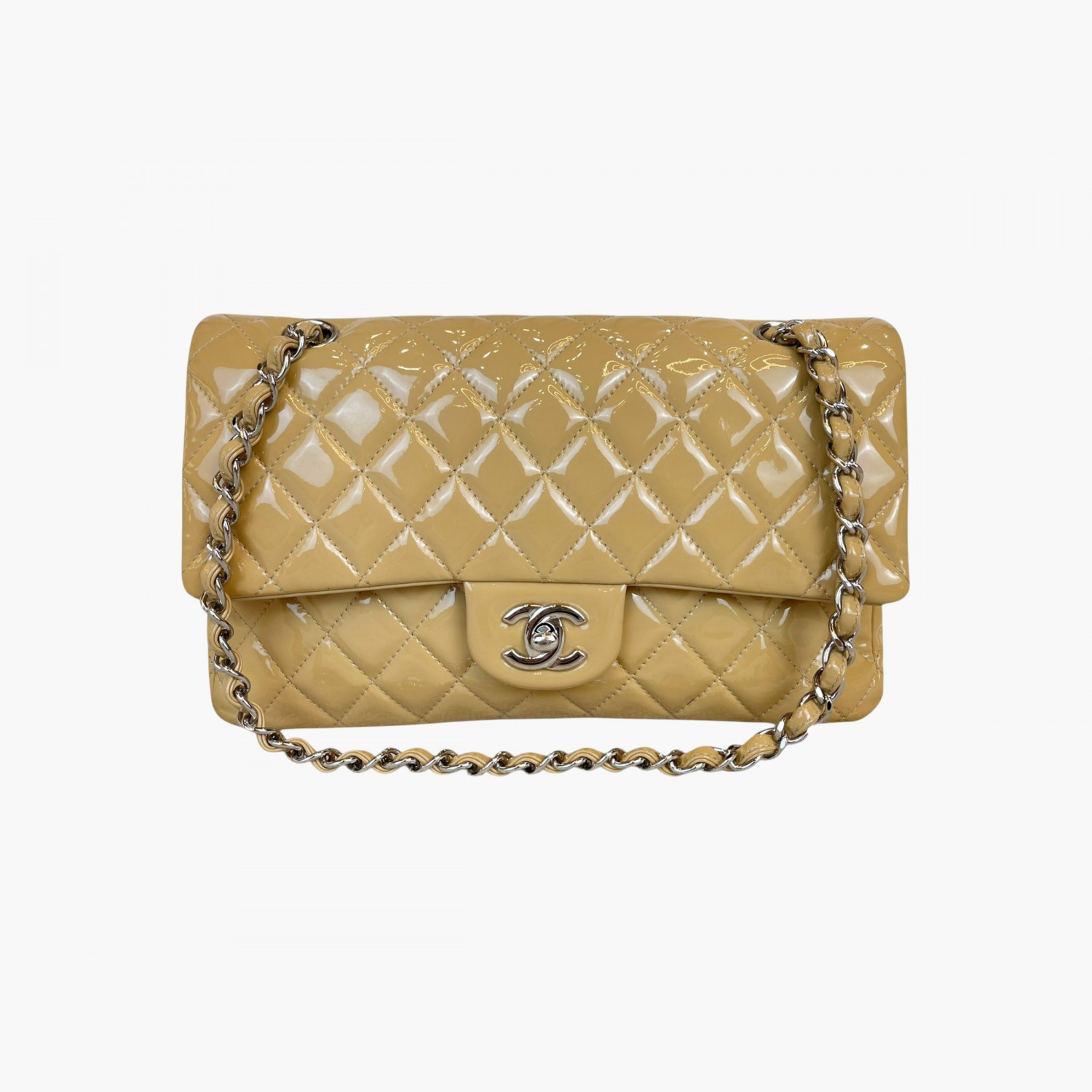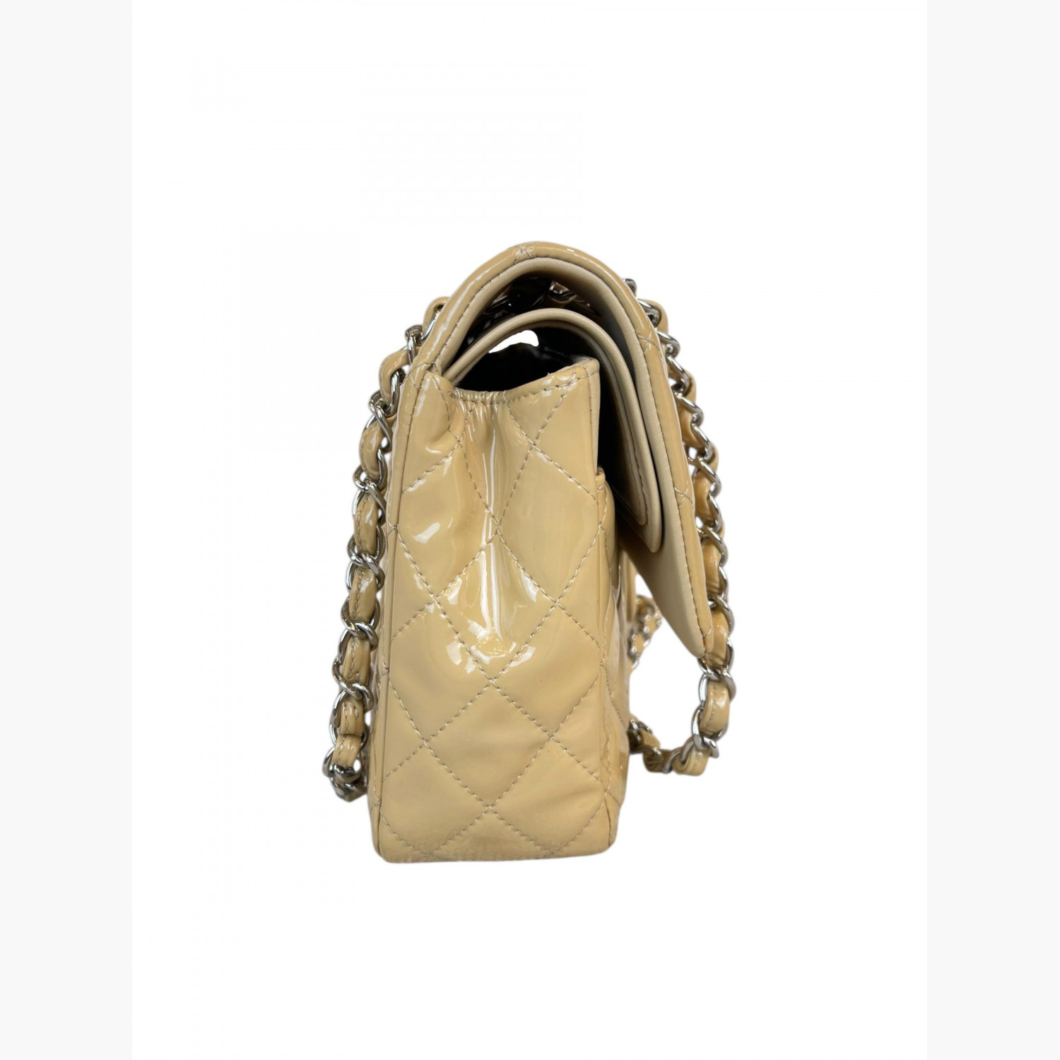 Beige quilted bag made of patent leather on a chain. Inside are two main compartments, with a pocket between the flap and the second compartment. The first compartment has a double open pocket. There is a zip pocket on the flap, as well as zip pockets on the front and back. The bag is in good condition, with wear marks.
