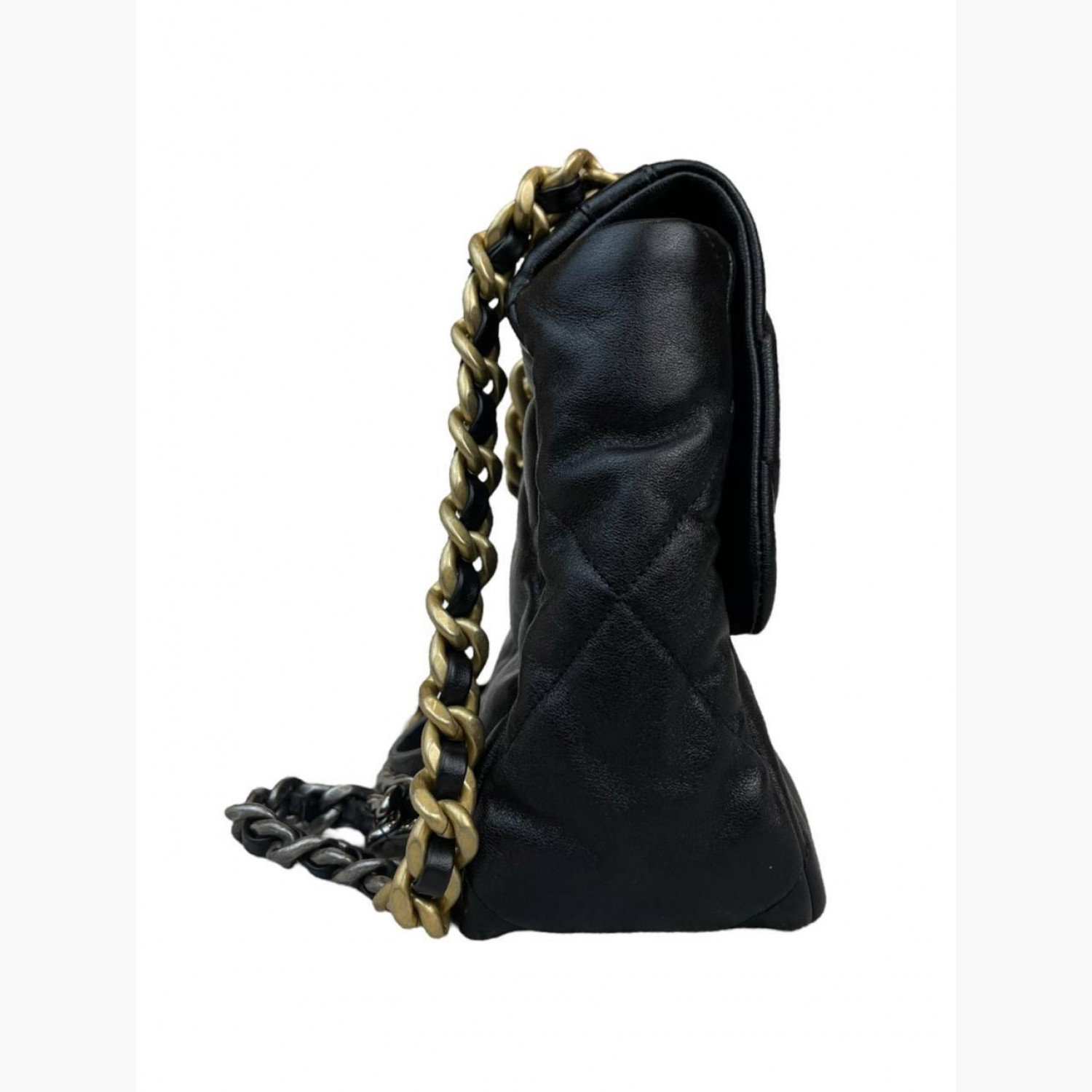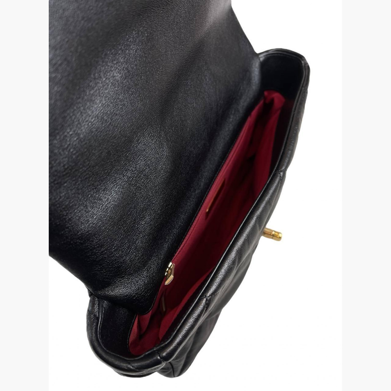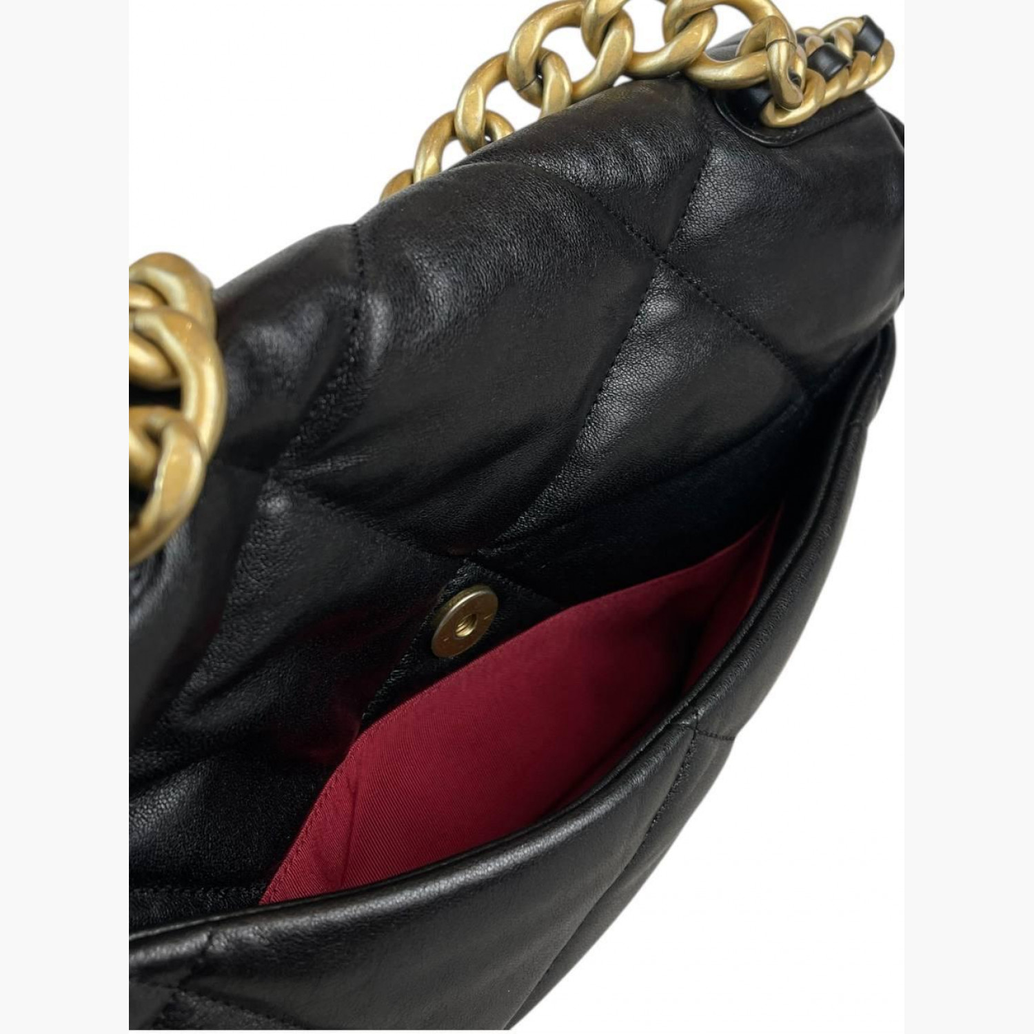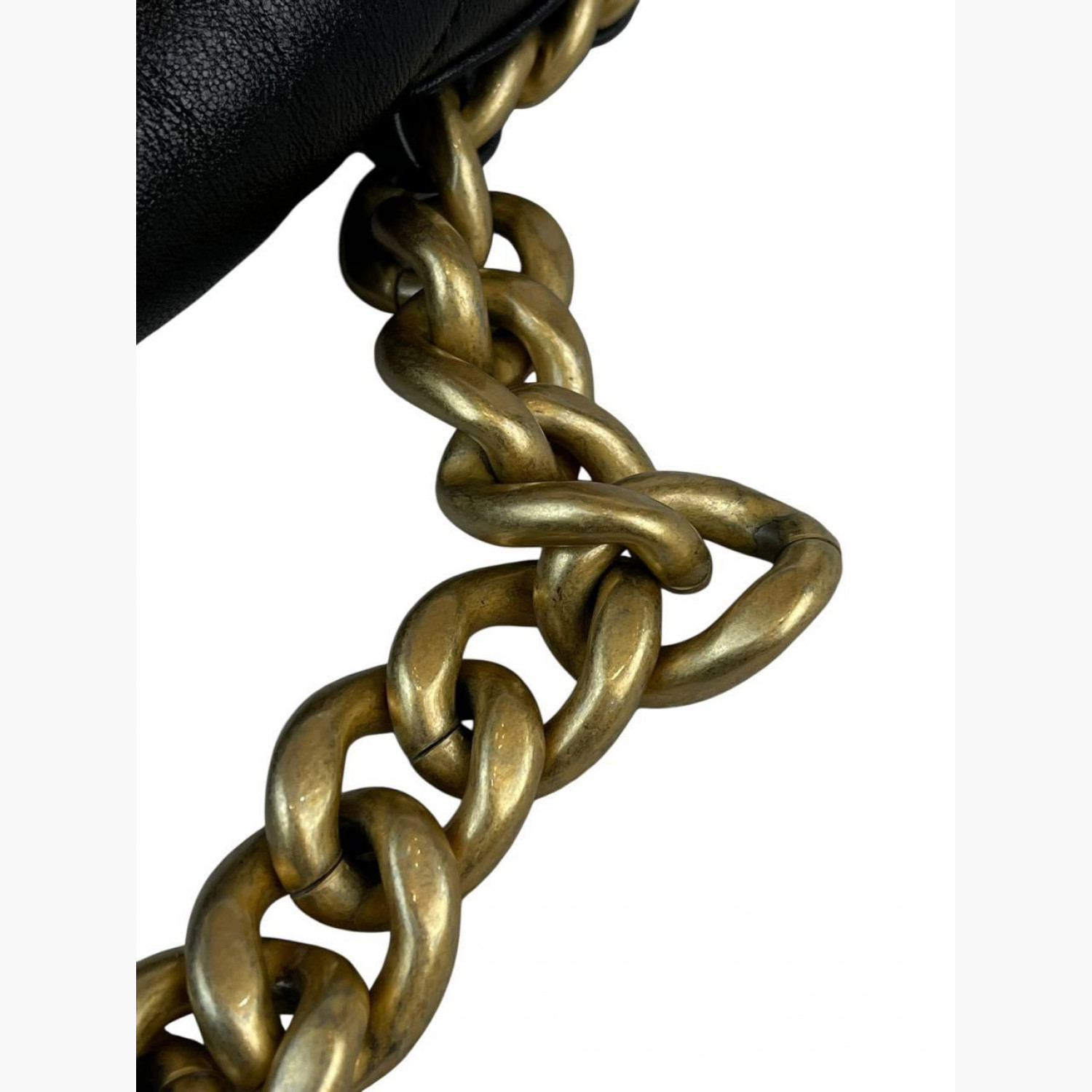 Black leather bag with a large gold and silver metal chain. One main compartment inside with a zip pocket, and an open magnetic pocket on the back of the bag. Comes with a textile dust bag. Absolutely new.