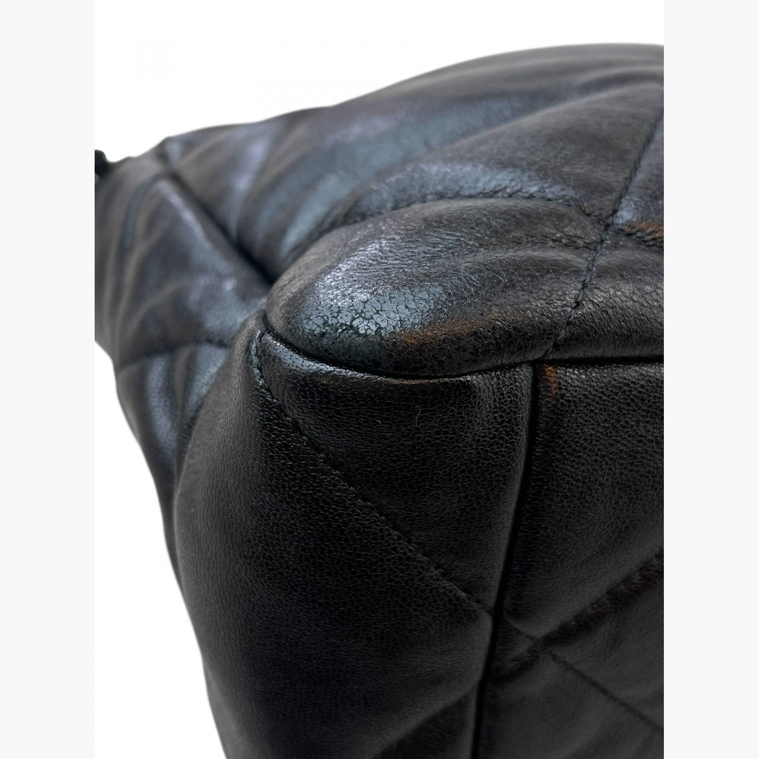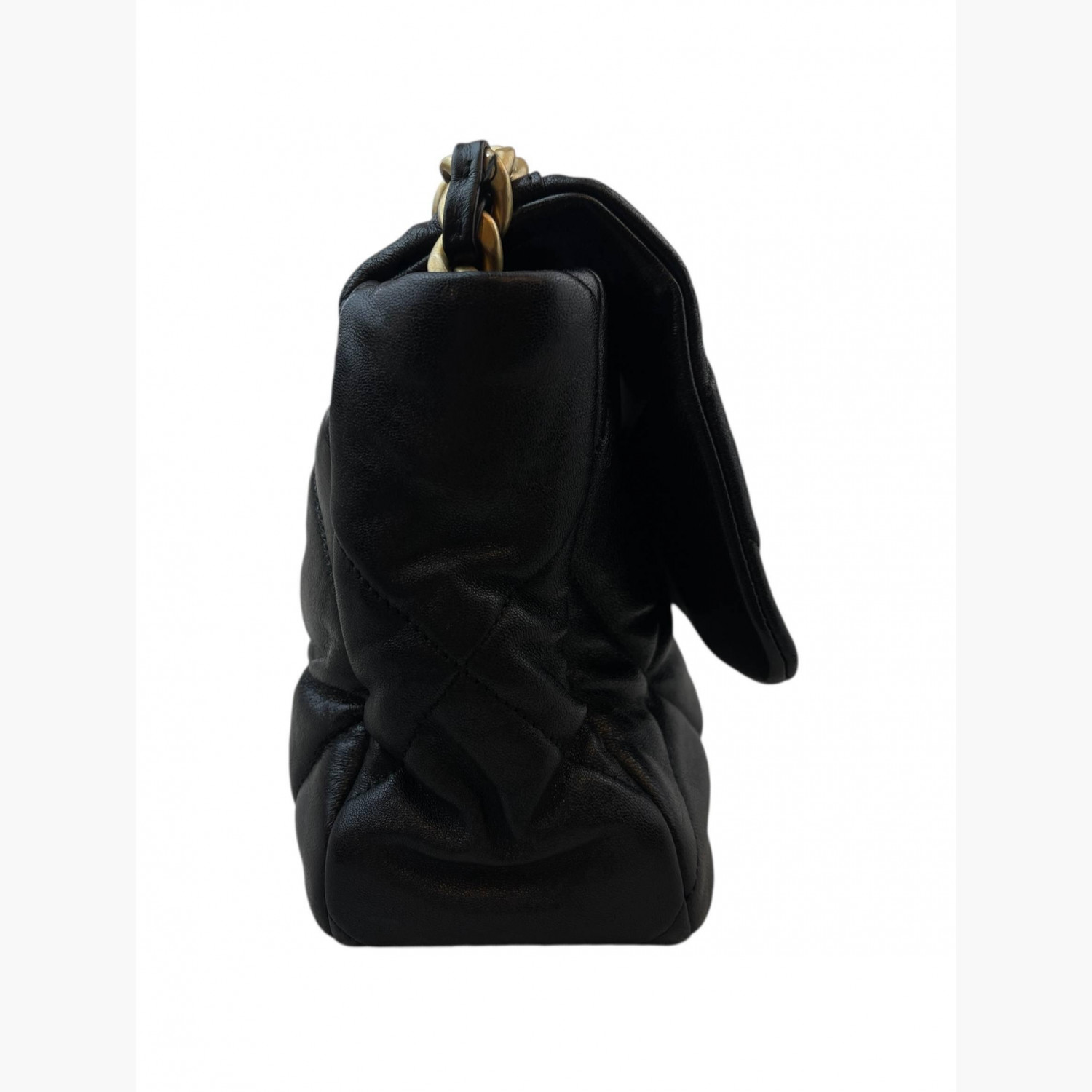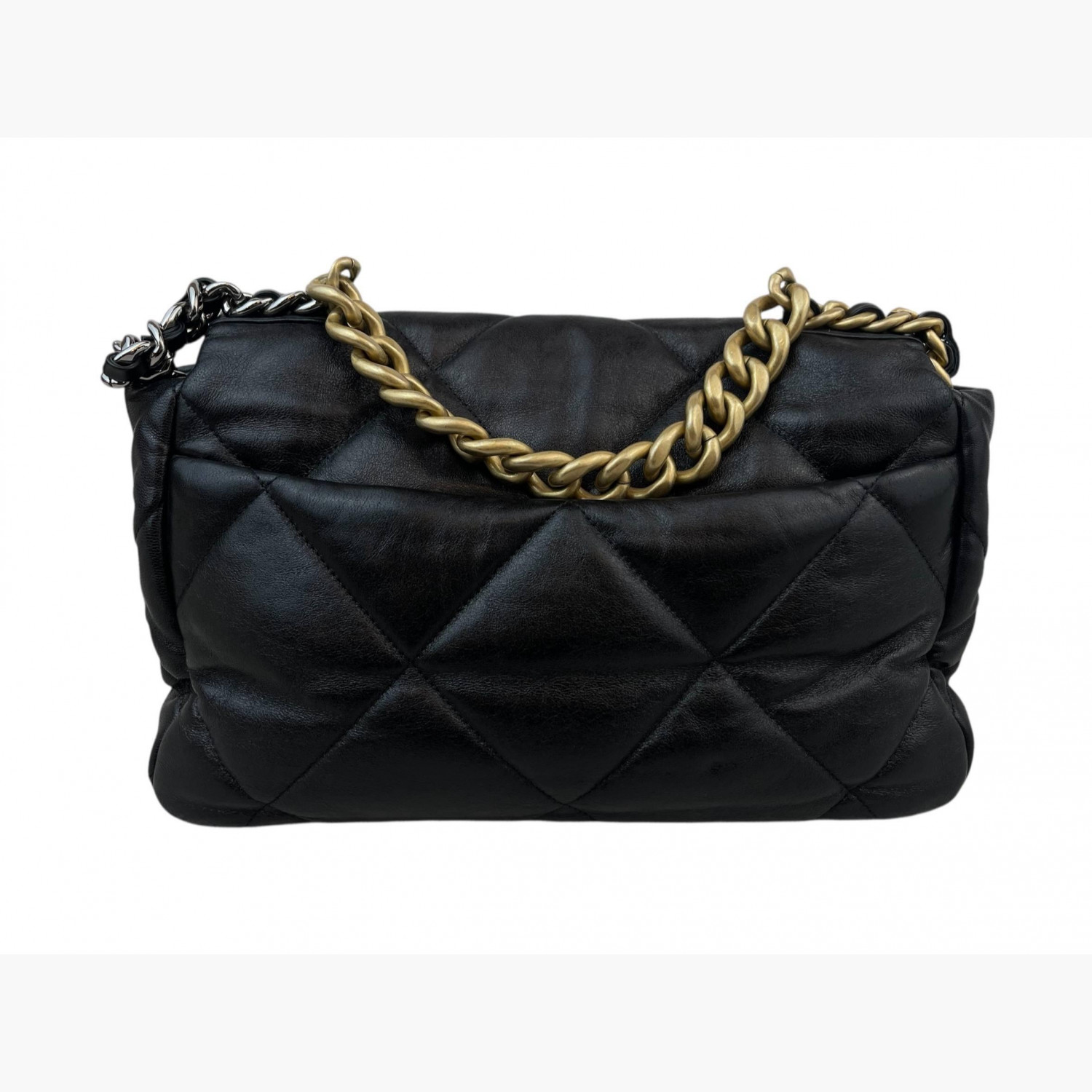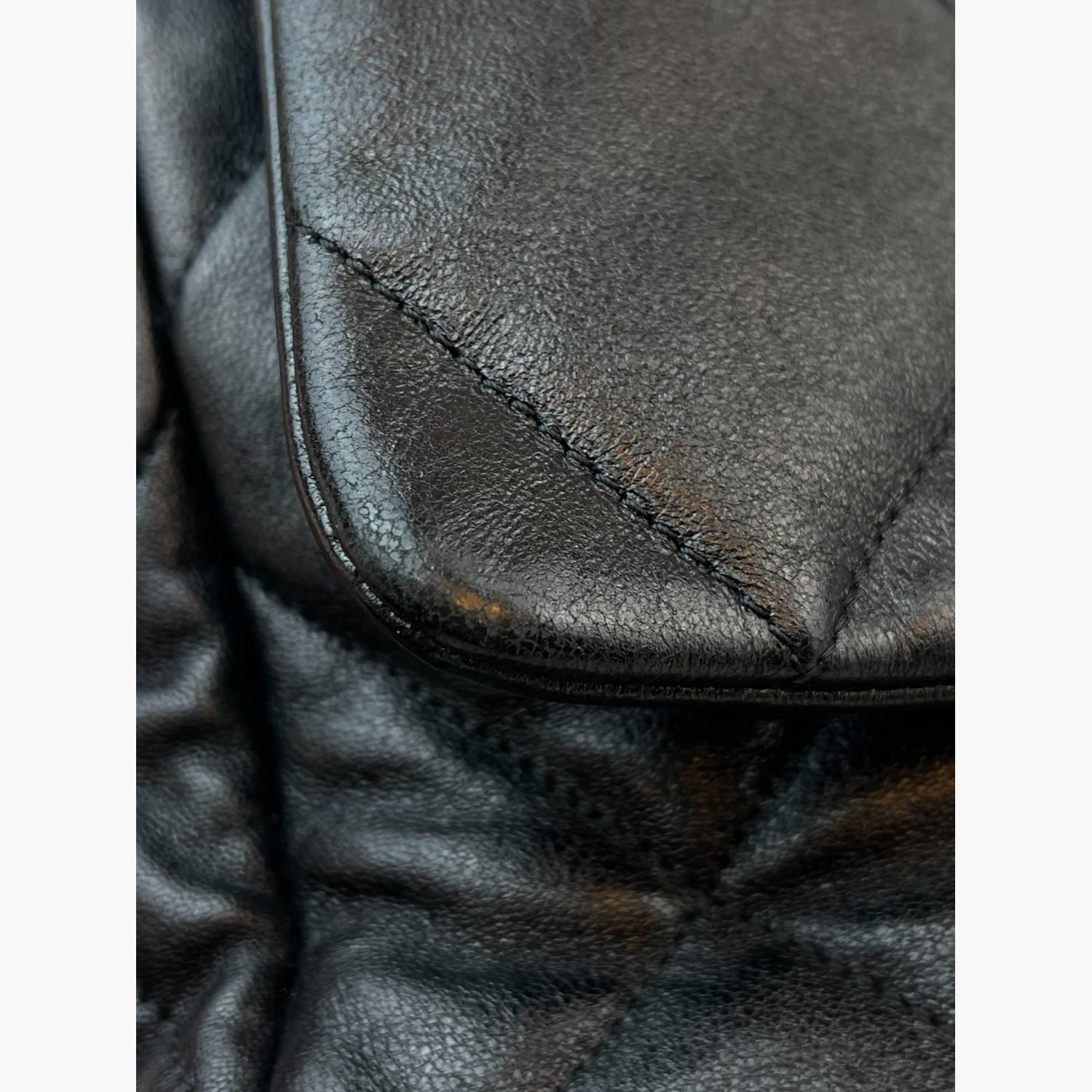 Black quilted leather bag with a two-tone chunky metal chain strap. Inside, there is one main compartment with a zip pocket, as well as an open pocket on the back.In excellent condition, with signs of wear.