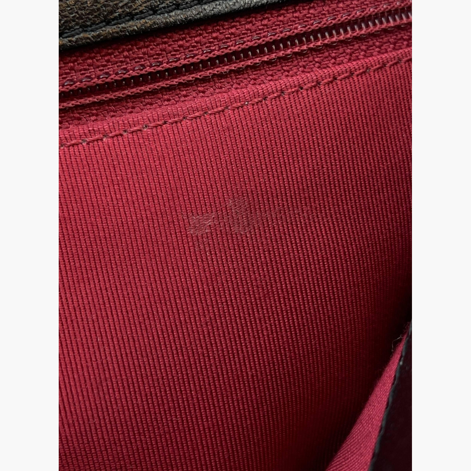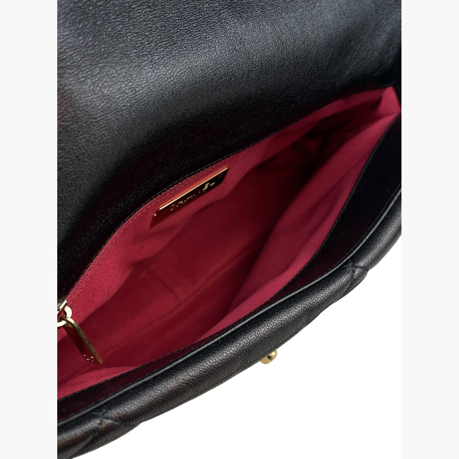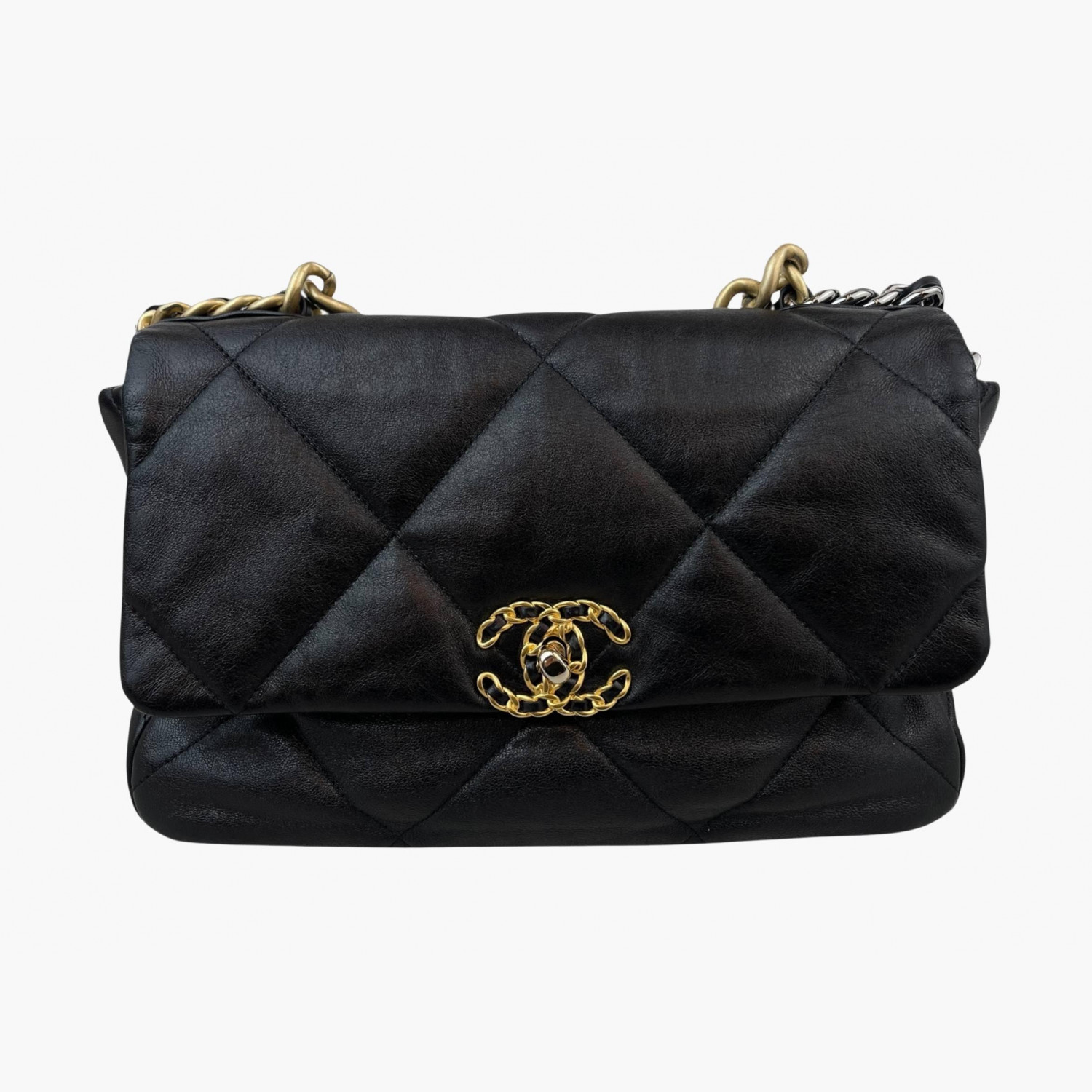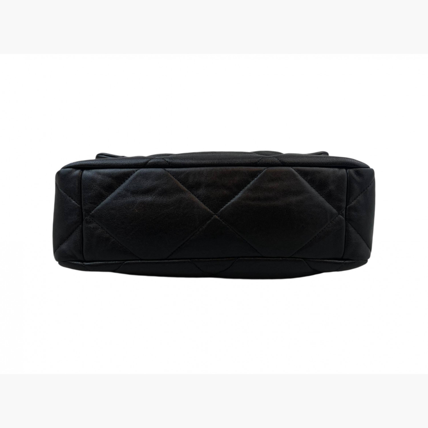 Black quilted leather bag with a two-tone chunky metal chain strap. Inside, there is one main compartment with a zip pocket, as well as an open pocket on the back.In excellent condition, with signs of wear.