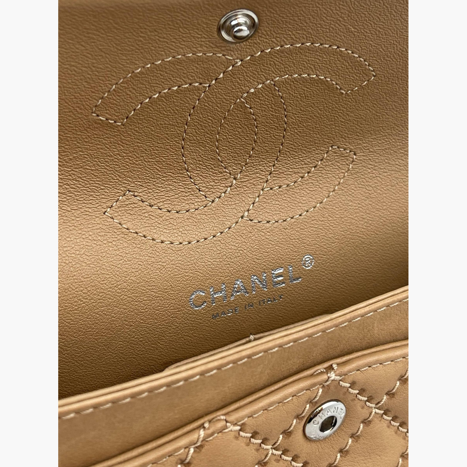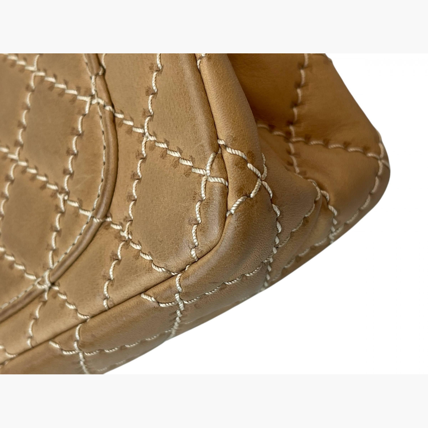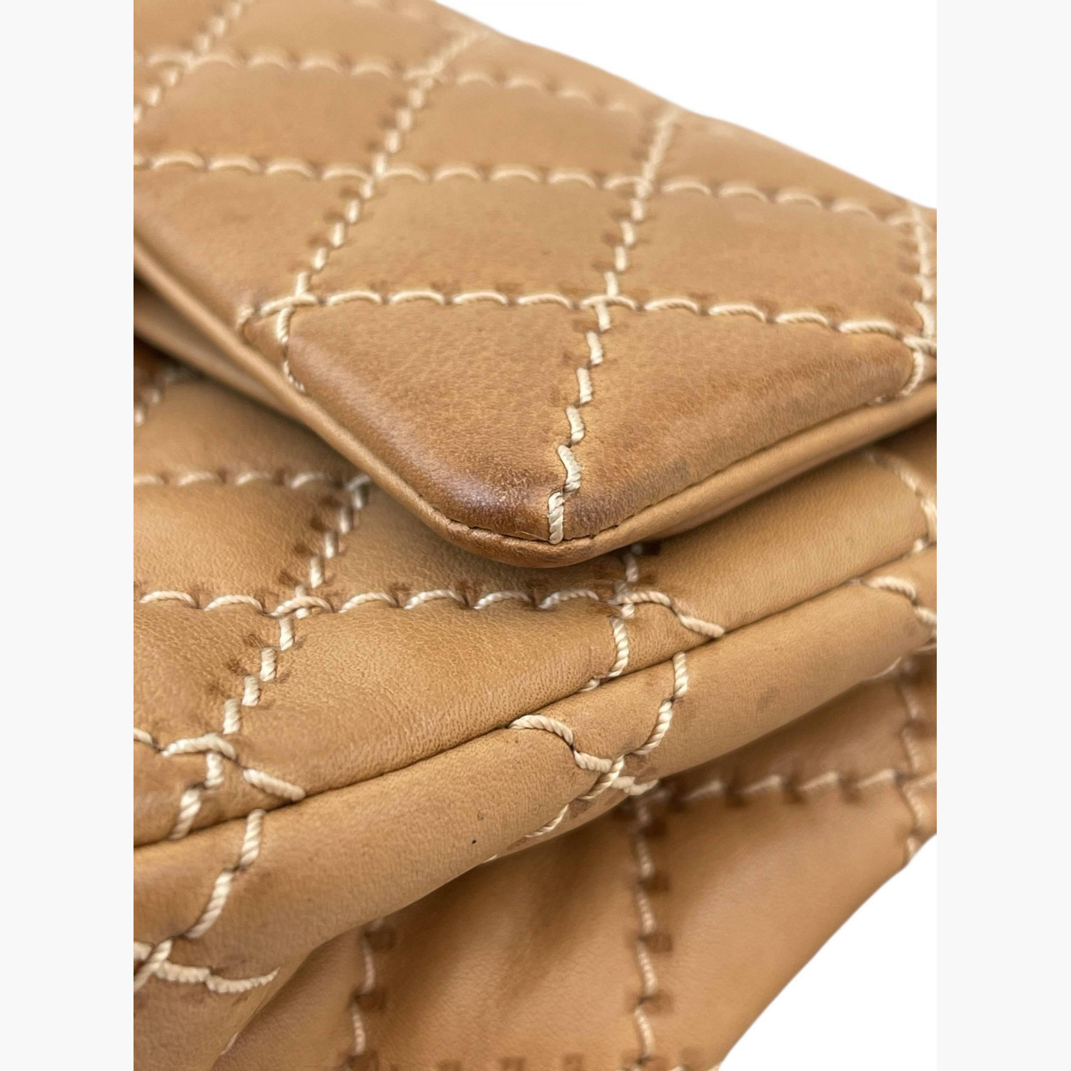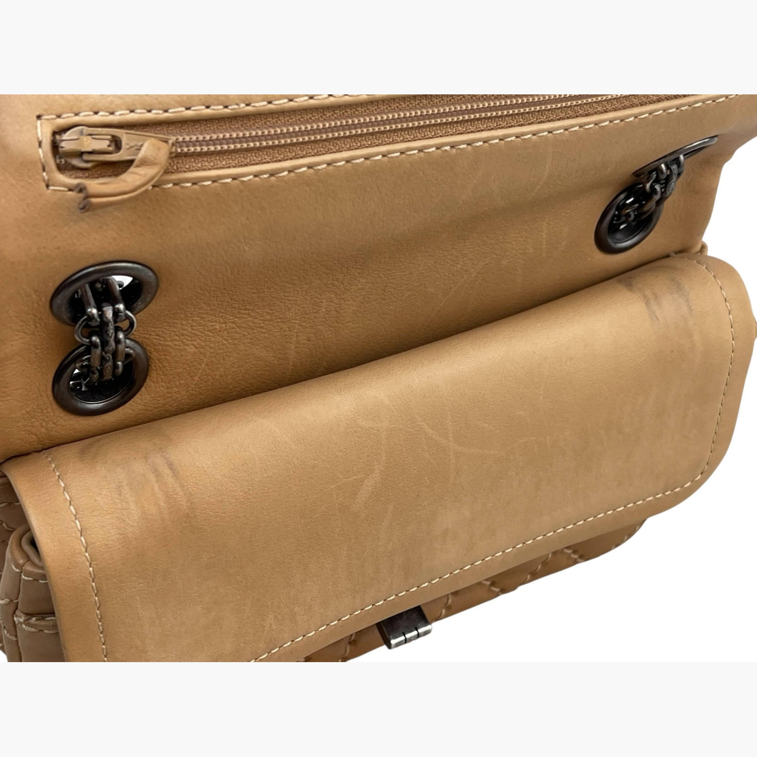 Caramel quilted leather bag with a double flap and a thin metal chain strap. Inside, there is one main compartment with a double open pocket; the main flap features a zip pocket, and there are also open pockets on the front and back of the bag.In excellent condition, with signs of wear.