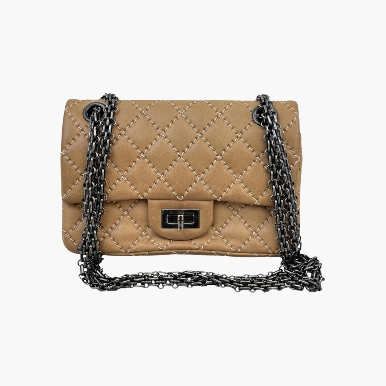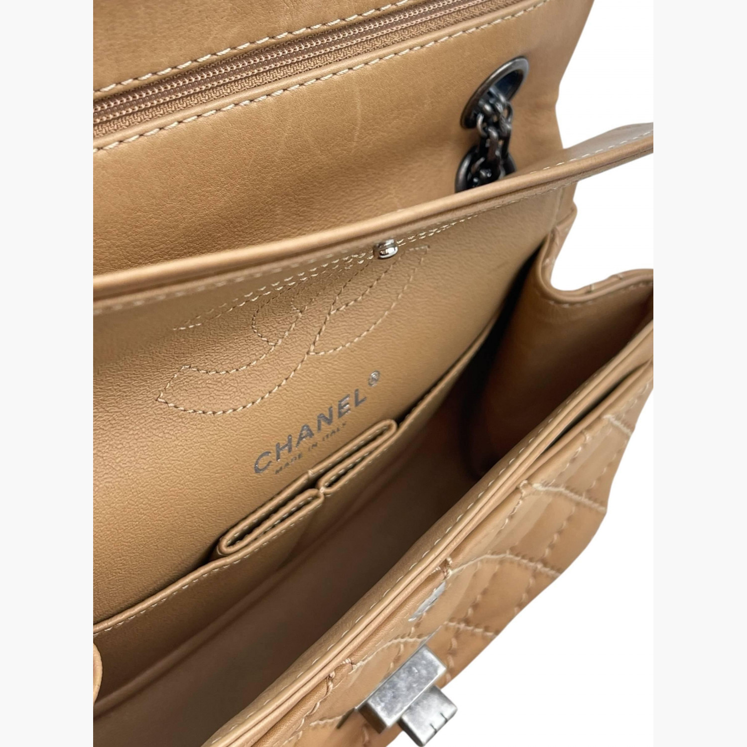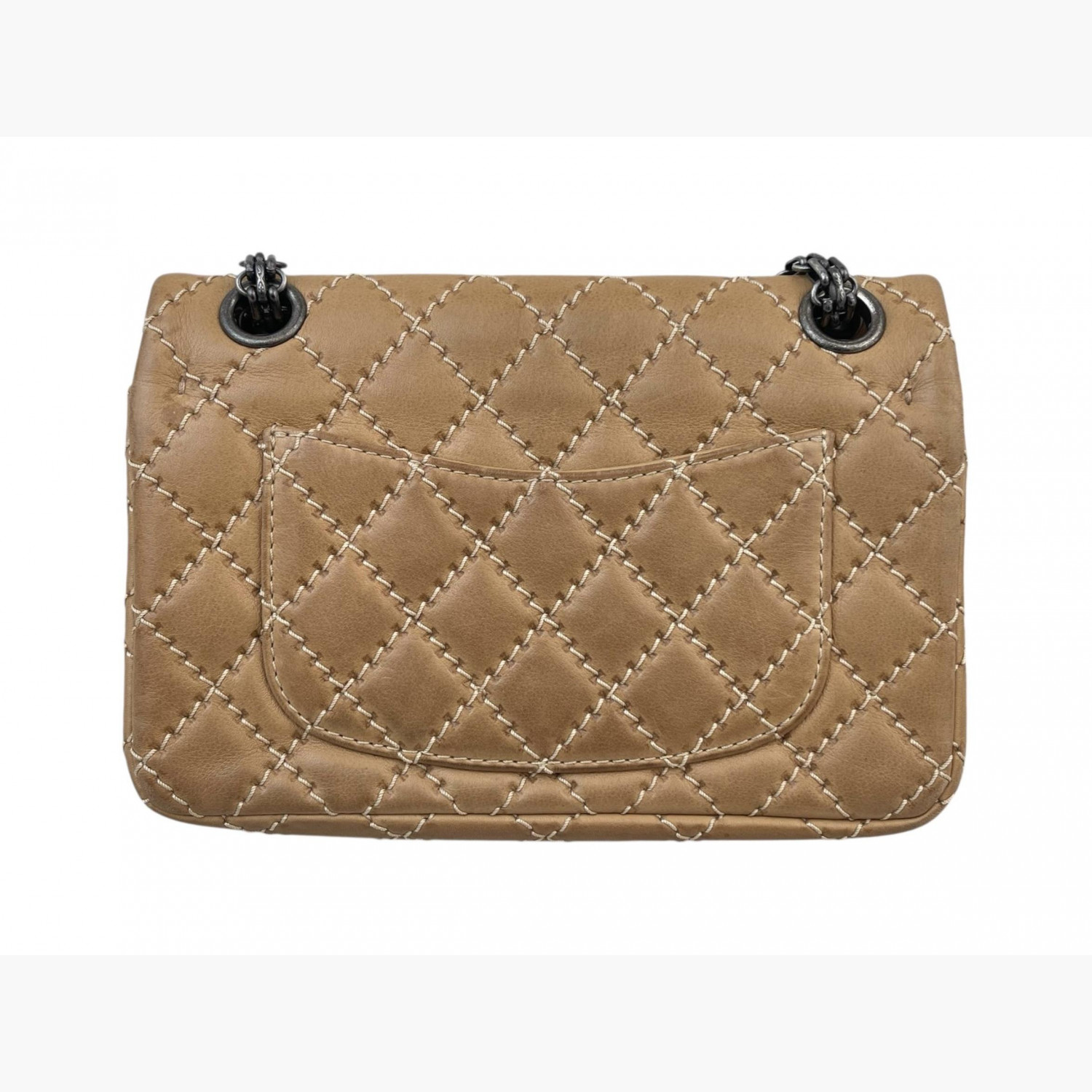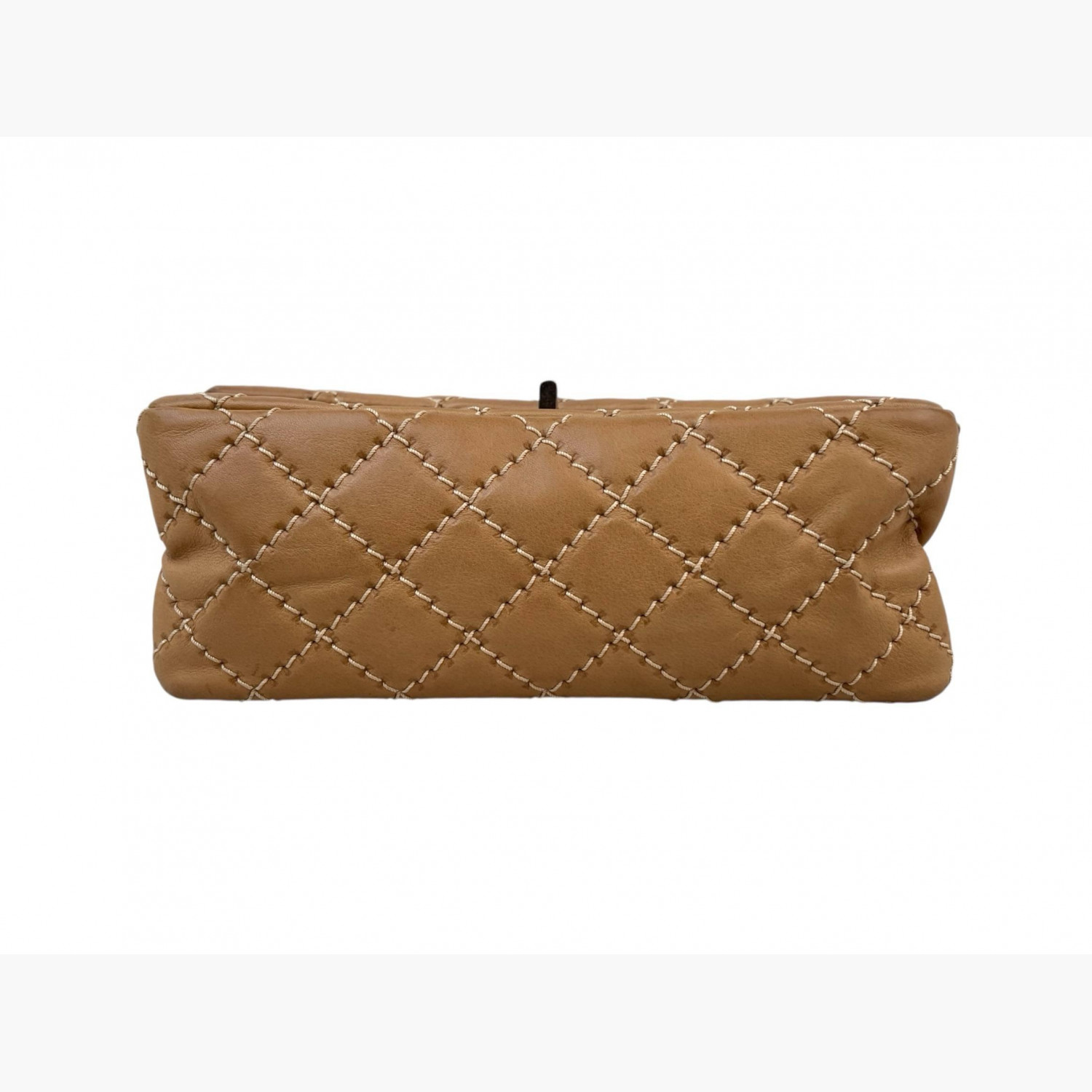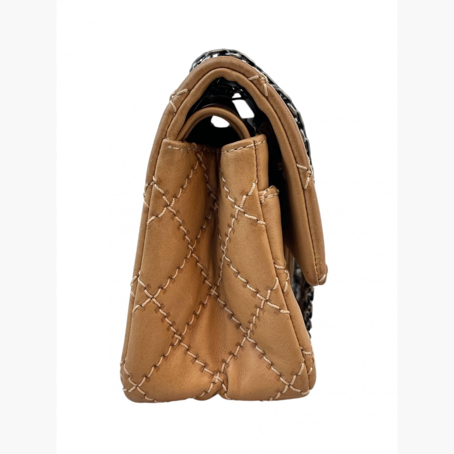 Caramel quilted leather bag with a double flap and a thin metal chain strap. Inside, there is one main compartment with a double open pocket; the main flap features a zip pocket, and there are also open pockets on the front and back of the bag.In excellent condition, with signs of wear.