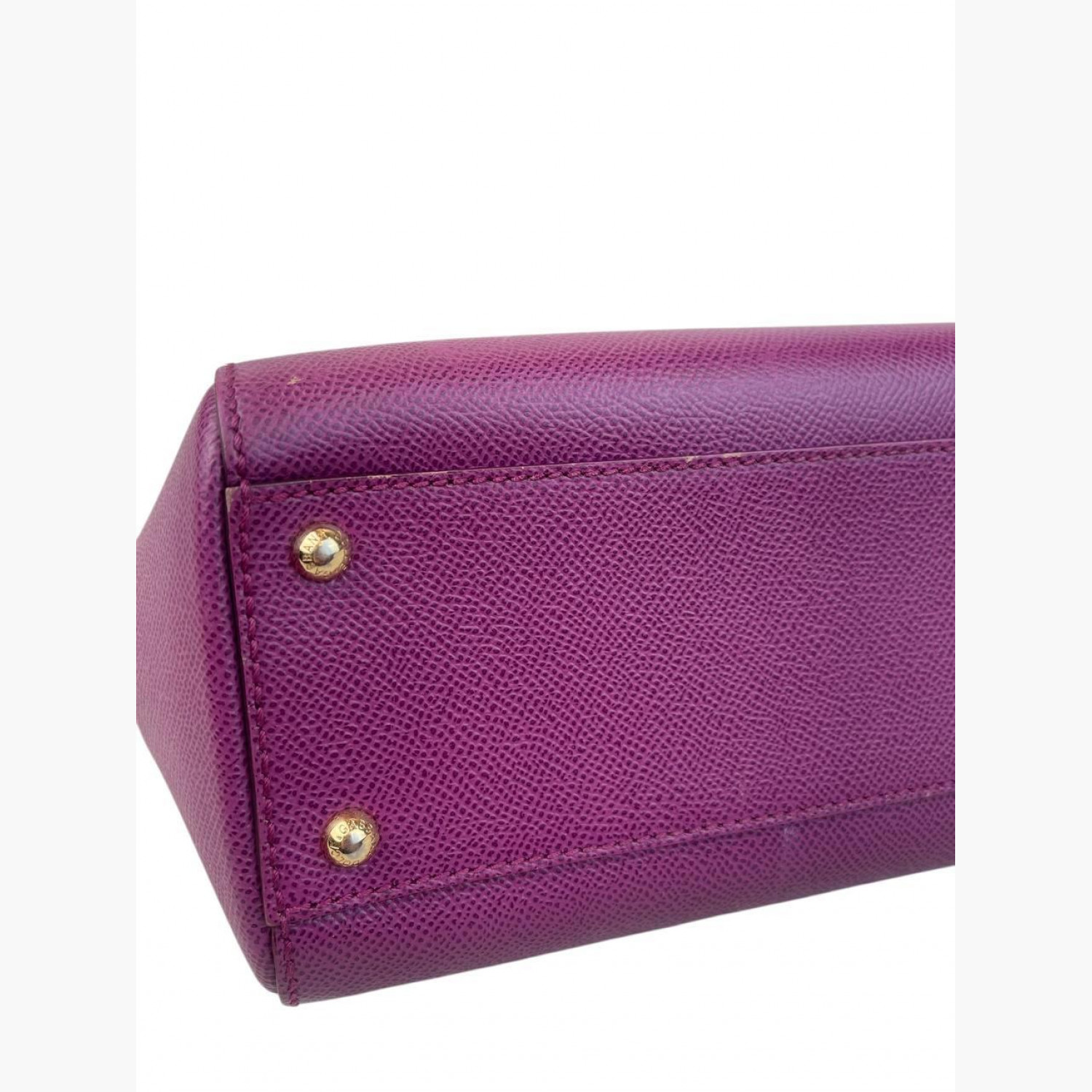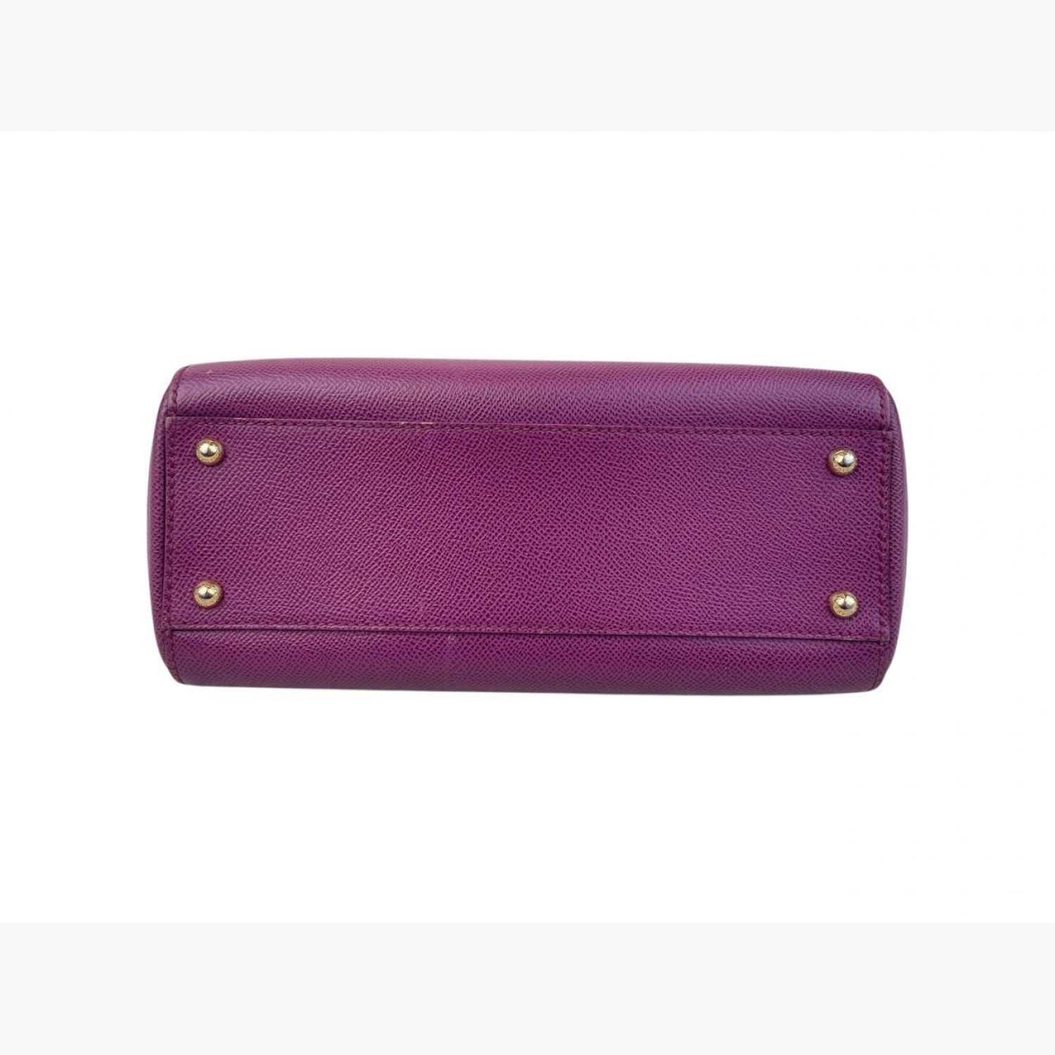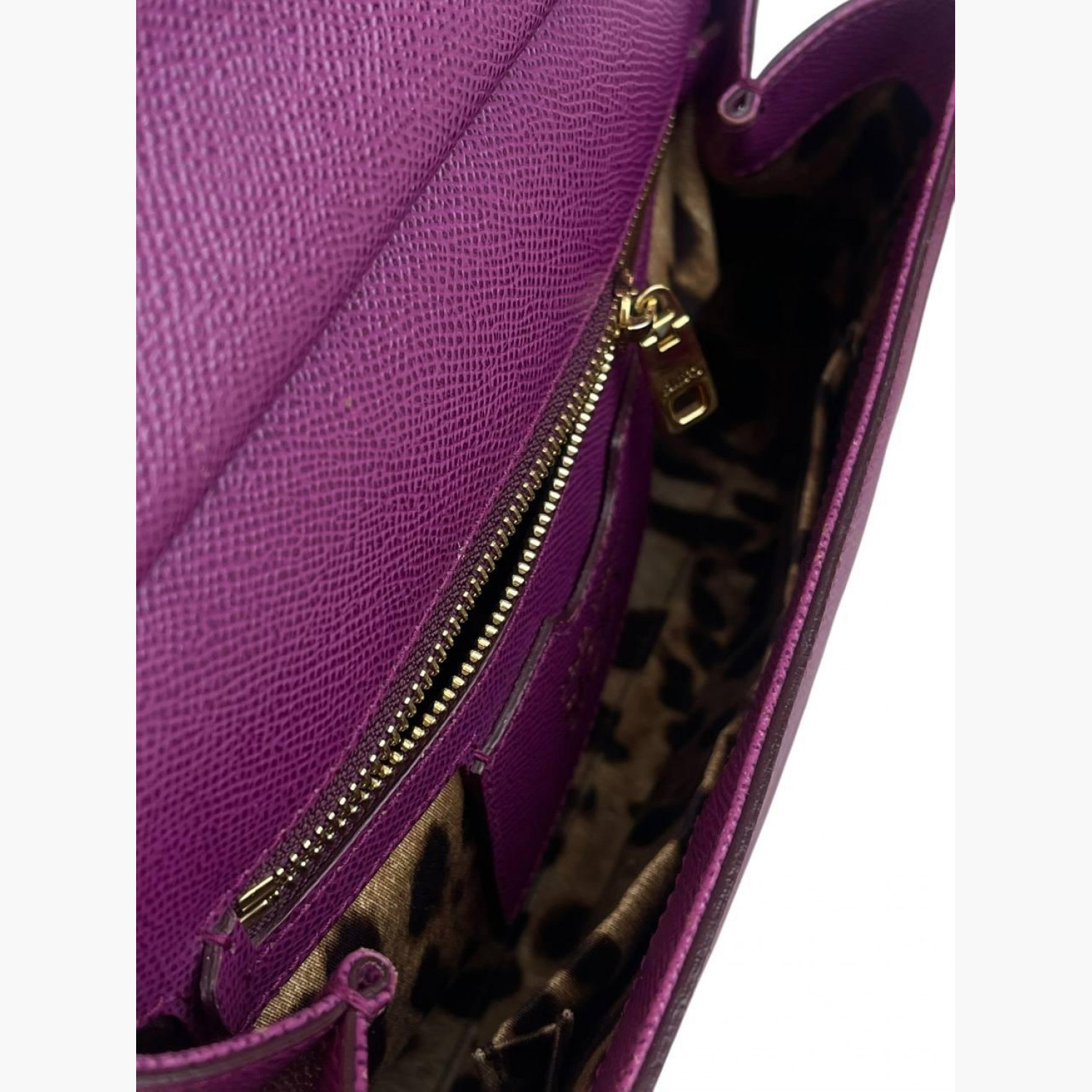 Purple leather bag with a removable strap. Inside there is one main compartment with a zip pocket and an open pocket opposite it. In good condition, with wear marks.