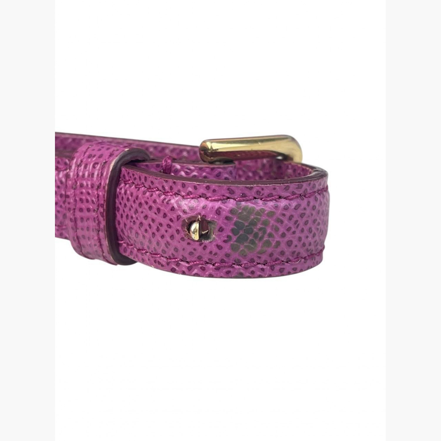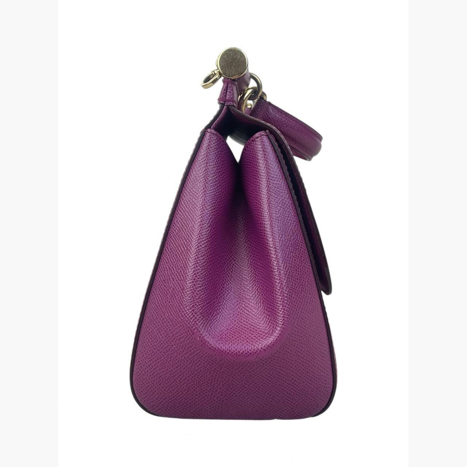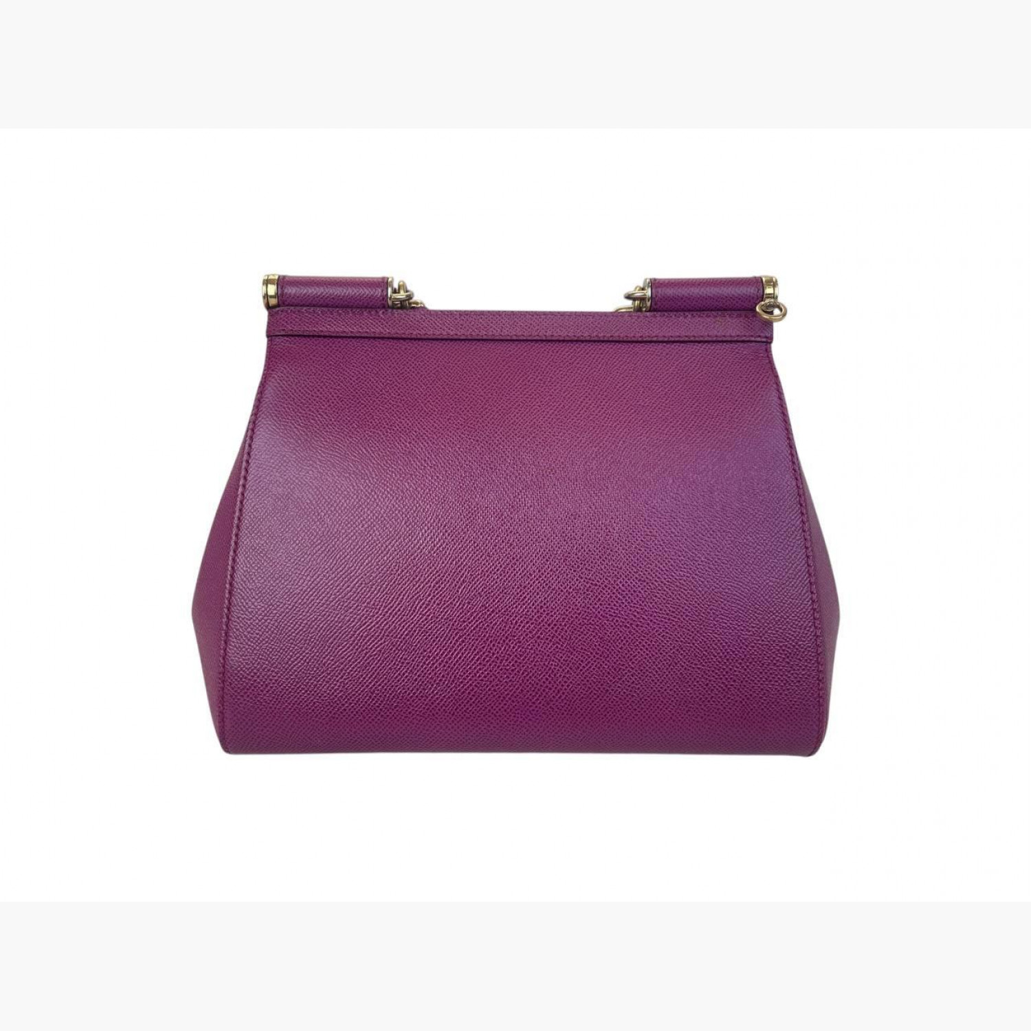 Purple leather bag with a removable strap. Inside there is one main compartment with a zip pocket and an open pocket opposite it. In good condition, with wear marks.