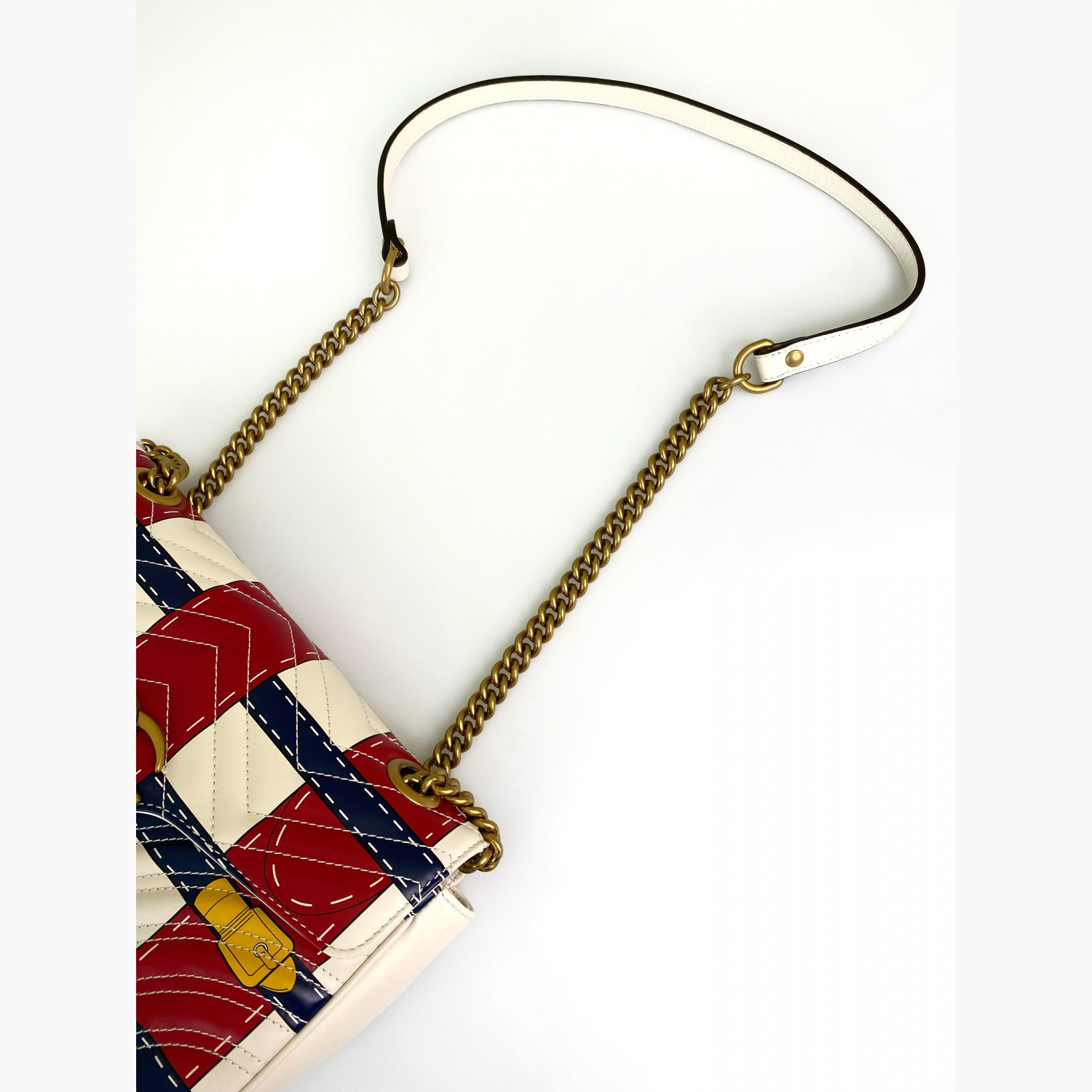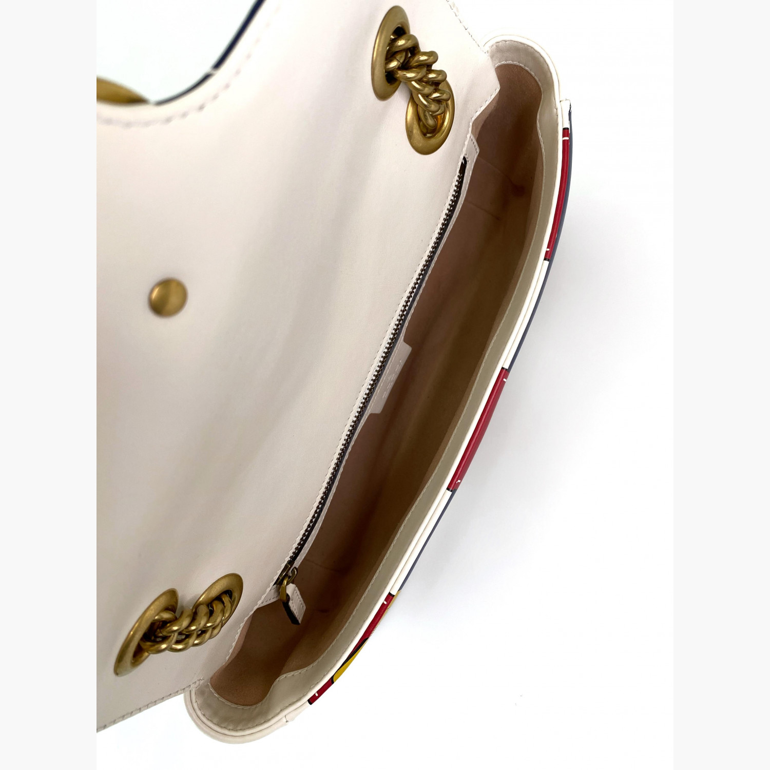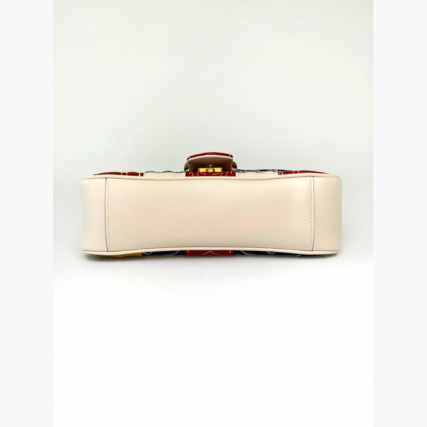 Bag in perfect condition, not worn. Quilted effect, original print, a combination of milk, red, blue and yellow. Brushed gold fittings. Inside one compartment and a side pocket with zipper. Can be worn on the shoulder or over the shoulder.