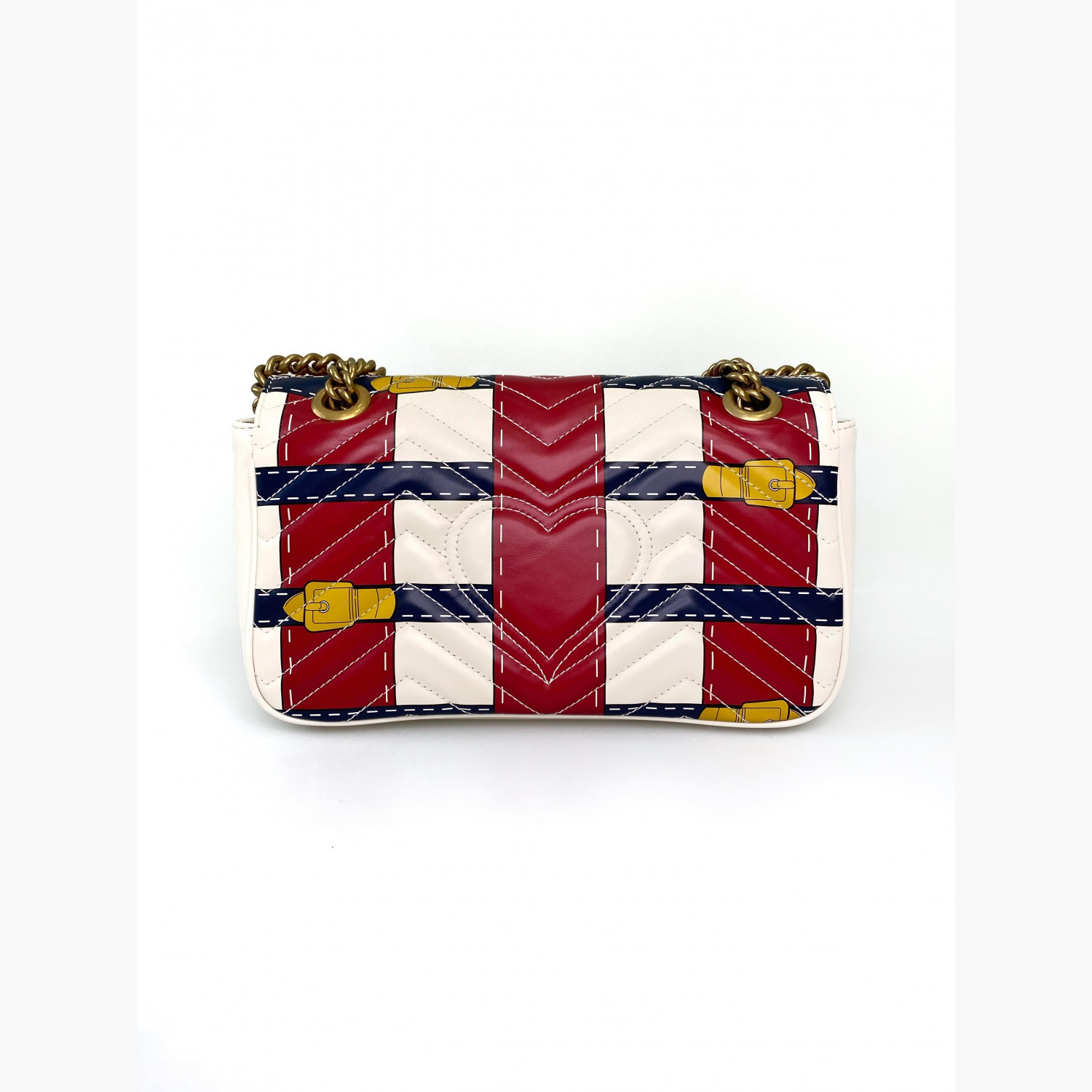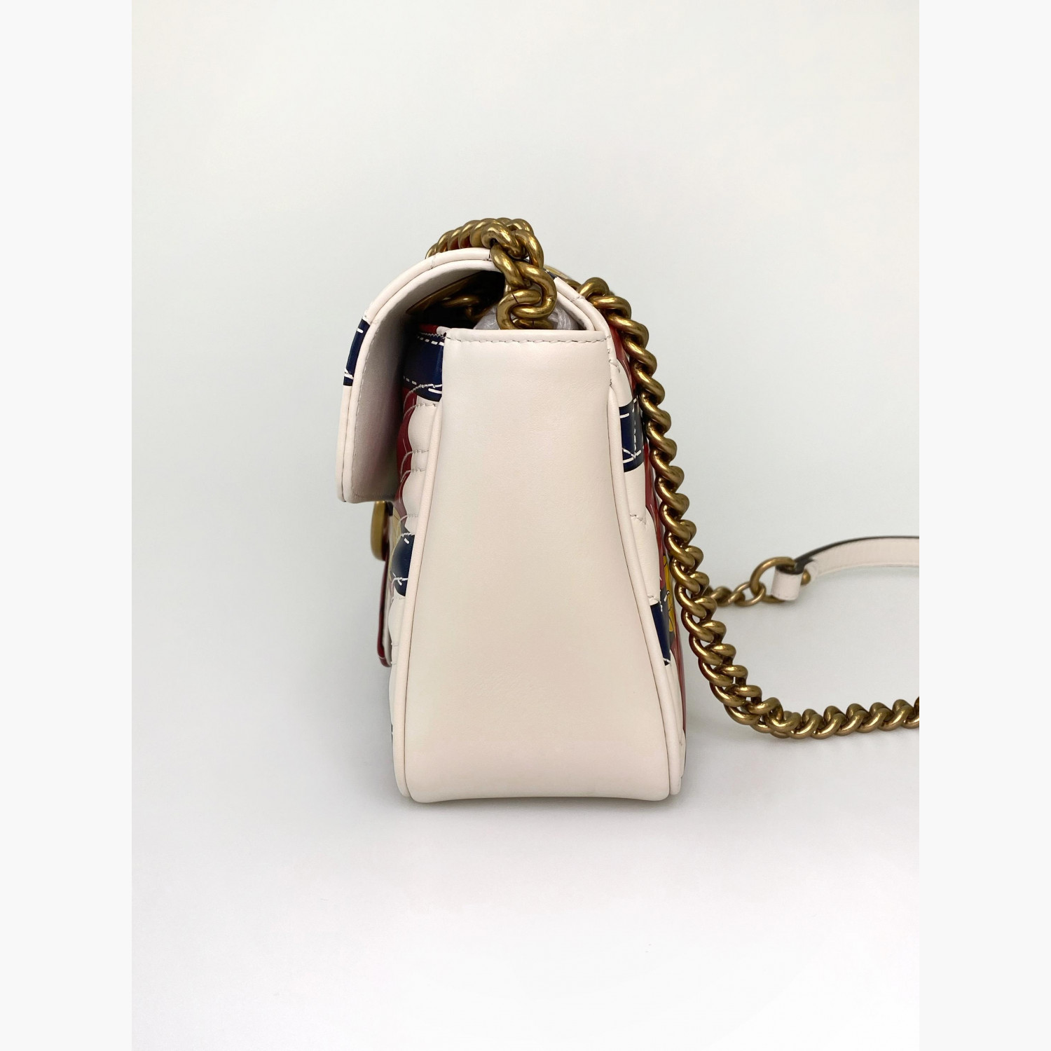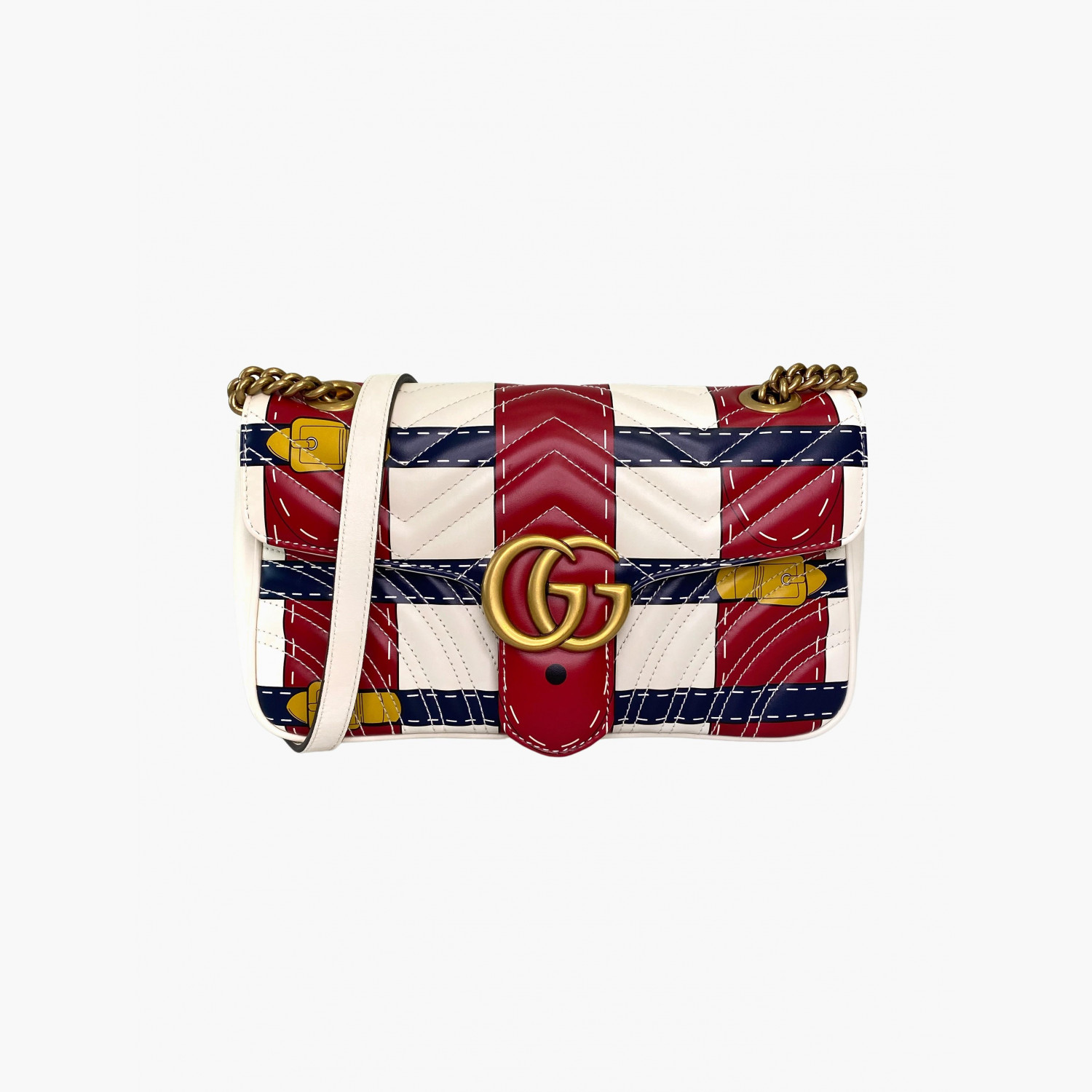 Bag in perfect condition, not worn. Quilted effect, original print, a combination of milk, red, blue and yellow. Brushed gold fittings. Inside one compartment and a side pocket with zipper. Can be worn on the shoulder or over the shoulder.
