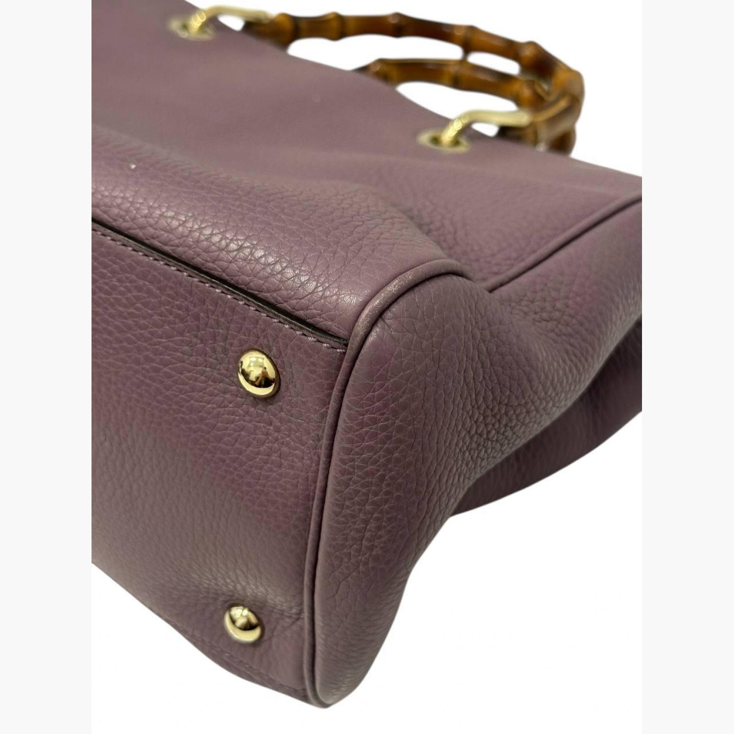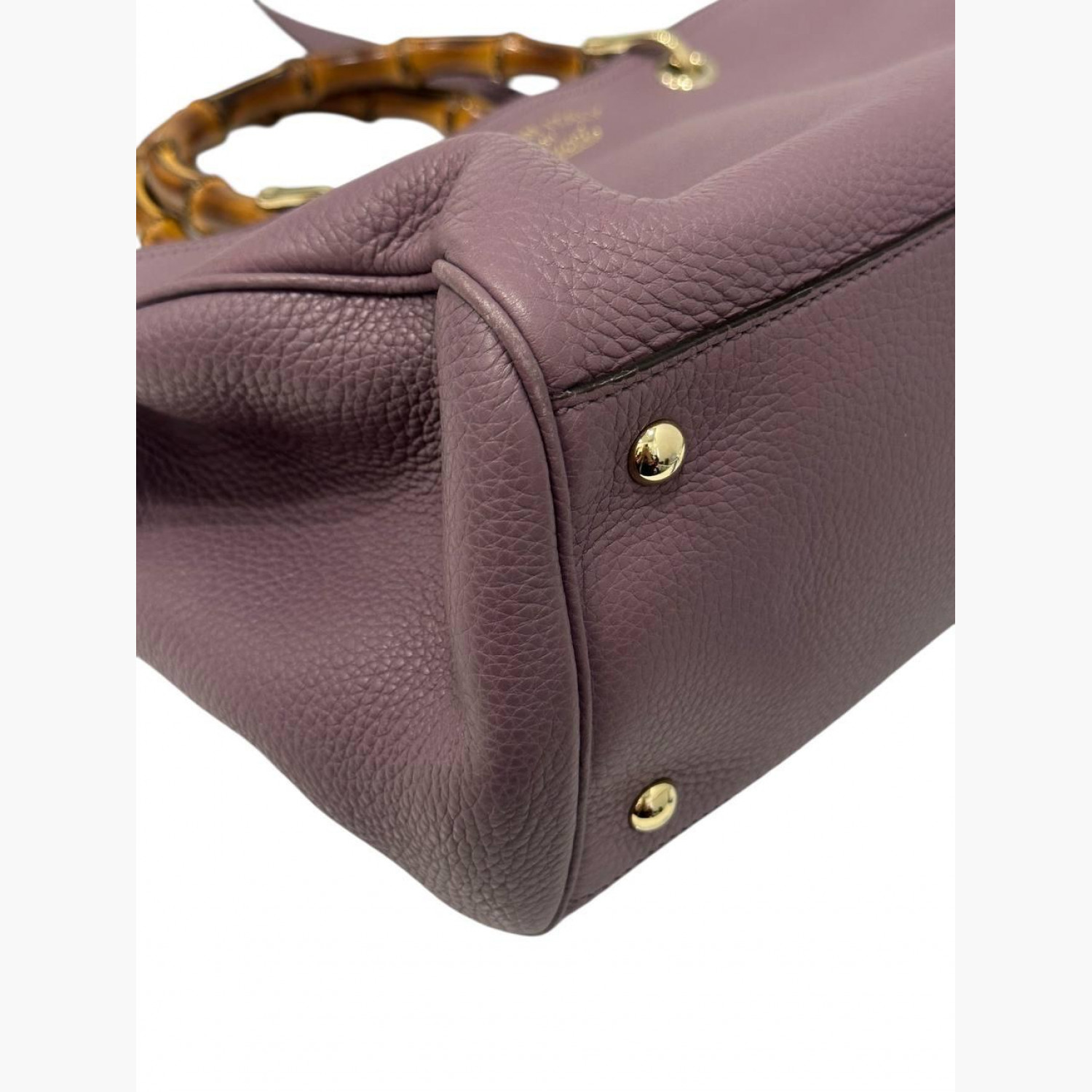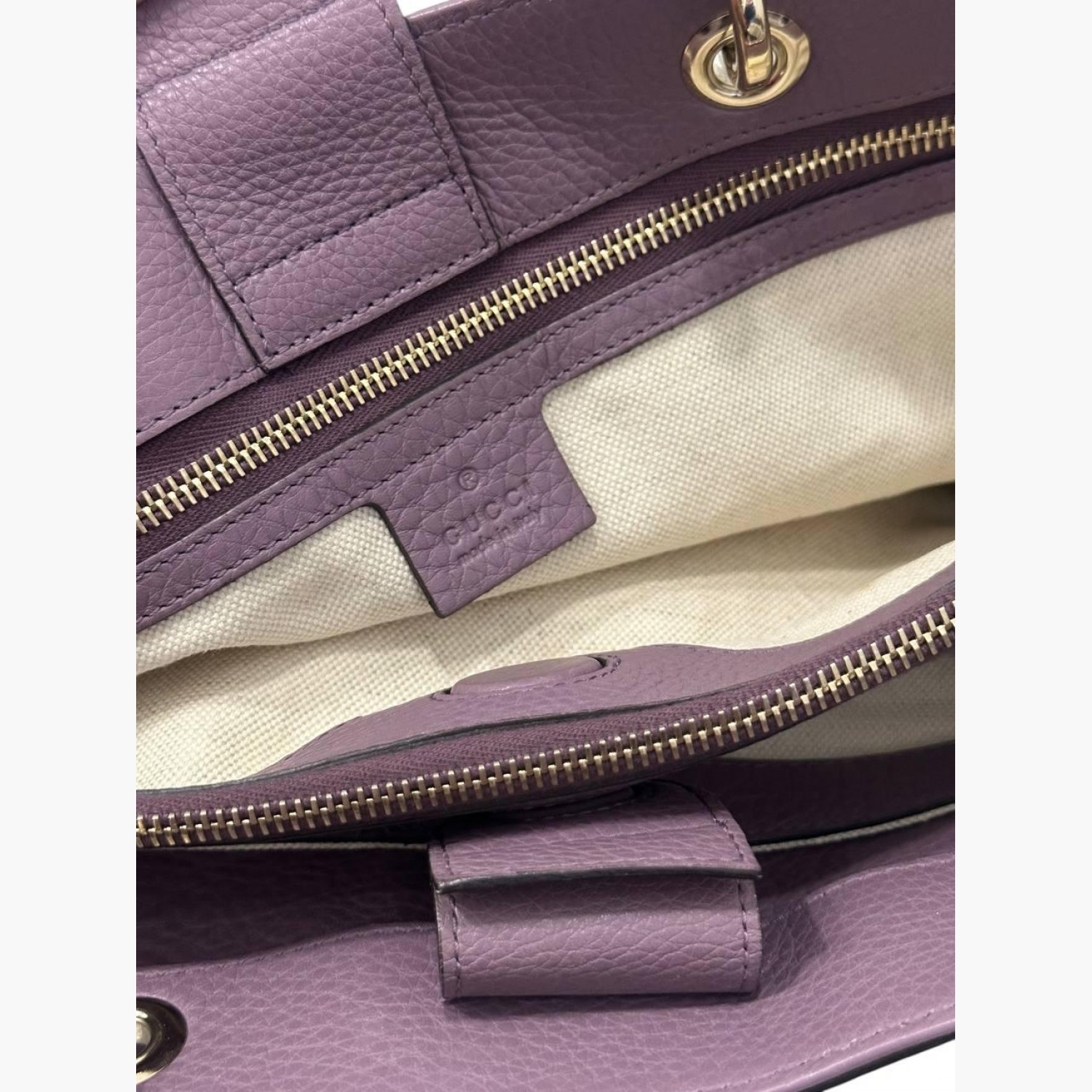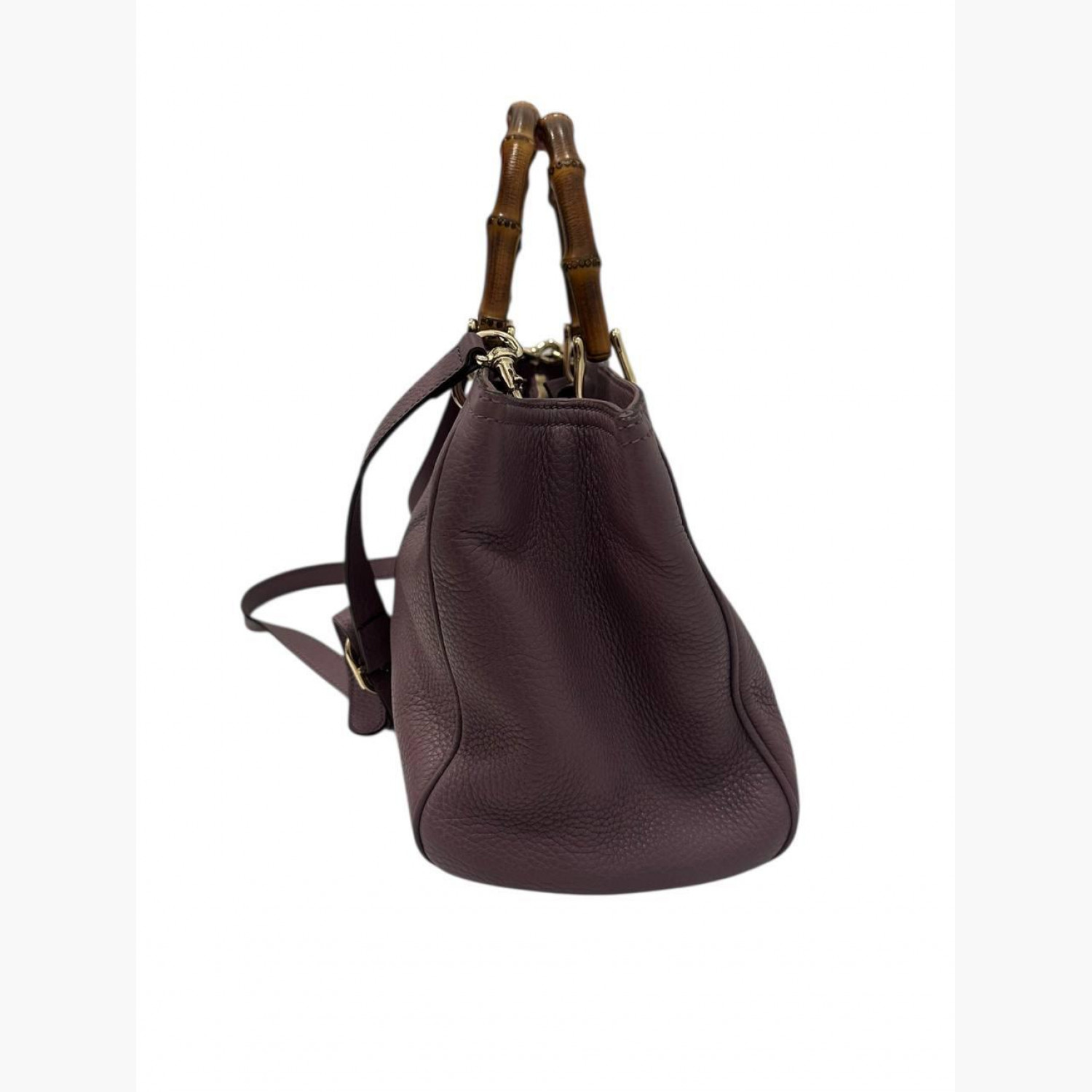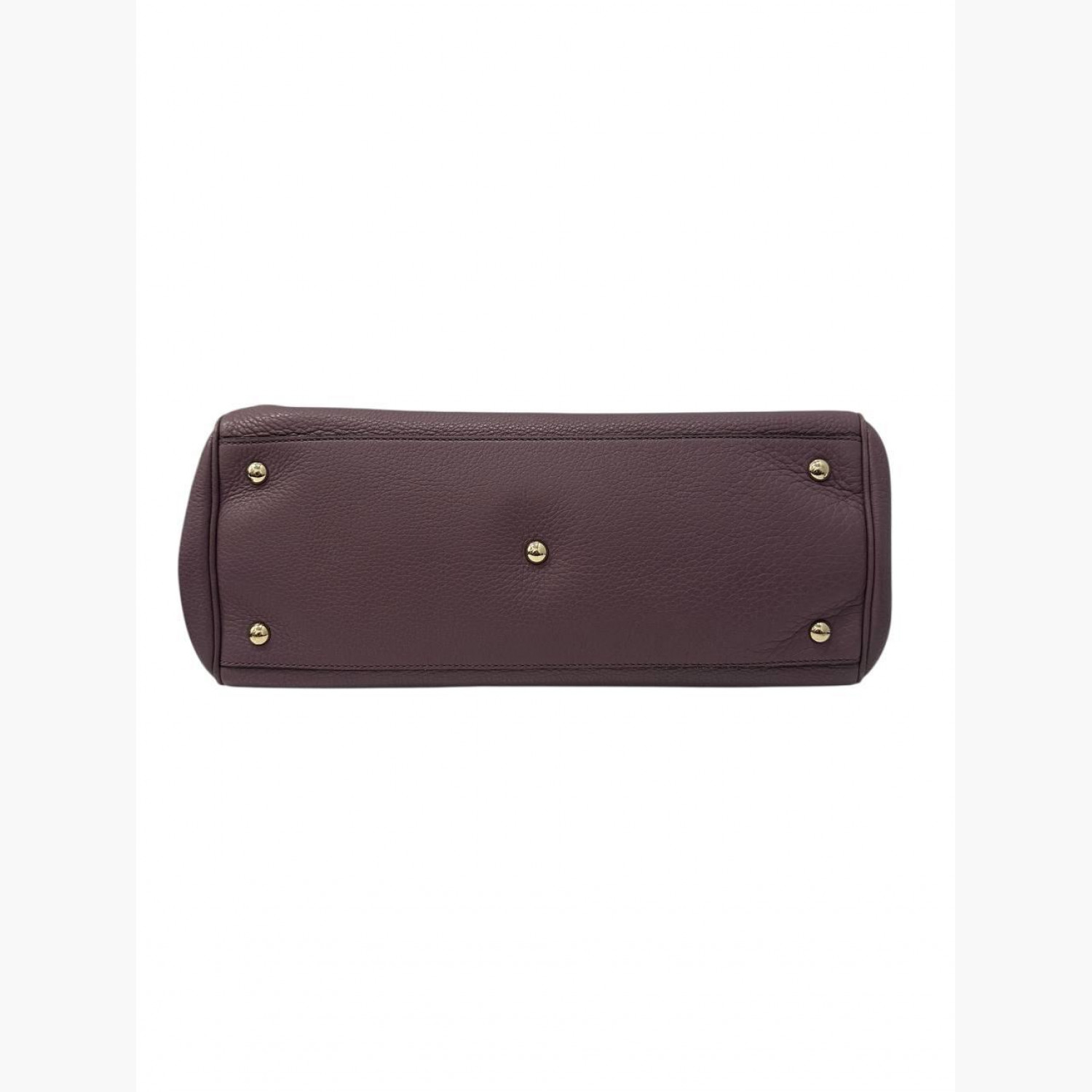 Lilac leather bag. Two main compartments, two zippered sections, and three pockets inside. In good condition with minor scuffs. Comes with a detachable shoulder strap.