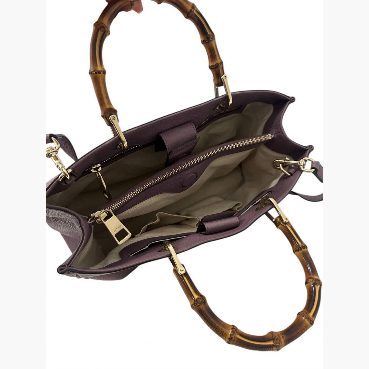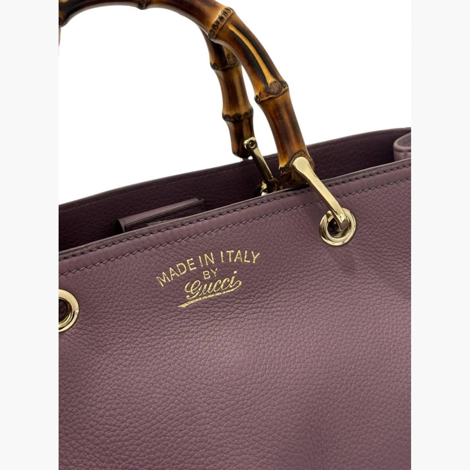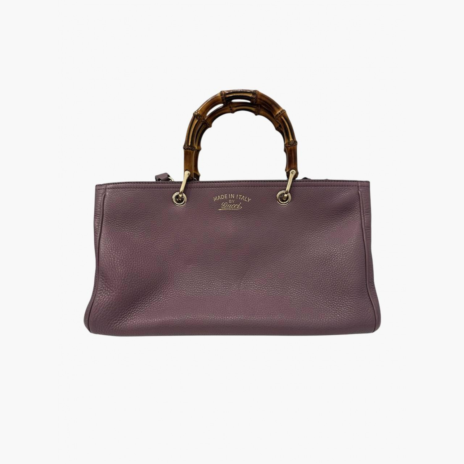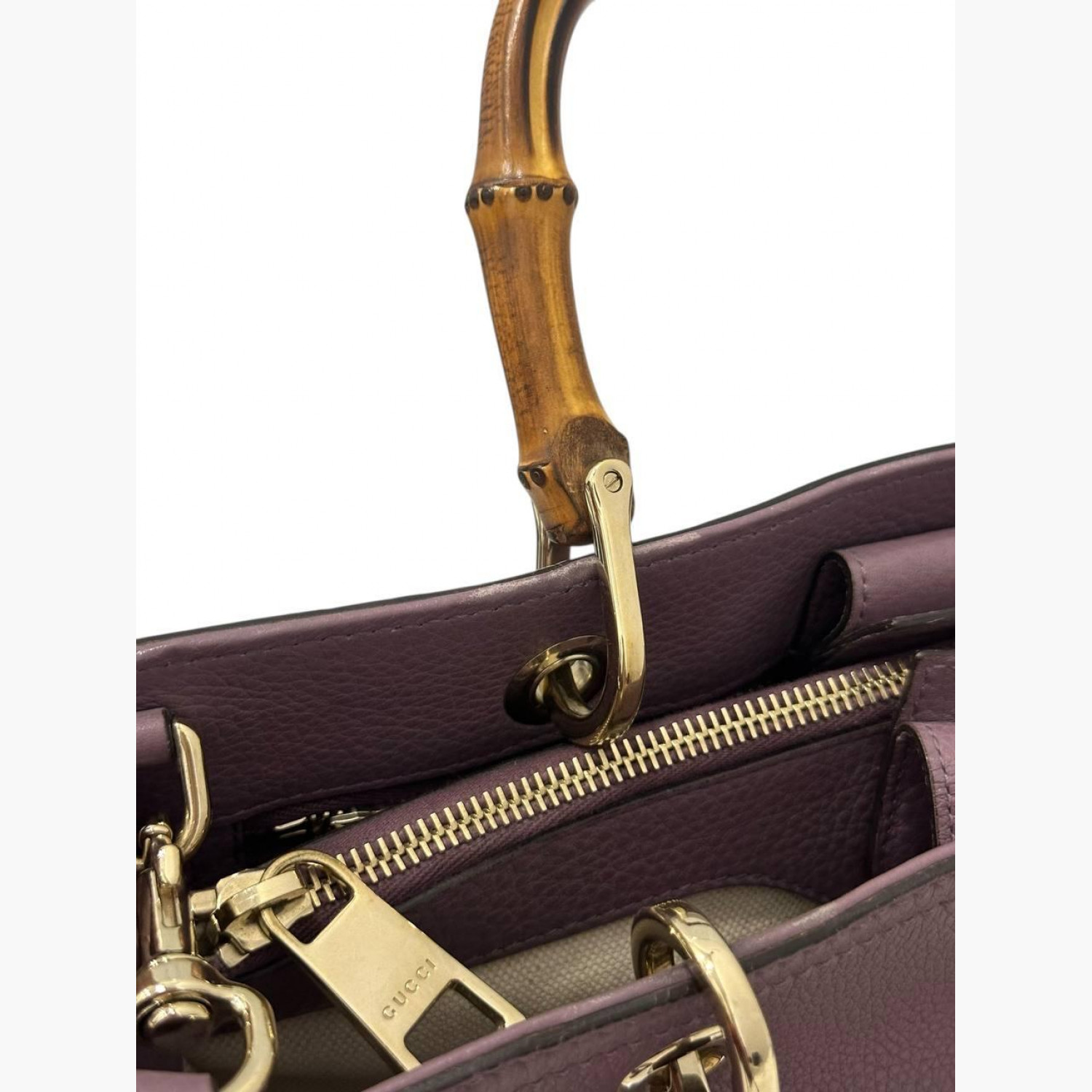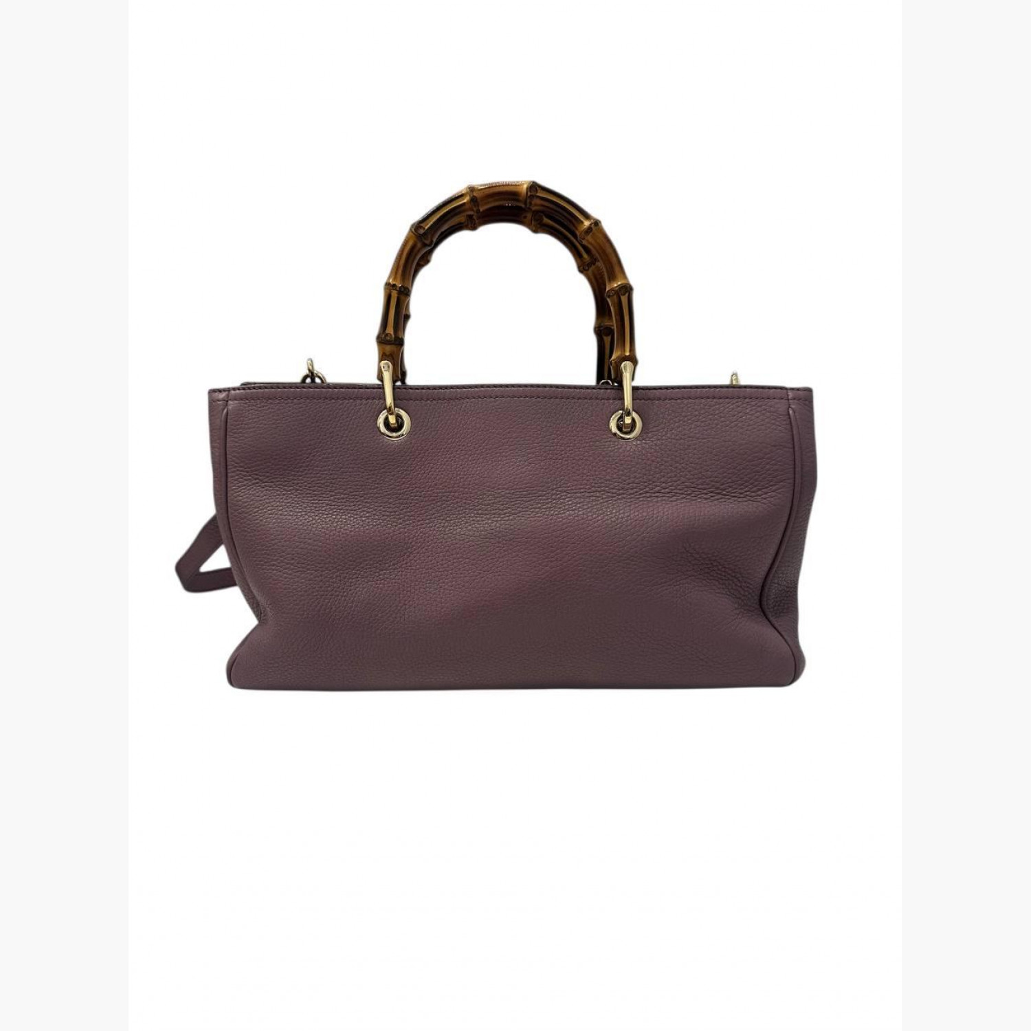 Lilac leather bag. Two main compartments, two zippered sections, and three pockets inside. In good condition with minor scuffs. Comes with a detachable shoulder strap.