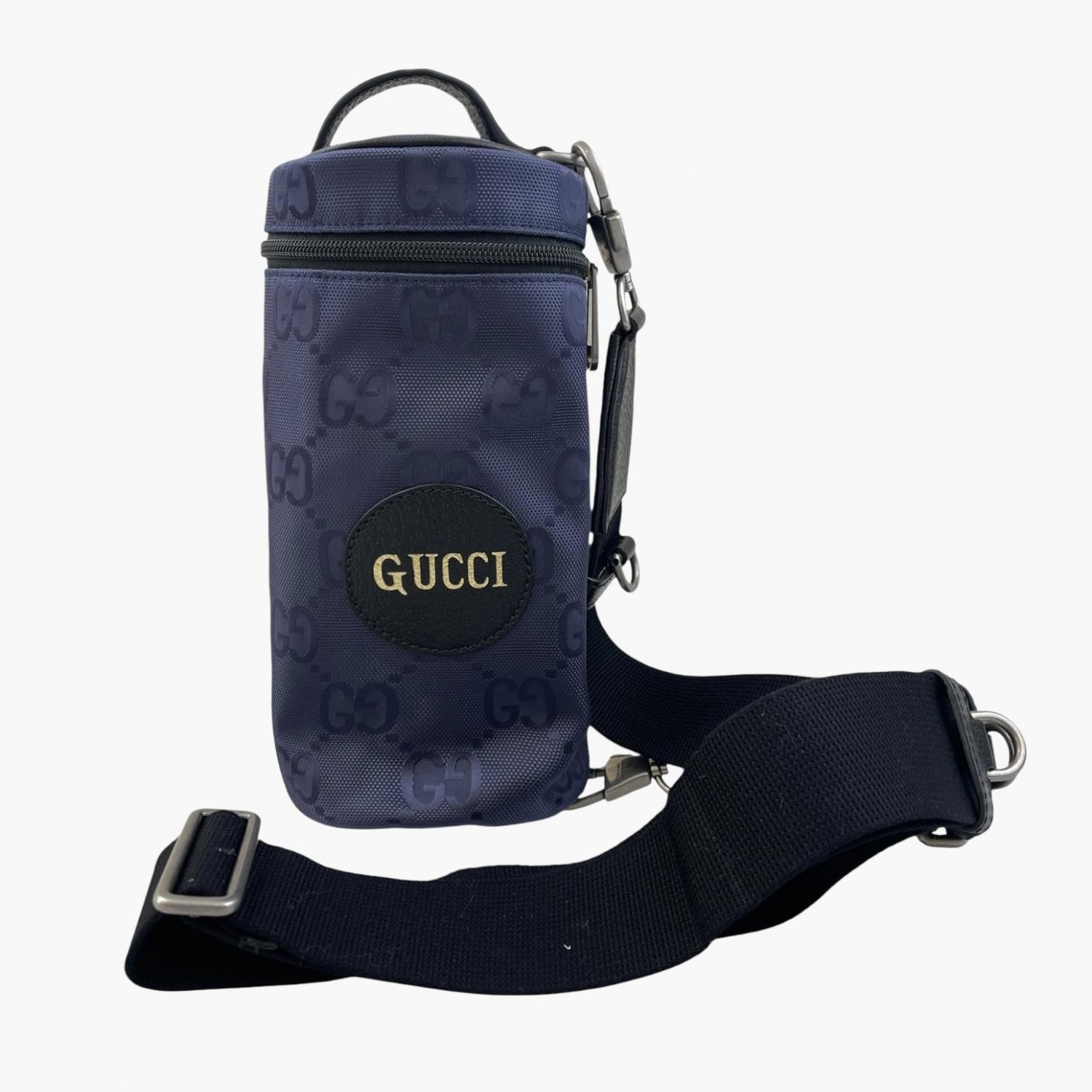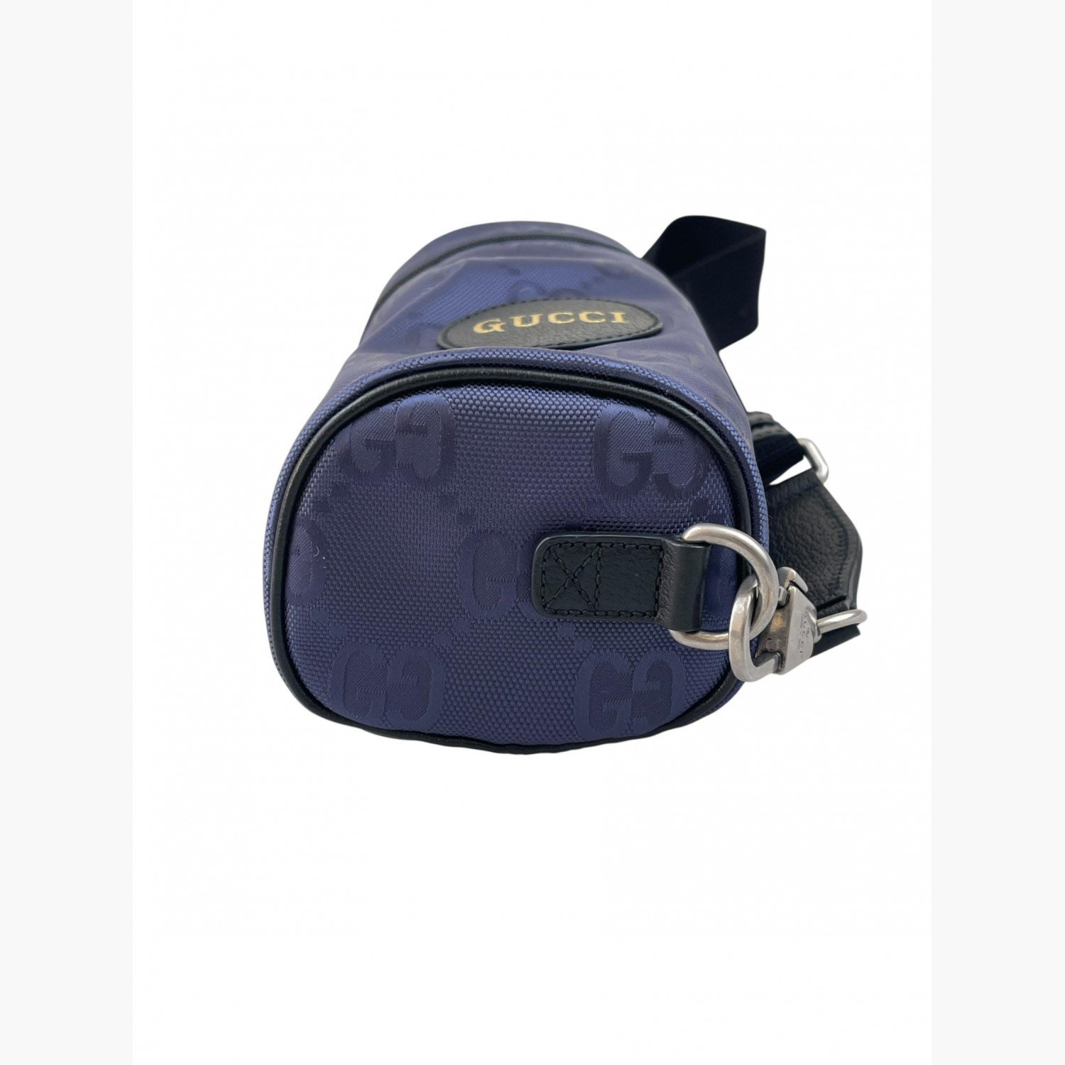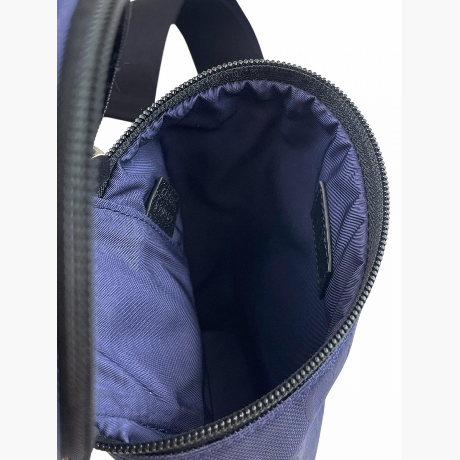 Blue barrel bag with monogram print and black textile strap. One main compartment inside. In excellent condition with no wear marks.