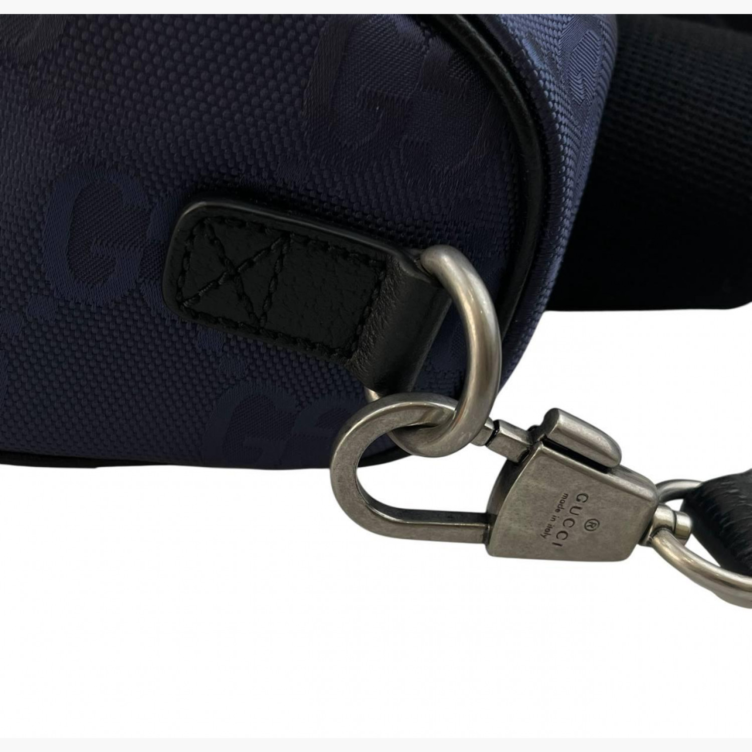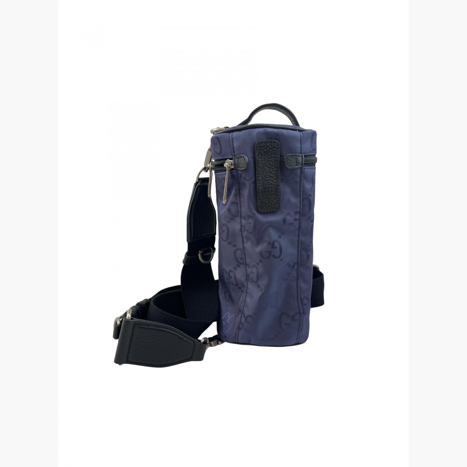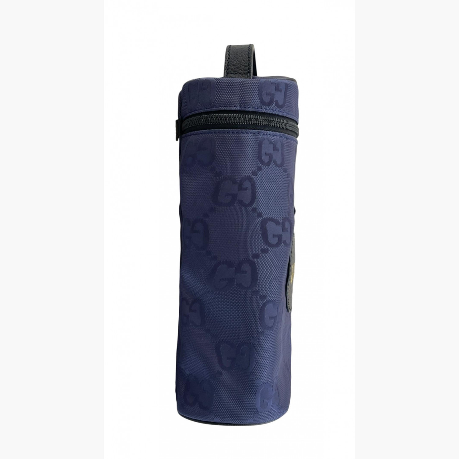 Blue barrel bag with monogram print and black textile strap. One main compartment inside. In excellent condition with no wear marks.