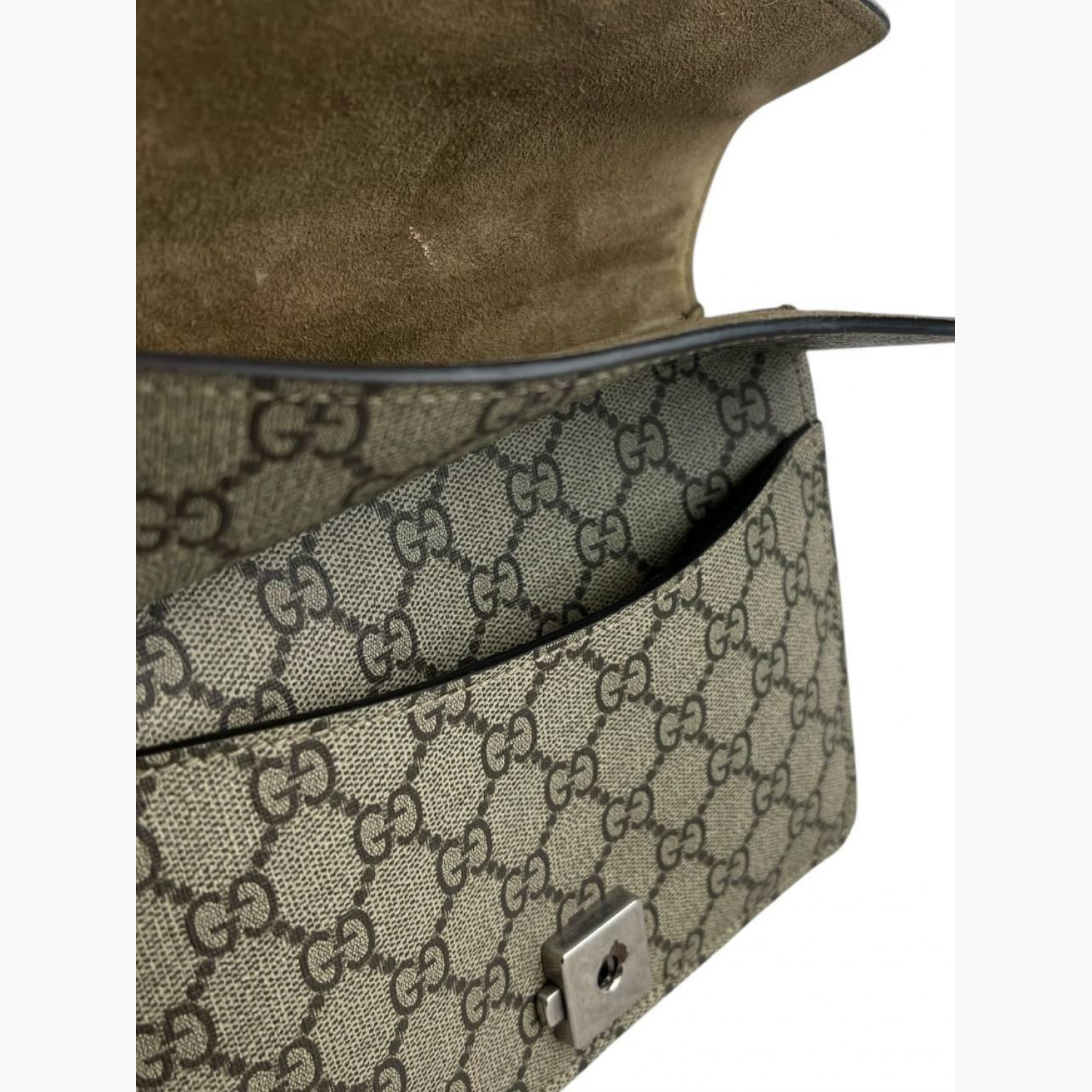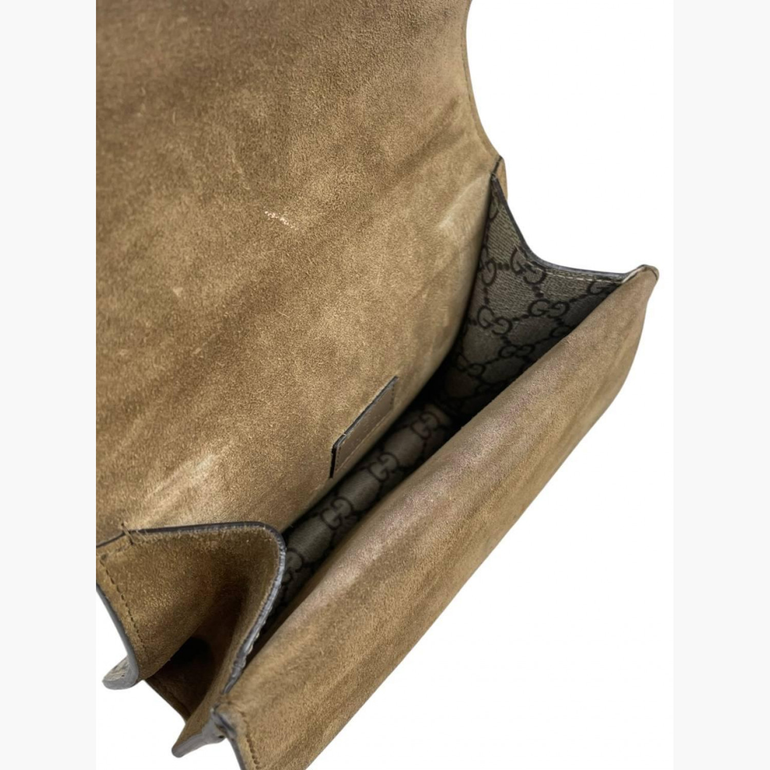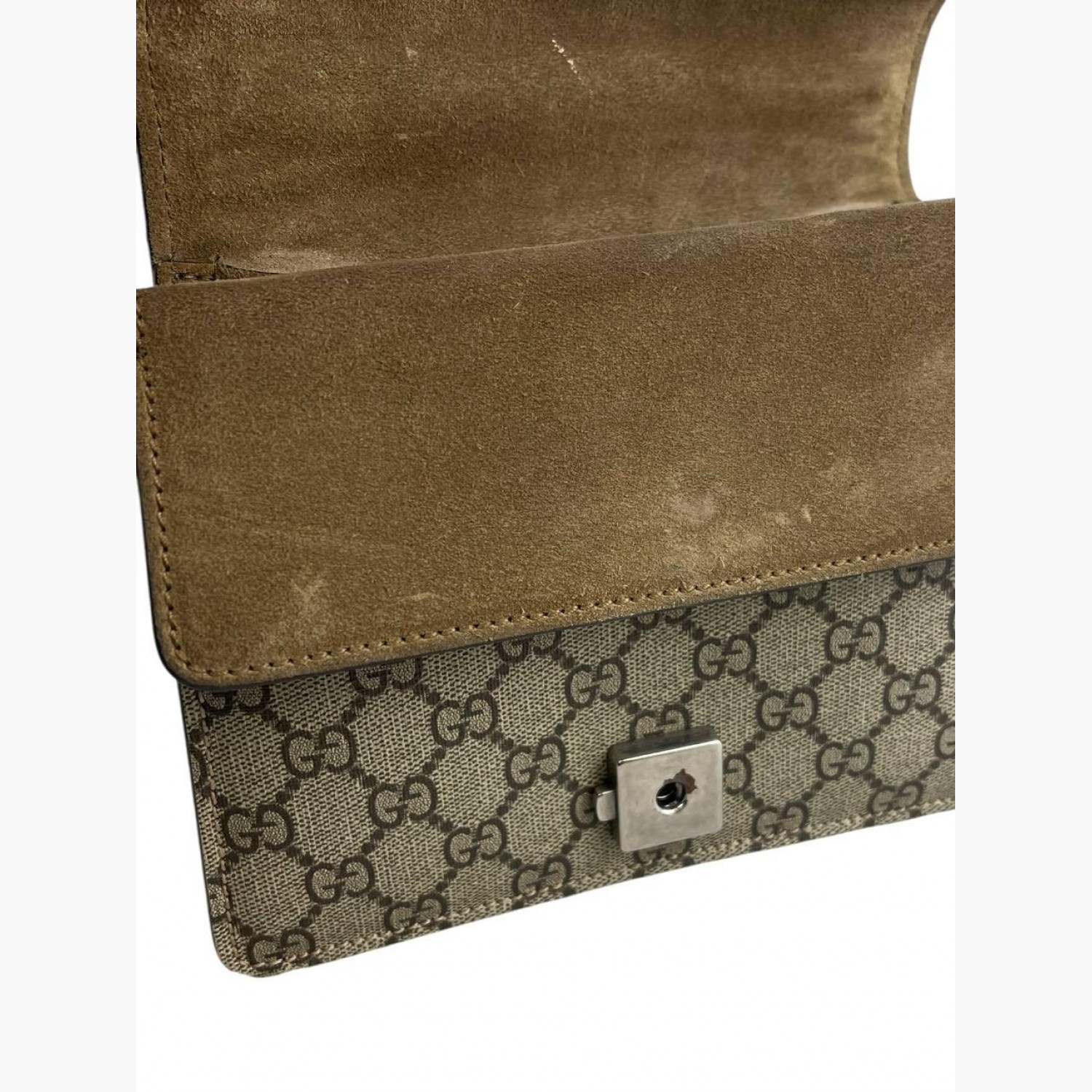 Beige monogram textile bag with a suede base and a double flap on a metal chain. Inside is one main compartment without pockets, with an open pocket on the front of the bag. In good condition, with wear marks.