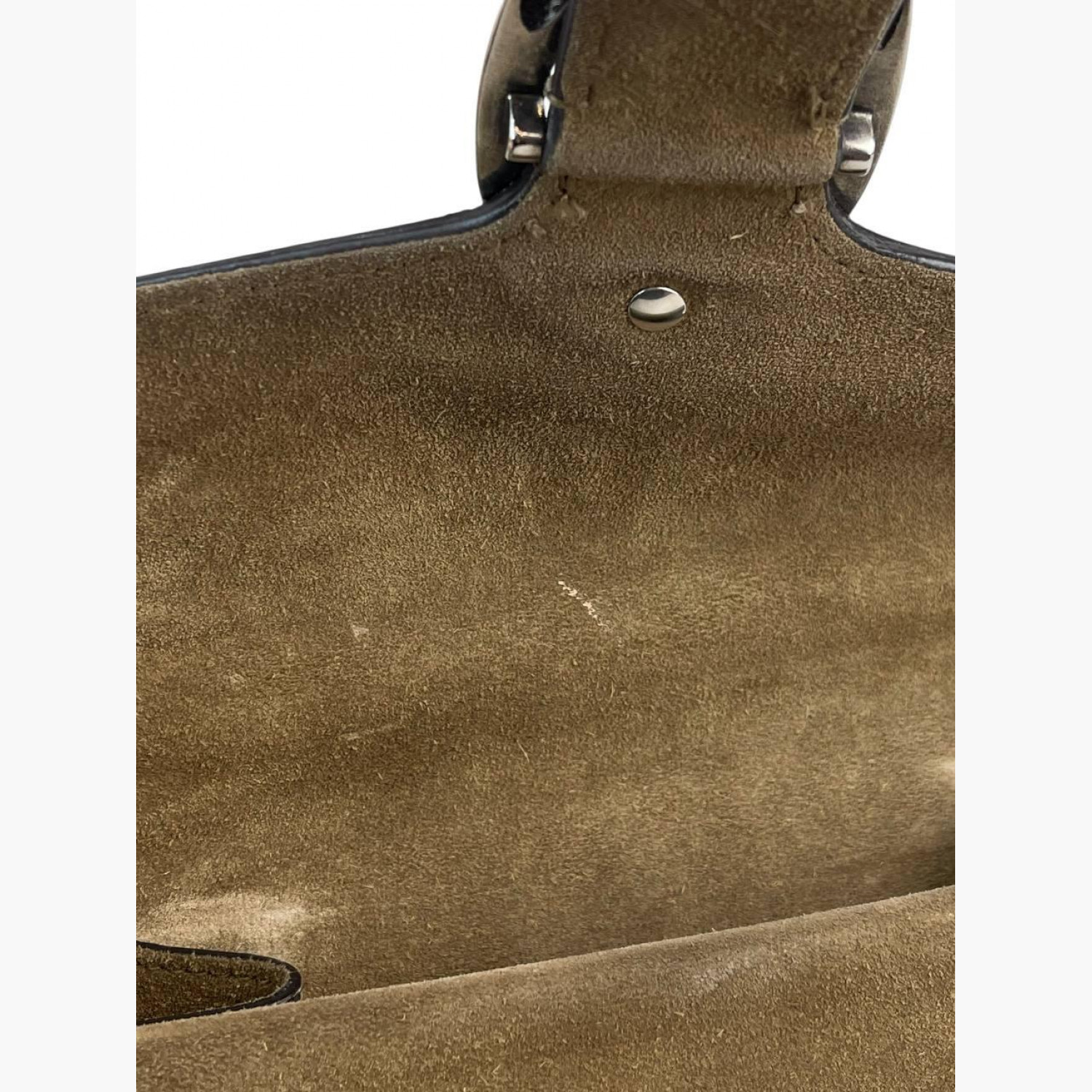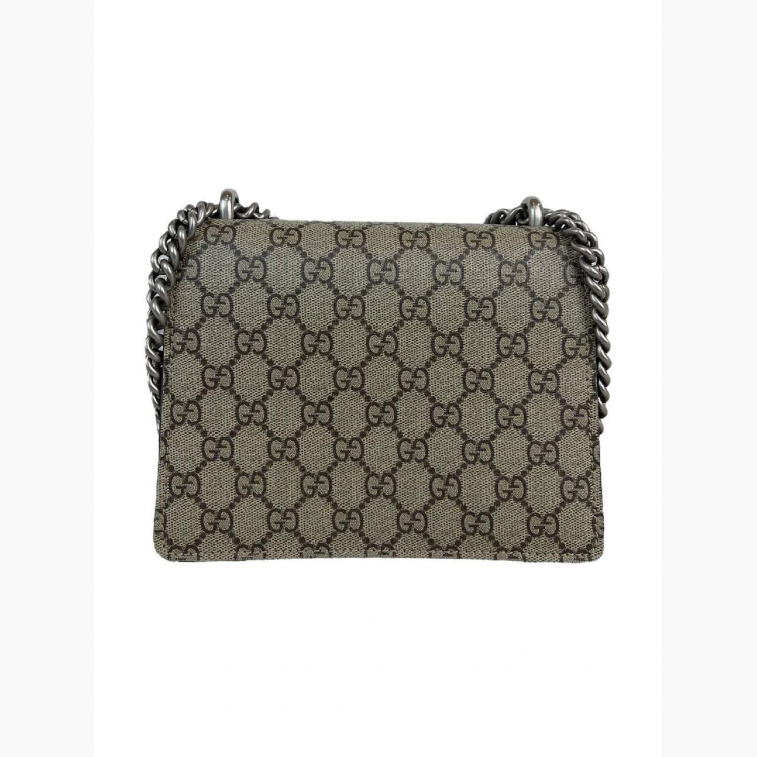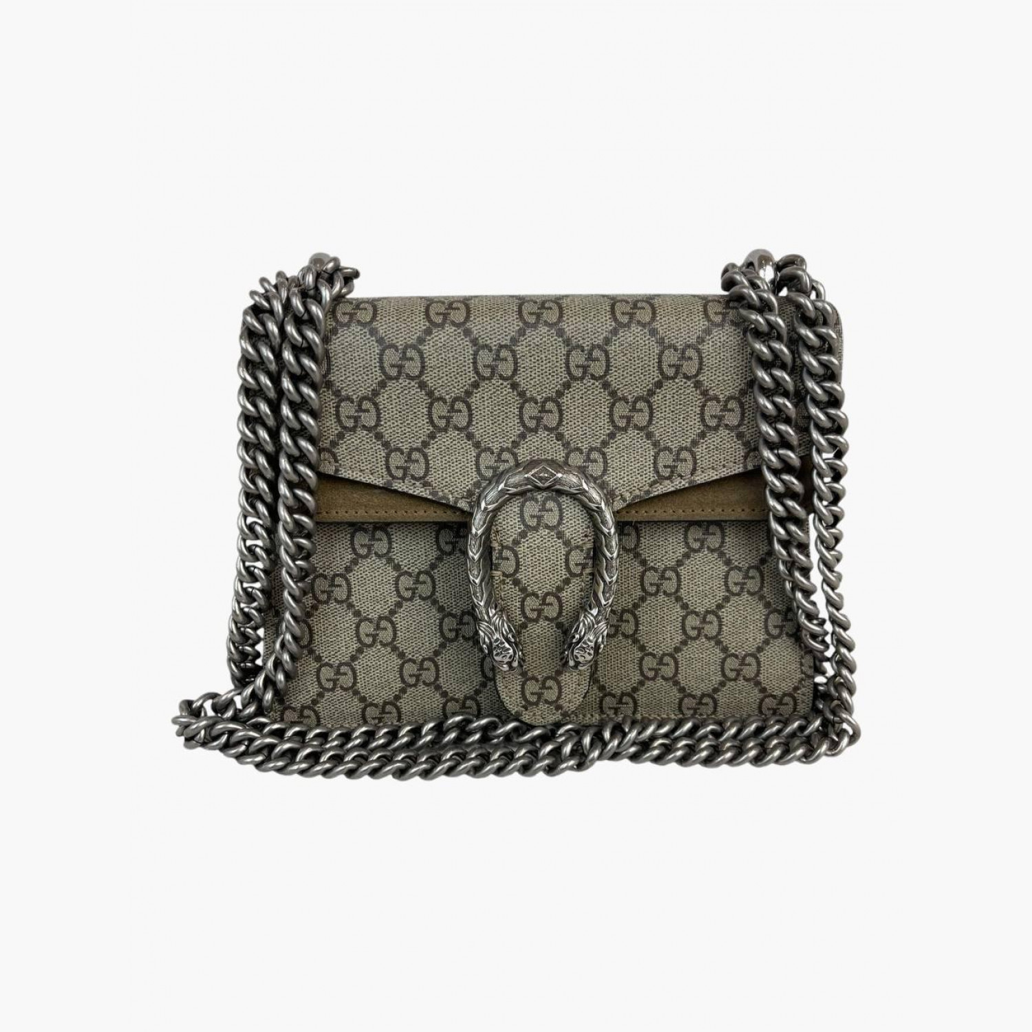 Beige monogram textile bag with a suede base and a double flap on a metal chain. Inside is one main compartment without pockets, with an open pocket on the front of the bag. In good condition, with wear marks.