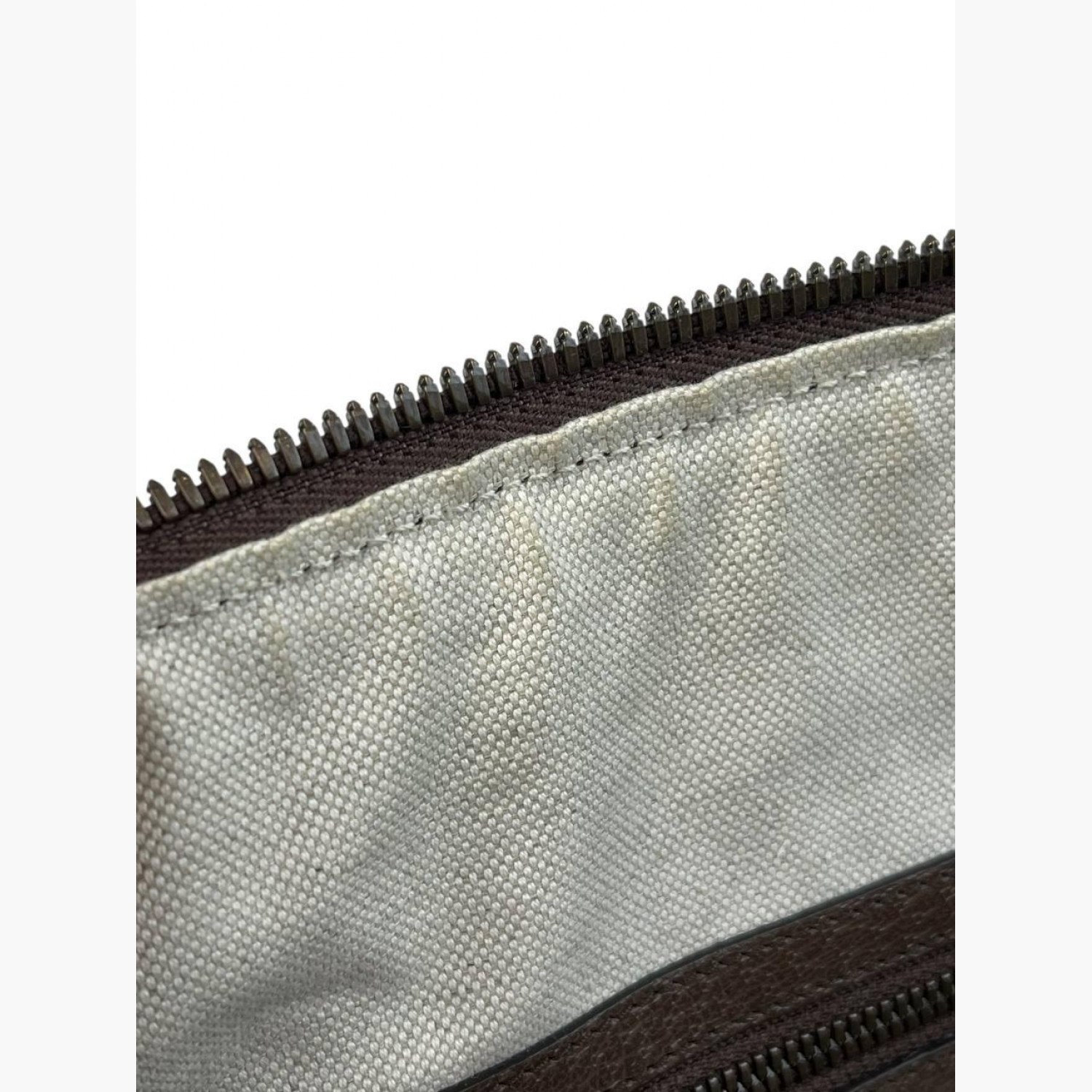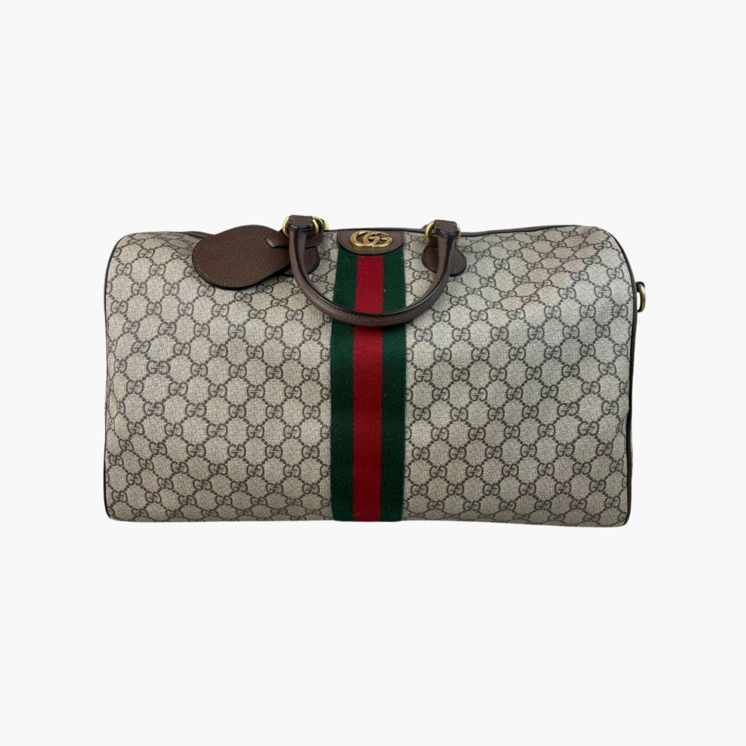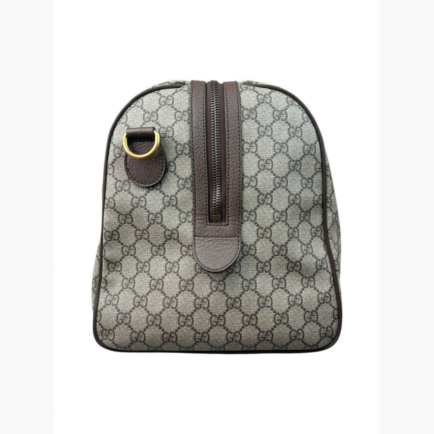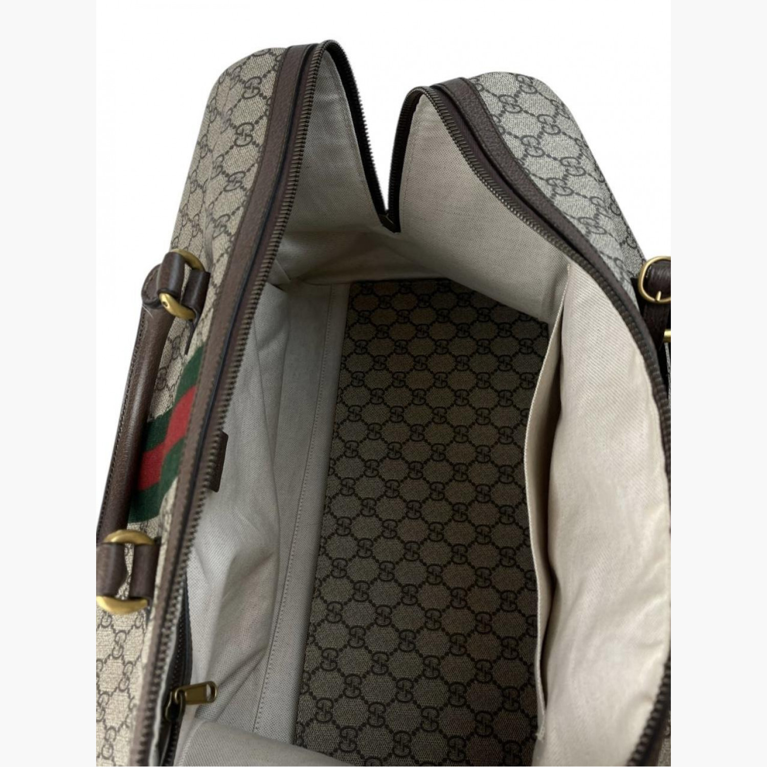 Monogram travel bag with a wide textile stripe. Inside there is one main compartment with a zip pocket and an open pocket opposite it. In good condition, zipper pull broken, keys and long strap missing.
